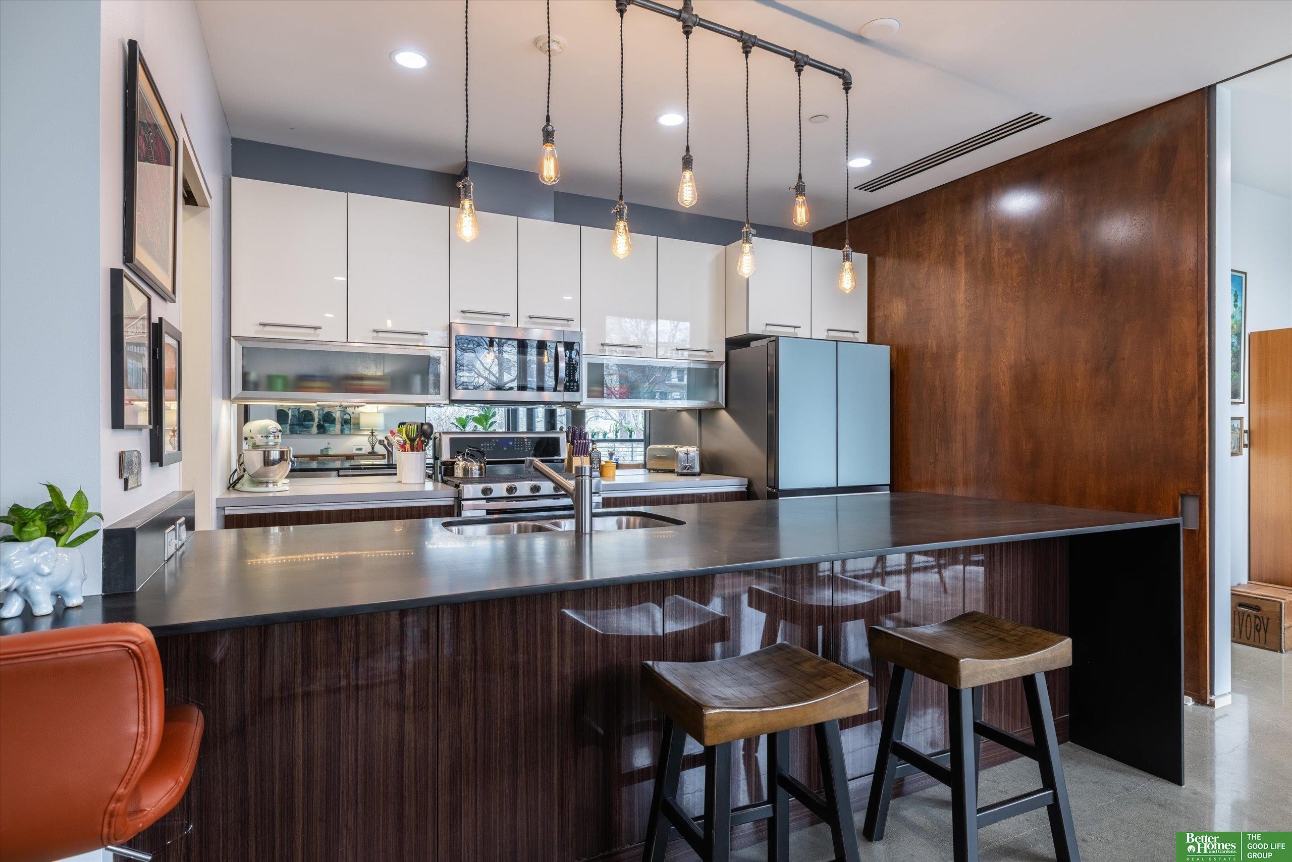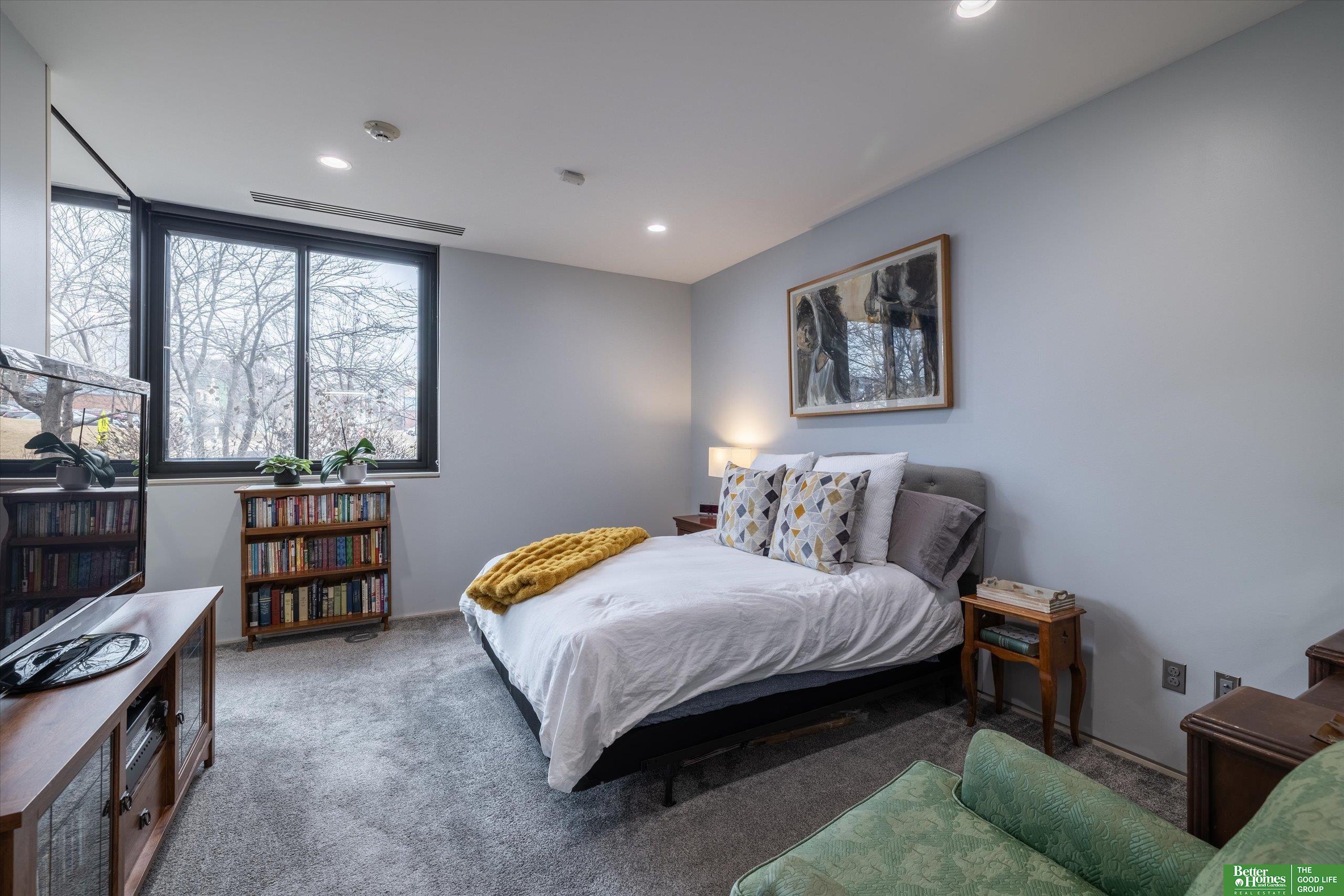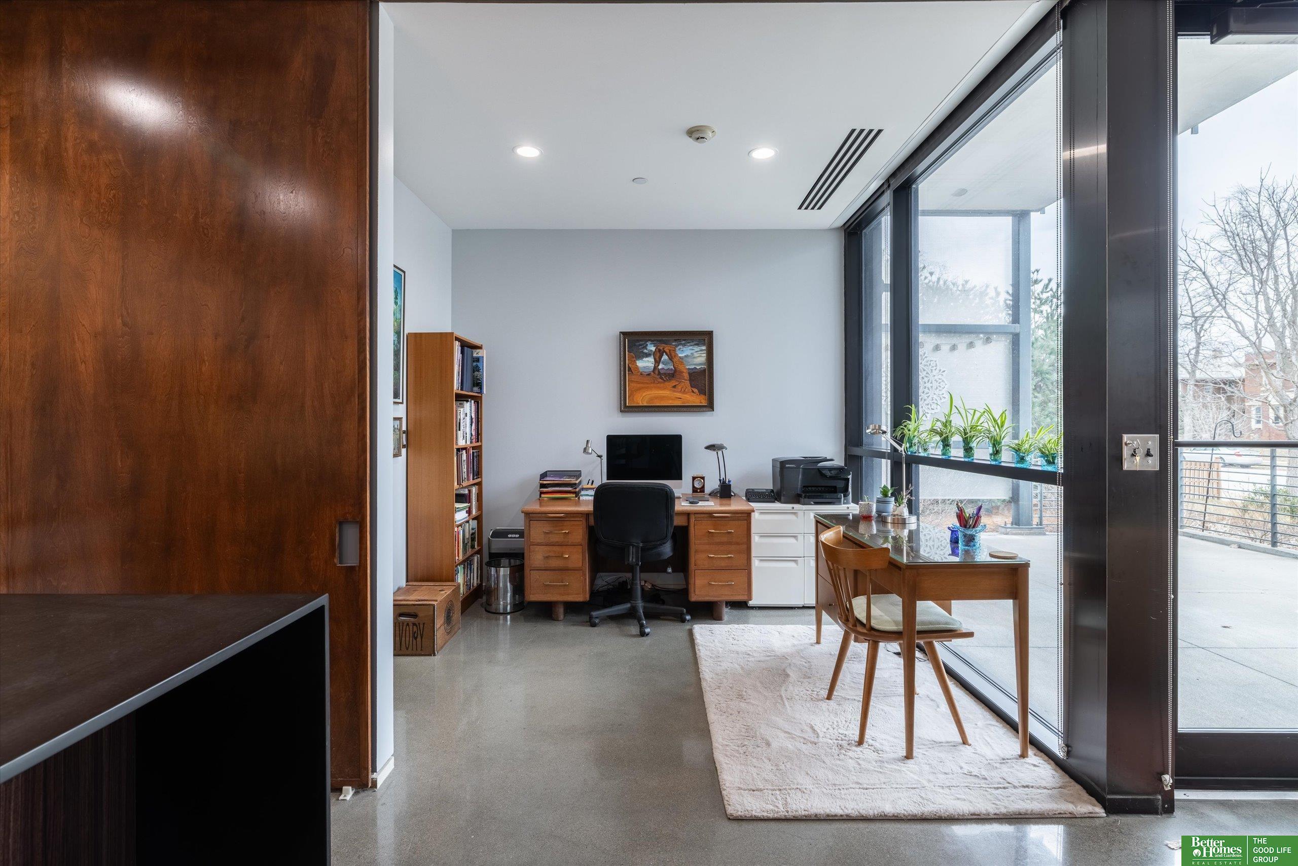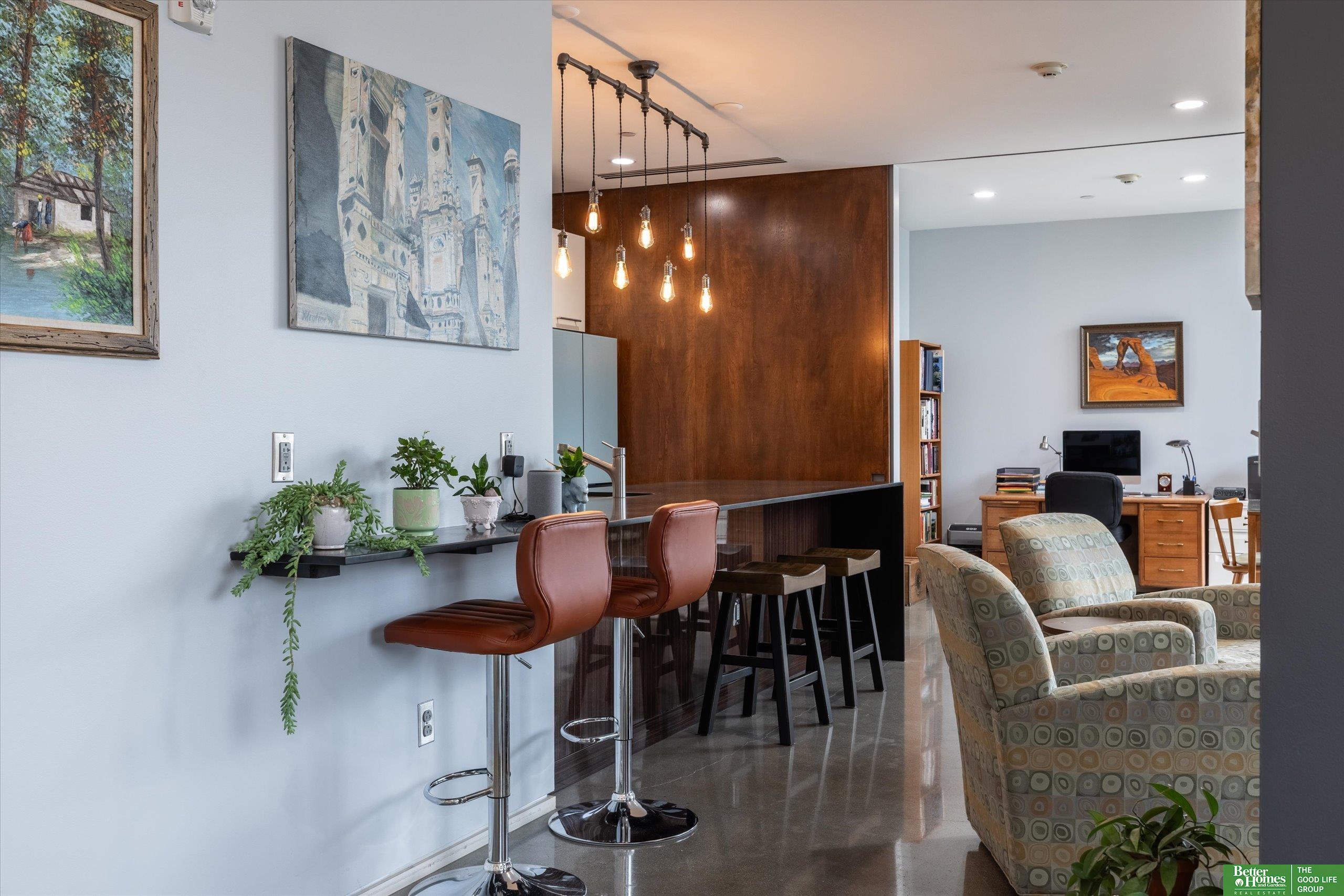 CO2 condominiums are a true Omaha art piece! This LEED certified residential building is nestled in a quiet neighborhood just blocks to Little Bohemia, The Old Market or the Zoo! Condo 108 is a beautifully designed condo featuring a spacious primary suite with walk-in closet and beautifully tiled shower. Den space makes for a perfect office or guestroom and has an attached bath or leave the beautiful accent door open to extend the living room space. Open floor plan with walls of windows, double sided gas fireplace and polished concrete flooring add to the contemporary style. Designer kitchen open for entertaining. Relax on the HUGE and private (17 x 15) covered patio and watch the world go by. Underground parking, community room, fitness room, amazing private green space with a waterfall and pond! This is a true gem right in the middle of all the hustle and bustle. The 1577 square feet includes the 338 sqft private patio. Interior condo square feet is 1239 sqft.