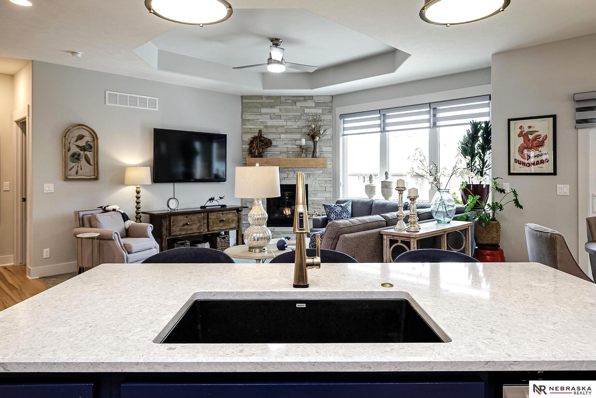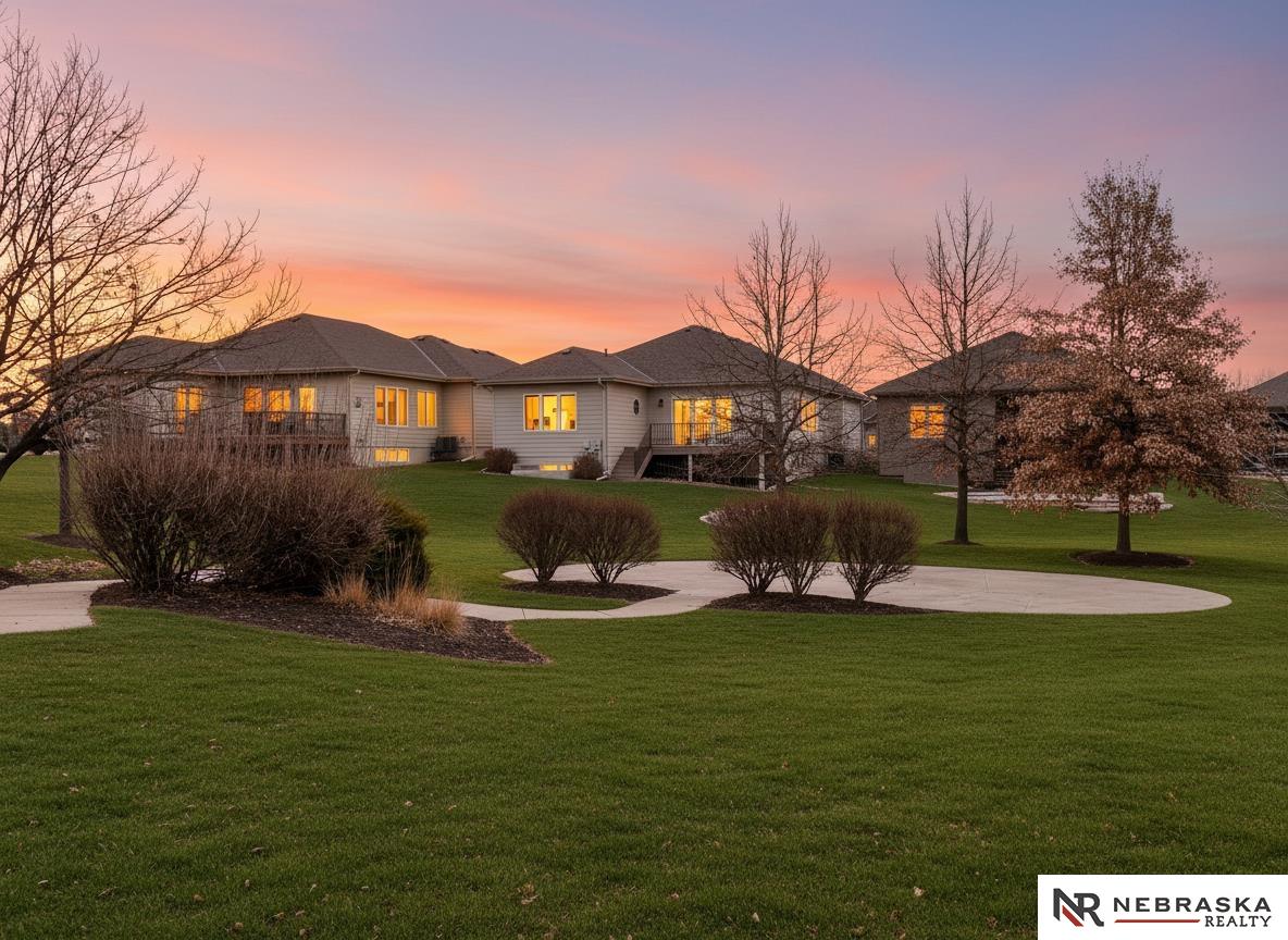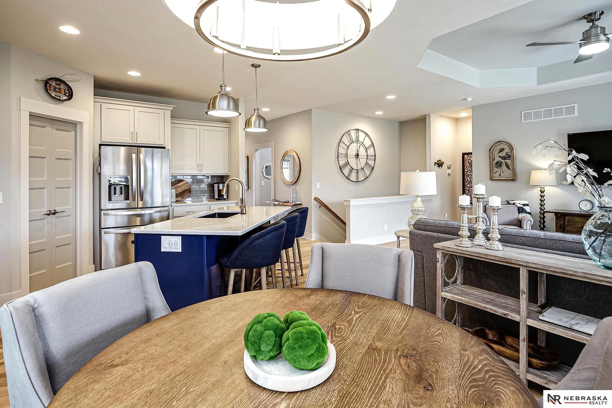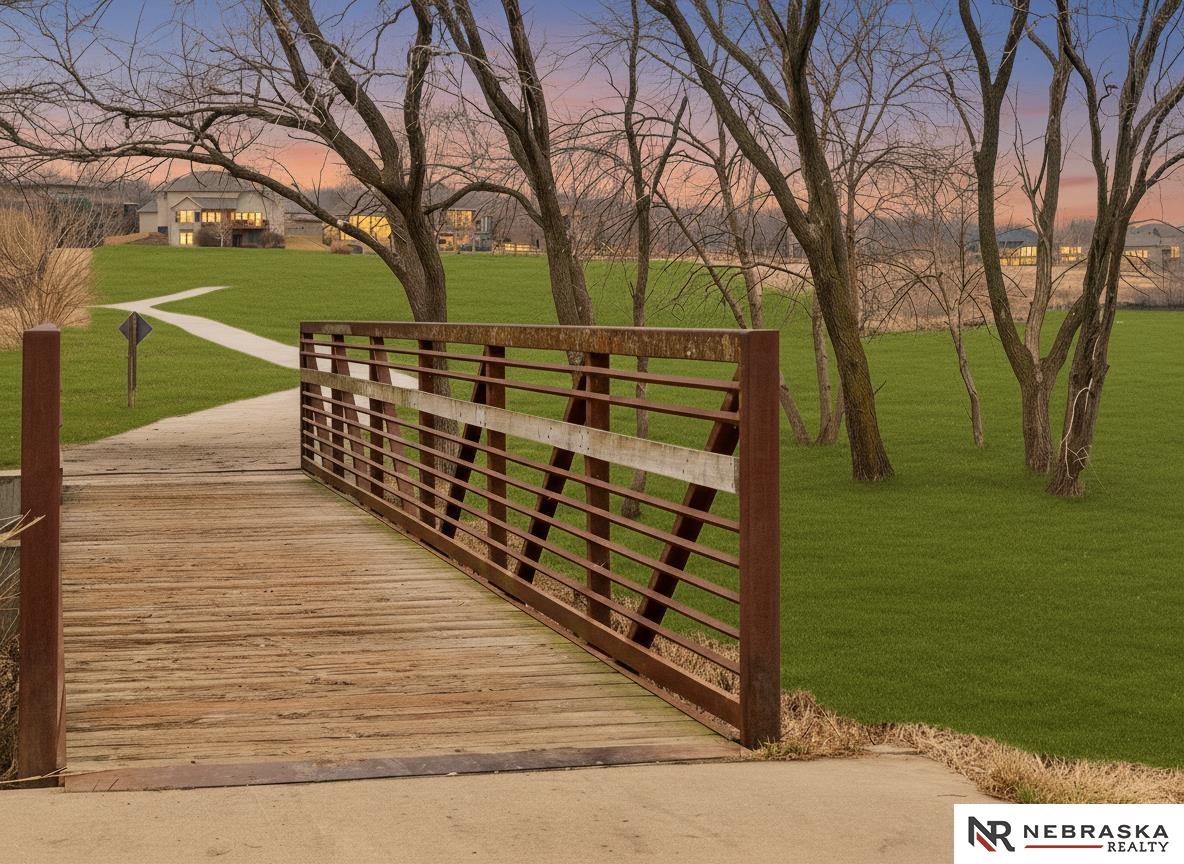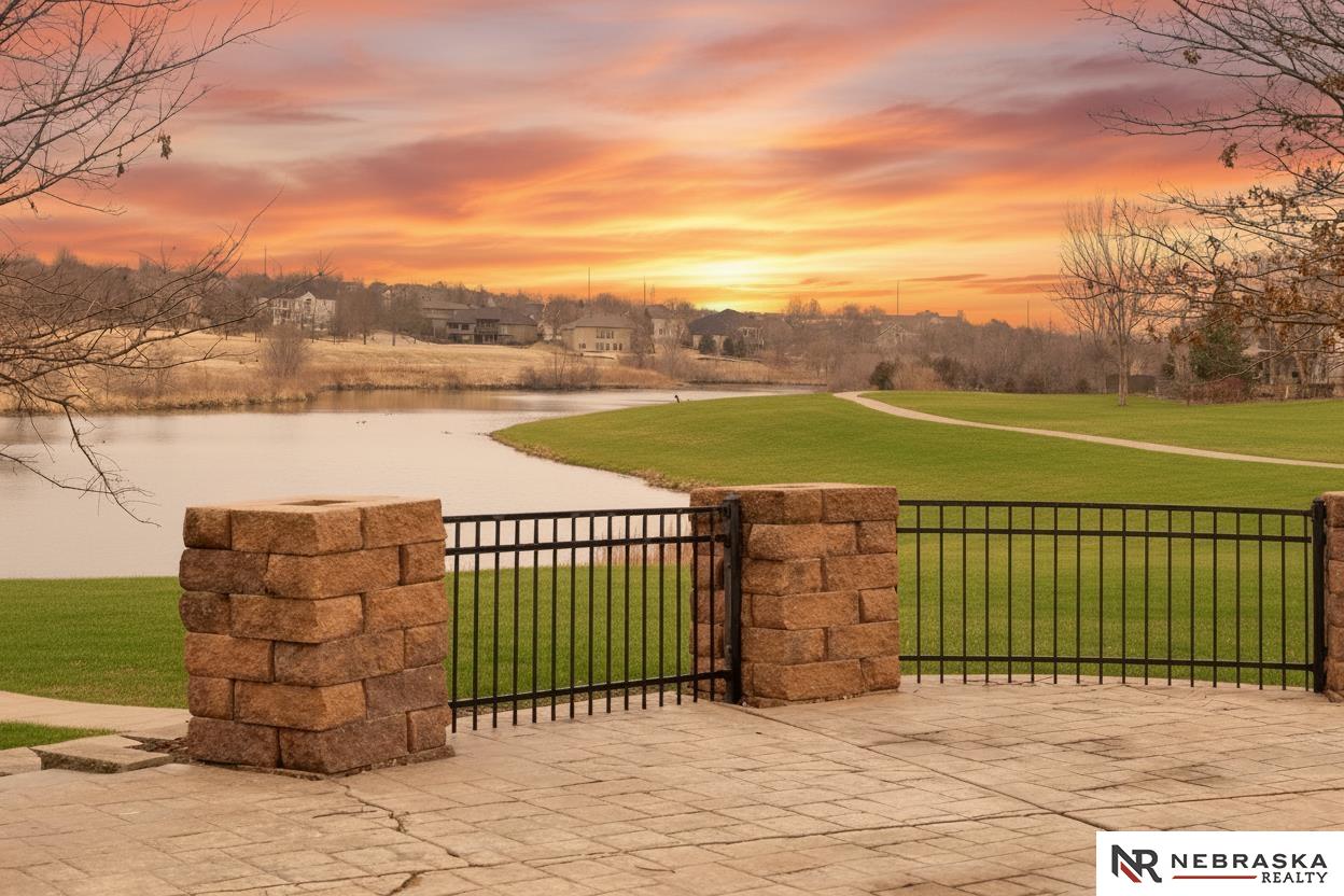 NW Omaha location. Snow & Lawn Care Optional! Overlooking peaceful green space. Partially covered fenced patio.Wood flooring in the kitchen & dining area compliment the updated Café range & dishwasher plus a walk-in pantry. Newer Karastan carpet. Stunning floor-to-ceiling stone fireplace & abundant natural light. Spacious primary suite features sconce lighting & room for a king bed. Large closet includes pocket-door access to the laundry with additional cabinetry added. Primary bath includes double vanities, private toilet & large tiled shower. Second main-floor bedroom with walk-in closet, sits near the full bath. Convenient drop zone with bench leads to garage, The finished lower level includes a huge open family room, bedroom with oversized walk-in closet, and ¾ bath. The spacious storage room features utility sink & extra hobby area. Extra tall garage. Steps away from Waterford lake & trails, 2 pools & clubhouse. New roof & gutters 11-24, Ext. paint 4-25, Int. paint 3-26.