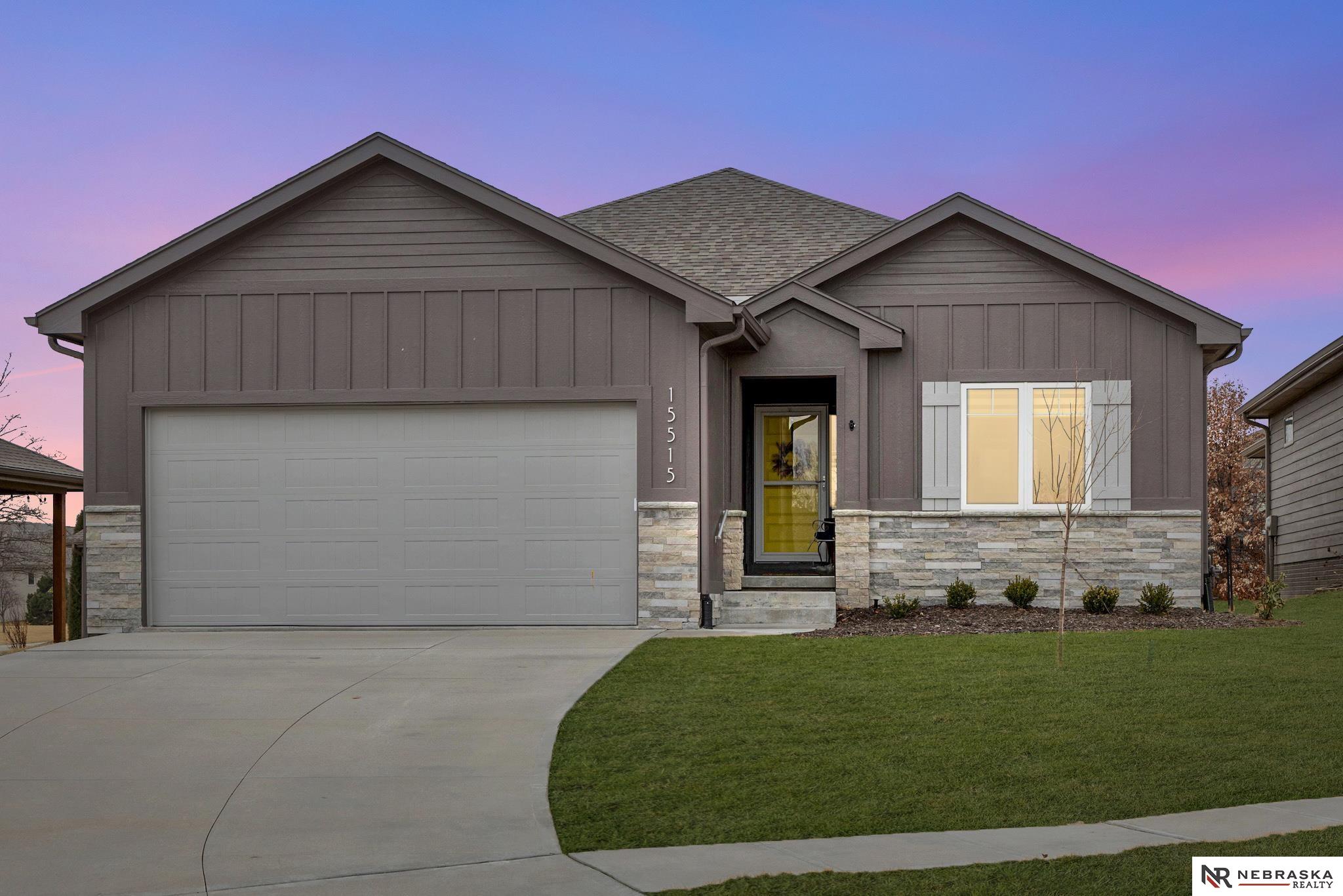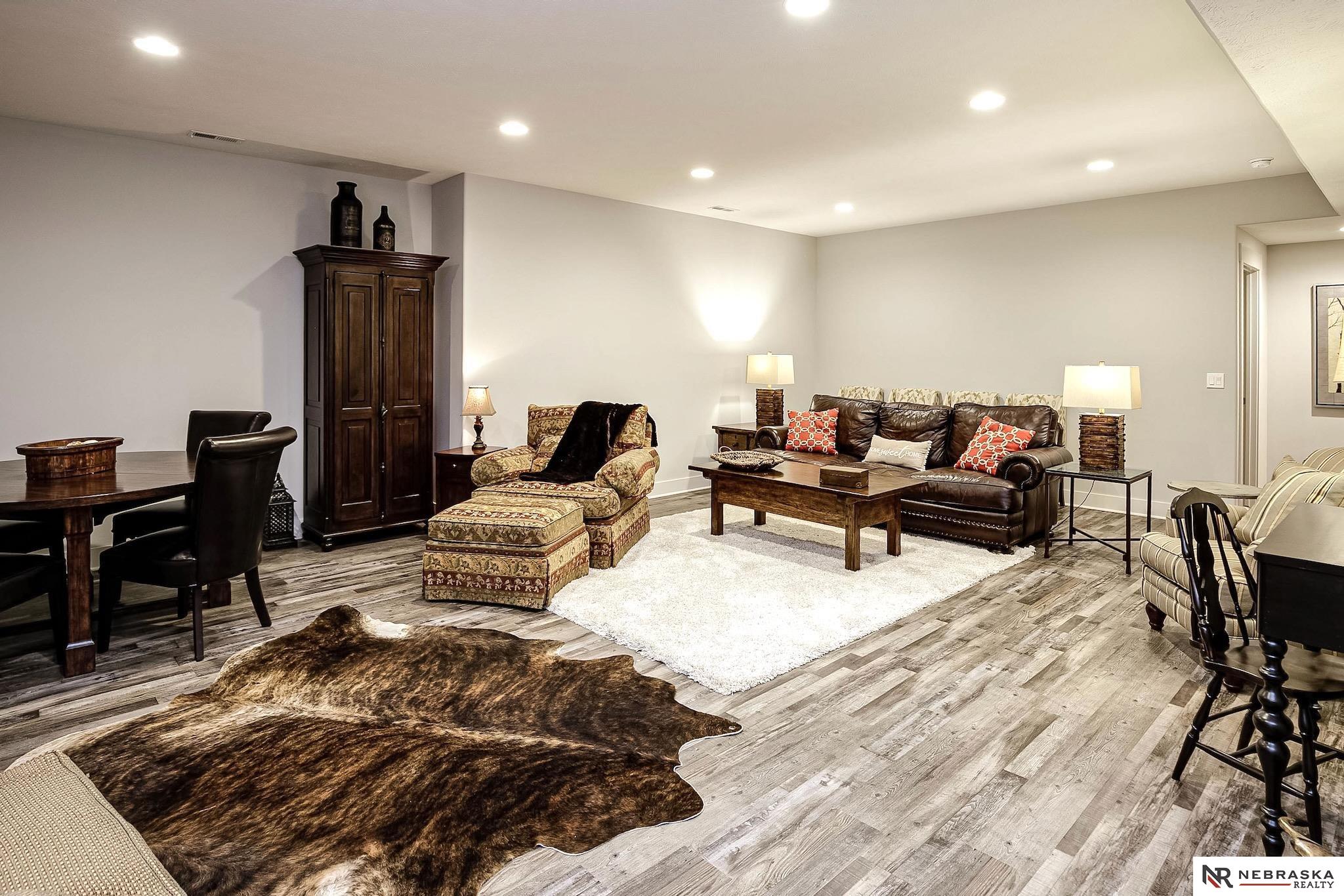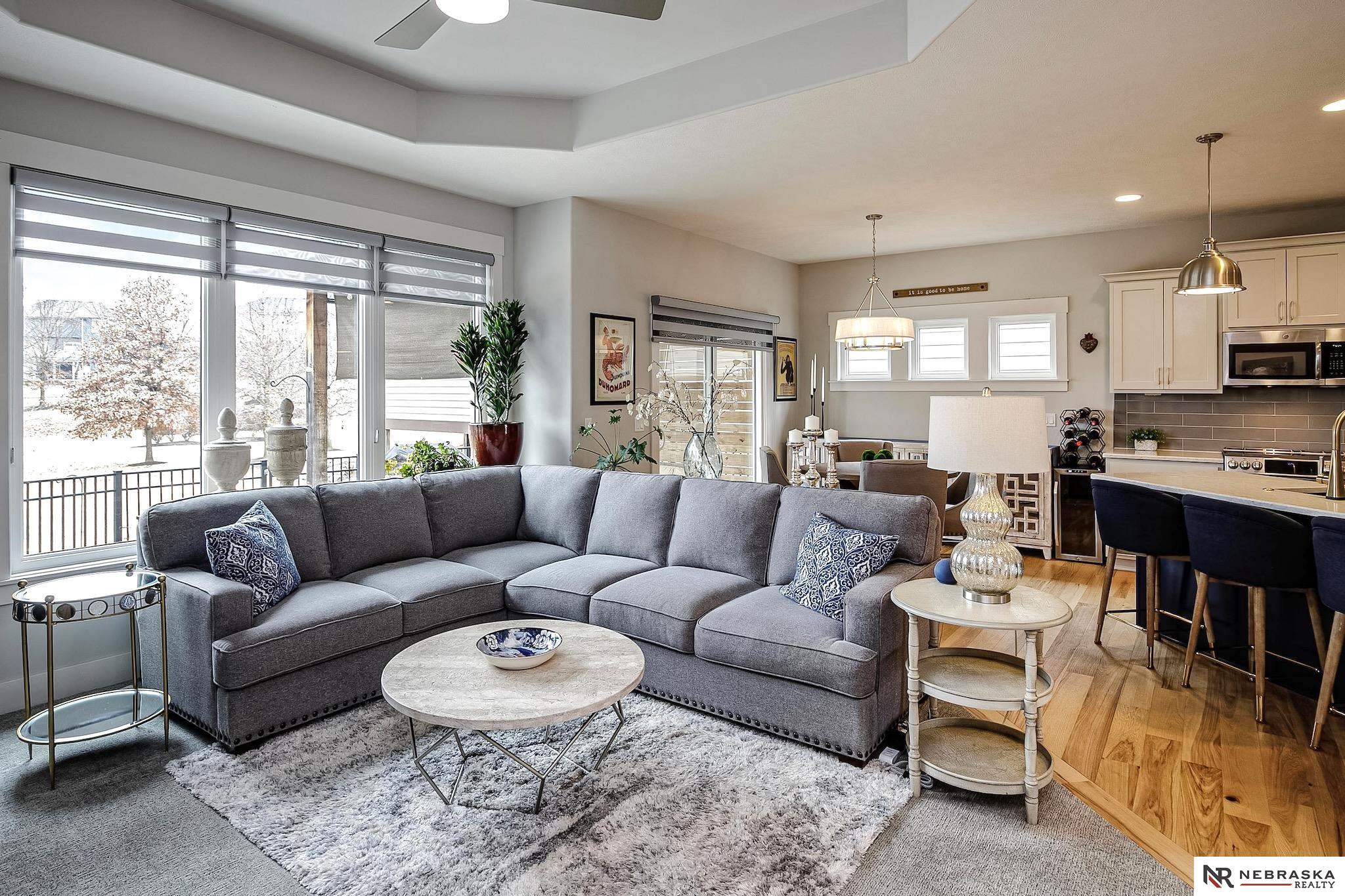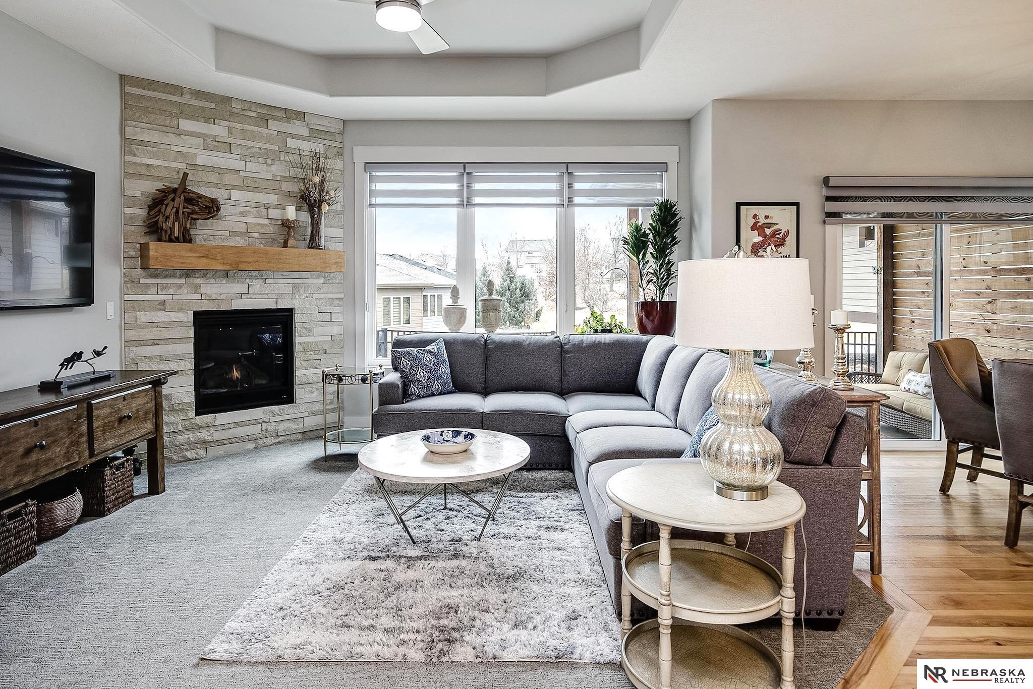 NW Omaha location. Snow & Lawn Care Optional! Overlooking peaceful green space. Partially covered fenced patio.Wood flooring in the kitchen & dining area compliment the updated Café range & dishwasher plus a walk-in pantry. Newer Karastan carpet. Stunning floor-to-ceiling stone fireplace & abundant natural light. Spacious primary suite features sconce lighting & room for a king bed. Large closet includes pocket-door access to the laundry with additional cabinetry added. Primary bath includes double vanities, private toilet & large tiled shower. Second main-floor bedroom with walk-in closet, sits near the full bath. Convenient drop zone with bench leads to garage, The finished lower level includes a huge open family room, bedroom with oversized walk-in closet, and ¾ bath. The spacious storage room features utility sink & extra hobby area. Extra tall garage. Steps away from Waterford lake & trails, 2 pools & clubhouse. New roof & gutters 11-24, Ext. paint 4-25, Int. paint 3-26.