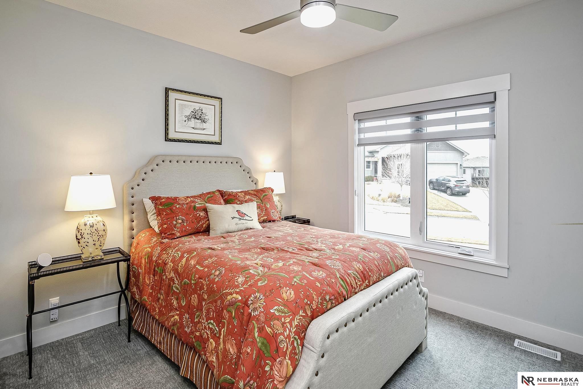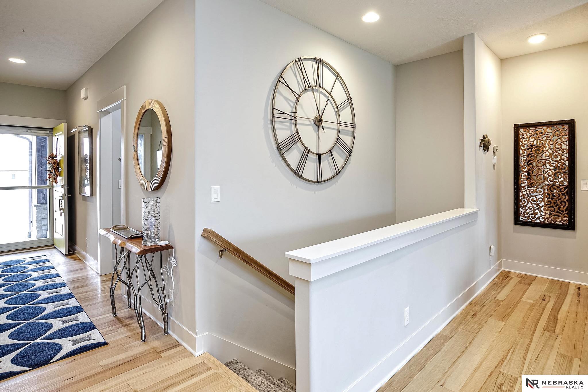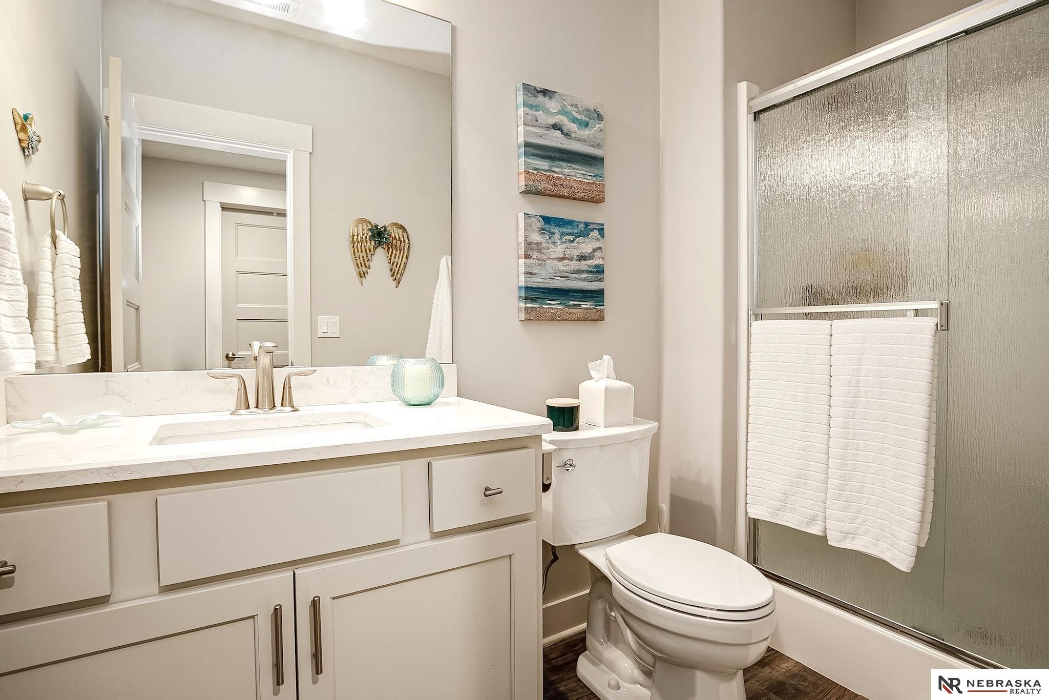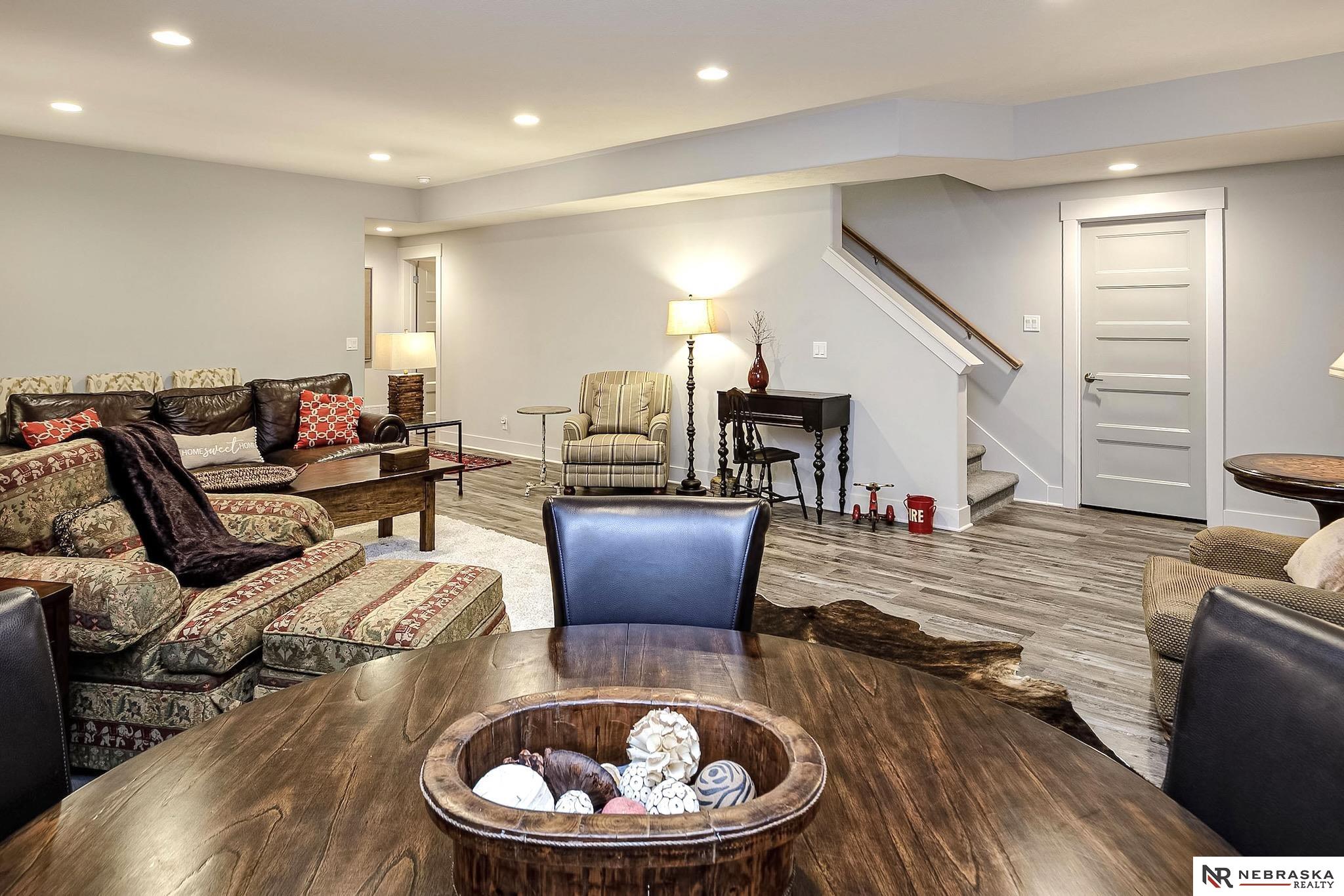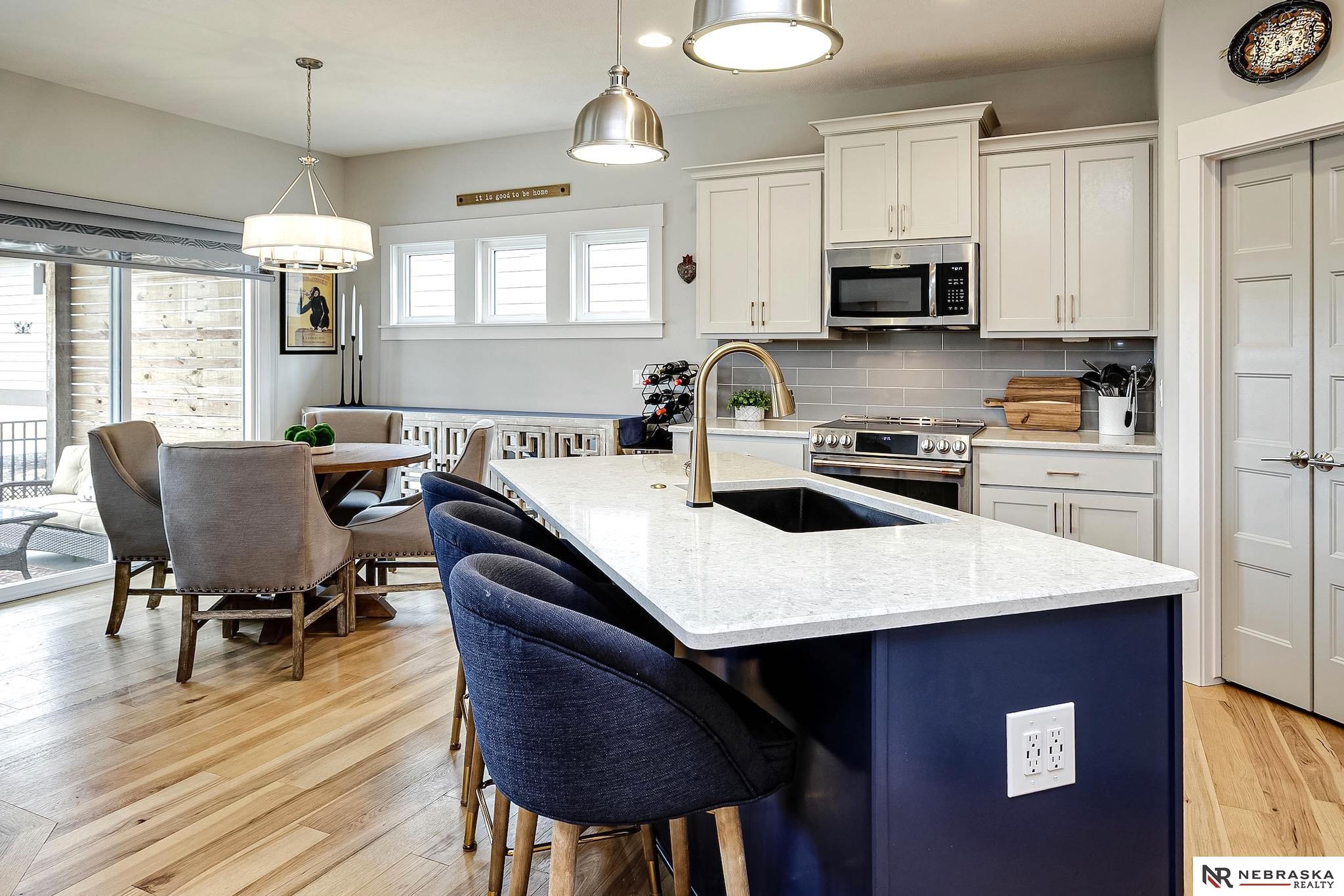 NW Omaha location. Snow & Lawn Care Optional! Overlooking peaceful green space. Partially covered fenced patio.Wood flooring in the kitchen & dining area compliment the updated Café range & dishwasher plus a walk-in pantry. Newer Karastan carpet. Stunning floor-to-ceiling stone fireplace & abundant natural light. Spacious primary suite features sconce lighting & room for a king bed. Large closet includes pocket-door access to the laundry with additional cabinetry added. Primary bath includes double vanities, private toilet & large tiled shower. Second main-floor bedroom with walk-in closet, sits near the full bath. Convenient drop zone with bench leads to garage, The finished lower level includes a huge open family room, bedroom with oversized walk-in closet, and ¾ bath. The spacious storage room features utility sink & extra hobby area. Extra tall garage. Steps away from Waterford lake & trails, 2 pools & clubhouse. New roof & gutters 11-24, Ext. paint 4-25, Int. paint 3-26.