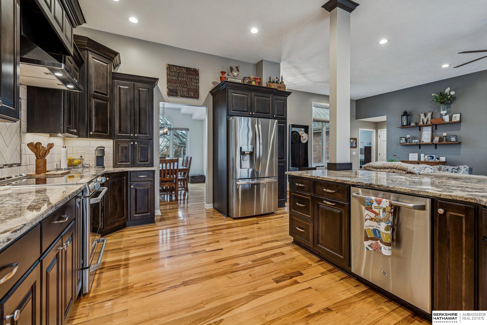 Meticulously maintained 3,700-square-foot finished walkout ranch offering the perfect blend of comfort and modern upgrades. The open-concept main floor features soaring ceilings and rich hardwood flooring throughout the primary living areas. The gourmet kitchen is a chef's dream, anchored by a massive granite island, custom dark cabinetry, stainless steel appliances, and a tiled backsplash. The sun-drenched living room is centered around a floor-to-ceiling stone fireplace, creating an inviting atmosphere for daily living. The primary suite provides a private retreat, highlighted by a luxuriously updated walk-in shower with designer tile work. The expansive finished walkout lower level is designed for entertaining, featuring a large recreation room and a custom wet bar with live-edge wood countertops and a beverage fridge. Lower Level also features an in-law suite with its own bathroom!