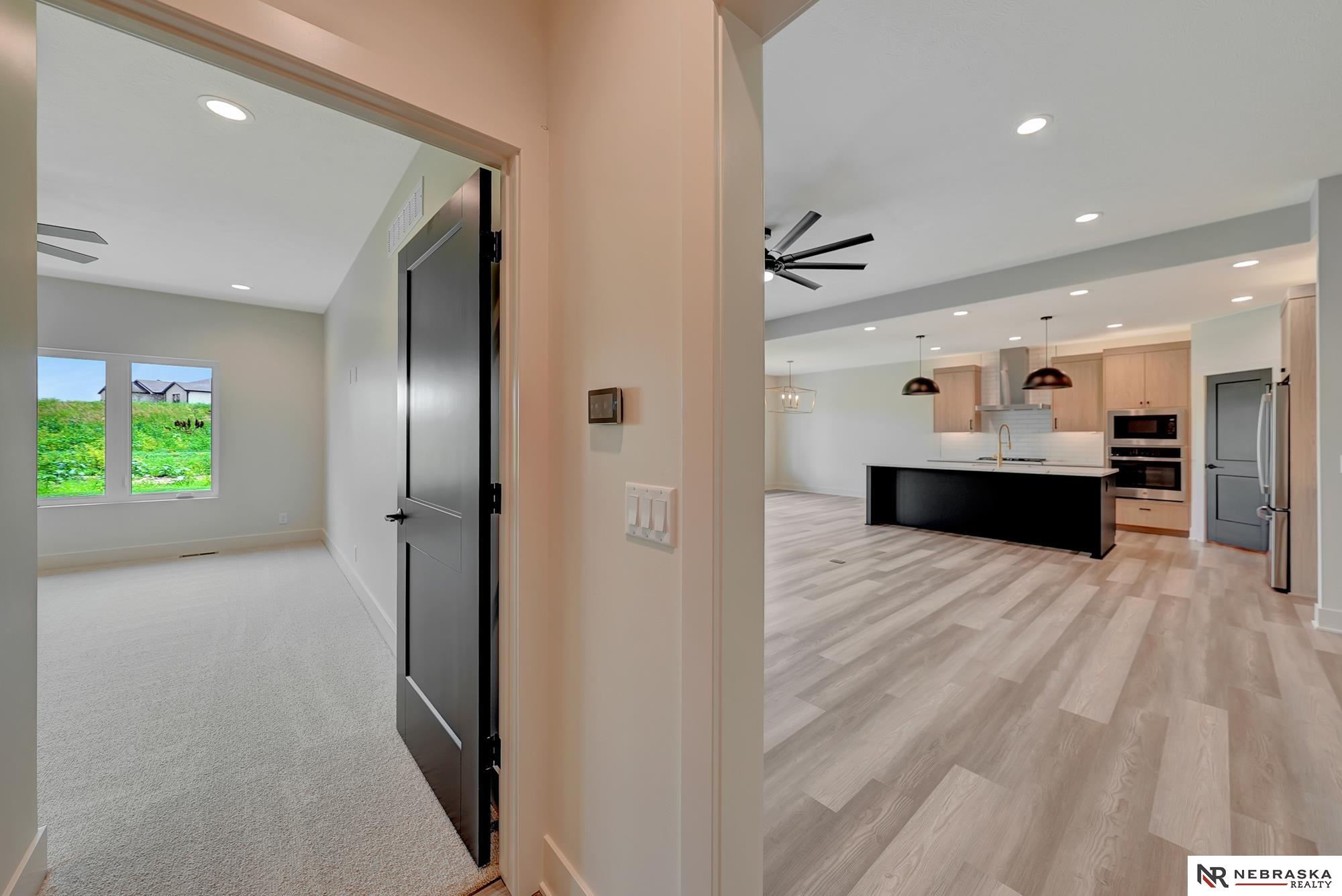 Step into this impressive new build by Tomasek Homes, offering more than 3,400 sq ft of finished living space. This home offers zero entry from the garage and back patio. This 4-bedroom, 3-bath gem features a thoughtfully designed main level that includes a spacious primary suite with a walk-in closet seamlessly connected to the laundry & mud room. The open-concept layout centers around a grand fireplace and is flooded with natural light thanks to double sliding doors which exit to a 15’ x 24’ covered patio. A 4-stall tandem garage adds both style and function, featuring a glass door that opens directly to the patio—perfect for indoor-outdoor entertaining. For added privacy, a newly landscaped berm with young trees line the back of the property, creating a natural screen and peaceful backdrop. Downstairs, you’ll find two additional bedrooms, a wet bar, a versatile flex room ideal for an office or workout room, and a generously sized family room. Schedule your private showing today!