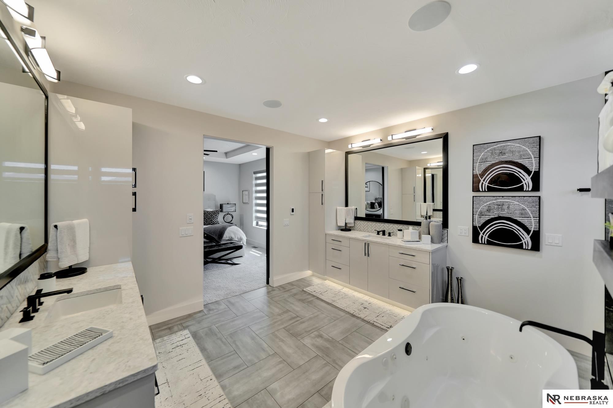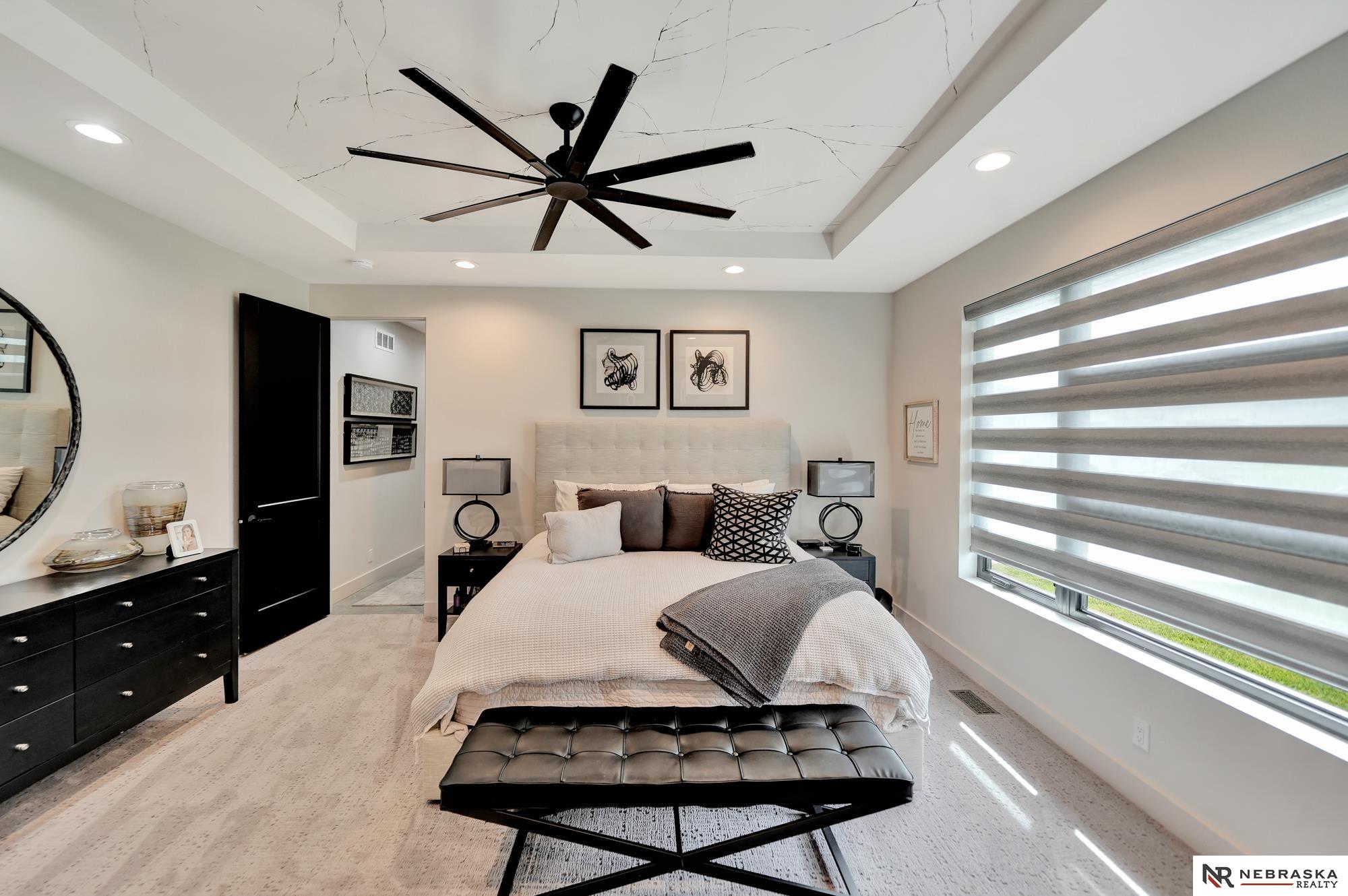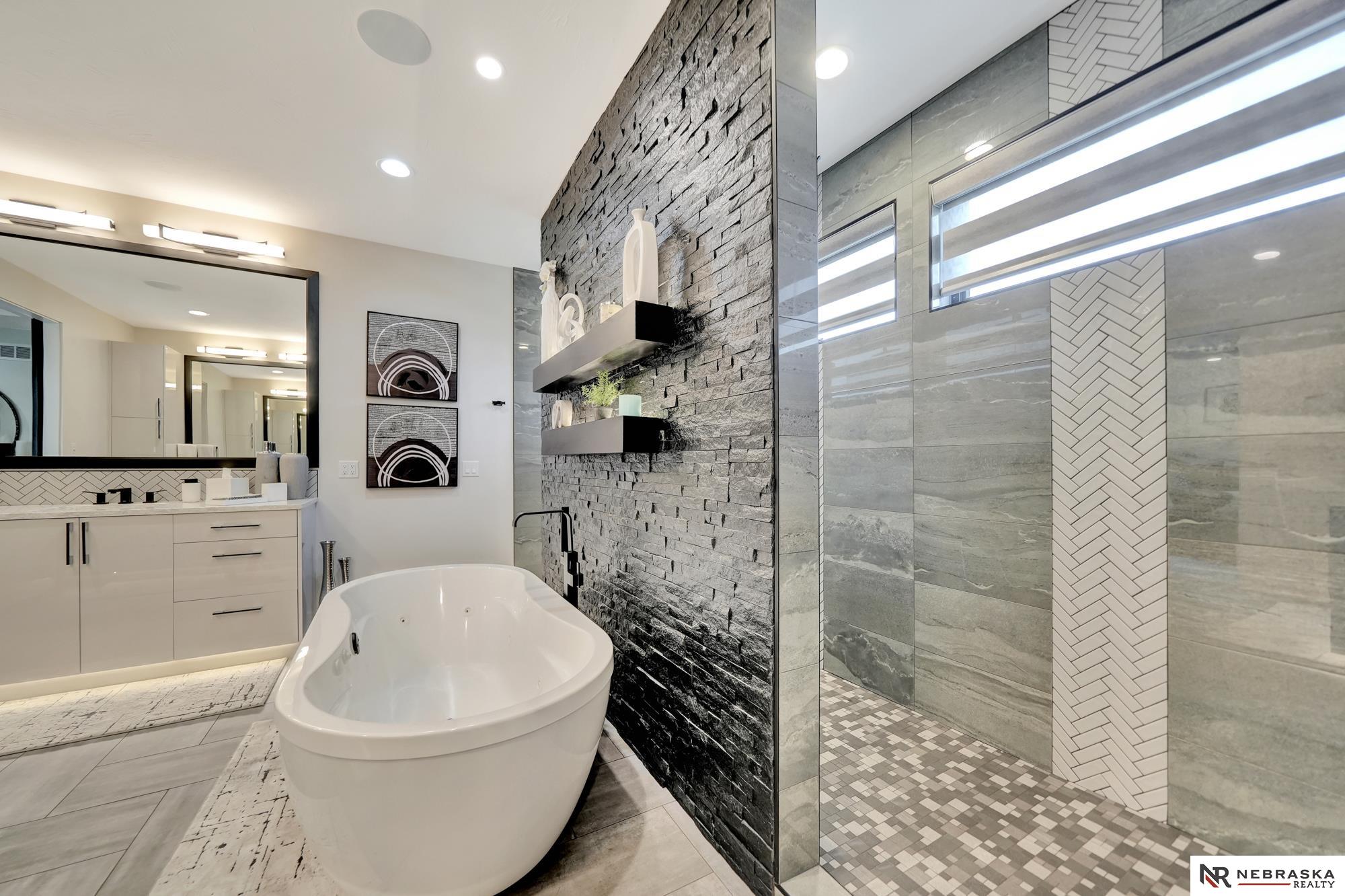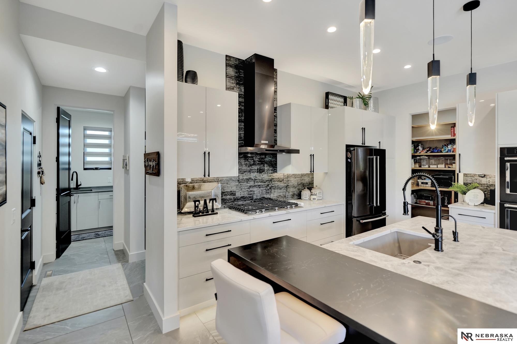 Beautiful custom-built 4 bed, 4 bath home on a large corner lot with thoughtful design throughout! Oversized 3-stall garage features an epoxy floor and rear garage door that opens to a private patio with firepit and hot tub - perfect for entertaining. Inside you'll find 12' ceilings, quartz countertops, custom cabinetry and lighting, plus smart features including LED lighting and automatic blinds. The living room connects seamlessly to the patio through oversized sliding glass doors. The stunning primary suite is a true retreat with heated floors, jetted soaking tub and luxury shower with 7 heads including rainfall. The lower level offers a spacious family room, wet bar and built-in wine cooler with accent lighting. Zero-entry, beautifully landscaped yard, iron fence and a gorgeous gas fireplace on the patio complete this home!