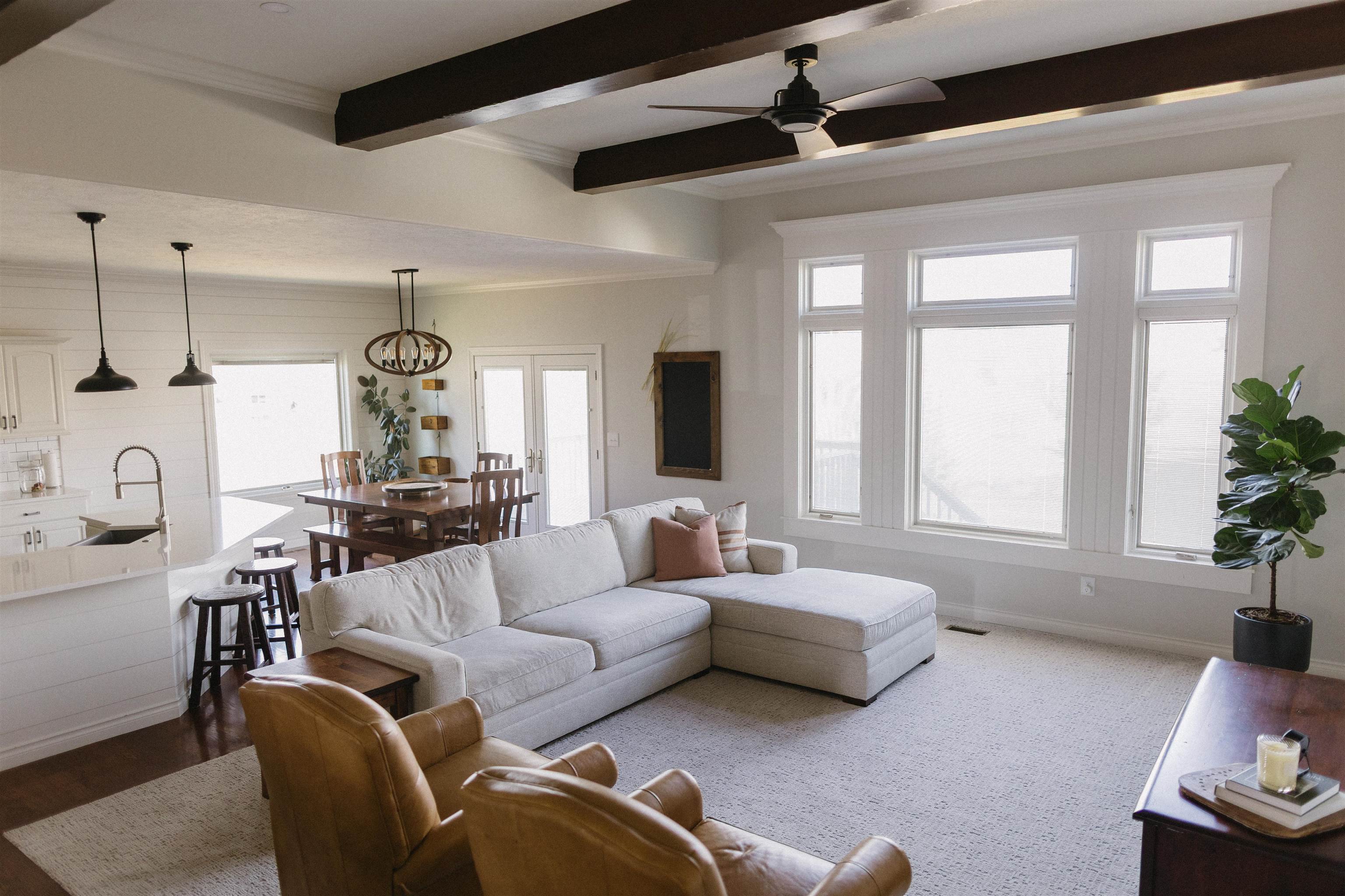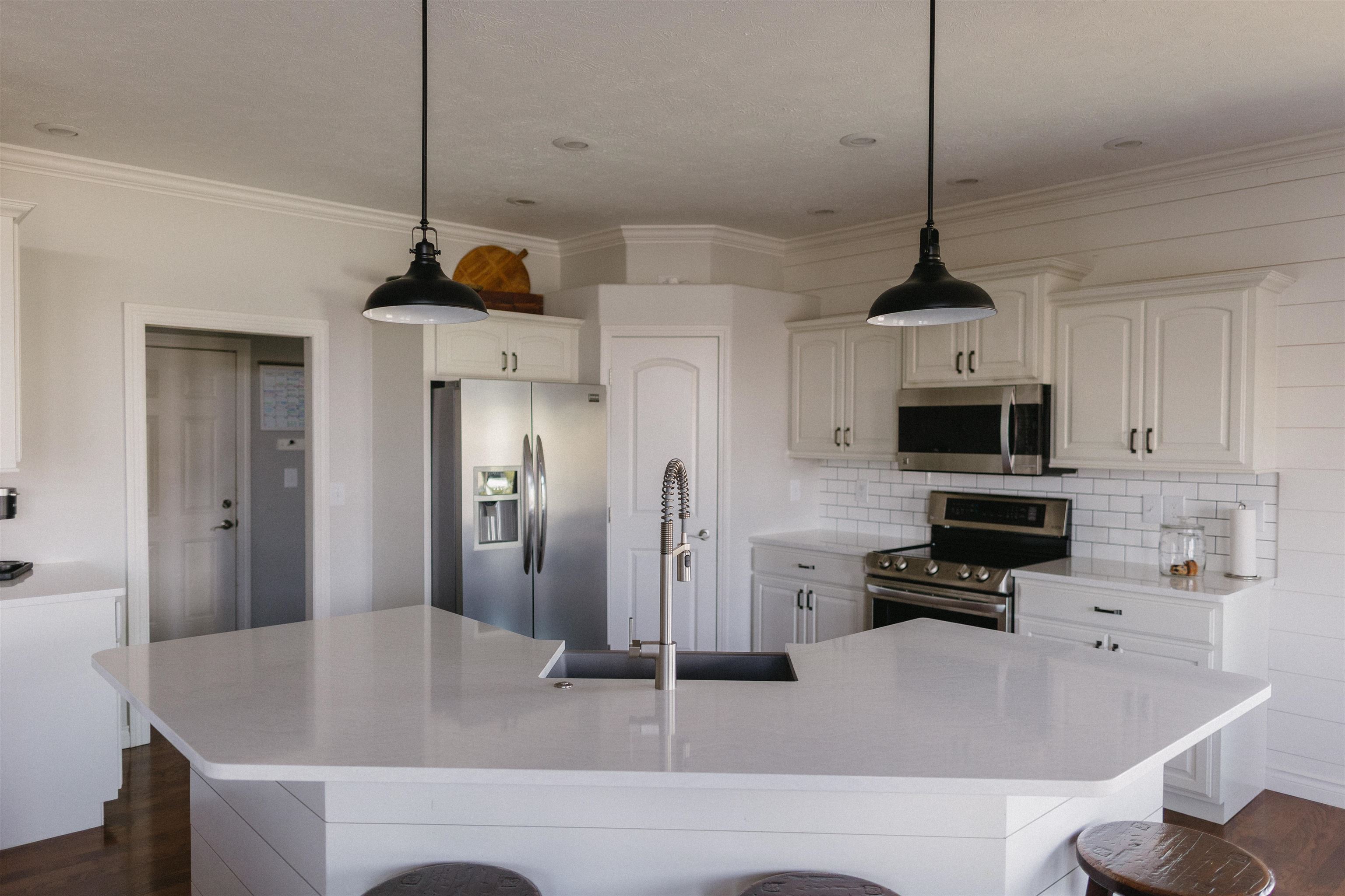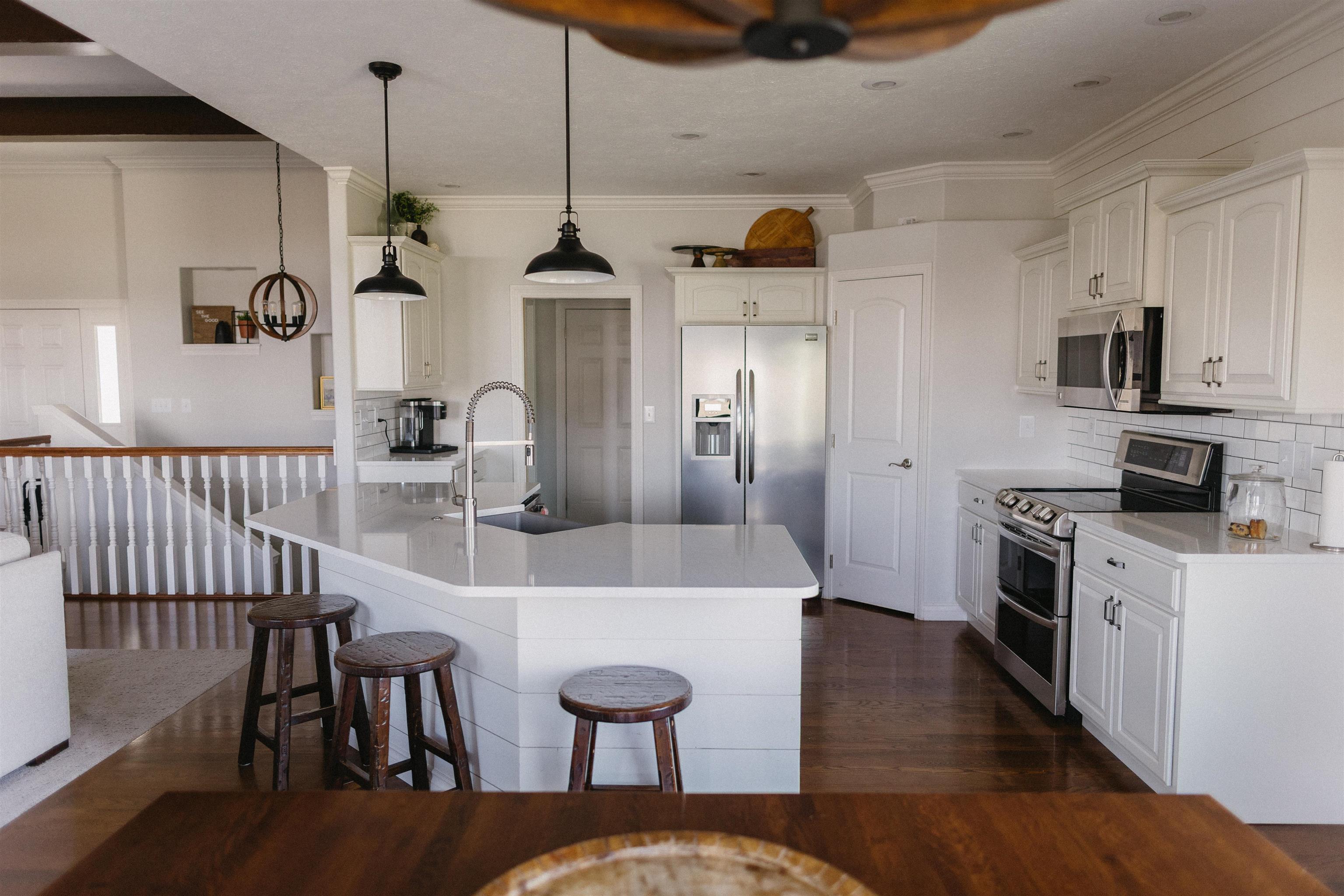 This five-bedroom, three-bath home offers a functional layout with three bedrooms and two bathrooms on the main level and two additional bedrooms with a bathroom in the basement. The main living area features vaulted ceilings with decorative wood beams and an open-concept design connecting the living, dining, and kitchen spaces. The kitchen and living areas were remodeled with quartz countertops, updated trim work, crown molding, and shiplap accents. Significant improvements have been completed over time, including Pella windows and doors with built-in shades throughout most of the home, updated lighting with added can lights, and updated kitchen appliances. The main level features new carpet installed in 2024. Exterior improvements include a new roof and new siding in 2024, a widened driveway with space for additional parking and a trash enclosure, and a detached shed providing additional storage. Outdoor living spaces include a deck off the main level and a walkout basement leading to a patio area. The yard is well established and includes underground sprinklers. There is also a storage shed in the backyard. A new air conditioner was installed in 2012. This beautiful home combines recent major updates with an open floor plan and indoor-outdoor living opportunities!
