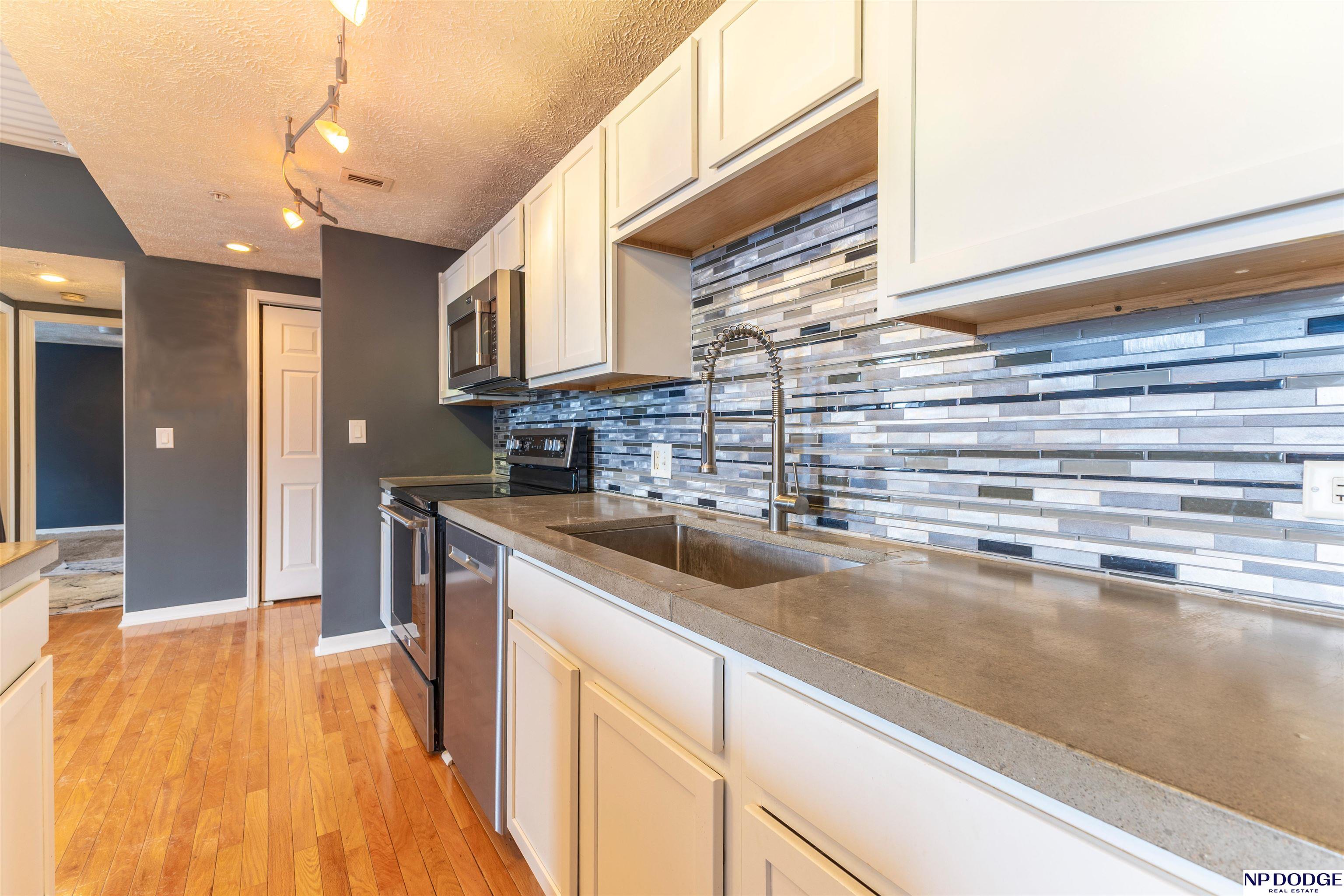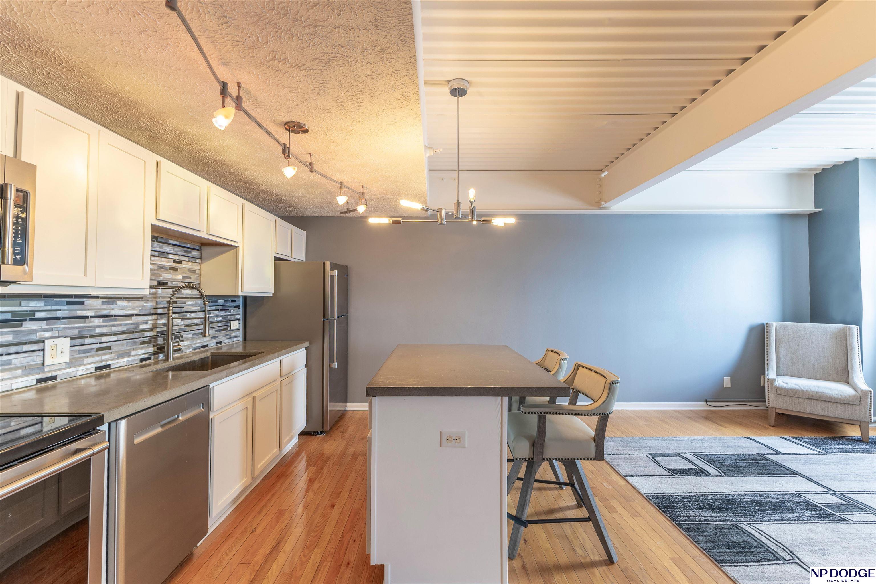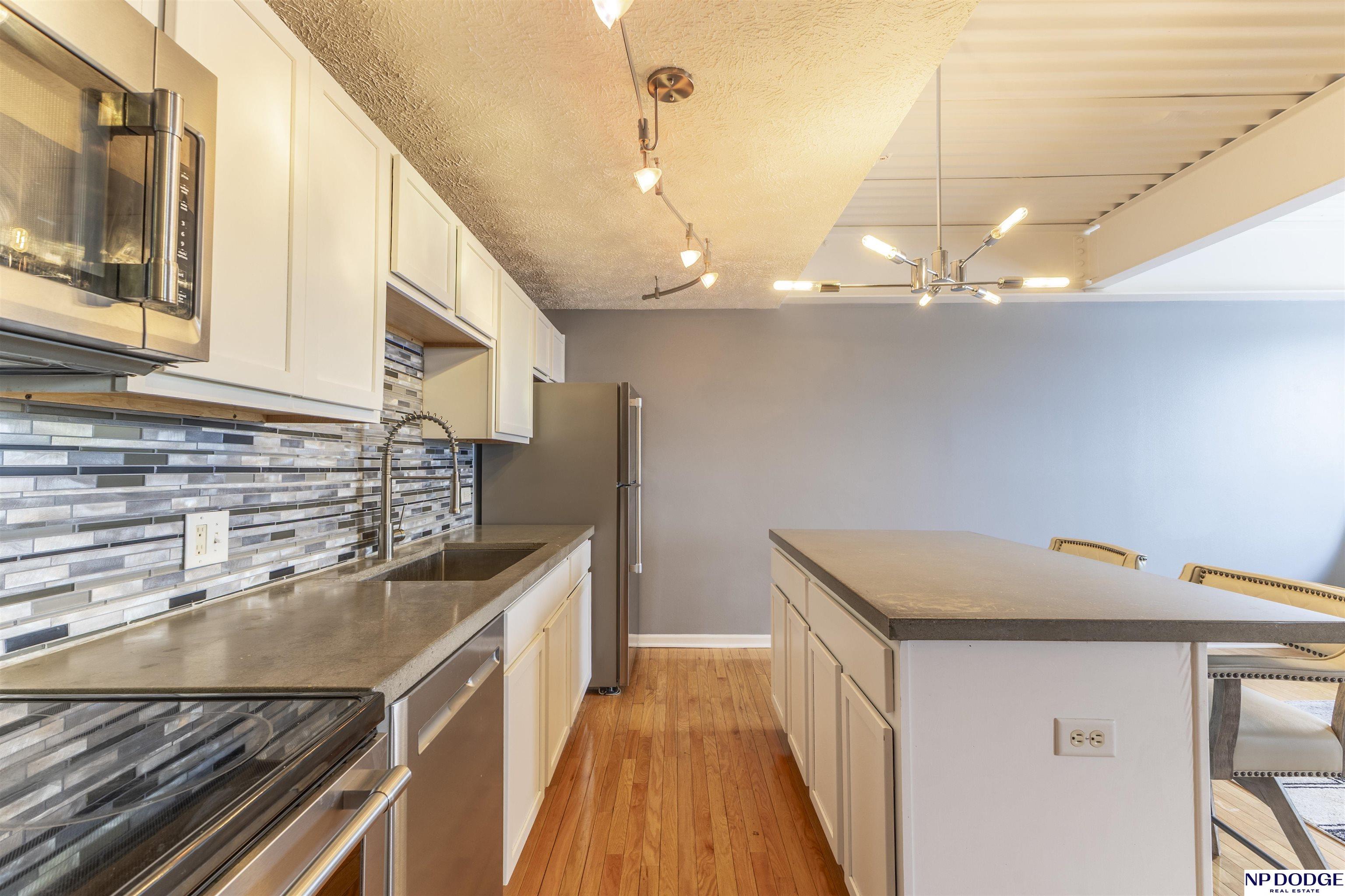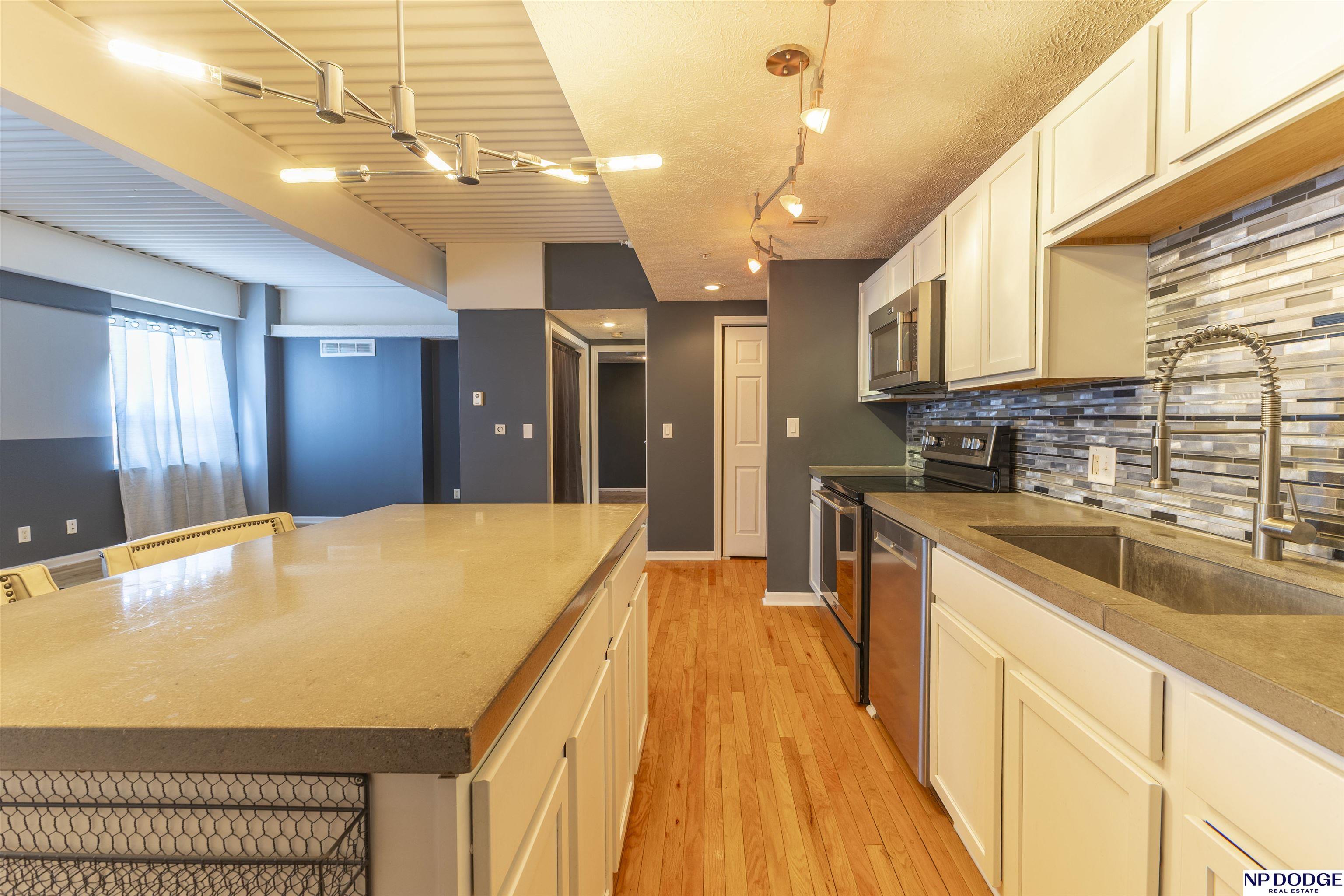 Stylish Park Plaza condo! Effortless living, prime location. Featuring modern finishes, hardwood floors, designer lighting w/horizontal mosaic tile backsplash that highlights the kitchen’s contemporary design and open-concept layout. The bright, open space, stainless steel appliances & sleek concrete countertops are exceptional. The spacious kitchen island adds storage and comfortable seating, perfect for everyday living or entertaining. Enjoy a designated garage parking space plus outdoor parking, secured entry, elevator FOB access & video surveillance. Building amenities include a fitness center, club room with full kitchen, outdoor deck, rooftop grill, storage unit and complimentary washer/dryer on every floor. HOA covers water, gas, sewer, waste management, heating and cooling; owner pays electricity. Conveniently located near Midtown Crossing, Turner Park, Blackstone, Aksarben, Old Market, Creighton, UNMC, UNO and Metro, making this an ideal home base for vibrant Midtown living!