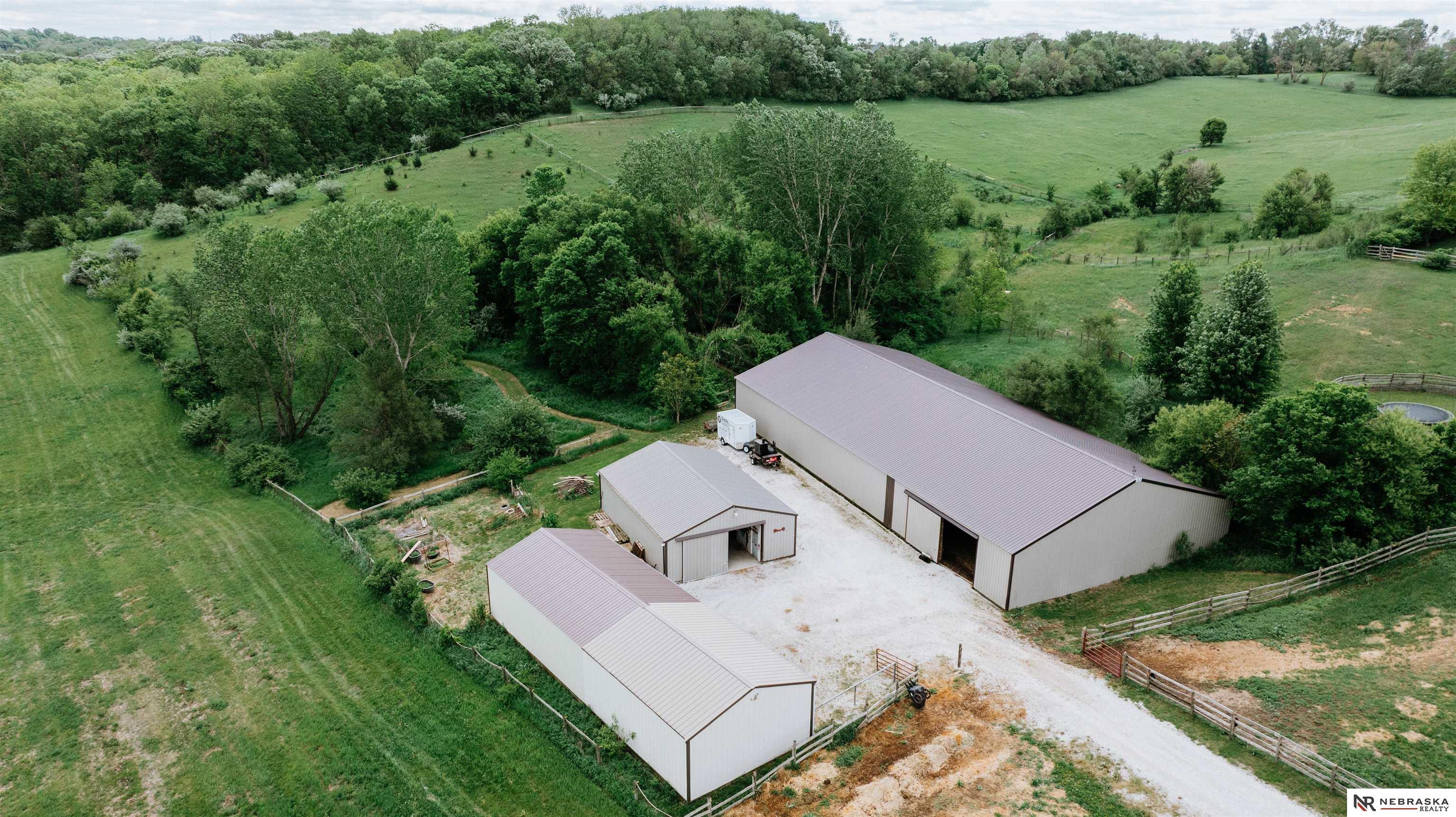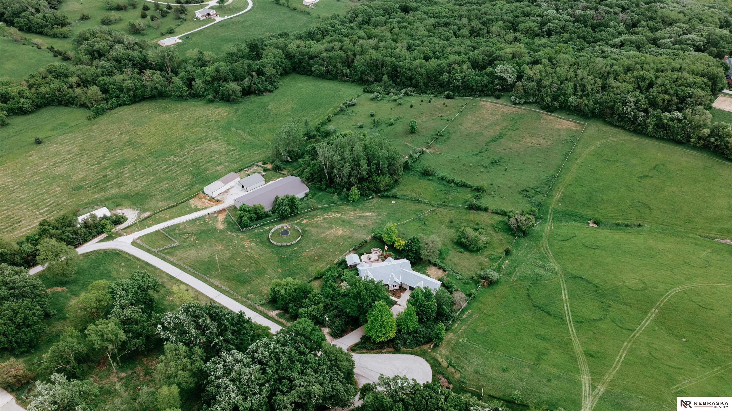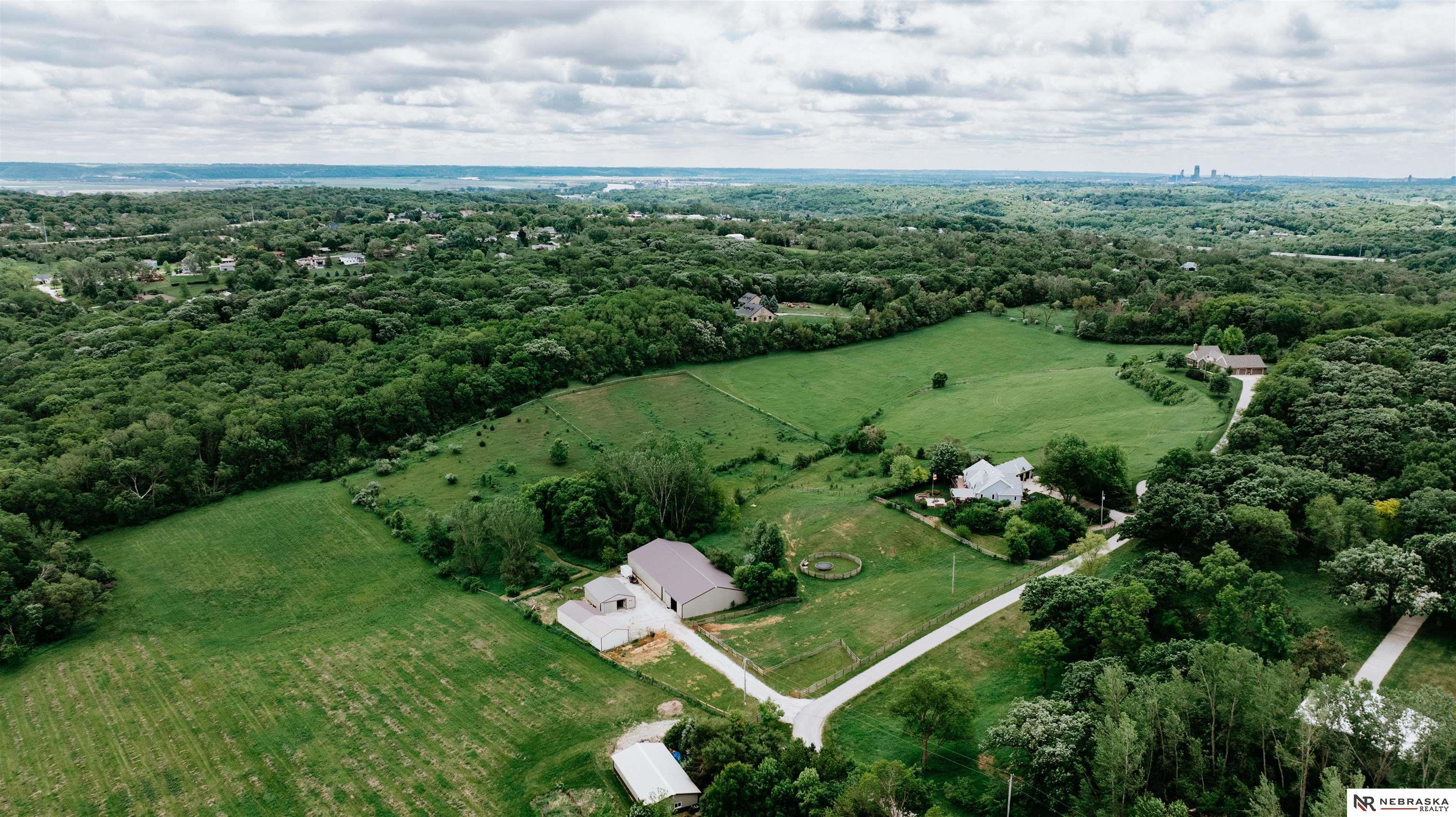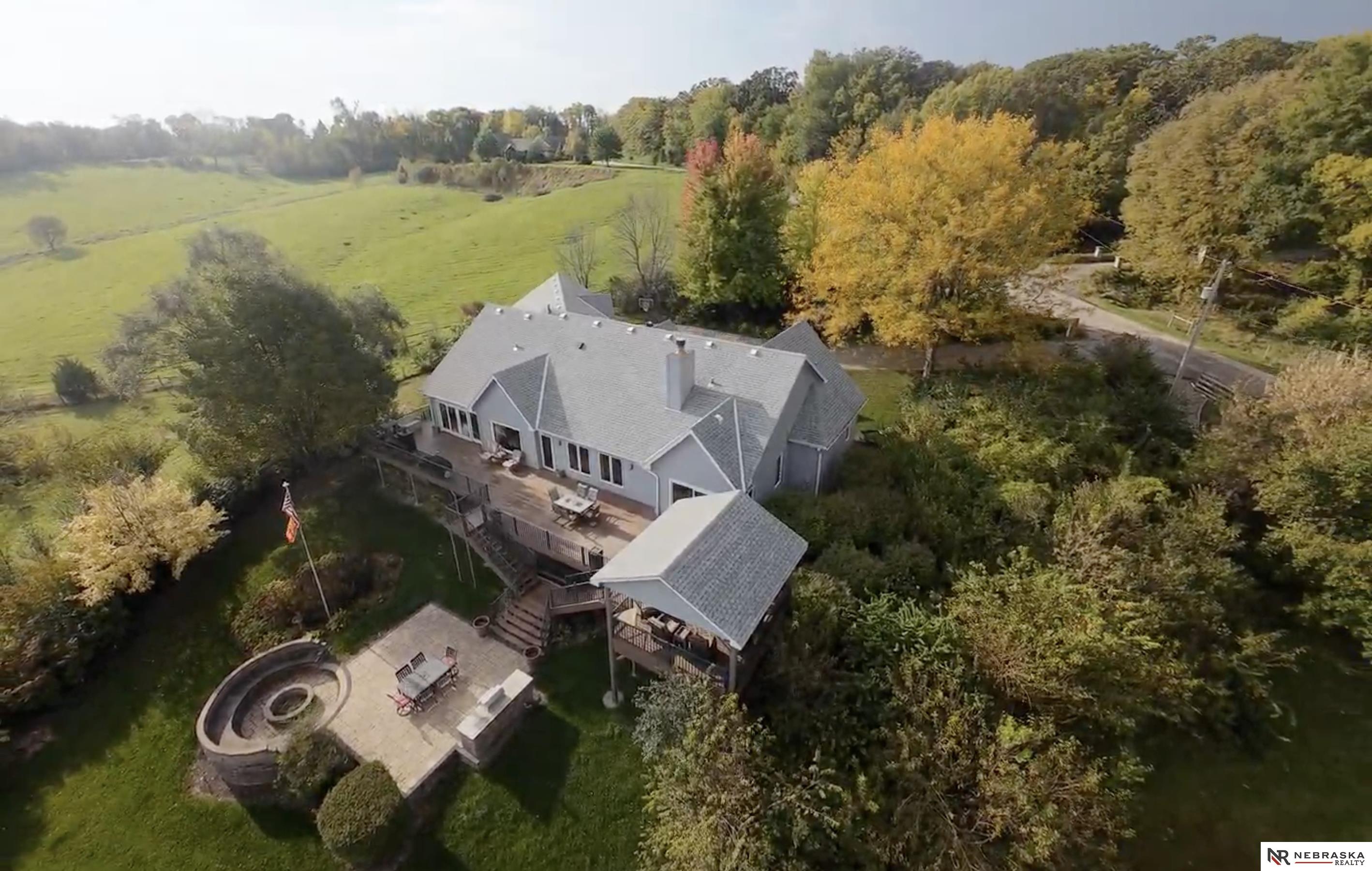 Beautifully updated ranch home on 9.47± serene acres just minutes from Omaha! The main level now features fresh, modern paint that brightens the open layout, highlighted by a stone fireplace and stunning views. The chef’s kitchen includes stainless steel appliances, a huge island, double oven, beverage fridges, and walk-in pantry. The spacious primary suite offers deck access, dual walk-in closets, whirlpool tub, and walk-in shower. The finished basement is perfect for entertaining with a home theater, wet bar, and two additional bedrooms. Outdoor living shines with a wraparound deck, gazebo, 10-person spa, fire pit, and outdoor kitchen. Acreage includes multiple fenced areas and three versatile outbuildings, including a large indoor arena and barn. A peaceful, private retreat with thoughtful details throughout—truly a rare find so close to the city! AMA.