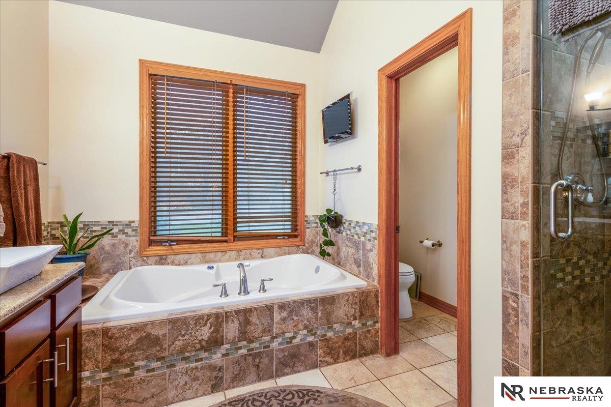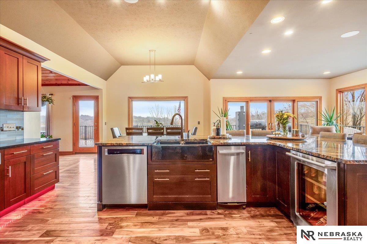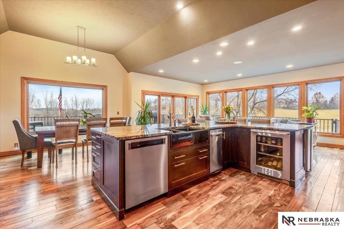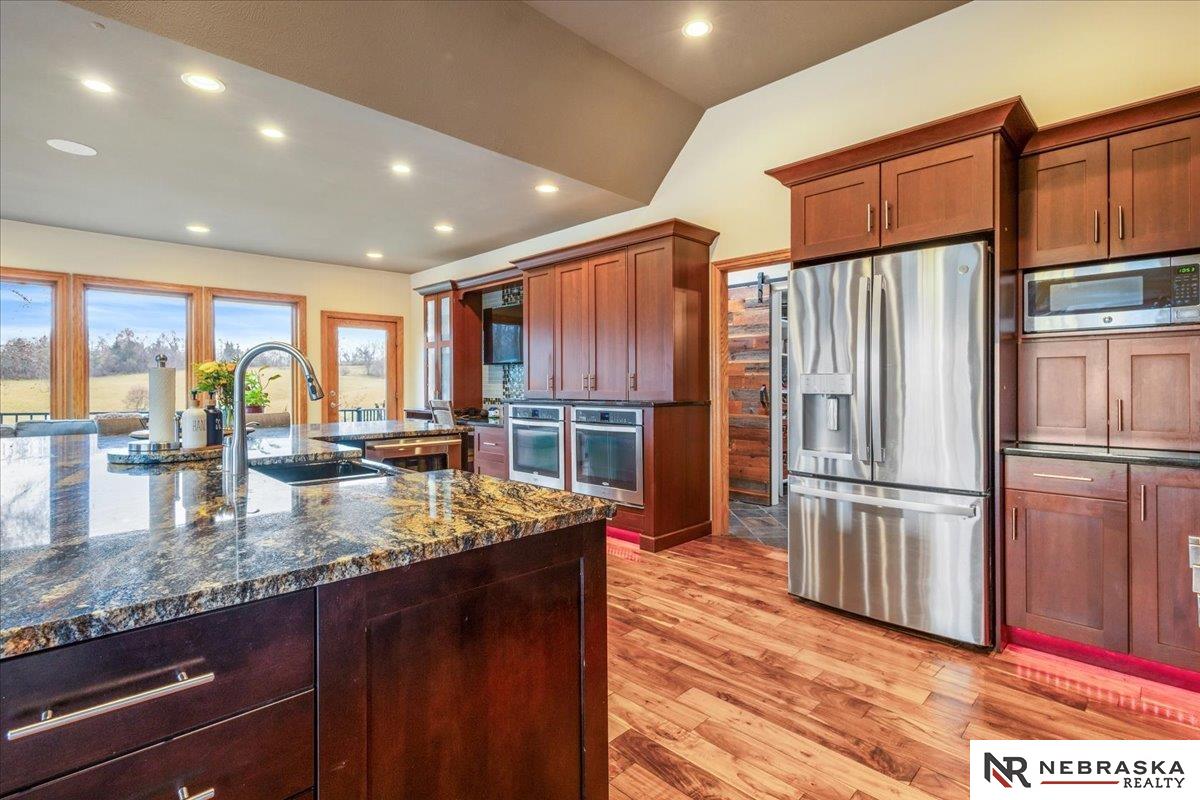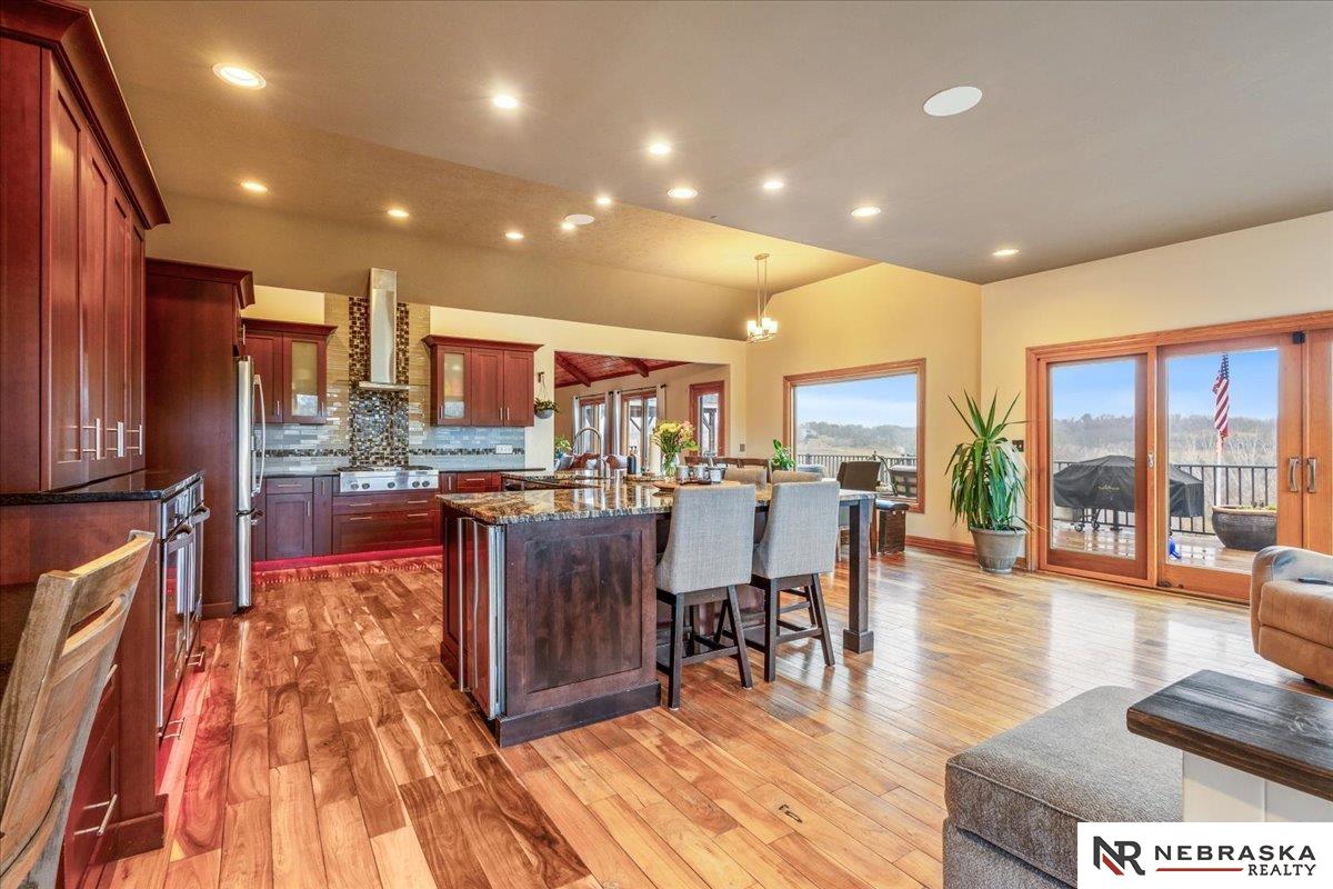 Beautifully updated ranch home on 9.47± serene acres just minutes from Omaha! The main level now features fresh, modern paint that brightens the open layout, highlighted by a stone fireplace and stunning views. The chef’s kitchen includes stainless steel appliances, a huge island, double oven, beverage fridges, and walk-in pantry. The spacious primary suite offers deck access, dual walk-in closets, whirlpool tub, and walk-in shower. The finished basement is perfect for entertaining with a home theater, wet bar, and two additional bedrooms. Outdoor living shines with a wraparound deck, gazebo, 10-person spa, fire pit, and outdoor kitchen. Acreage includes multiple fenced areas and three versatile outbuildings, including a large indoor arena and barn. A peaceful, private retreat with thoughtful details throughout—truly a rare find so close to the city! AMA.