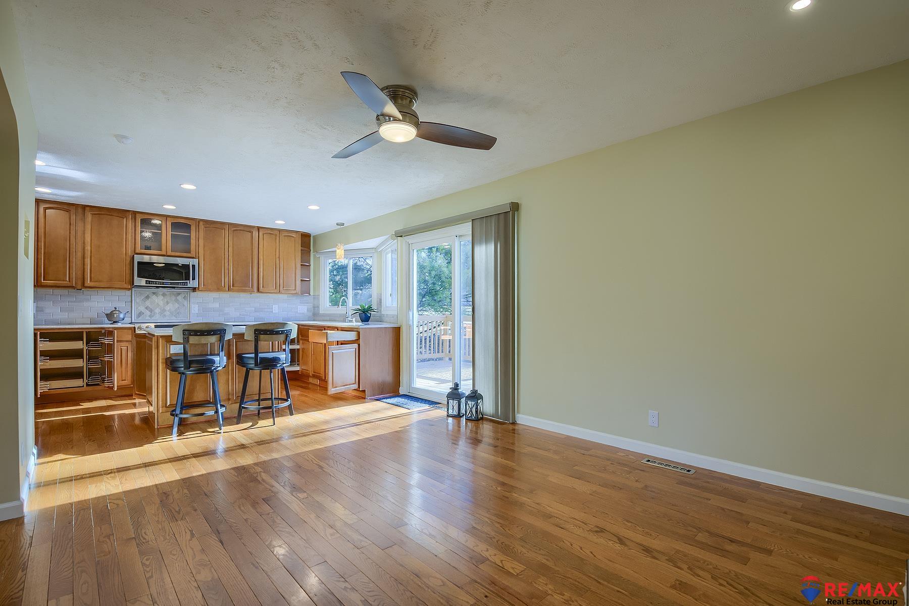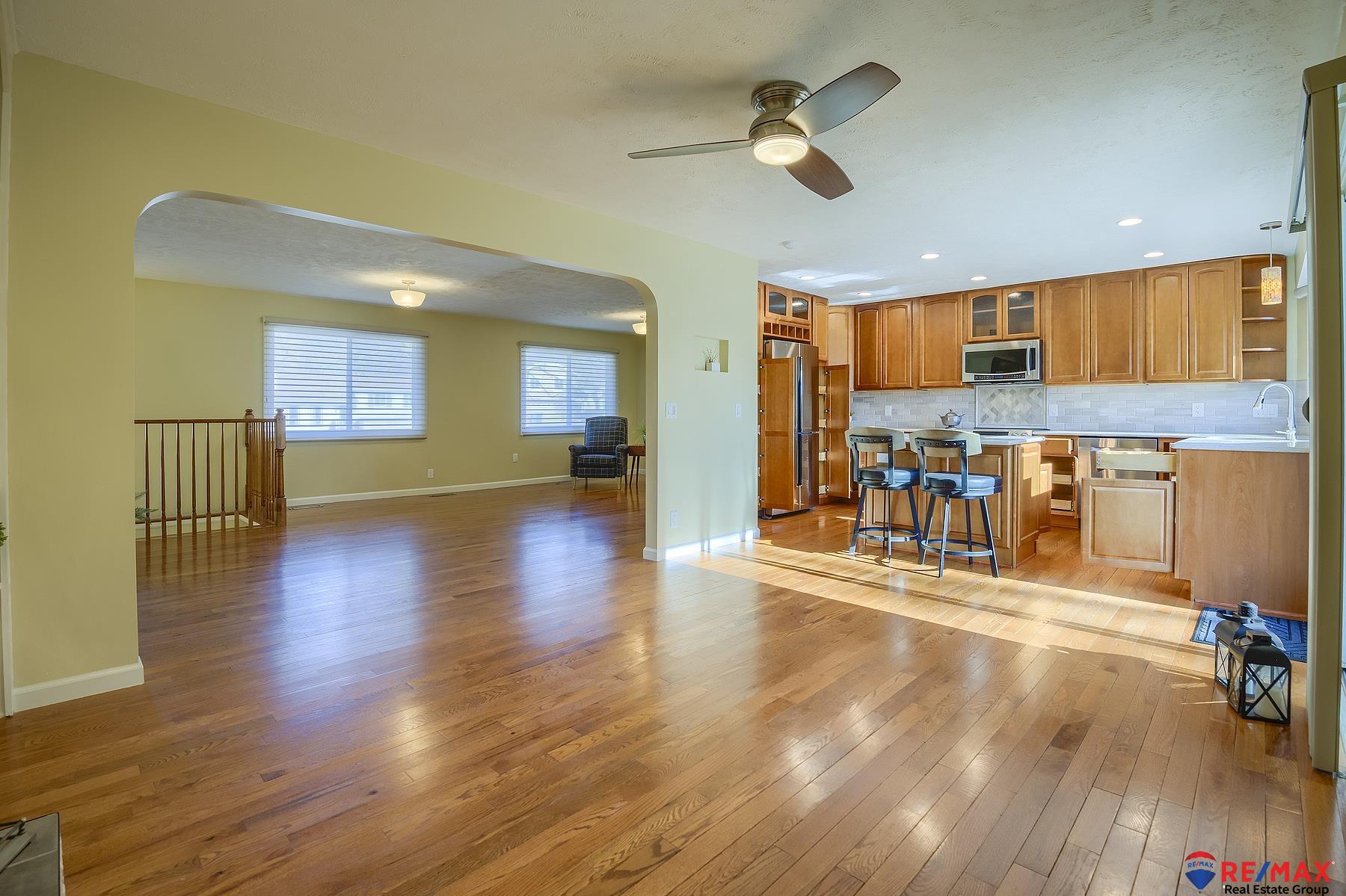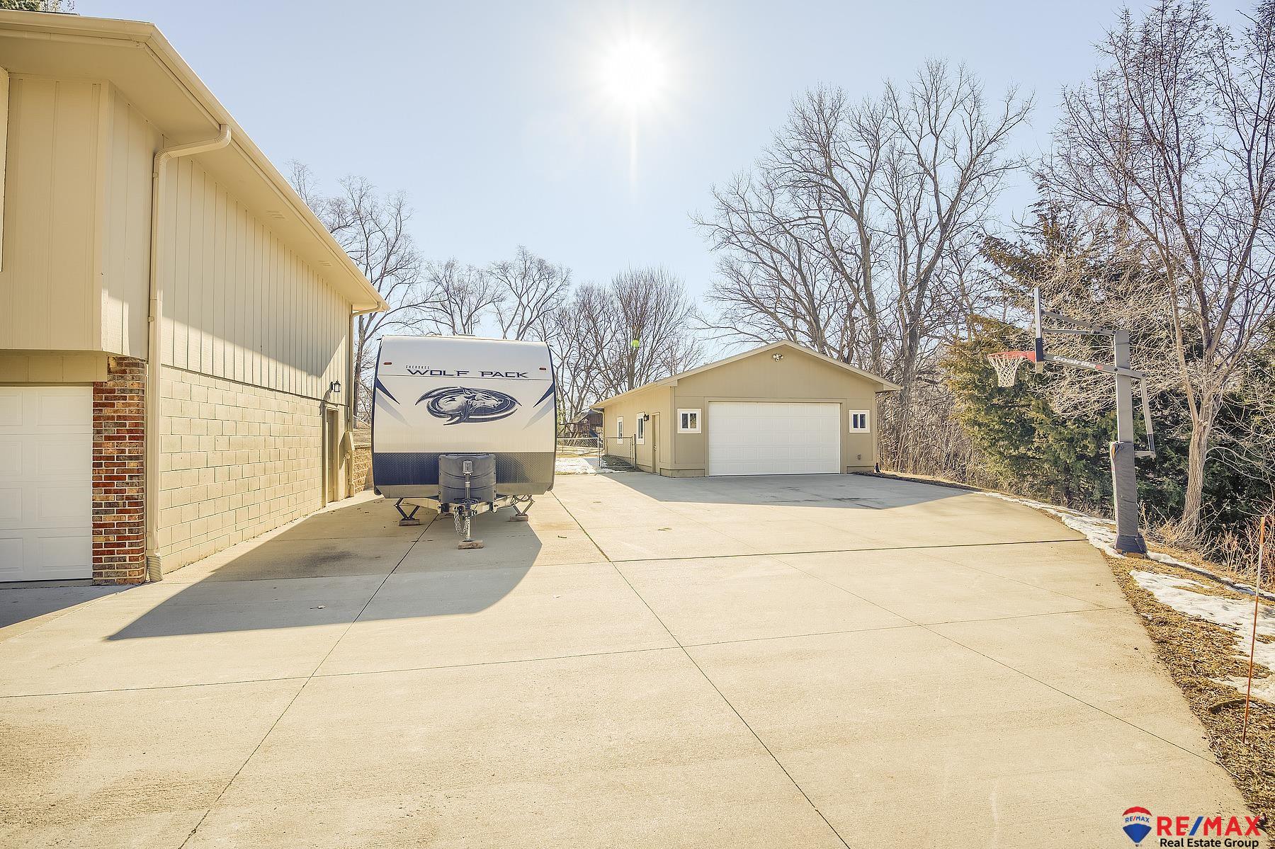 MINI-ACREAGE IN TOWN! 2.5 acres with large 24x38 heated/air conditioned outbuilding w/10 ft. ceilings and is heavily insulated, sealed and has a coated concrete floor. This beautiful home that was remodeled top to bottom with the finest upgrades and is not a typical split entry. Living room plus the family room with fireplace is just off the kitchen which has been totally remodeled with quartz counters and other top features such as roll-out drawers, mixer lift, induction range with double oven, refrigerator, etc. Newer hardwood floors throughout main floor. Large rec room in basement has wet bar with quartz counter, fridge & microwave, full bath with large soaking tub. Hunter Douglas window coverings throughout, extra large parking pad for an RV. Roof, heat/AC 9 years old. House garage is oversized 2-car with insulated doors and openers. There's a 12-zone sprinkler system. Rare gem in Bellevue.