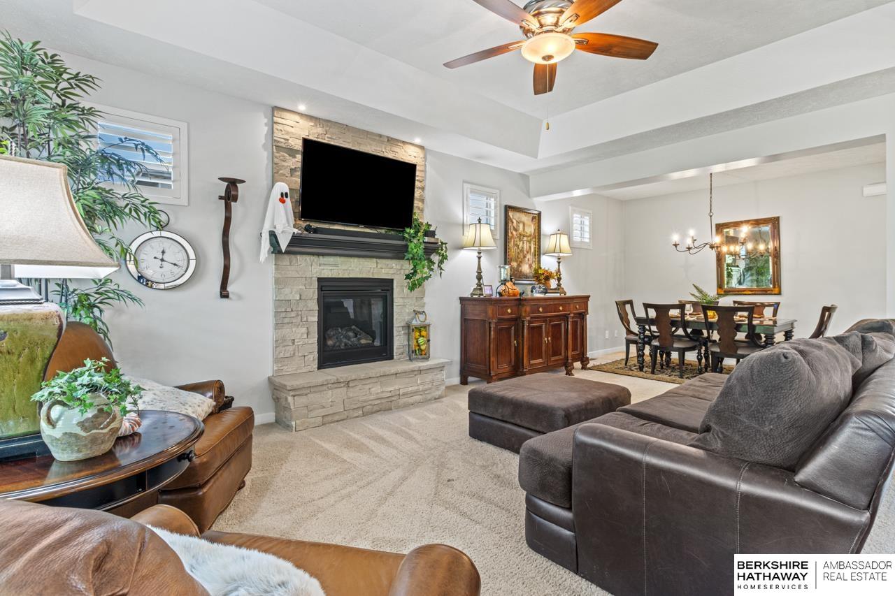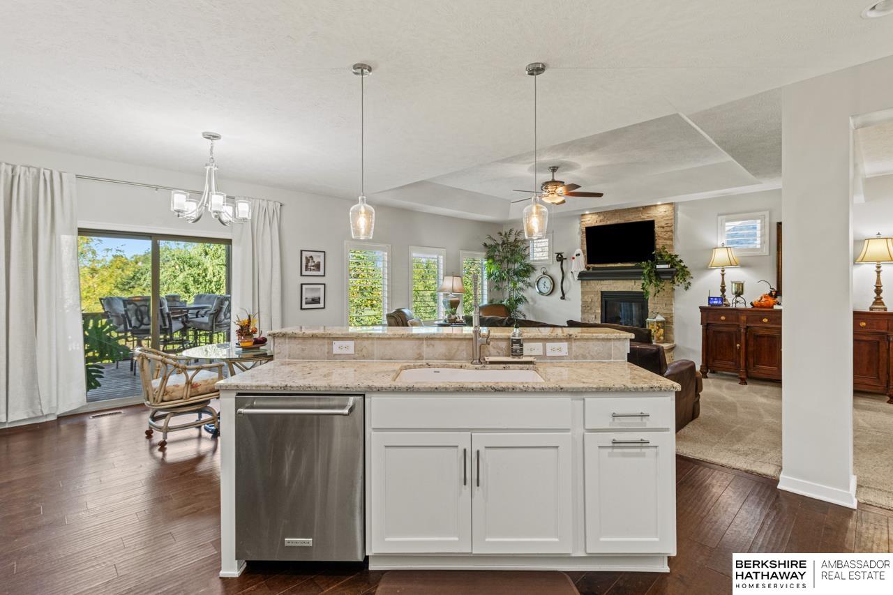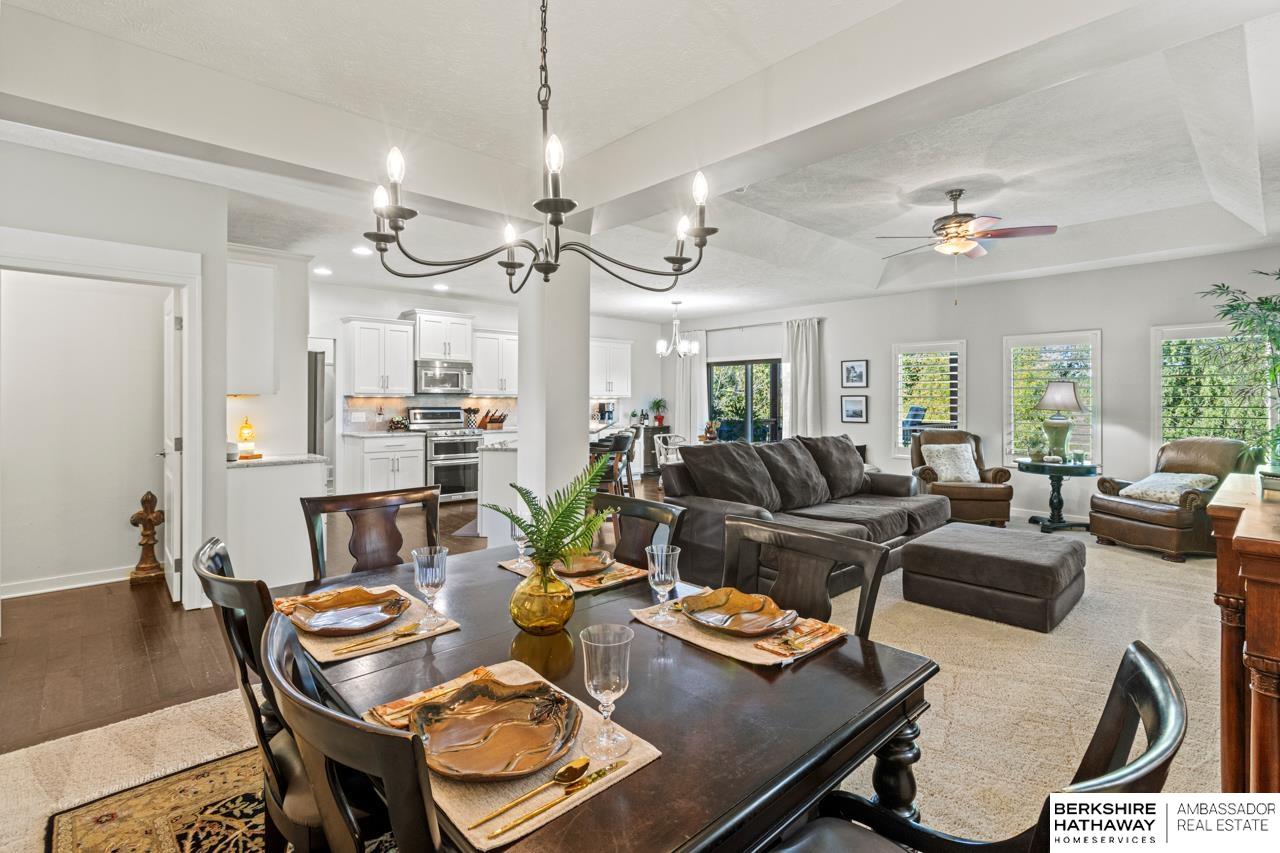 Welcome home to this beautifully maintained ranch in Papillion! Step inside to discover a bright, open floor plan with hardwood floors, tall ceilings, and thoughtful upgrades throughout. The chef’s kitchen features crisp white cabinetry, stainless steel appliances, double ovens, granite counters, and a walk-in pantry with charming checkered floors. The living area flows effortlessly to a covered deck—perfect for morning coffee or evening grilling—overlooking a fenced backyard and landscaped patio. The spacious primary suite offers a tiled walk-in shower, dual vanities, and a private dressing area. With multiple outdoor living spaces, a three-car garage, stone-accented exterior, and welcoming front porch, this home perfectly blends comfort and curb appeal. Sellers are offering a $10,000 credit toward flooring or buyer’s closing costs. Located near parks and trails in a quiet neighborhood—this one truly has it all.