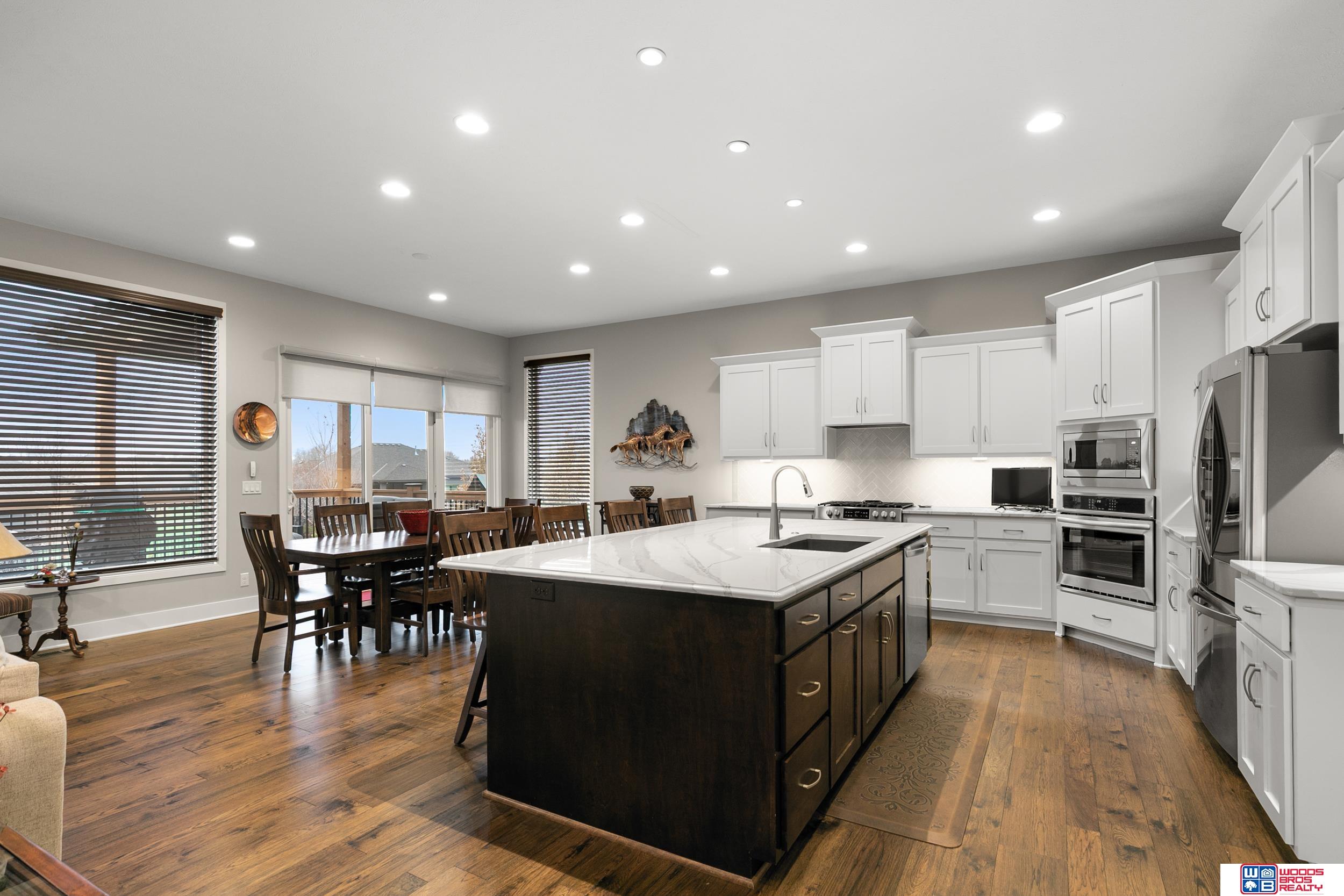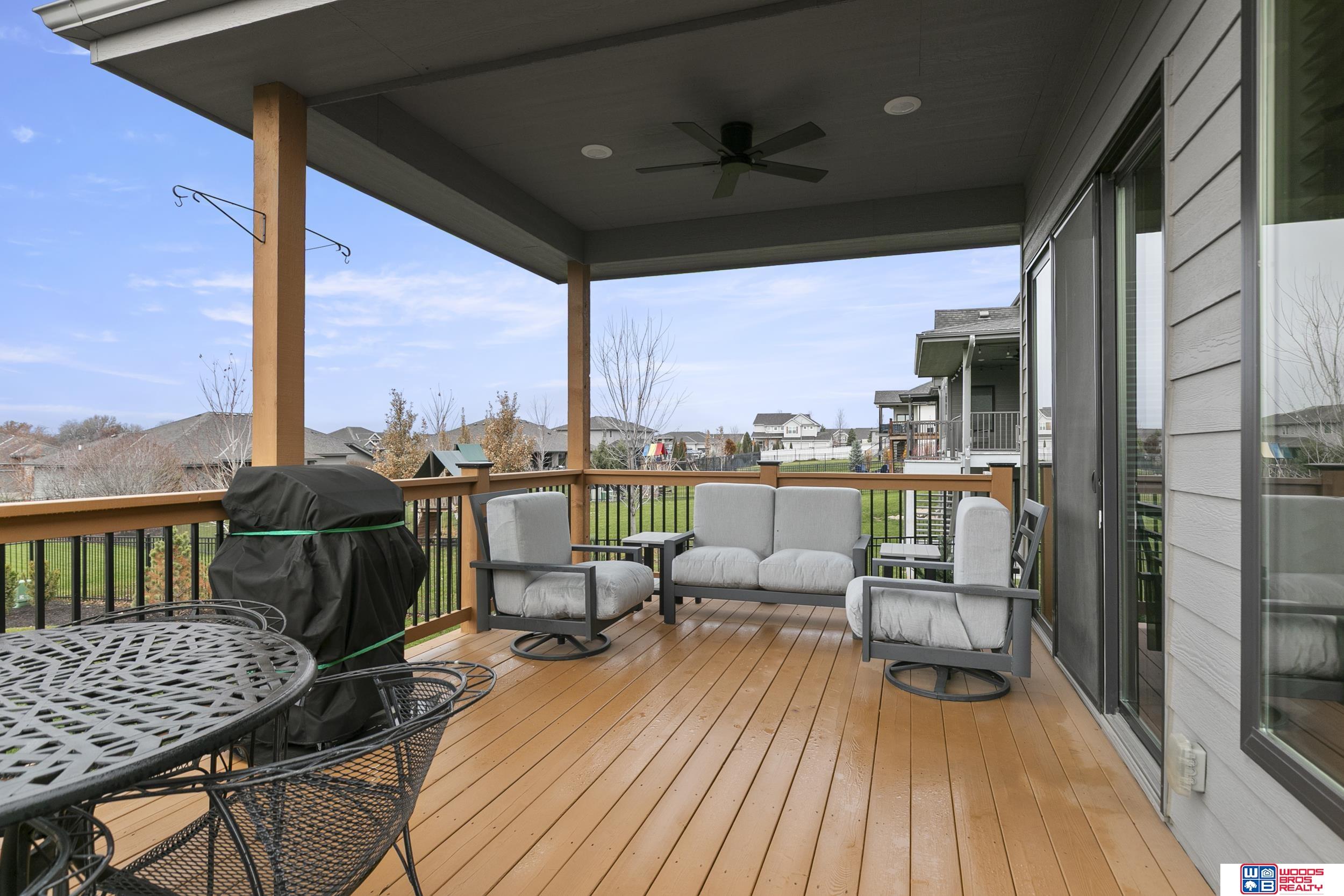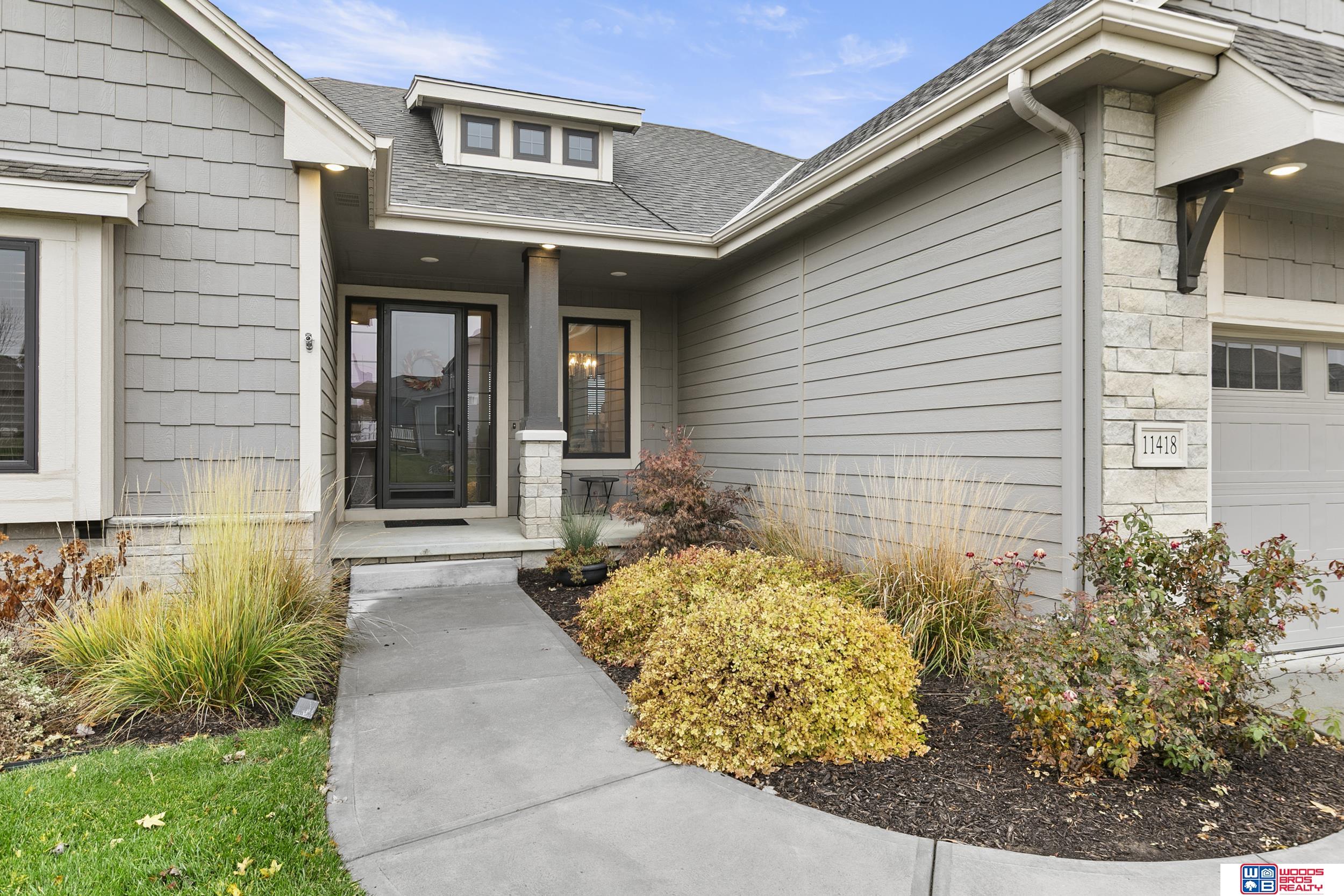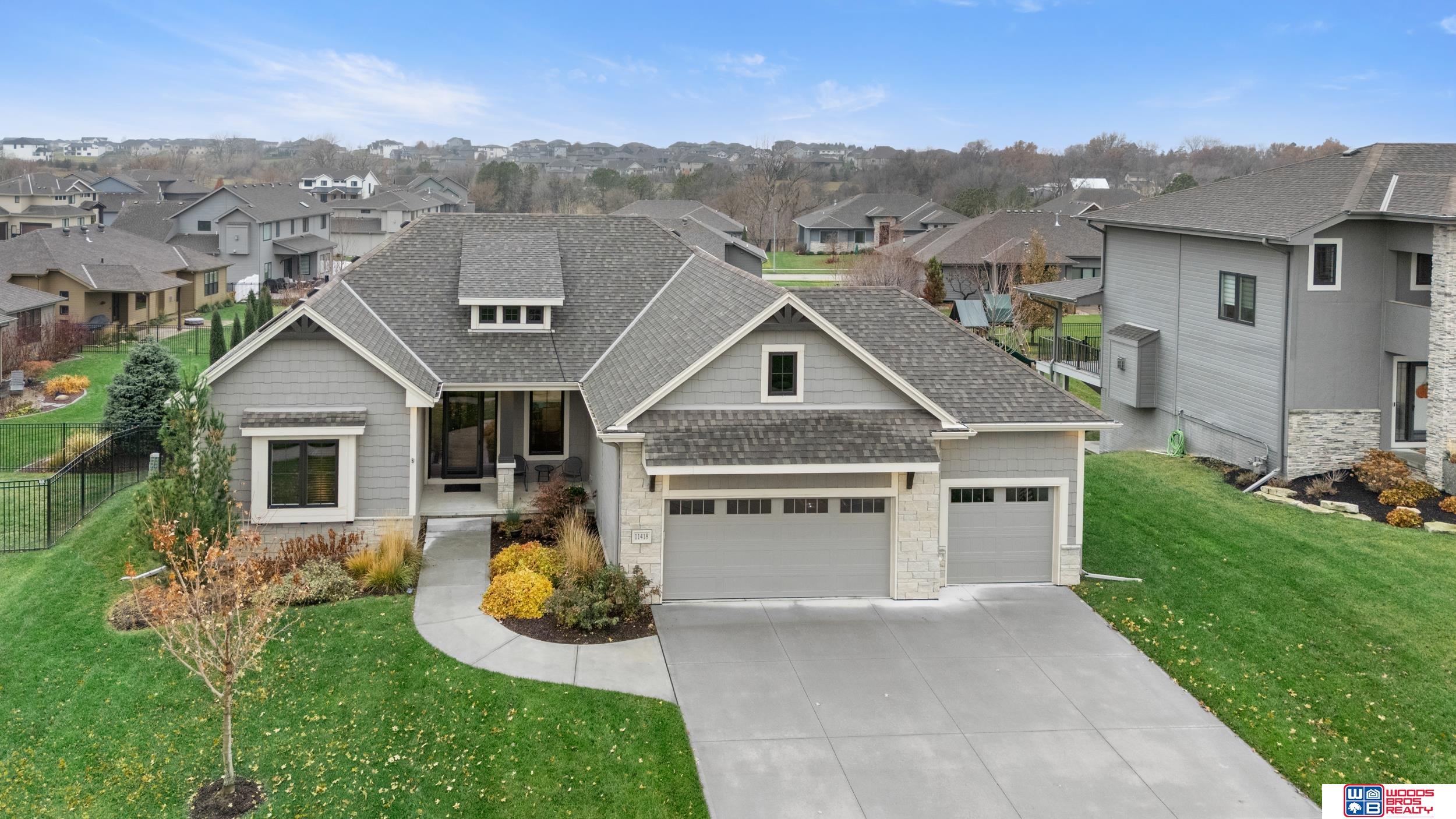 Built in 2019, this Louden ranch by Woodland Homes offers refined design with a finished walkout lower level and timeless craftsman curb appeal. The open floor plan features soaring ceilings, a spacious great room, and an upscale kitchen with a massive island, high-end appliances, bright dinette, walk-in pantry, and mudroom with drop zone and locker space. The main level includes two bedrooms, highlighted by a luxurious primary suite with a large walk-in shower and oversized closet. The walkout lower level is ideal for entertaining with a media/theatre room, rec room with wet bar and dining area, plus two conforming bedrooms connected by a Jack-and-Jill bath. Situated on a large, flat east-facing walkout lot—ideal for a future pool or custom landscaping—with a covered deck, covered front porch, and three-car garage. Prime Papillion location near schools, shopping, Werner Park, and the Prairie Queen Lake area.