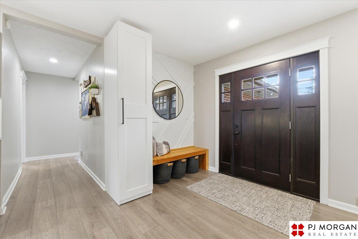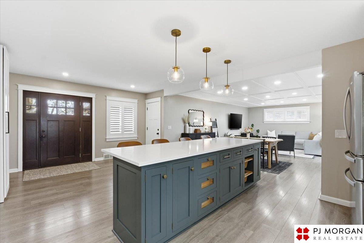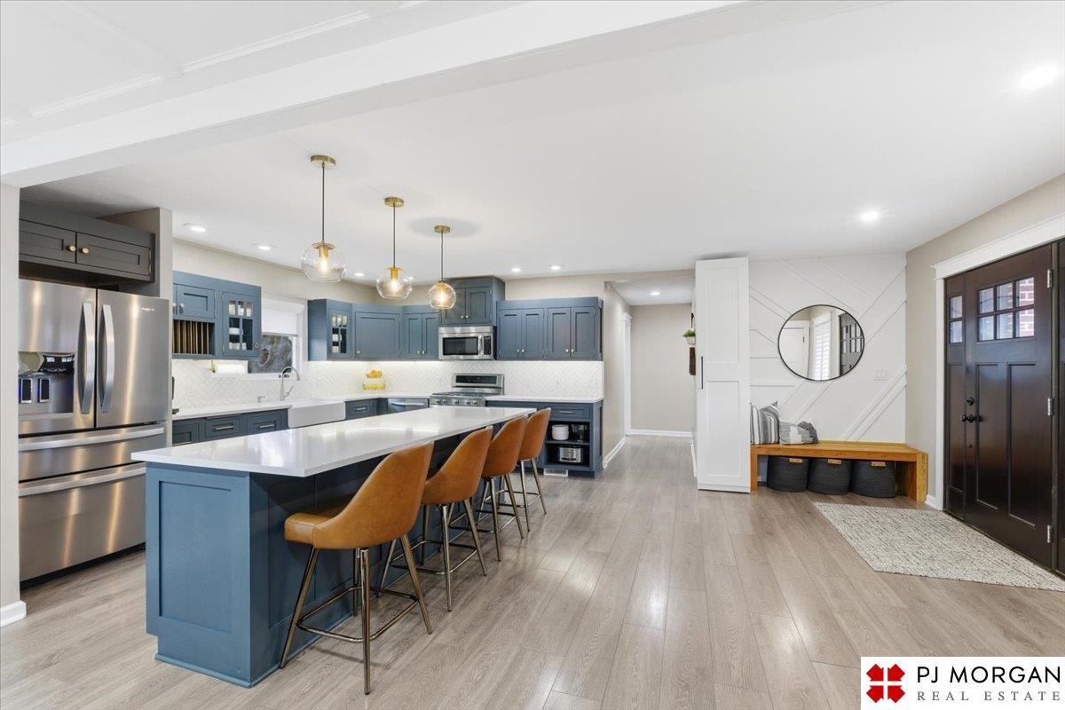 You won't find another fully renovated ranch home in one of the most desirable areas of Omaha like this one! This 4 bedroom, 3 bath, 2 car garage home is nestled on a large .4 acre lot with beautiful mature landscaping with a new full privacy fence. The open concept main floor has LVP floors throughout, coffered ceilings, & a stunning kitchen with over-sized island, new quartz countertops, custom cabinets & drawers, farmhouse sink, and new lighting. The primary suite features a private entrance to the brick patio, a large walk-in closet with custom built-ins, and a luxurious spa-like bathroom complete with custom tile shower and separate soaking tub. Main floor laundry near the bedrooms. Fully finished lower level featuring a modern fireplace completely redesigned with white oak mantel and floating shelves, 4th bedroom and 3rd bath. Other updates include custom window coverings and shutters. New HVAC system, radon mitigation, & gutter guards.