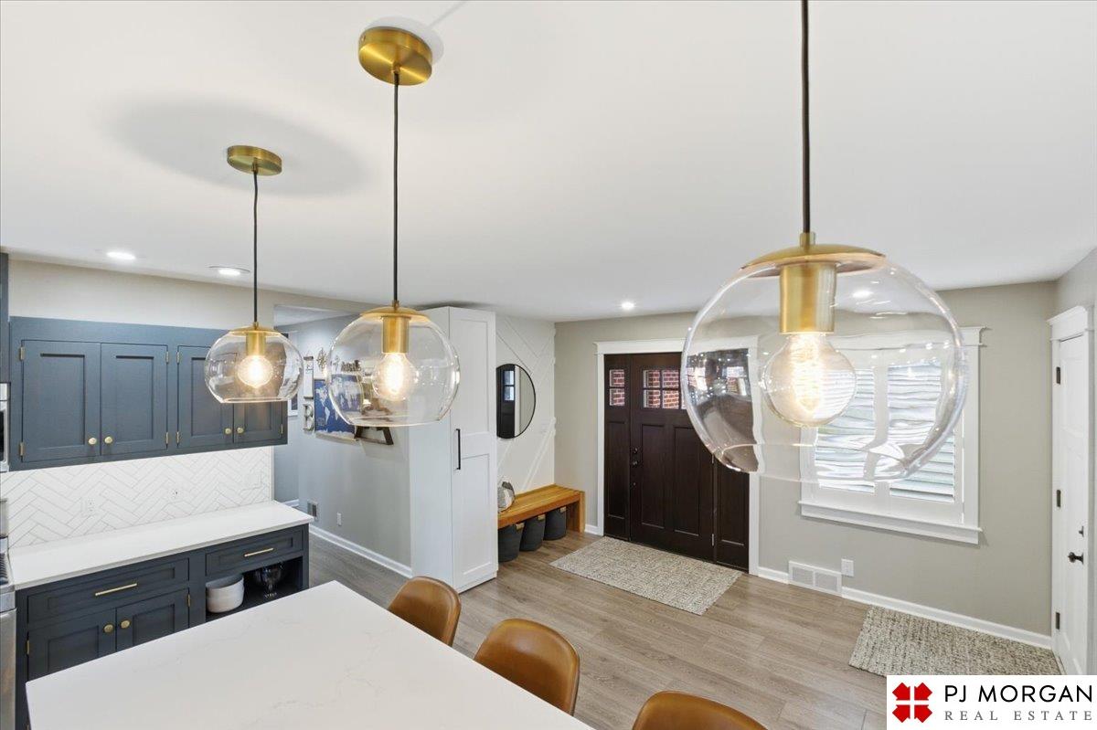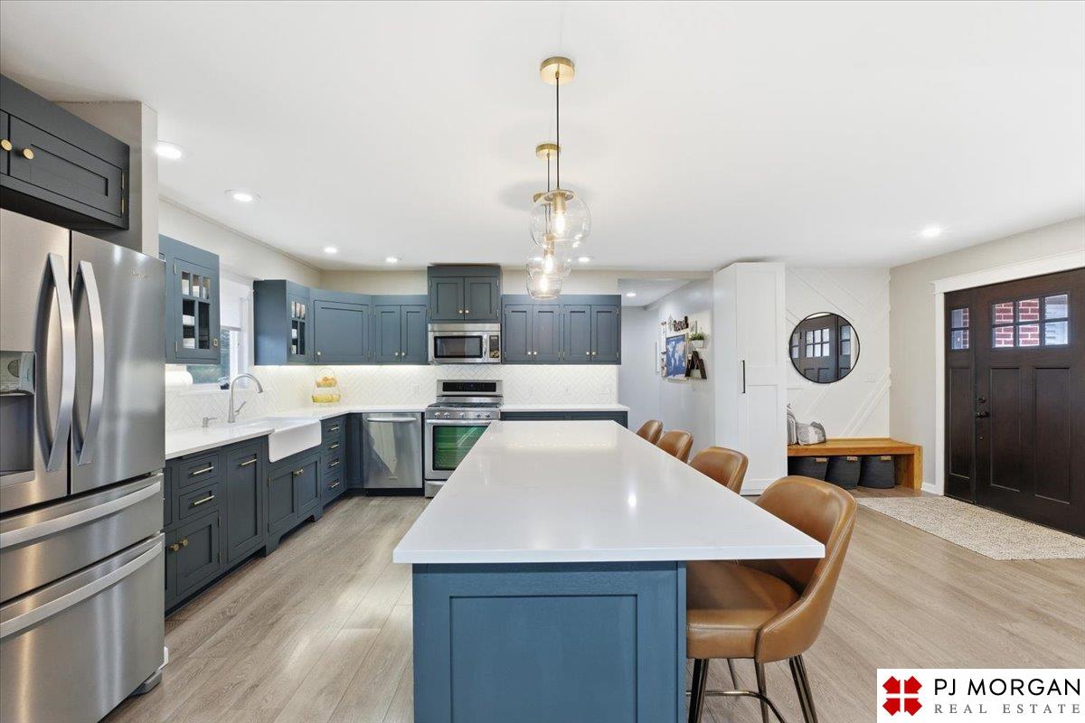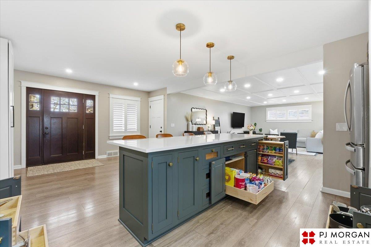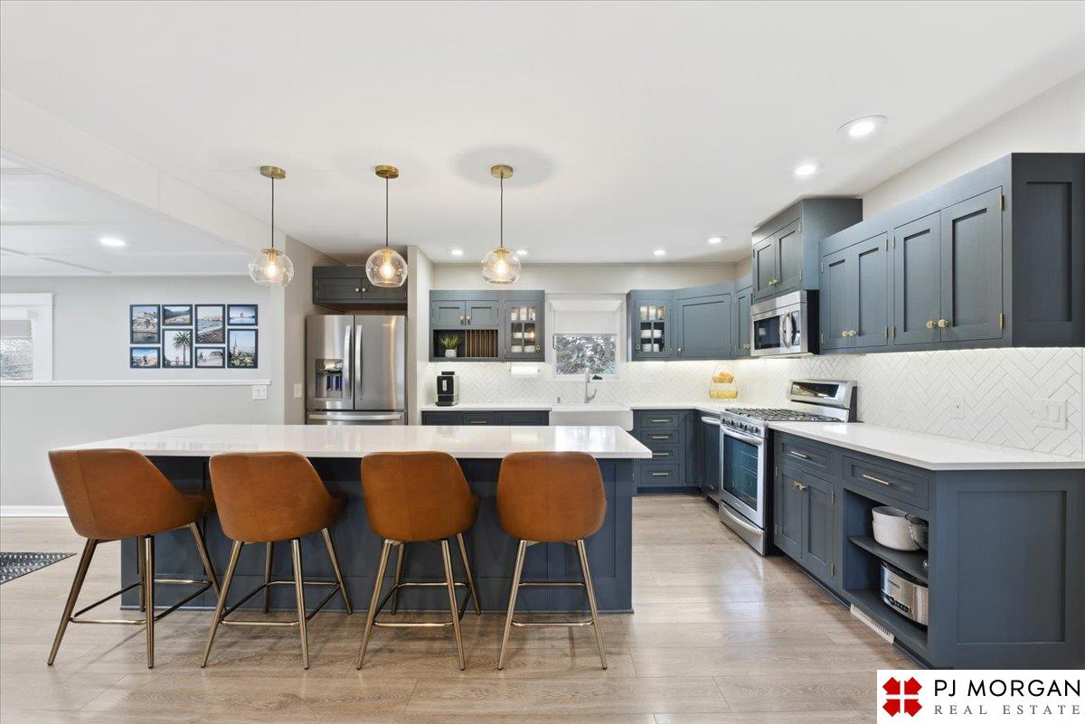 You won't find another fully renovated ranch home in one of the most desirable areas of Omaha like this one! This 4 bedroom, 3 bath, 2 car garage home is nestled on a large .4 acre lot with beautiful mature landscaping with a new full privacy fence. The open concept main floor has LVP floors throughout, coffered ceilings, & a stunning kitchen with over-sized island, new quartz countertops, custom cabinets & drawers, farmhouse sink, and new lighting. The primary suite features a private entrance to the brick patio, a large walk-in closet with custom built-ins, and a luxurious spa-like bathroom complete with custom tile shower and separate soaking tub. Main floor laundry near the bedrooms. Fully finished lower level featuring a modern fireplace completely redesigned with white oak mantel and floating shelves, 4th bedroom and 3rd bath. Other updates include custom window coverings and shutters. New HVAC system, radon mitigation, & gutter guards.