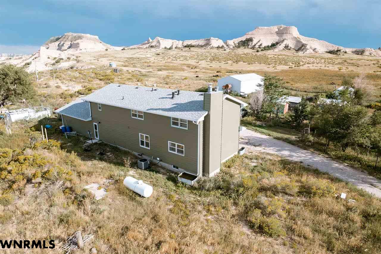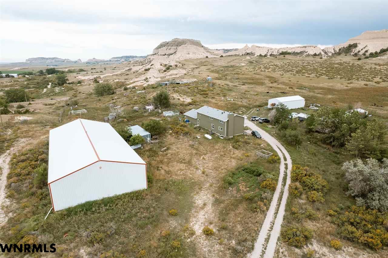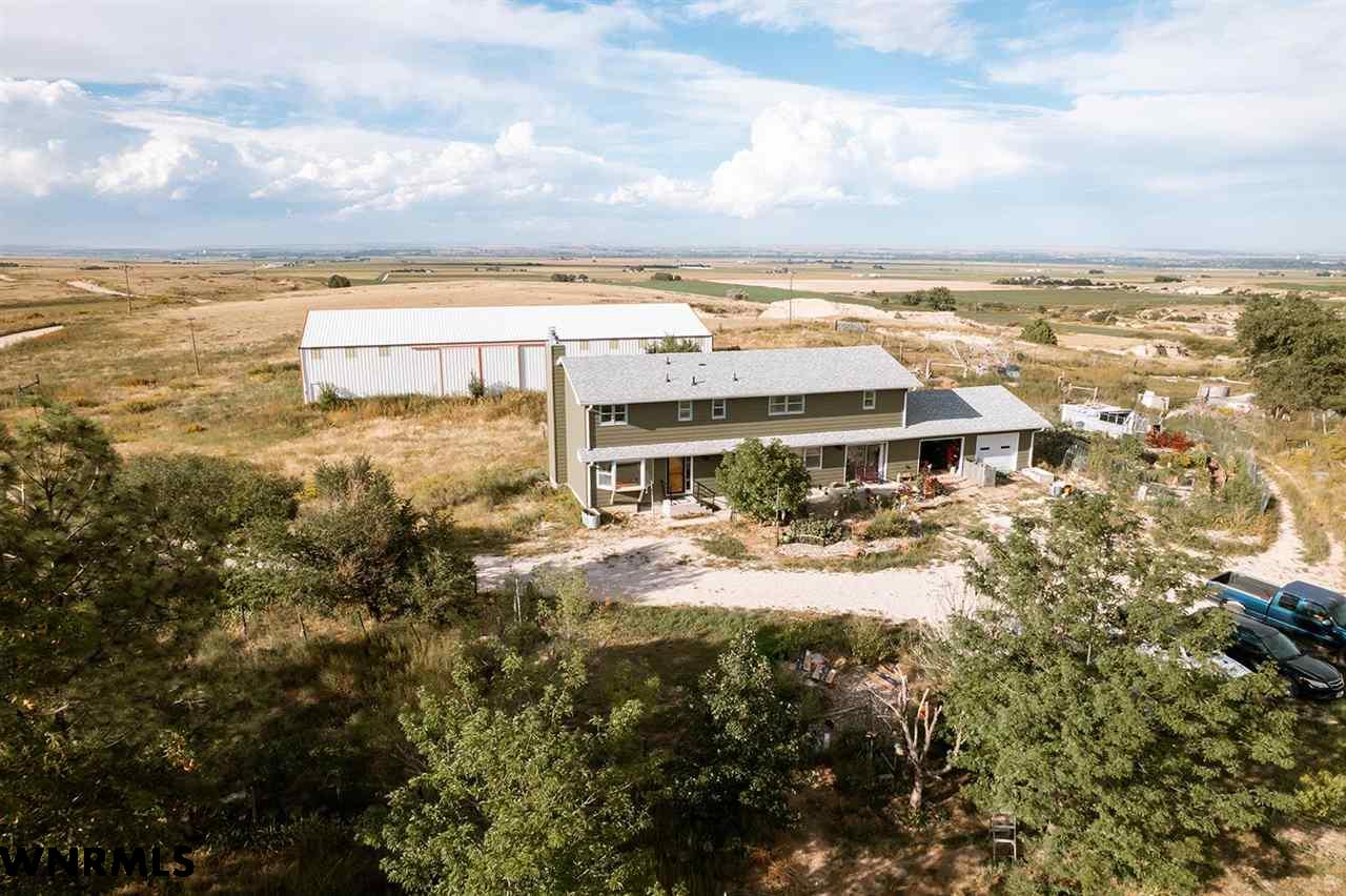 Looking for space, views, and a home with character? This multi-level property offers just that, with tasteful and artistic touches throughout that make it truly one-of-a-kind. Featuring 5 bedrooms, 3.5 bathrooms, and an attached 2-car garage, this home offers plenty of space for family living, entertaining, or hosting guests. Its unique style gives it a warm and inviting feel, blending creativity with comfort. The home has an updated exterior, including siding and roof, and new HVAC and a newer hot water heater. Set just southwest of Gering on 143+/- acres, the land itself is every bit as impressive as the home. A stunning bluff rises from the property, framed by rolling hills, valleys, and natural foliage that provide both beauty and privacy. The surrounding landscape delivers year-round views that are hard to match, offering a peaceful escape just minutes from town. The acreage is well-equipped for a wide range of uses. A massive 54’x120’ metal shop provides endless space for projects or storage. A 60’x28’ metal equipment storage building adds even more functionality, while a metal horse barn with tack room, a loafing shed, chicken coop and several other outbuildings make the property ideal for horses, livestock, or hobbies. Whether you’re dreaming of a hobby farm, a horse property, or simply a wide-open space with unbeatable views, this property brings together functionality, space, and artistry to deliver it all. View the video walk-thru at https://youtu.be/0q1WEOVh2Iw