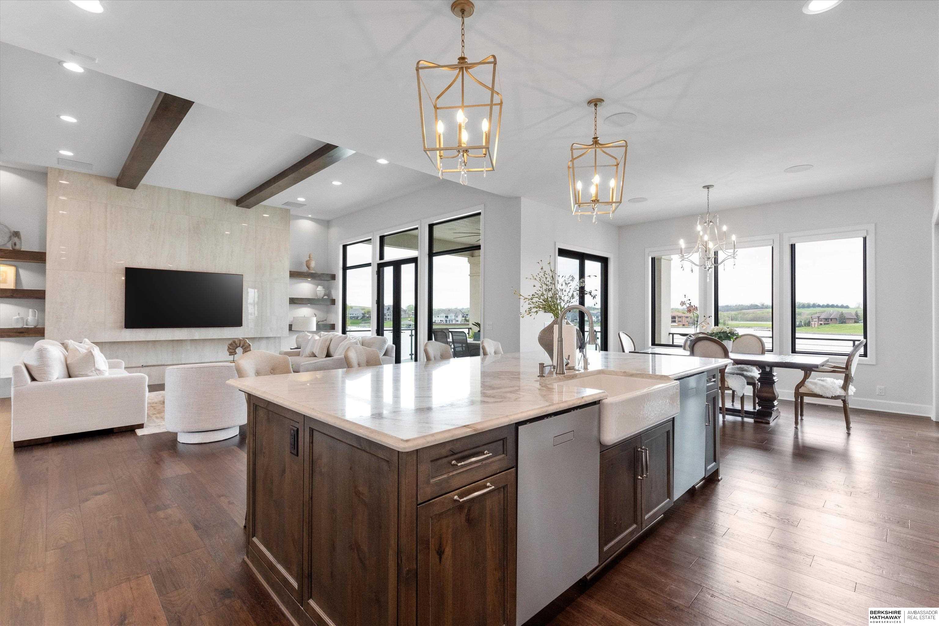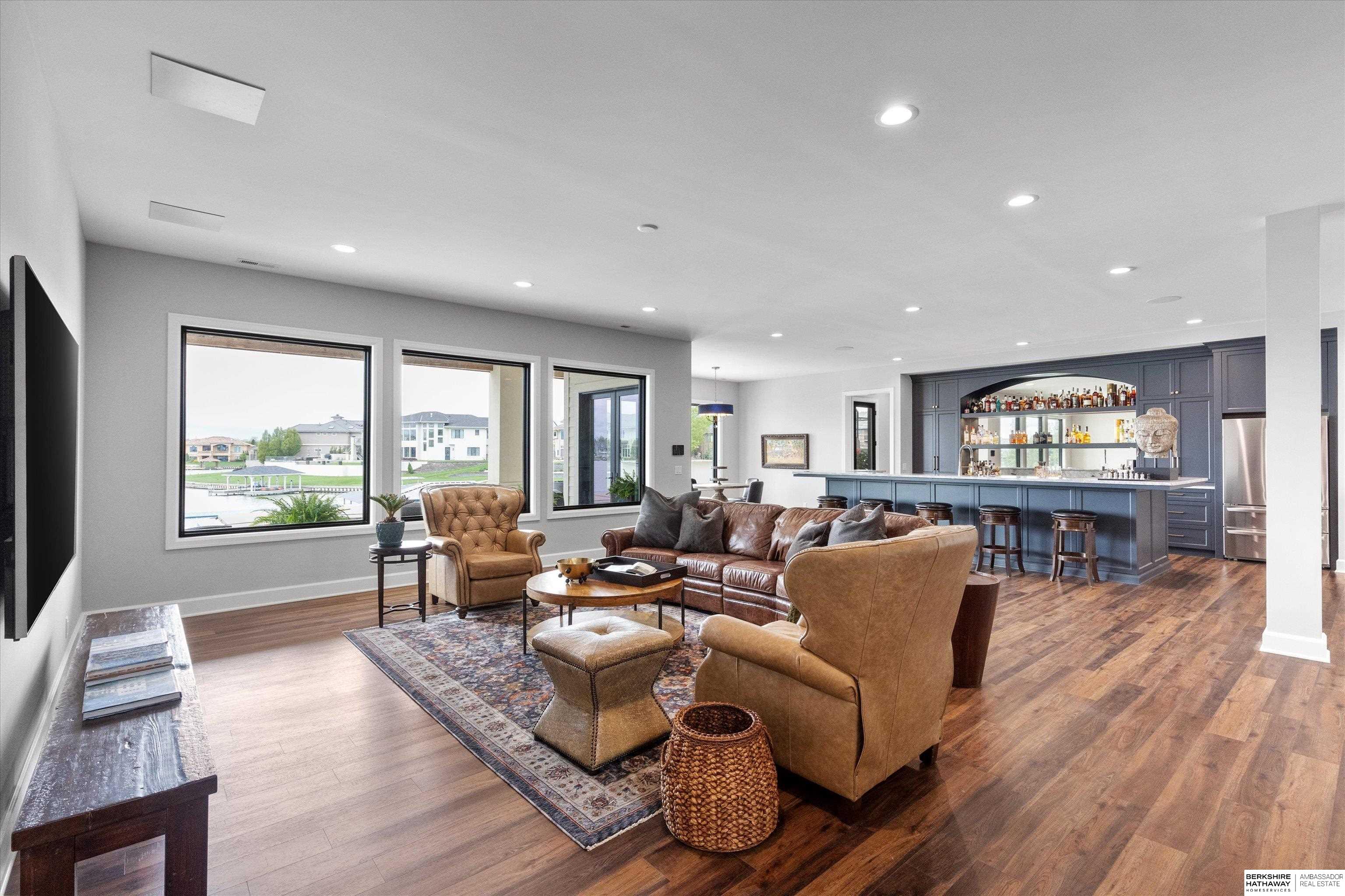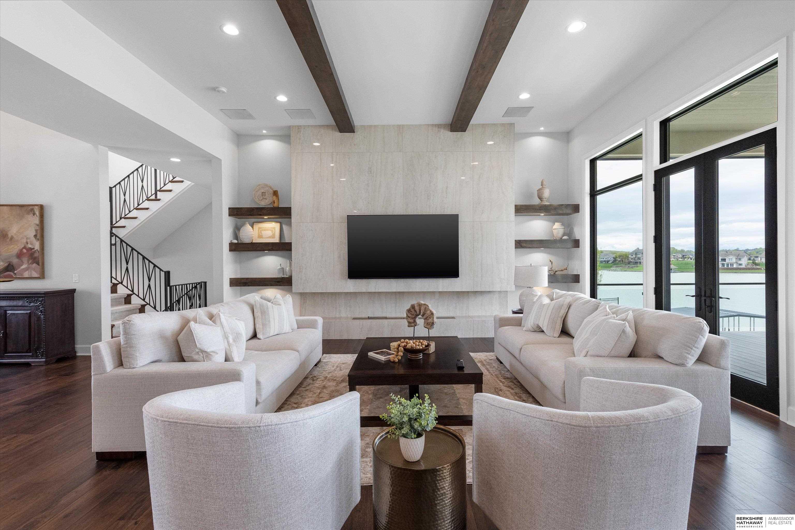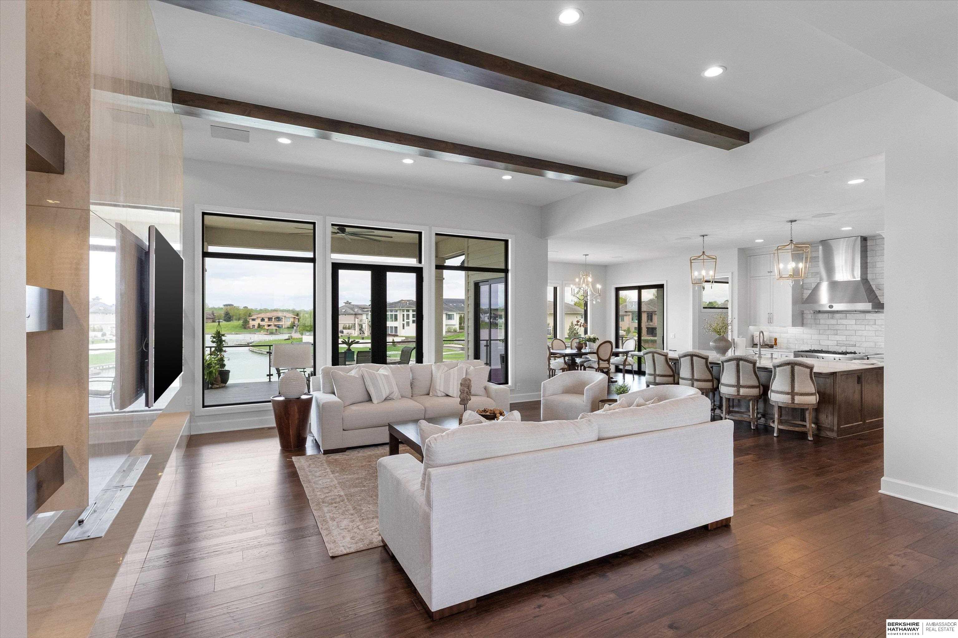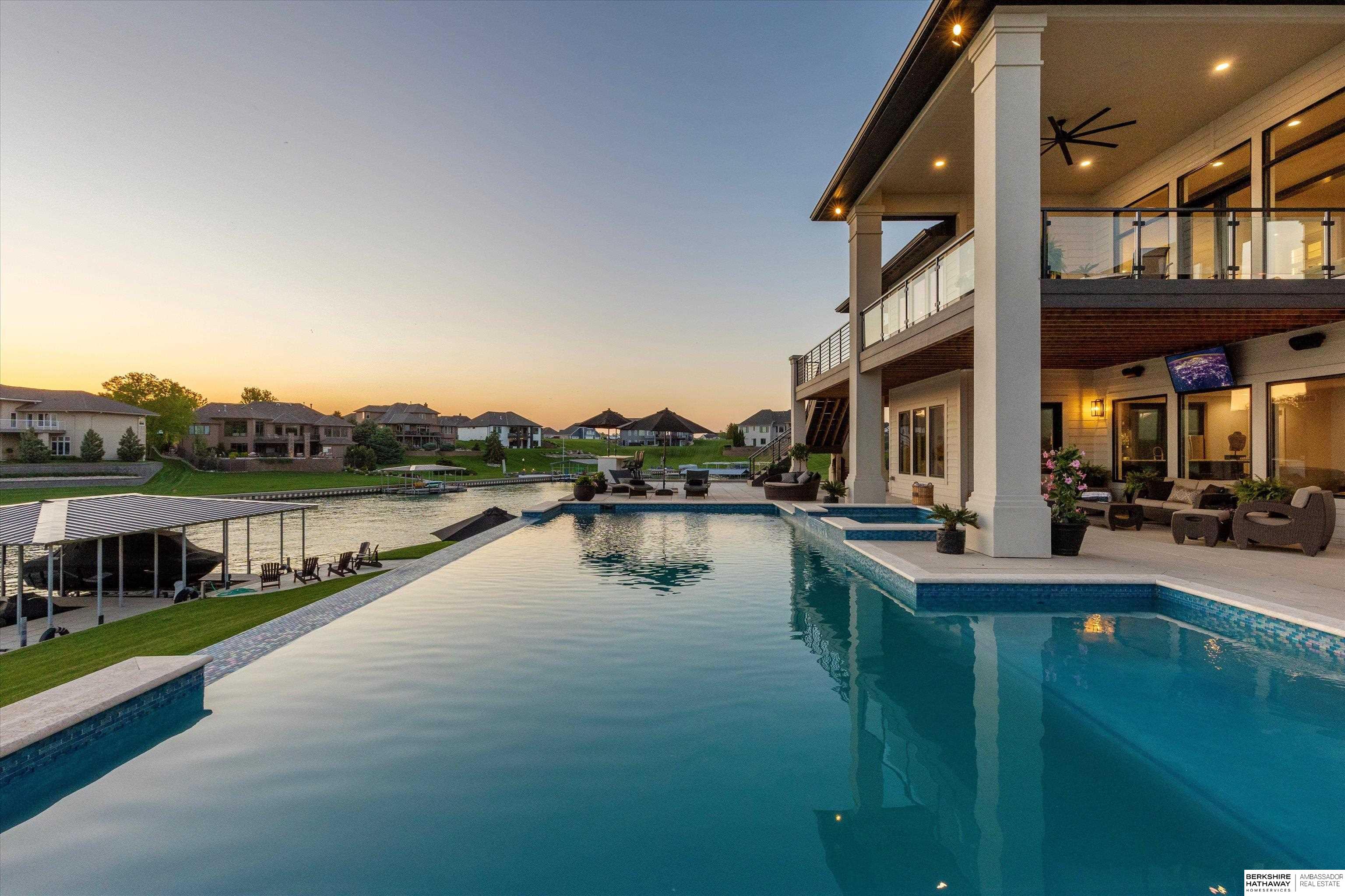 An exceptional custom lake home that delivers an elevated lifestyle where everyday living feels like a retreat. Designed for effortless entertaining & relaxed lake days, the French contemporary 1.5 story walkout features vaulted ceilings, architectural windows, custom millwork & designer finishes. An open functional floorplan with lake views through the great room & gourmet kitchen to dining areas, unique pantry/laundry/private office combo, private office, 2 drop zones, 6+ car split garages with boat storage & dog wash - perfect for lake life. Serene primary suite with spa bath & dream closet. Upstairs, a flexible loft with built in bunks opens to an expansive upper deck, 4 ensuite bedrooms & laundry. Inviting walkout LL perfectly designed for entertaining inside & out - wine room, oversized bar, gaming areas, exercise room, guest suite & lake storage. Outside, enjoy resort style living, infinity edge pool & spa, sunken firepit & main lake views tucked in a no wake zone. Perfection.