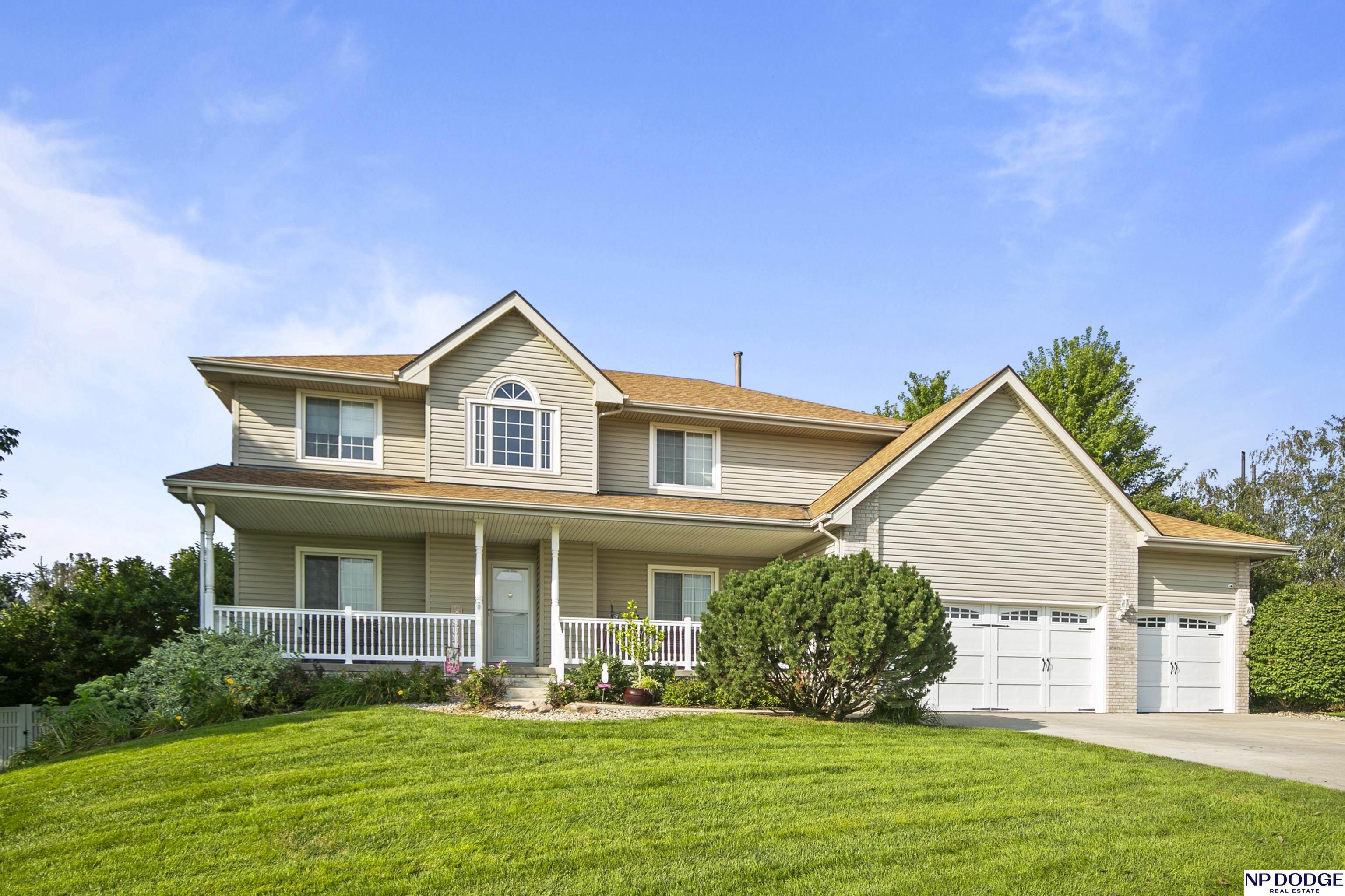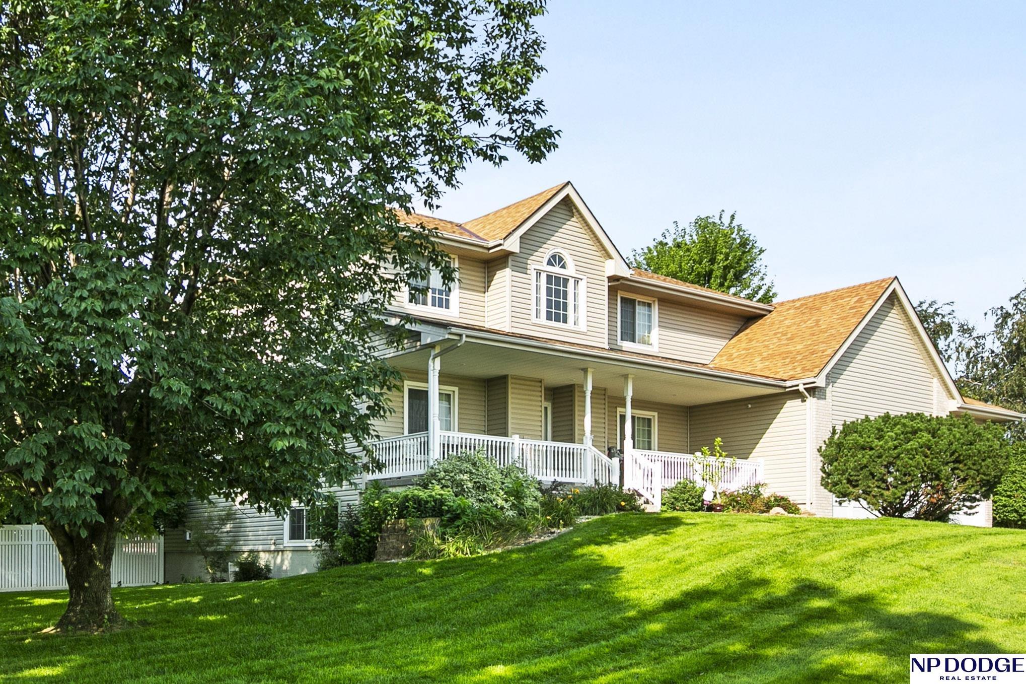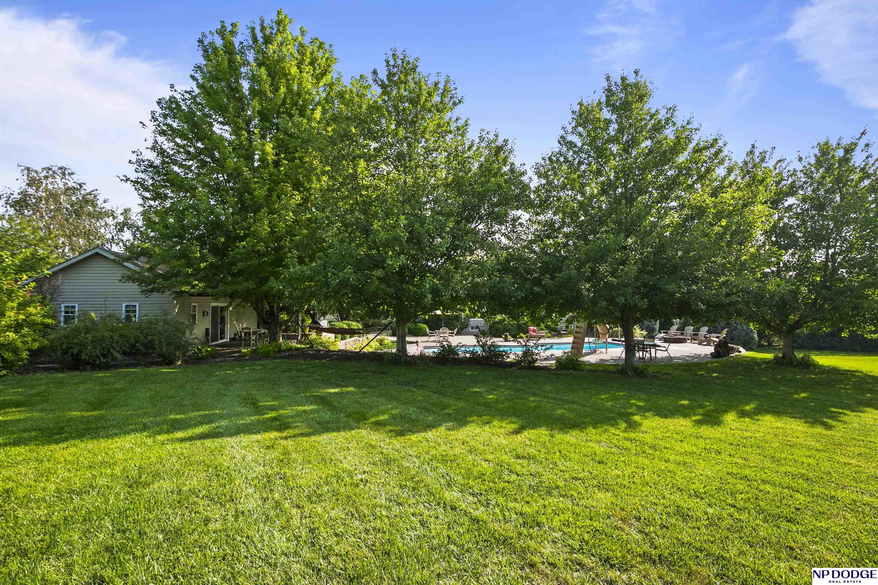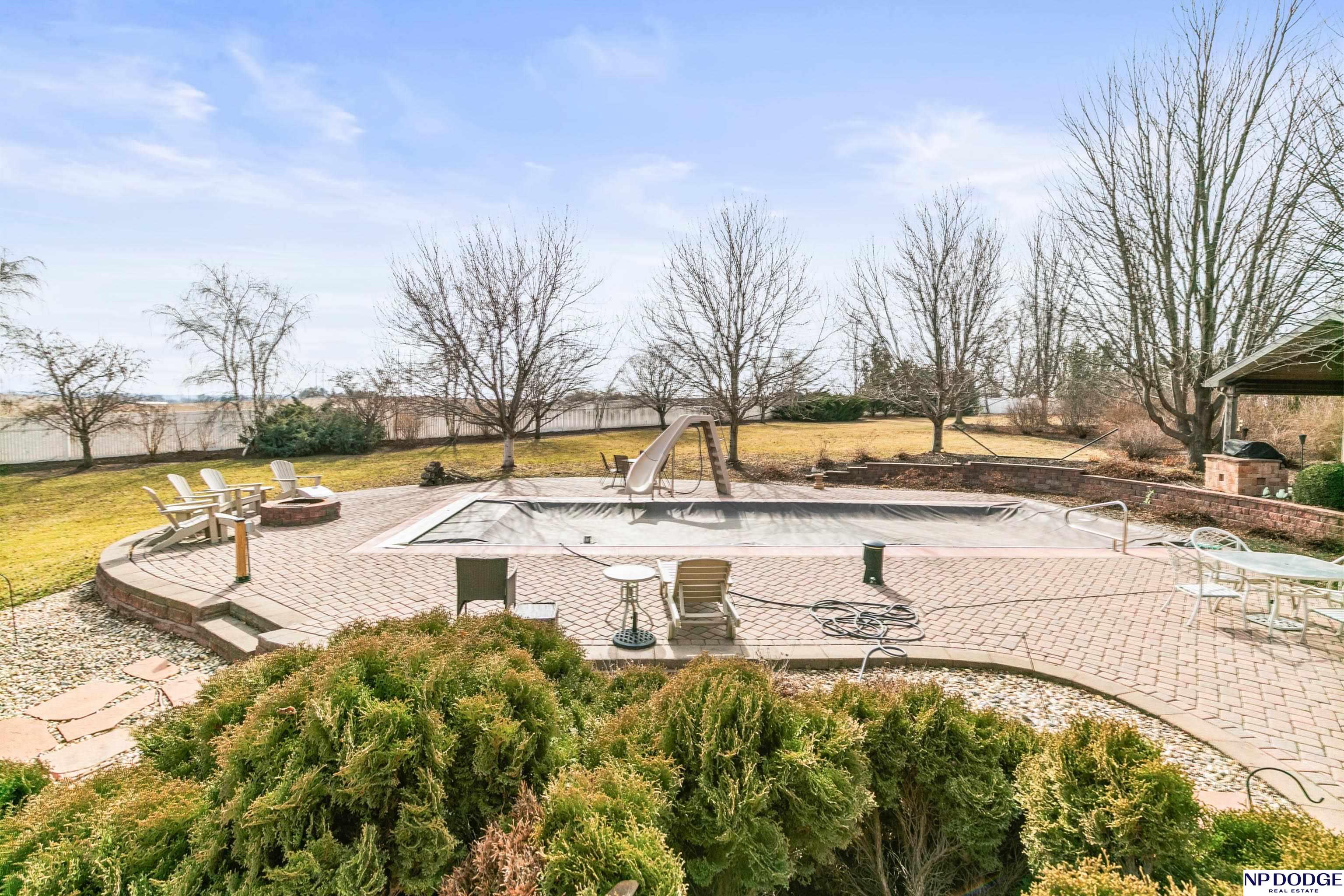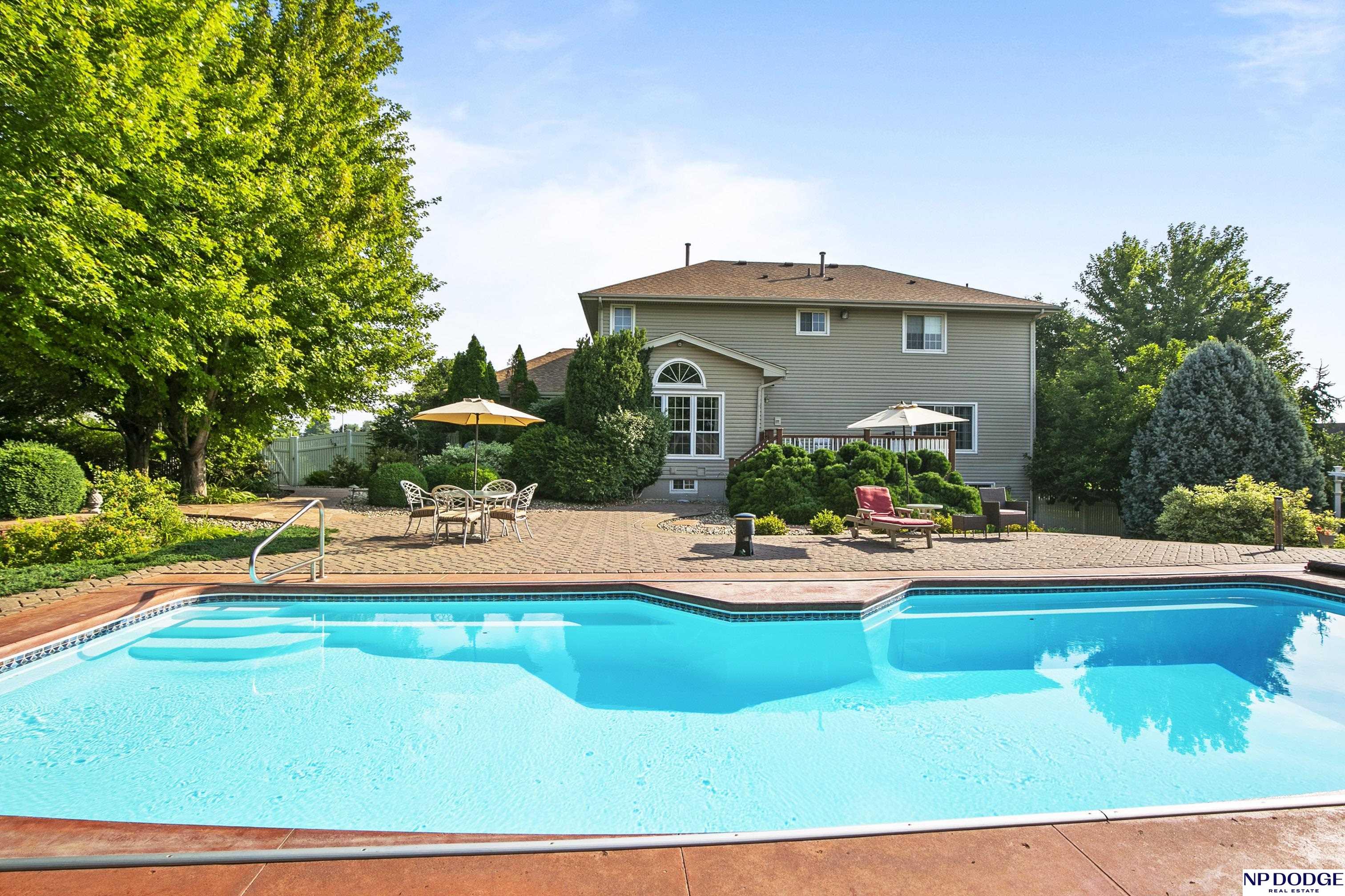 Stunning 2-story estate on 1.17 private, tree-lined acres with a true resort-style backyard designed for elevated entertaining. Enjoy a sparkling in-ground pool, expansive patio, covered hot tub, firepit, and an exceptional pool house featuring a kitchenette, Murphy bed, ¾ bath, and private covered patio. Inside, rich hardwood floors, 9’ ceilings, and a dramatic double-sided fireplace create warmth and architectural presence. The gourmet kitchen showcases high-end Viking appliances, a grand granite island, custom storage, and abundant cabinetry. Upstairs offers four spacious bedrooms including a Jack-and-Jill bath. The luxurious primary suite features a custom walk-in closet with laundry chute and a spa-inspired bath with tile shower, whirlpool tub, and dual vanities. Finished lower level includes a great room with fireplace, granite wet bar, office/playroom, ¾ bath, and private theatre with 4K projector and surround sound. New roof 2025, HVAC 2019. Near Offutt AFB.