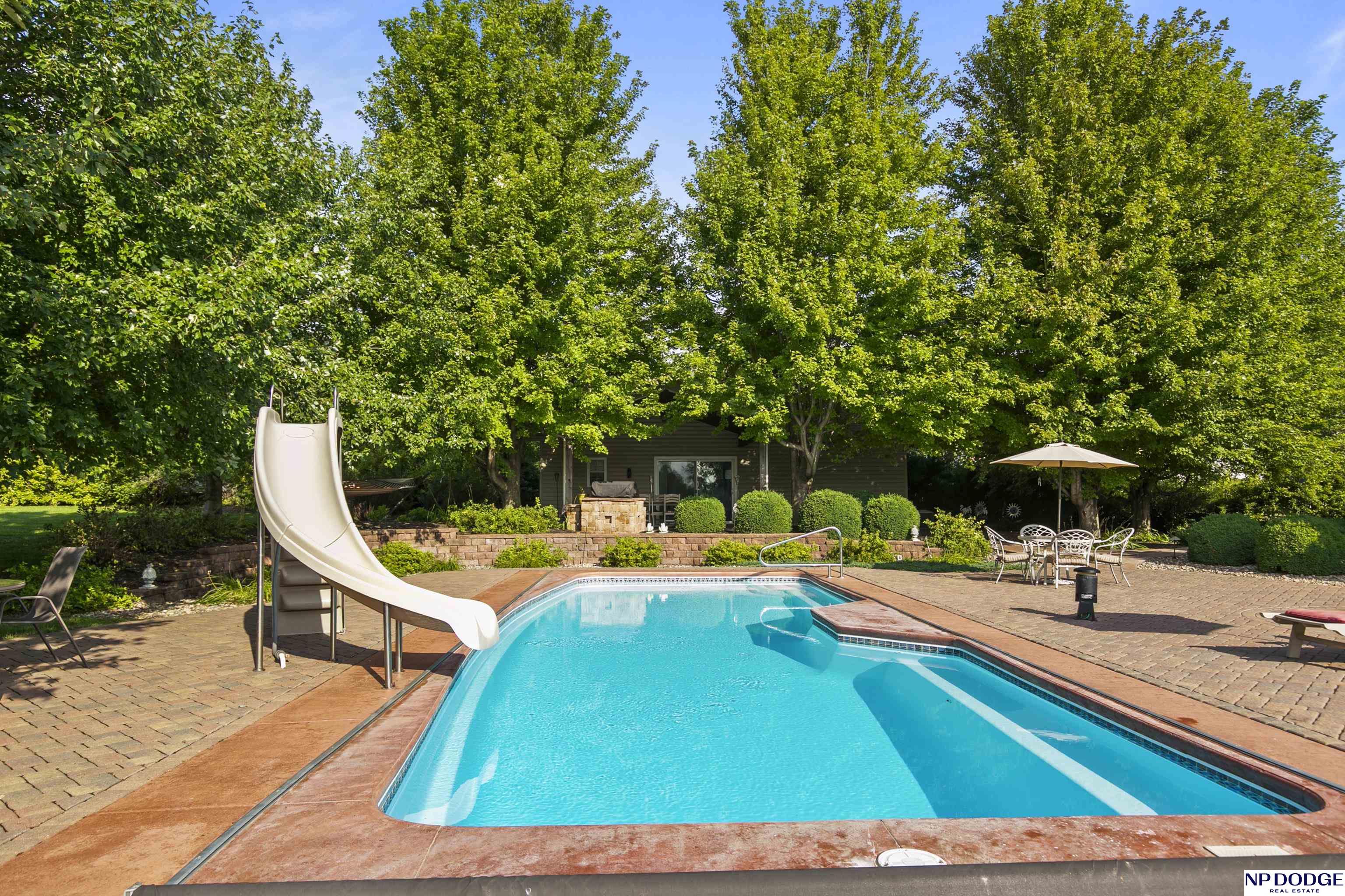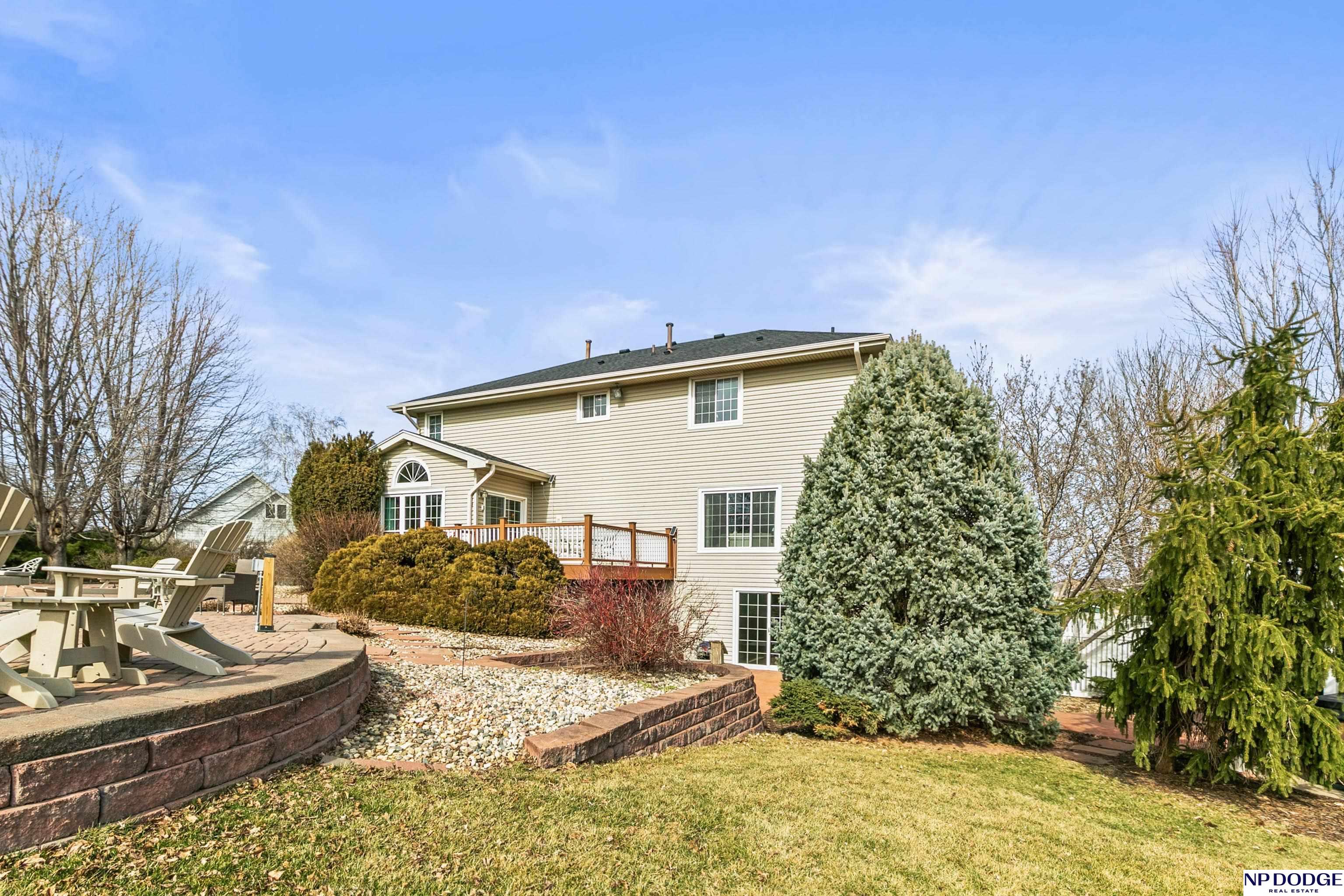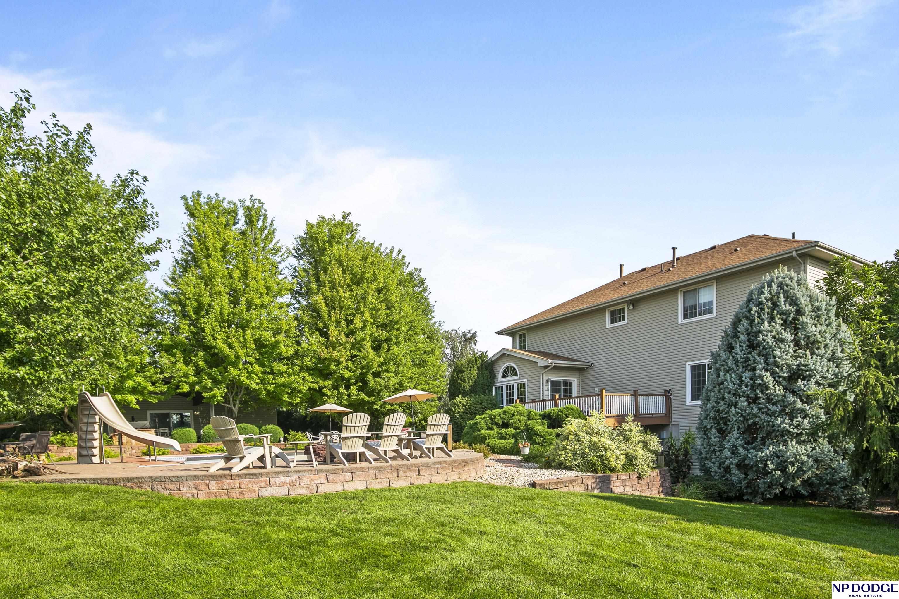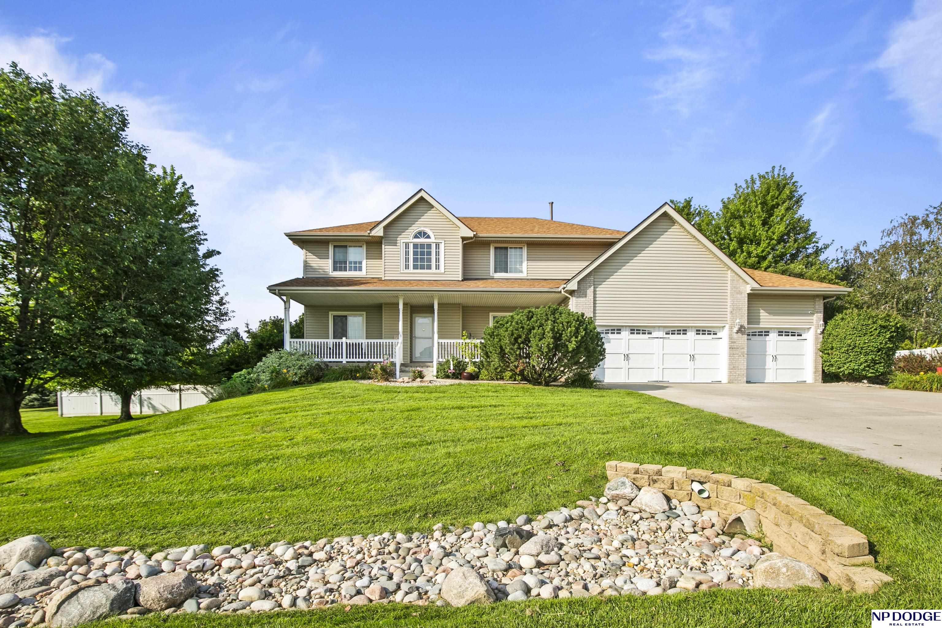 Stunning 2-story estate on 1.17 private, tree-lined acres with a true resort-style backyard designed for elevated entertaining. Enjoy a sparkling in-ground pool, expansive patio, covered hot tub, firepit, and an exceptional pool house featuring a kitchenette, Murphy bed, ¾ bath, and private covered patio. Inside, rich hardwood floors, 9’ ceilings, and a dramatic double-sided fireplace create warmth and architectural presence. The gourmet kitchen showcases high-end Viking appliances, a grand granite island, custom storage, and abundant cabinetry. Upstairs offers four spacious bedrooms including a Jack-and-Jill bath. The luxurious primary suite features a custom walk-in closet with laundry chute and a spa-inspired bath with tile shower, whirlpool tub, and dual vanities. Finished lower level includes a great room with fireplace, granite wet bar, office/playroom, ¾ bath, and private theatre with 4K projector and surround sound. New roof 2025, HVAC 2019. Near Offutt AFB.