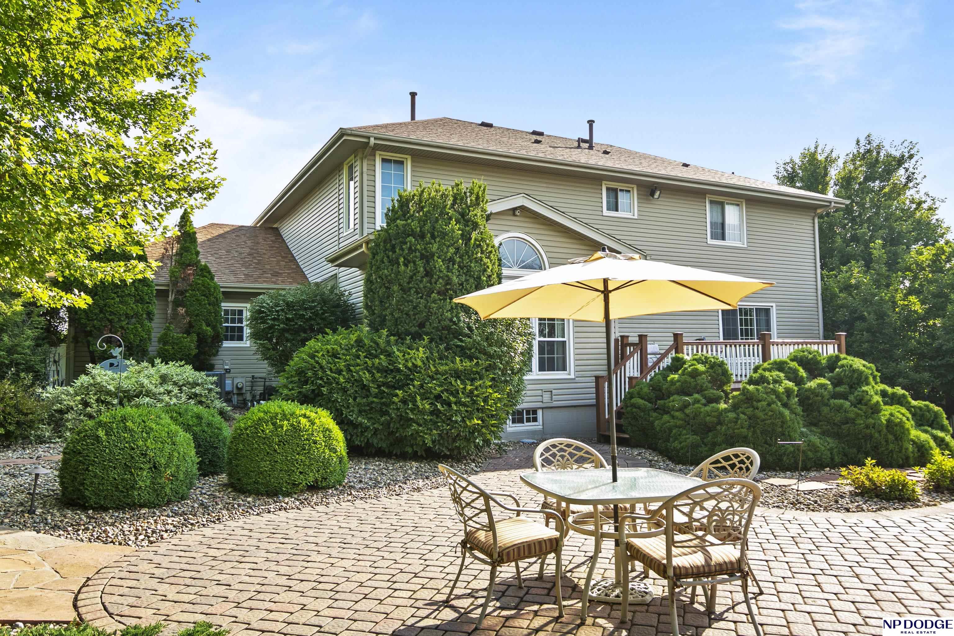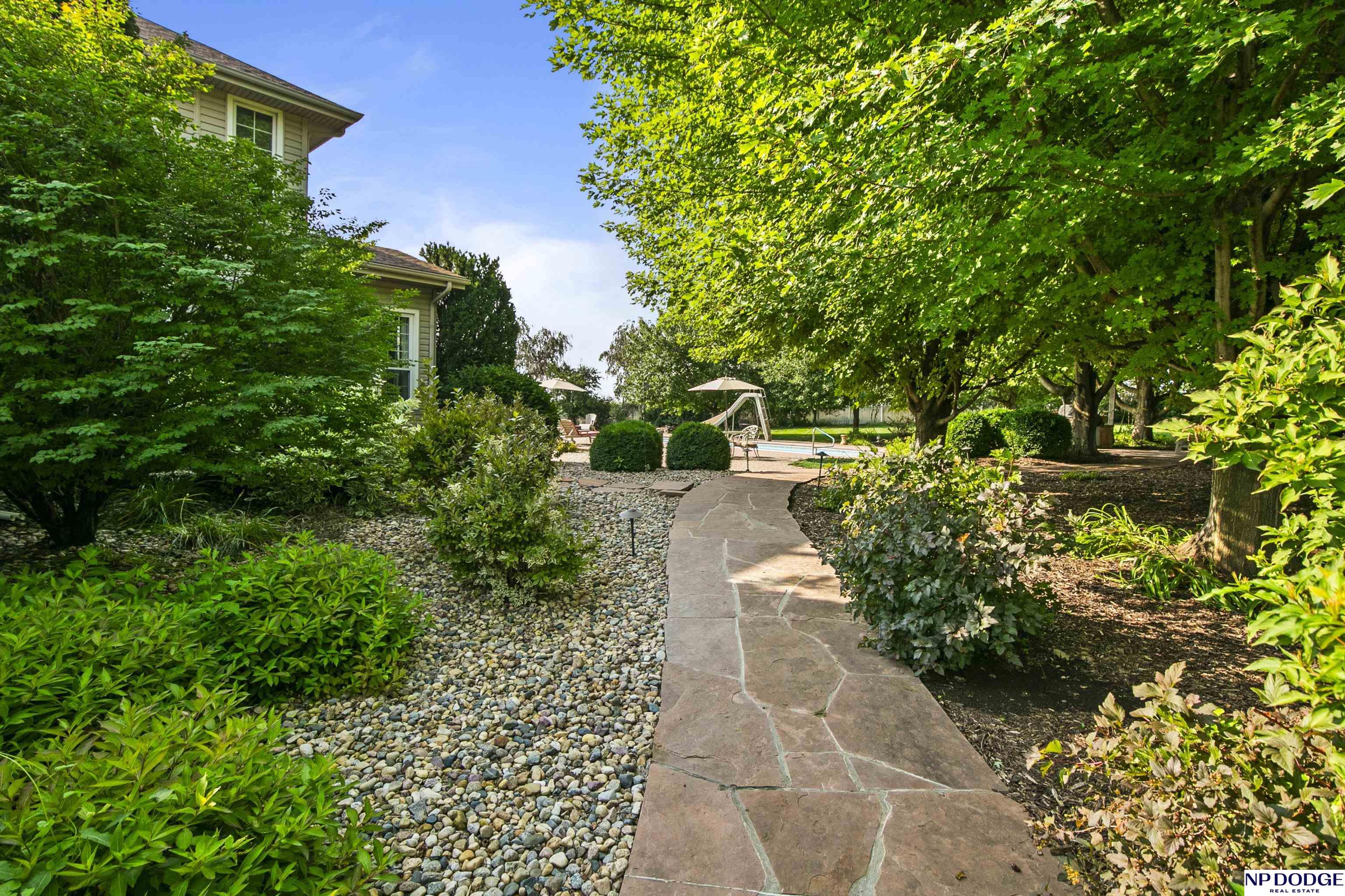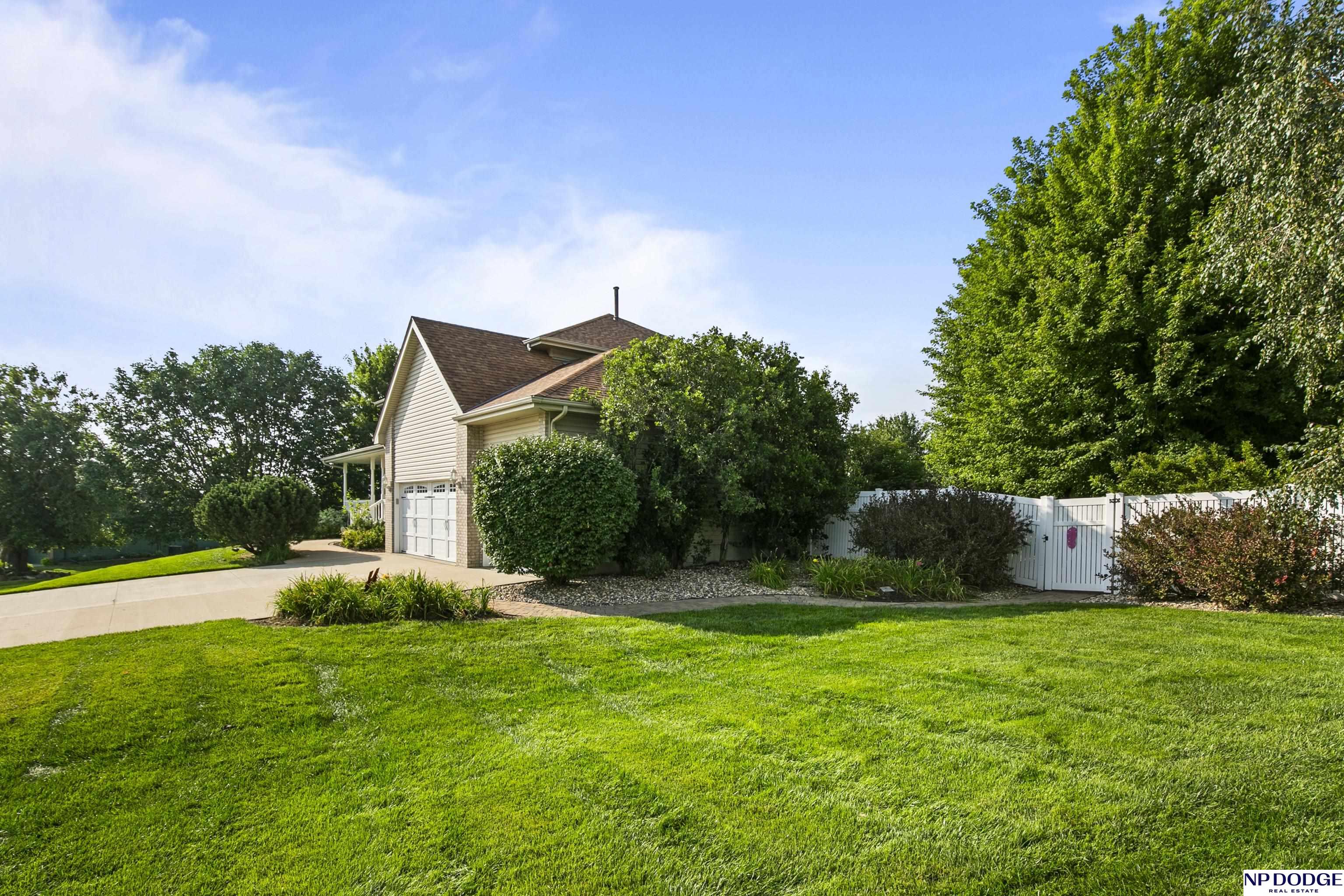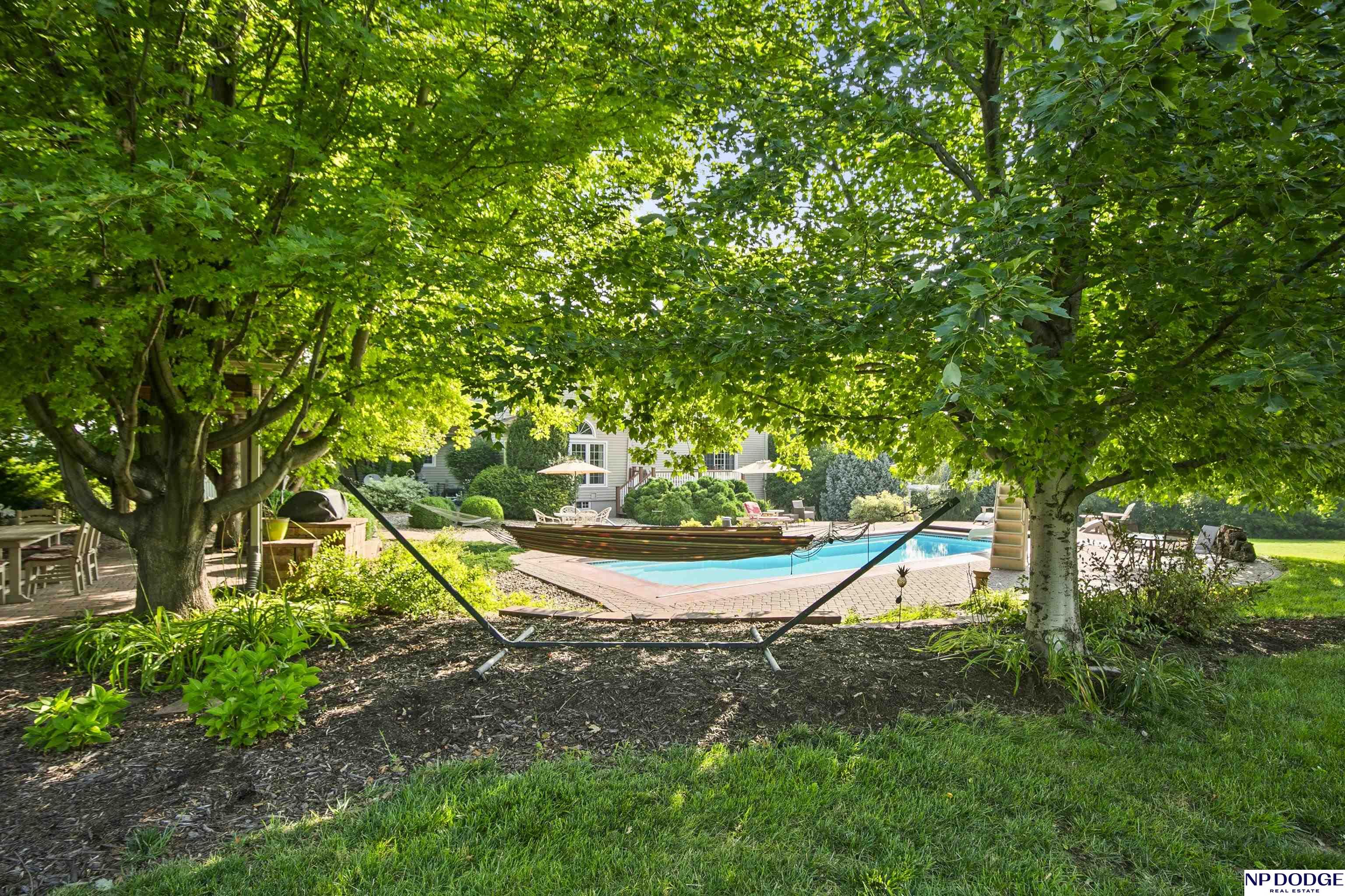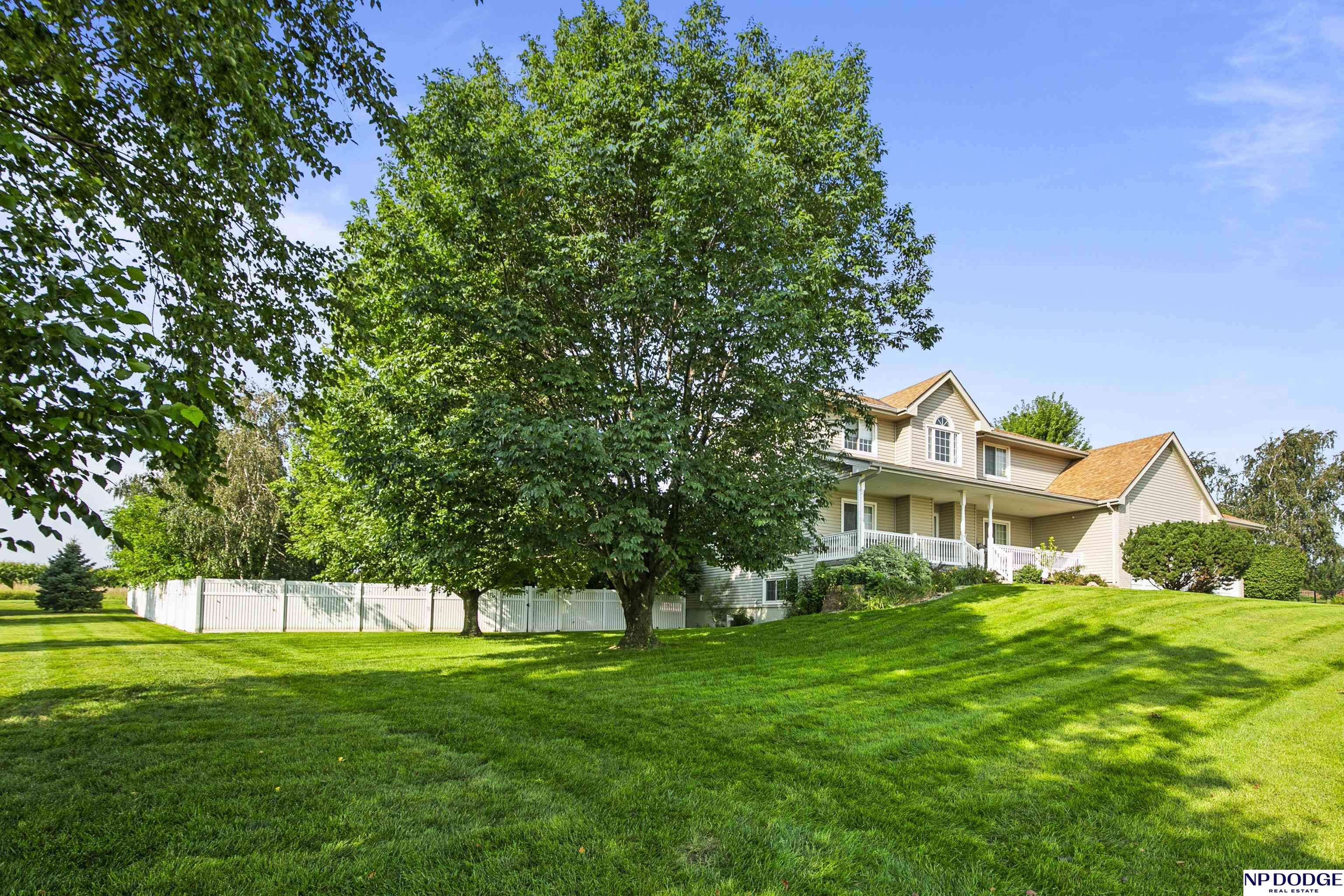 Stunning 2-story estate on 1.17 private, tree-lined acres with a true resort-style backyard designed for elevated entertaining. Enjoy a sparkling in-ground pool, expansive patio, covered hot tub, firepit, and an exceptional pool house featuring a kitchenette, Murphy bed, ¾ bath, and private covered patio. Inside, rich hardwood floors, 9’ ceilings, and a dramatic double-sided fireplace create warmth and architectural presence. The gourmet kitchen showcases high-end Viking appliances, a grand granite island, custom storage, and abundant cabinetry. Upstairs offers four spacious bedrooms including a Jack-and-Jill bath. The luxurious primary suite features a custom walk-in closet with laundry chute and a spa-inspired bath with tile shower, whirlpool tub, and dual vanities. Finished lower level includes a great room with fireplace, granite wet bar, office/playroom, ¾ bath, and private theatre with 4K projector and surround sound. New roof 2025, HVAC 2019. Near Offutt AFB.