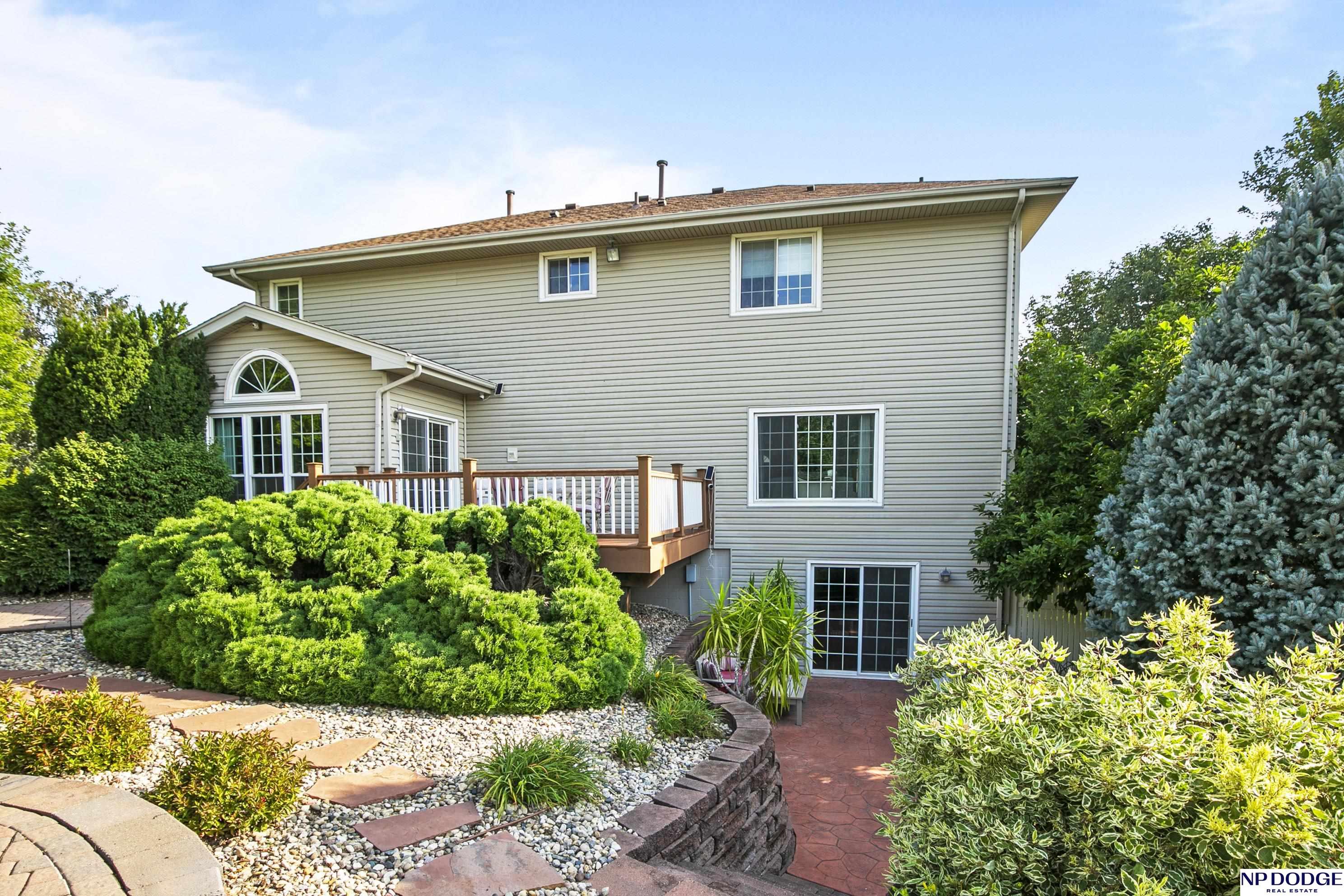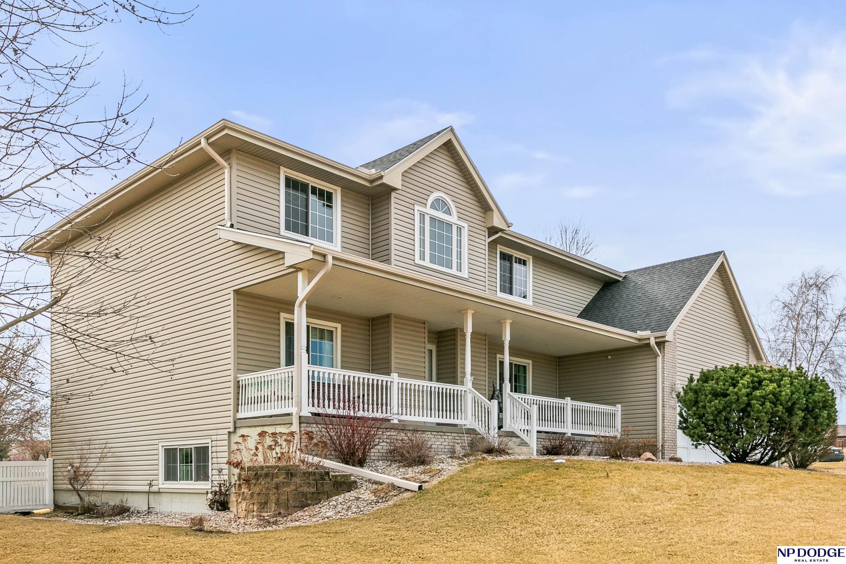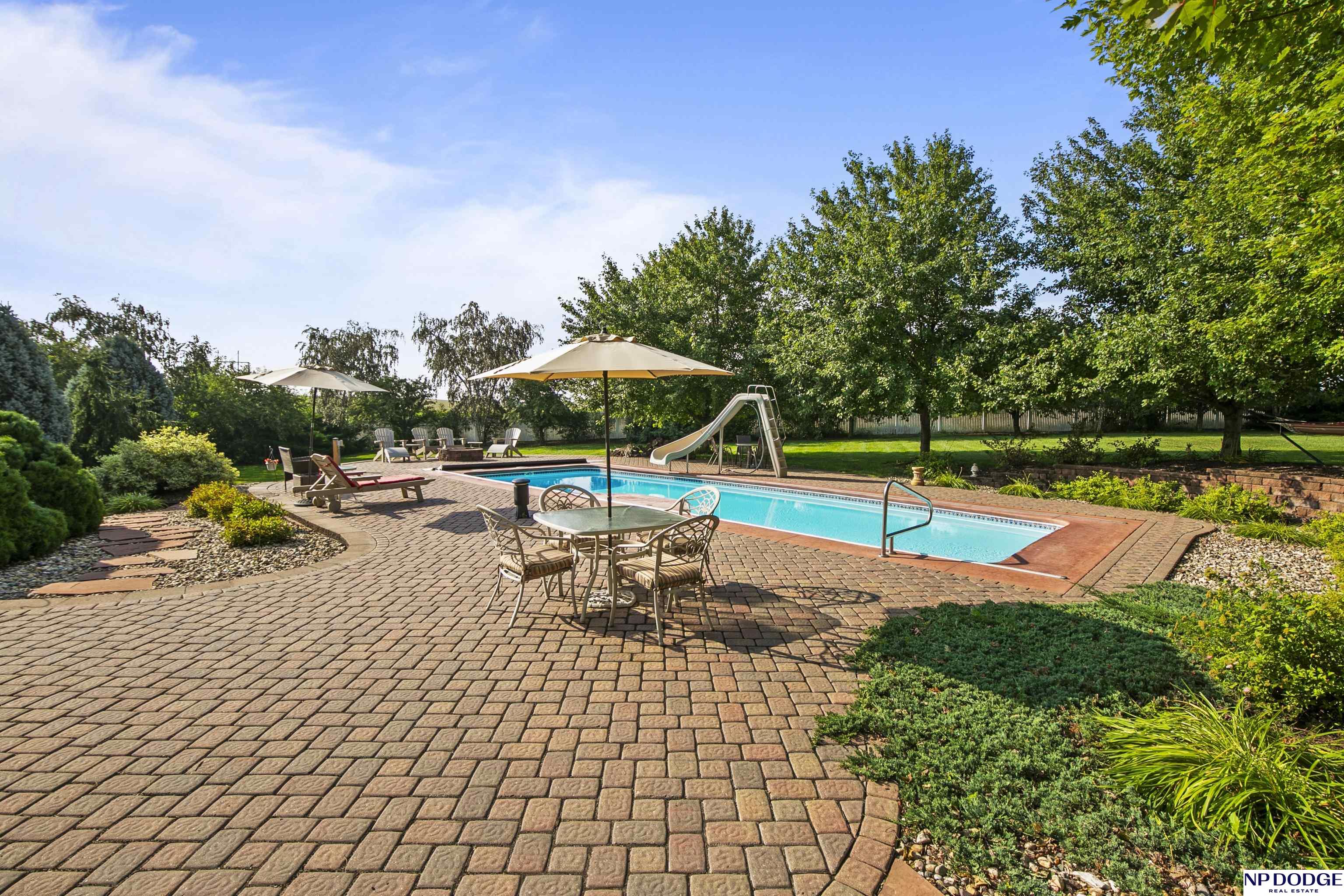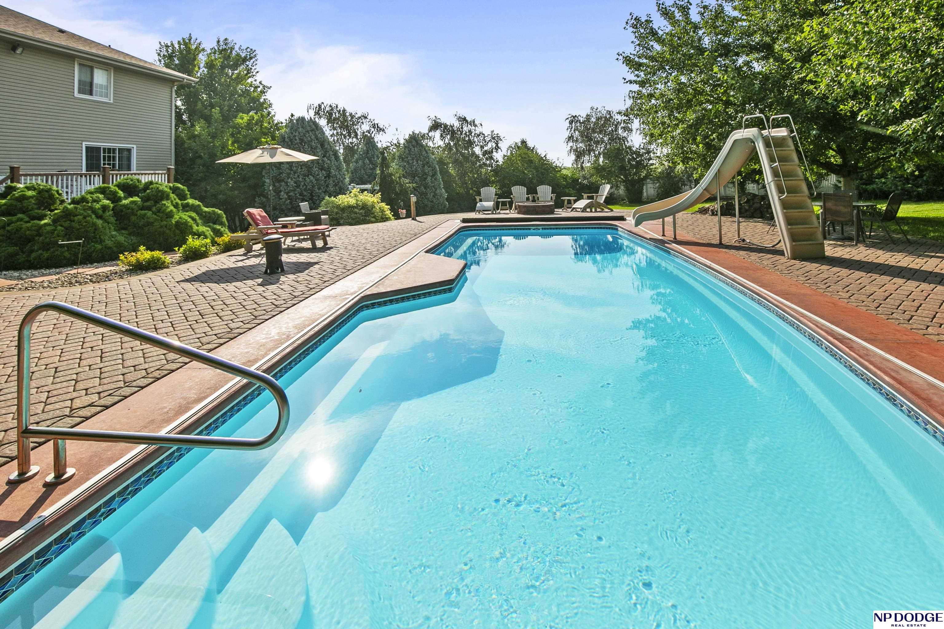 Stunning 2-story estate on 1.17 private, tree-lined acres with a true resort-style backyard designed for elevated entertaining. Enjoy a sparkling in-ground pool, expansive patio, covered hot tub, firepit, and an exceptional pool house featuring a kitchenette, Murphy bed, ¾ bath, and private covered patio. Inside, rich hardwood floors, 9’ ceilings, and a dramatic double-sided fireplace create warmth and architectural presence. The gourmet kitchen showcases high-end Viking appliances, a grand granite island, custom storage, and abundant cabinetry. Upstairs offers four spacious bedrooms including a Jack-and-Jill bath. The luxurious primary suite features a custom walk-in closet with laundry chute and a spa-inspired bath with tile shower, whirlpool tub, and dual vanities. Finished lower level includes a great room with fireplace, granite wet bar, office/playroom, ¾ bath, and private theatre with 4K projector and surround sound. New roof 2025, HVAC 2019. Near Offutt AFB.