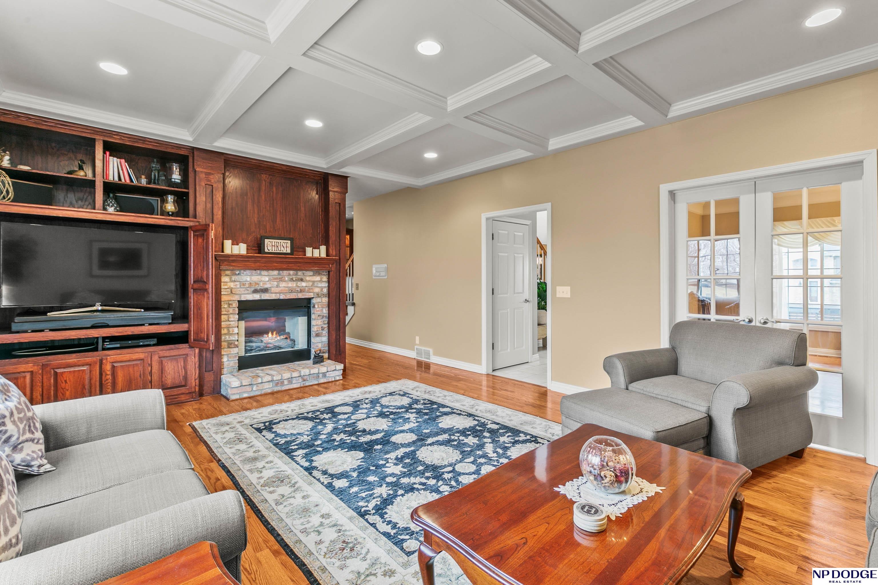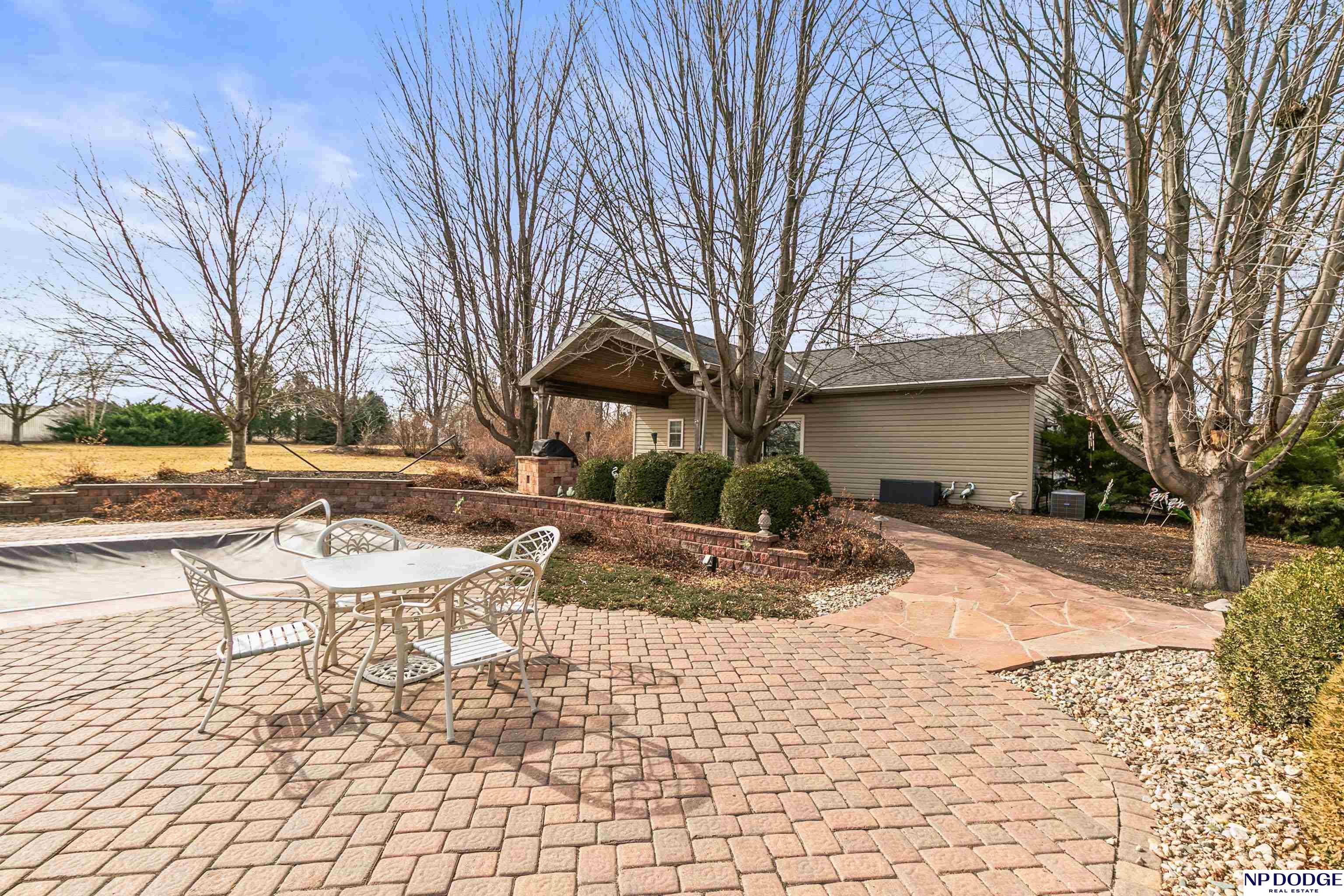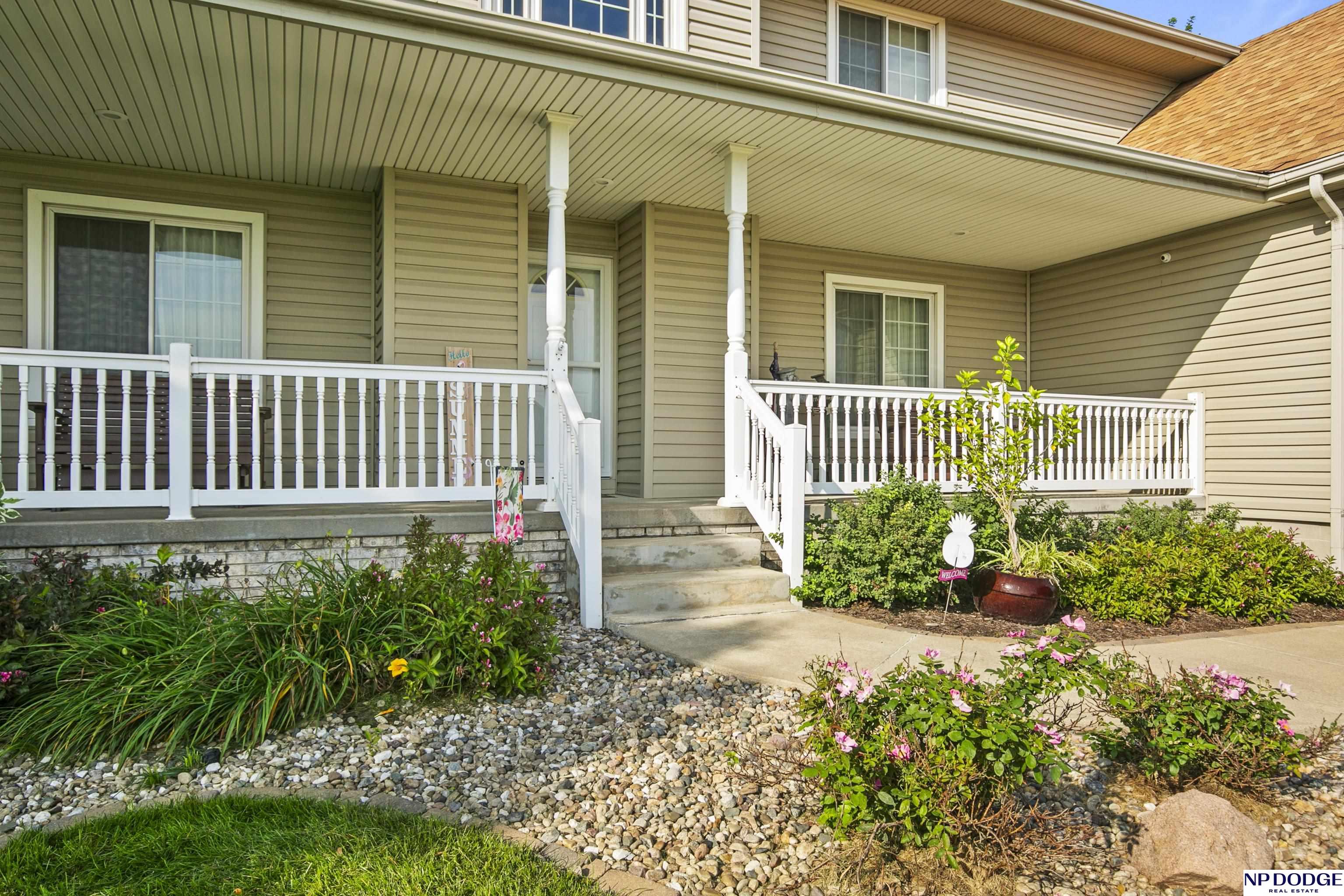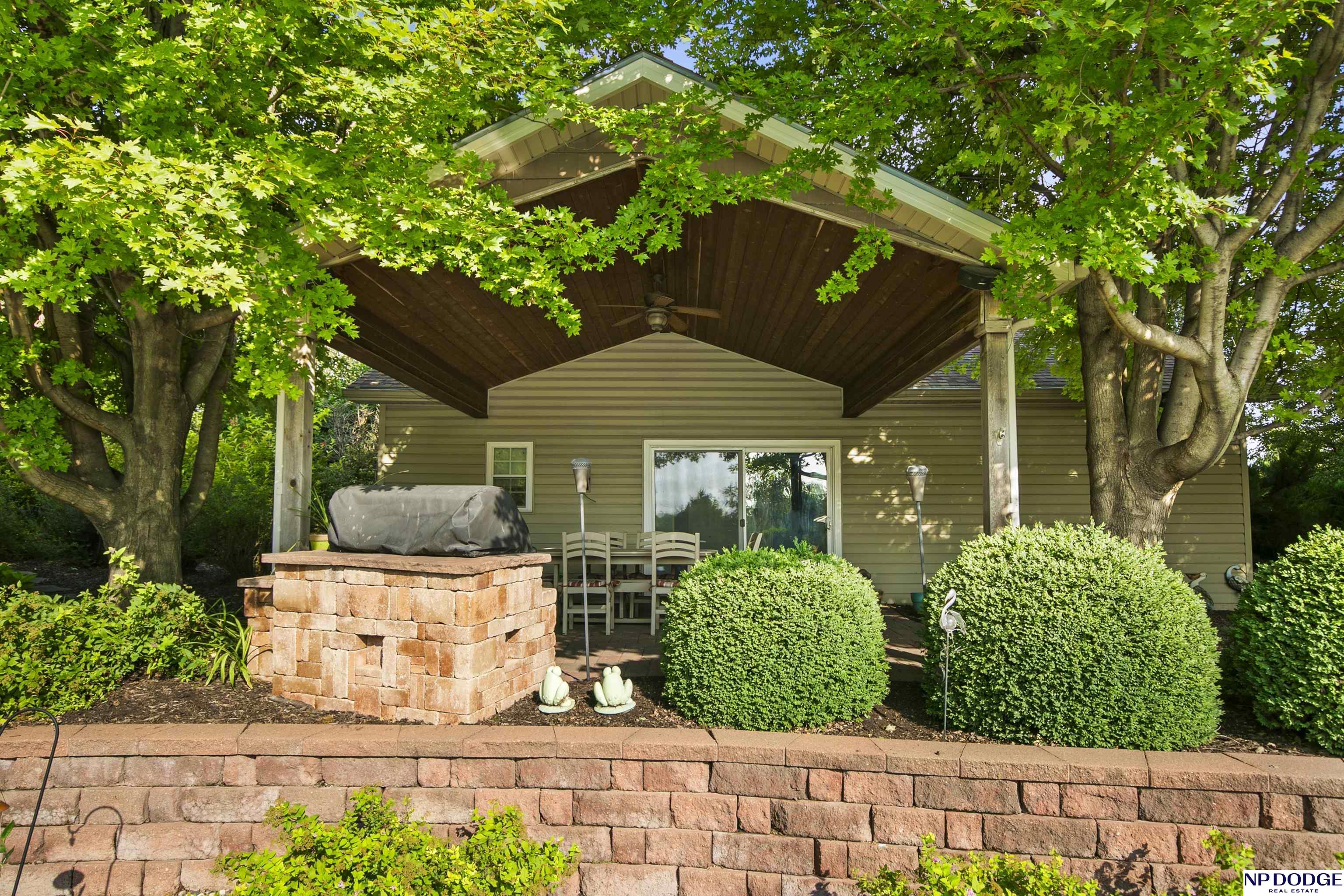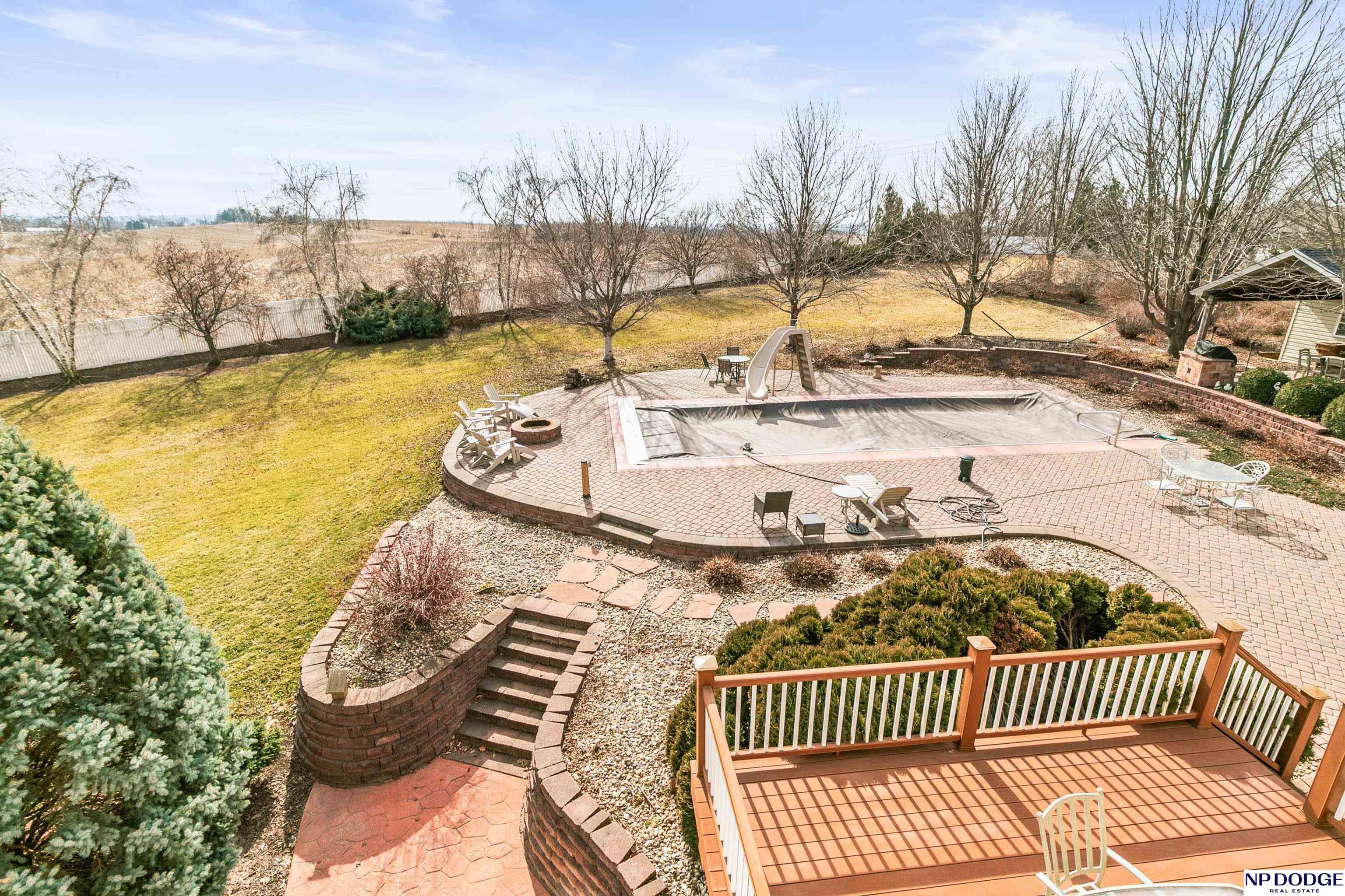 Stunning 2-story estate on 1.17 private, tree-lined acres with a true resort-style backyard designed for elevated entertaining. Enjoy a sparkling in-ground pool, expansive patio, covered hot tub, firepit, and an exceptional pool house featuring a kitchenette, Murphy bed, ¾ bath, and private covered patio. Inside, rich hardwood floors, 9’ ceilings, and a dramatic double-sided fireplace create warmth and architectural presence. The gourmet kitchen showcases high-end Viking appliances, a grand granite island, custom storage, and abundant cabinetry. Upstairs offers four spacious bedrooms including a Jack-and-Jill bath. The luxurious primary suite features a custom walk-in closet with laundry chute and a spa-inspired bath with tile shower, whirlpool tub, and dual vanities. Finished lower level includes a great room with fireplace, granite wet bar, office/playroom, ¾ bath, and private theatre with 4K projector and surround sound. New roof 2025, HVAC 2019. Near Offutt AFB.