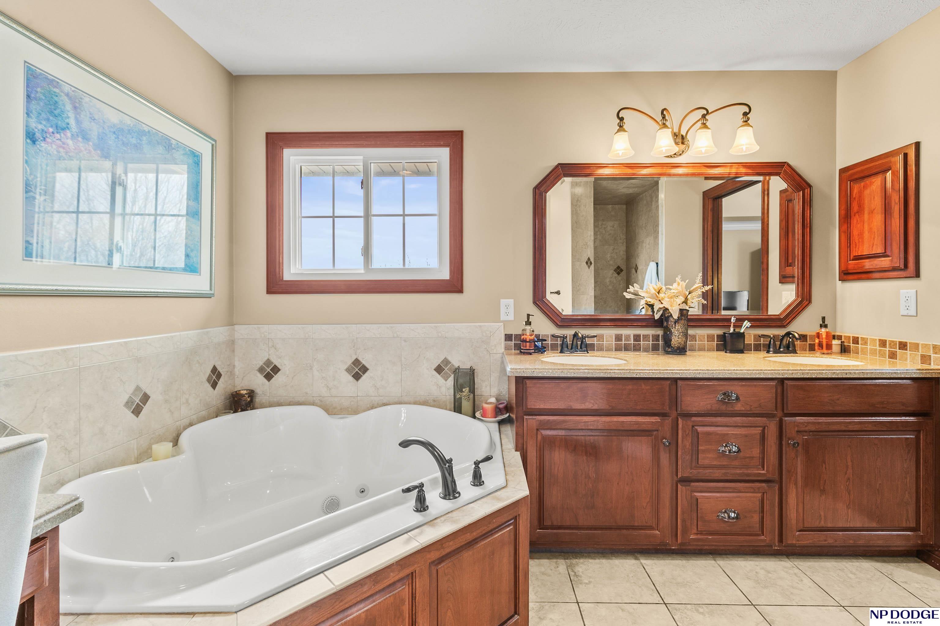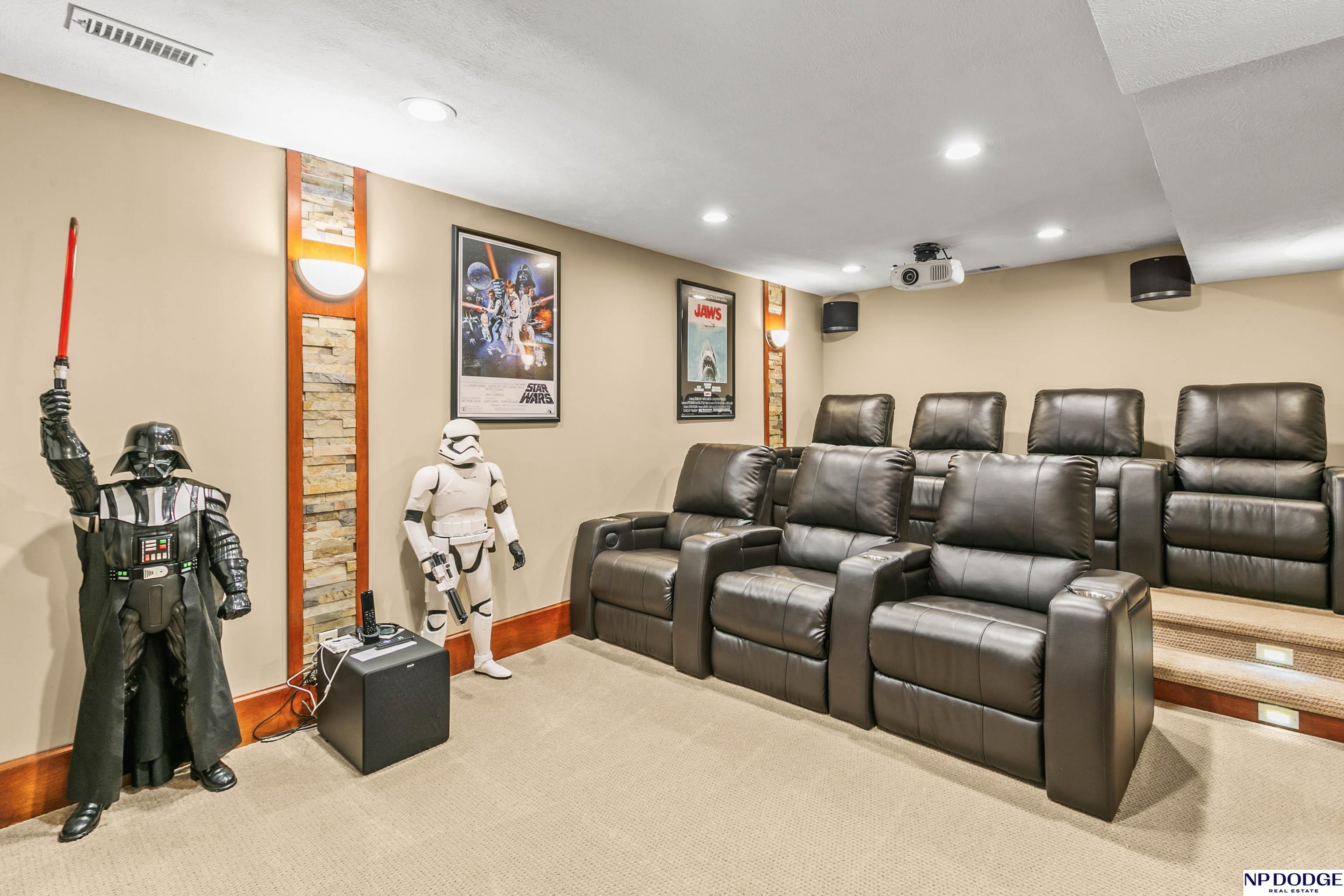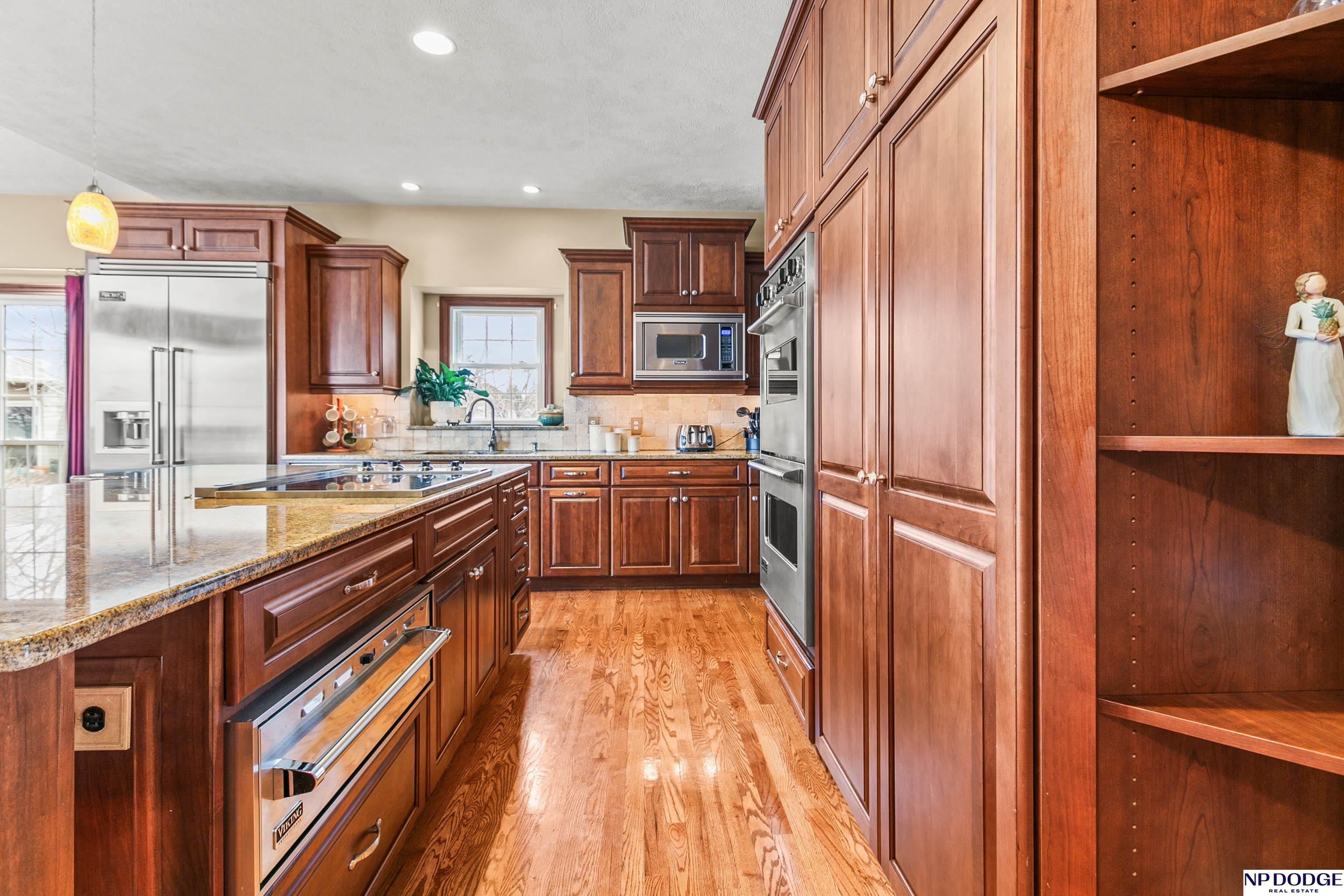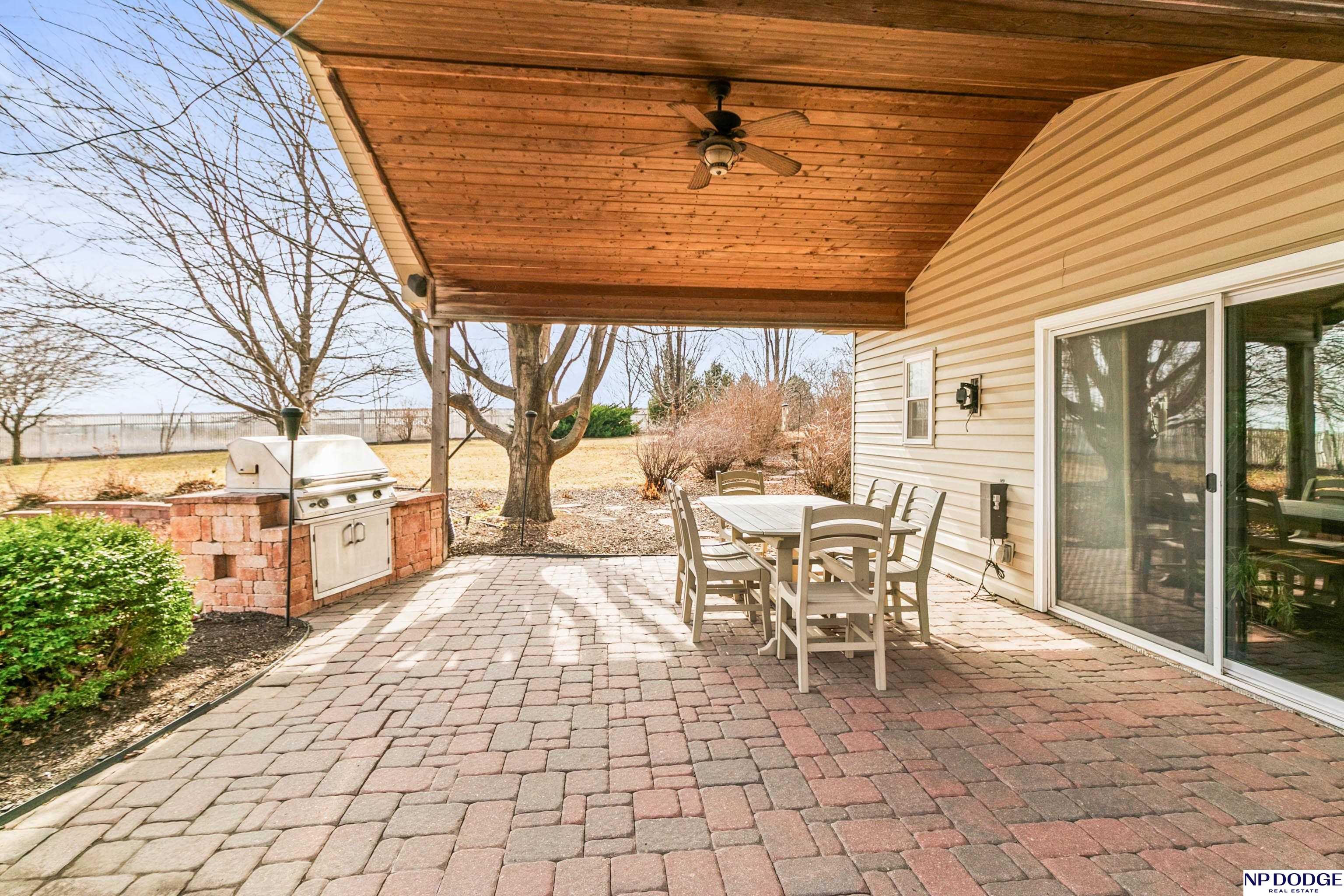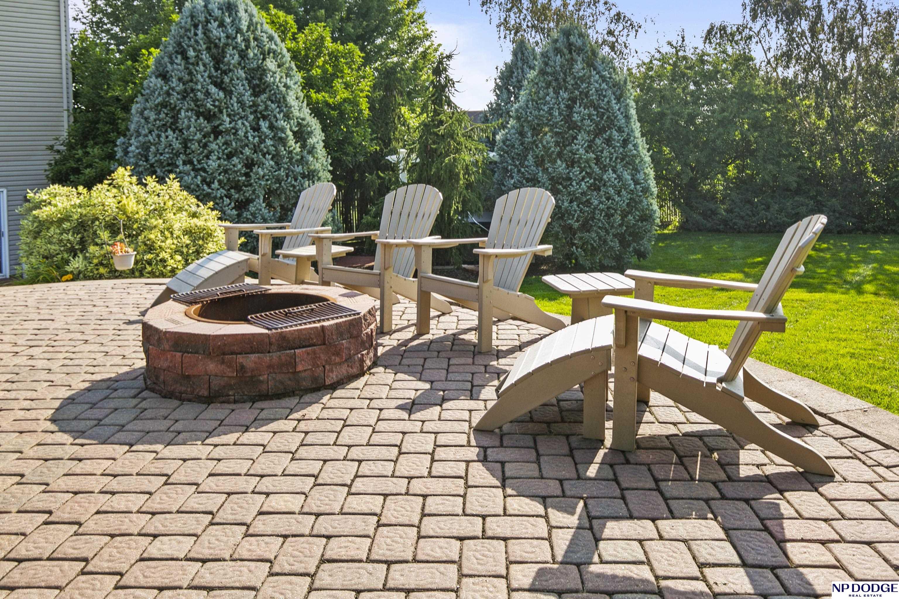 Stunning 2-story estate on 1.17 private, tree-lined acres with a true resort-style backyard designed for elevated entertaining. Enjoy a sparkling in-ground pool, expansive patio, covered hot tub, firepit, and an exceptional pool house featuring a kitchenette, Murphy bed, ¾ bath, and private covered patio. Inside, rich hardwood floors, 9’ ceilings, and a dramatic double-sided fireplace create warmth and architectural presence. The gourmet kitchen showcases high-end Viking appliances, a grand granite island, custom storage, and abundant cabinetry. Upstairs offers four spacious bedrooms including a Jack-and-Jill bath. The luxurious primary suite features a custom walk-in closet with laundry chute and a spa-inspired bath with tile shower, whirlpool tub, and dual vanities. Finished lower level includes a great room with fireplace, granite wet bar, office/playroom, ¾ bath, and private theatre with 4K projector and surround sound. New roof 2025, HVAC 2019. Near Offutt AFB.