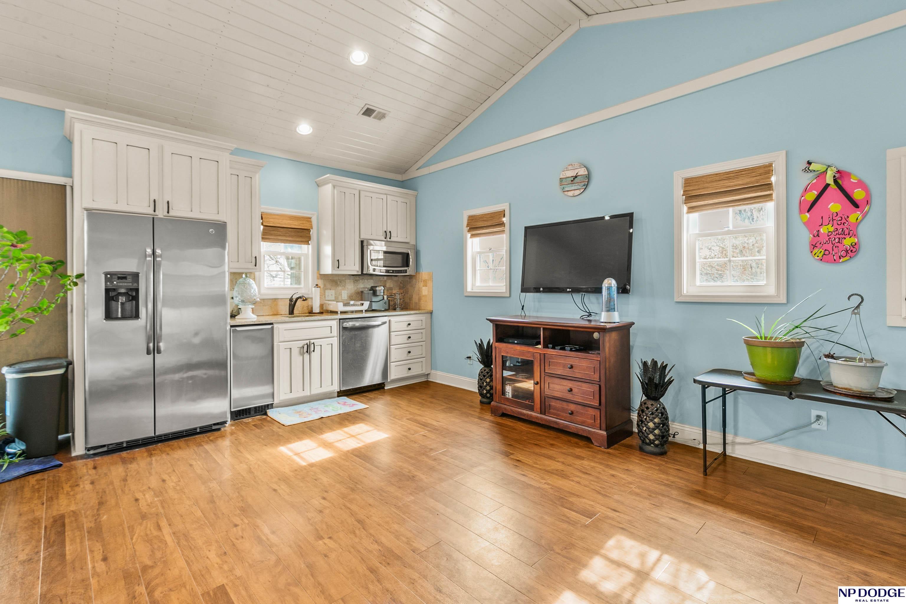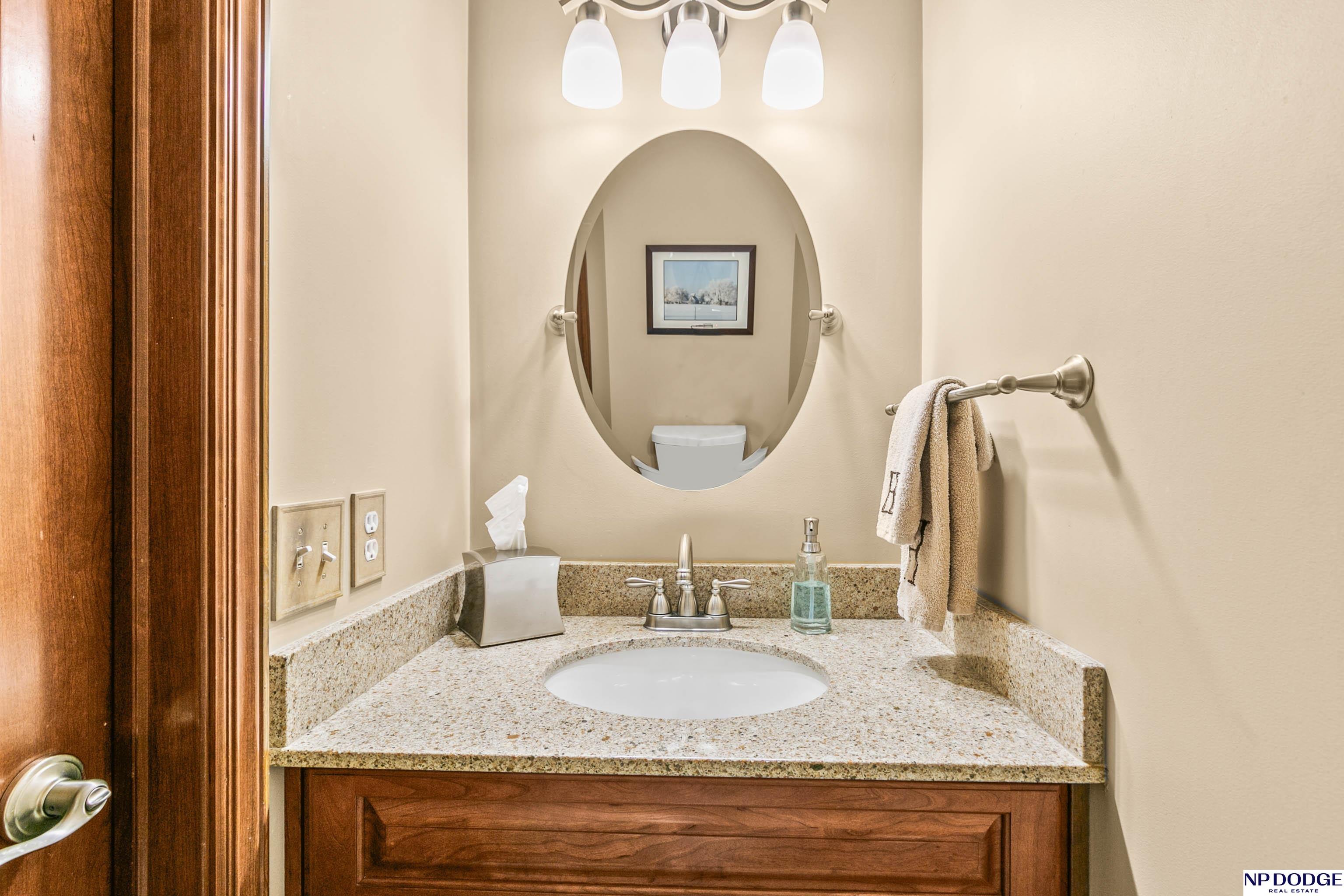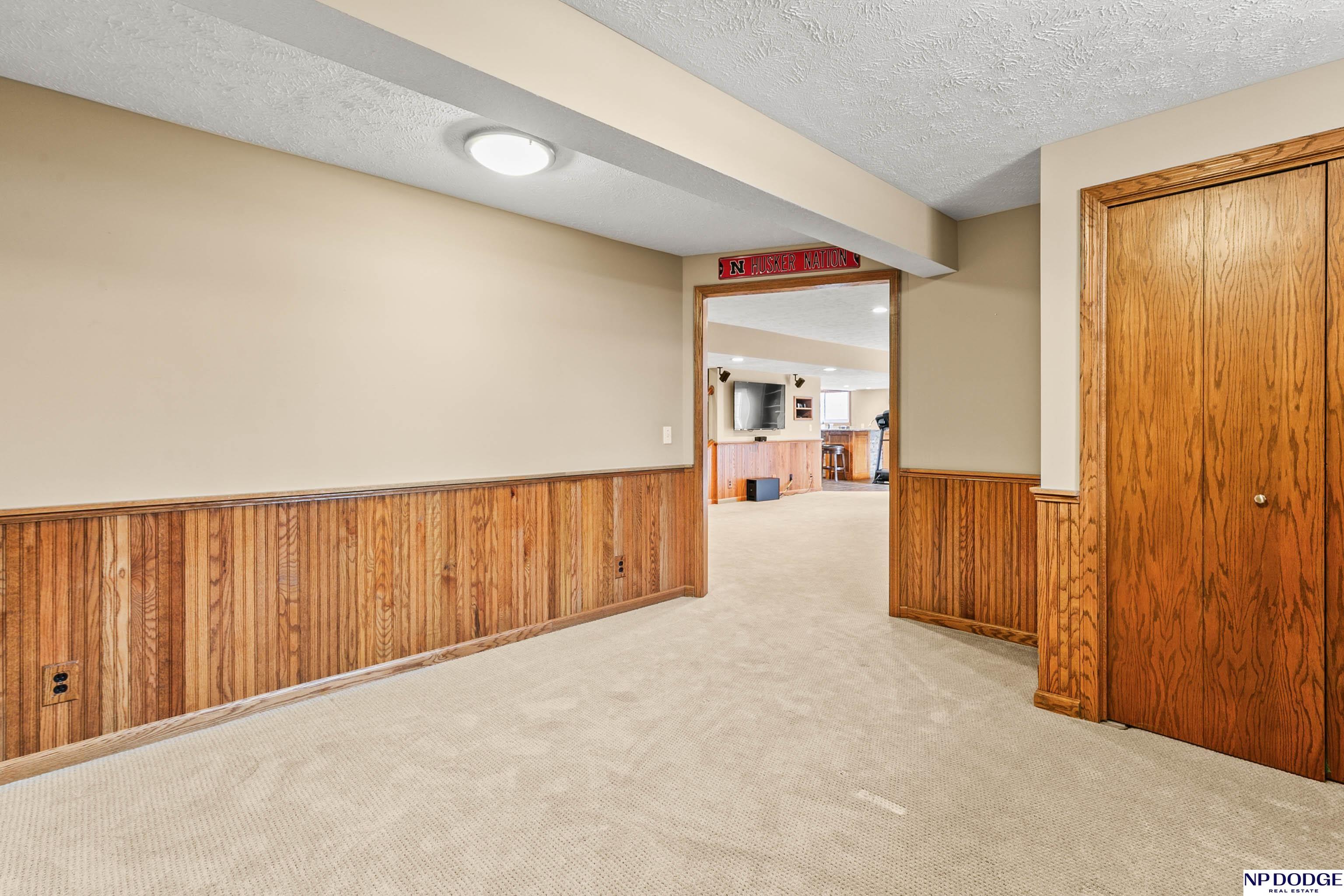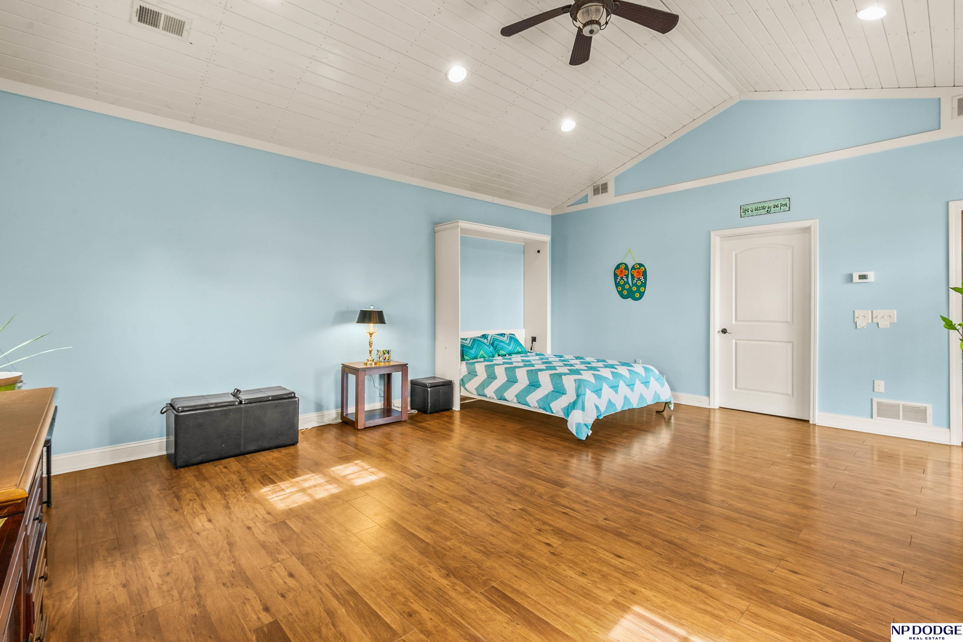 Stunning 2-story estate on 1.17 private, tree-lined acres with a true resort-style backyard designed for elevated entertaining. Enjoy a sparkling in-ground pool, expansive patio, covered hot tub, firepit, and an exceptional pool house featuring a kitchenette, Murphy bed, ¾ bath, and private covered patio. Inside, rich hardwood floors, 9’ ceilings, and a dramatic double-sided fireplace create warmth and architectural presence. The gourmet kitchen showcases high-end Viking appliances, a grand granite island, custom storage, and abundant cabinetry. Upstairs offers four spacious bedrooms including a Jack-and-Jill bath. The luxurious primary suite features a custom walk-in closet with laundry chute and a spa-inspired bath with tile shower, whirlpool tub, and dual vanities. Finished lower level includes a great room with fireplace, granite wet bar, office/playroom, ¾ bath, and private theatre with 4K projector and surround sound. New roof 2025, HVAC 2019. Near Offutt AFB.