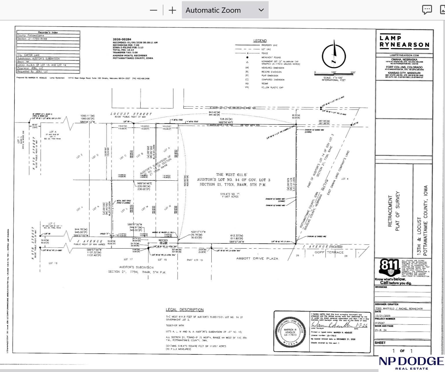 Exceptional commercial development opportunity in Carter Lake featuring four contiguous parcels totaling 11.9 acres, strategically positioned with excellent traffic exposure and accessibility. The property's commercial zoning supports a broad range of permitted uses, including maintenance facilities, utilities, office space, communication services, construction sales, parking structures, and warehousing. Located just minutes from Eppley Airfield, the Downtown Omaha business district, and the historic Old Market, this site offers unparalleled regional connectivity while benefiting from Carter Lakes pro -business environment.