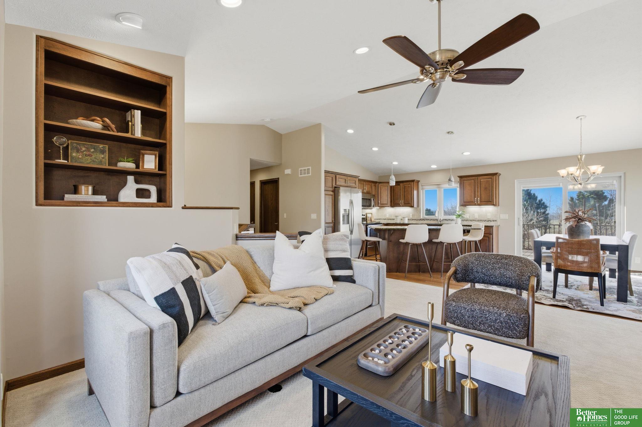 Open Sunday 11-12:30! Welcome home to this immaculate, single-owner, custom-built Bellevue home with an open layout. The living space with professionally cleaned carpet offers natural lighting with quality Enerlux windows - all covered with Hunter Douglas blinds. The vaulted-ceiling living room with gas fireplace flows into a well-designed, wood floor, granite countertop kitchen (all appliances included) centered around a spacious island. Two generously sized bedrooms, including a primary suite with a walk-in closet, double-sink vanity, 3/4 bath and a work area. The main floor features an additional full bathroom and laundry room (dryer and new washer included) with a large utility sink. The backyard is a standout - no rear neighbors and maintained landscaping with a sprinkler system - plus a composite deck with a gas line. An unfinished basement with rough-ins and egress windows offers significant storage and potential for future expansion. Pre-inspected, plus a new roof. Don't wait!