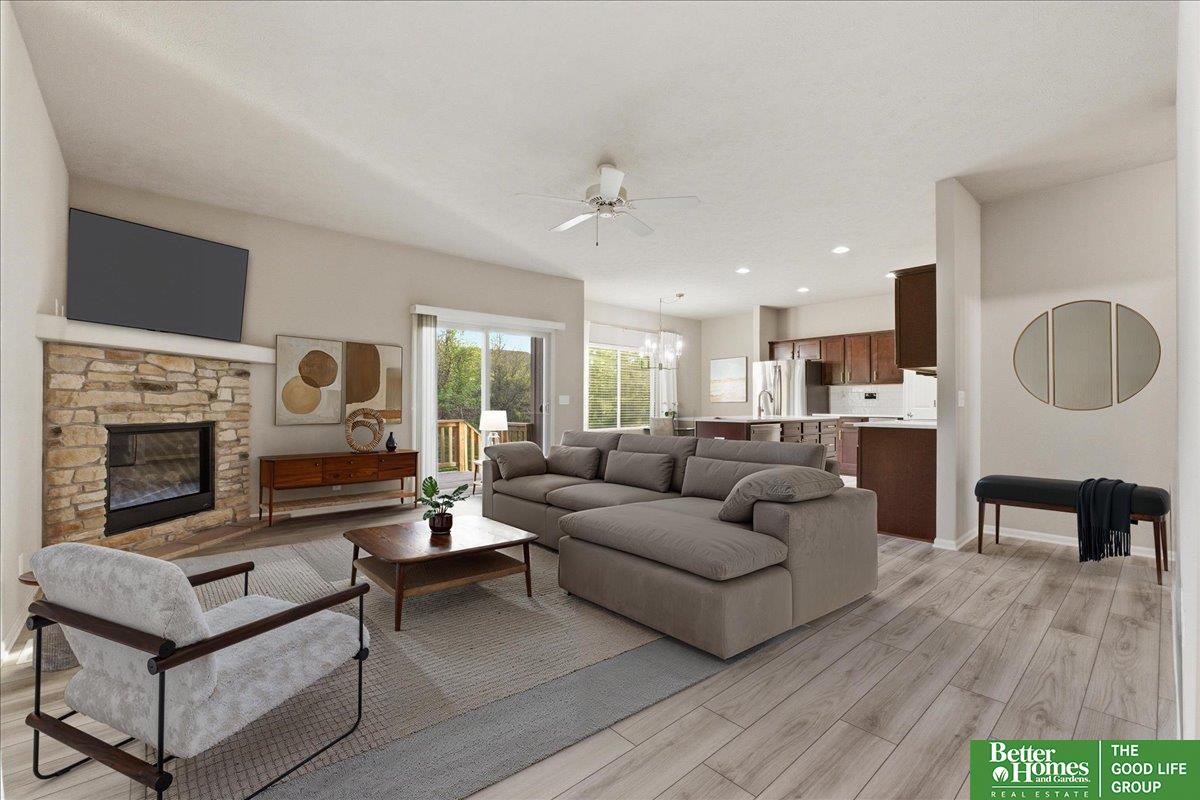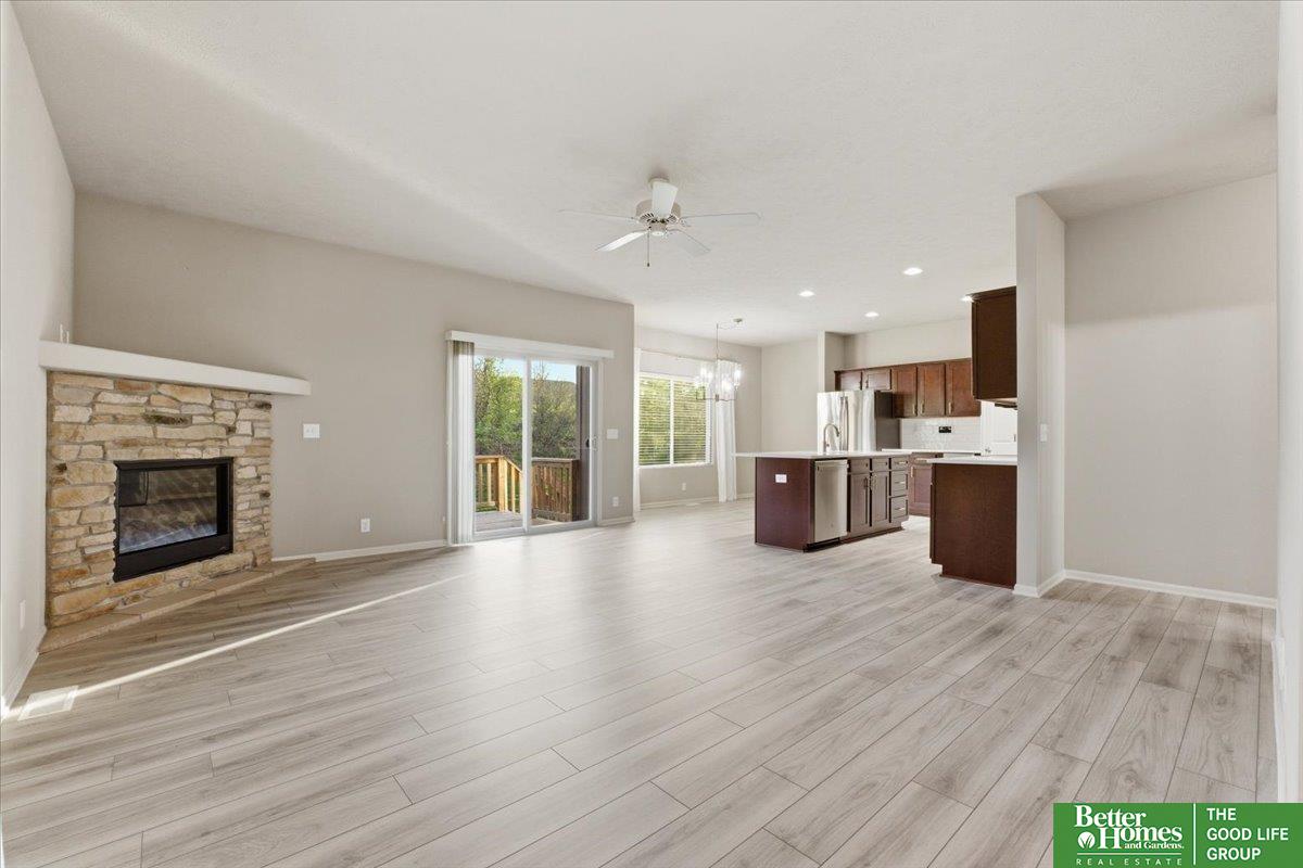 Beautiful 3-bedroom, 2-bath townhome with must-see updates! Enjoy an exceptional location featuring a south-facing private backyard and open green space in front of the home. This wonderful open-concept floor plan includes stainless steel appliances, a wine fridge, and a large walk-out deck—perfect for entertaining. Luxury vinyl tile (LVT) flooring runs throughout the living area and kitchen. Conveniently located near Standing Bear Lake and recreation areas, with wonderful walking trails right outside the backyard. Best of all, no yard work or snow removal required! Move-in ready and in perfect condition!