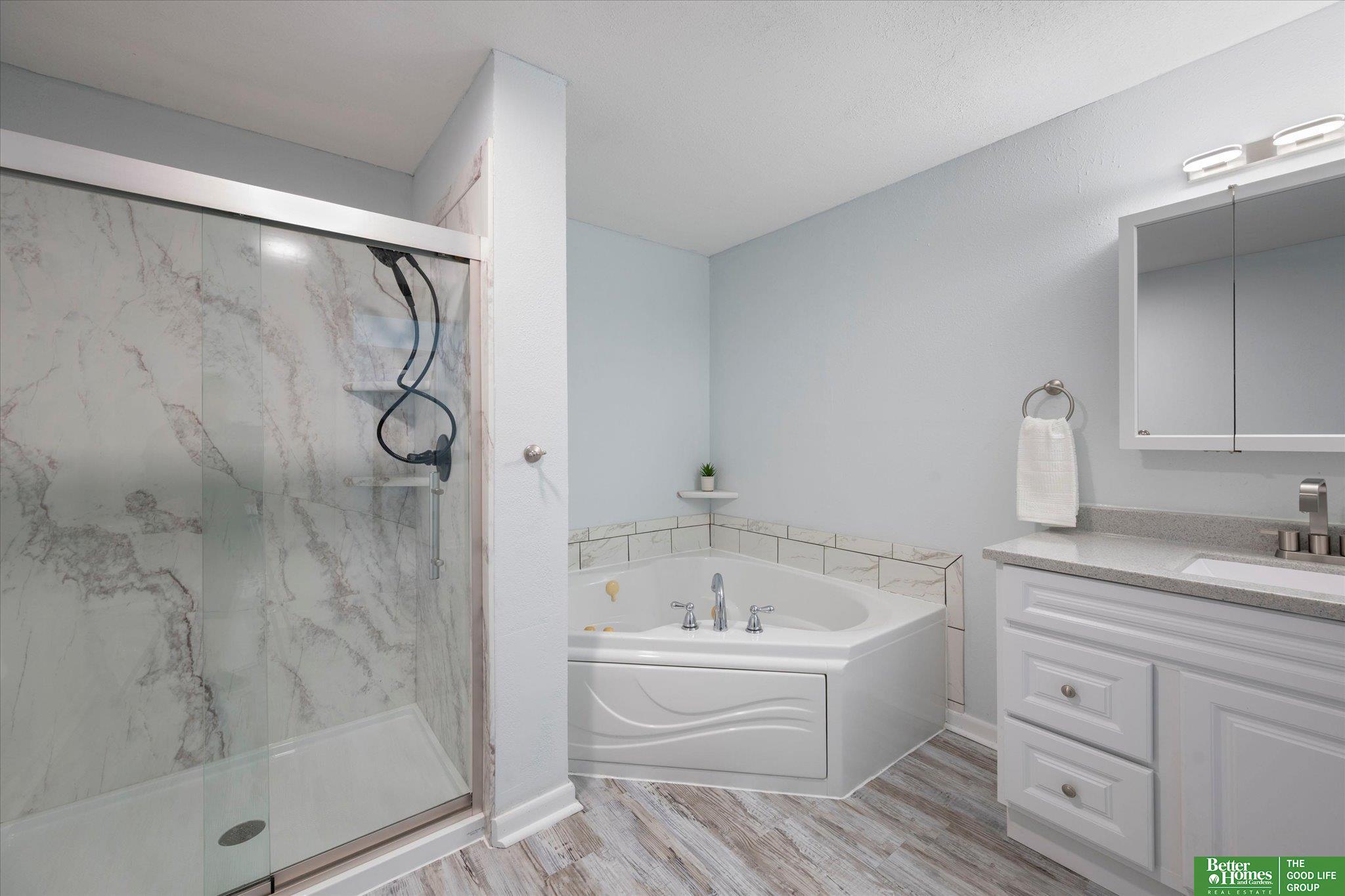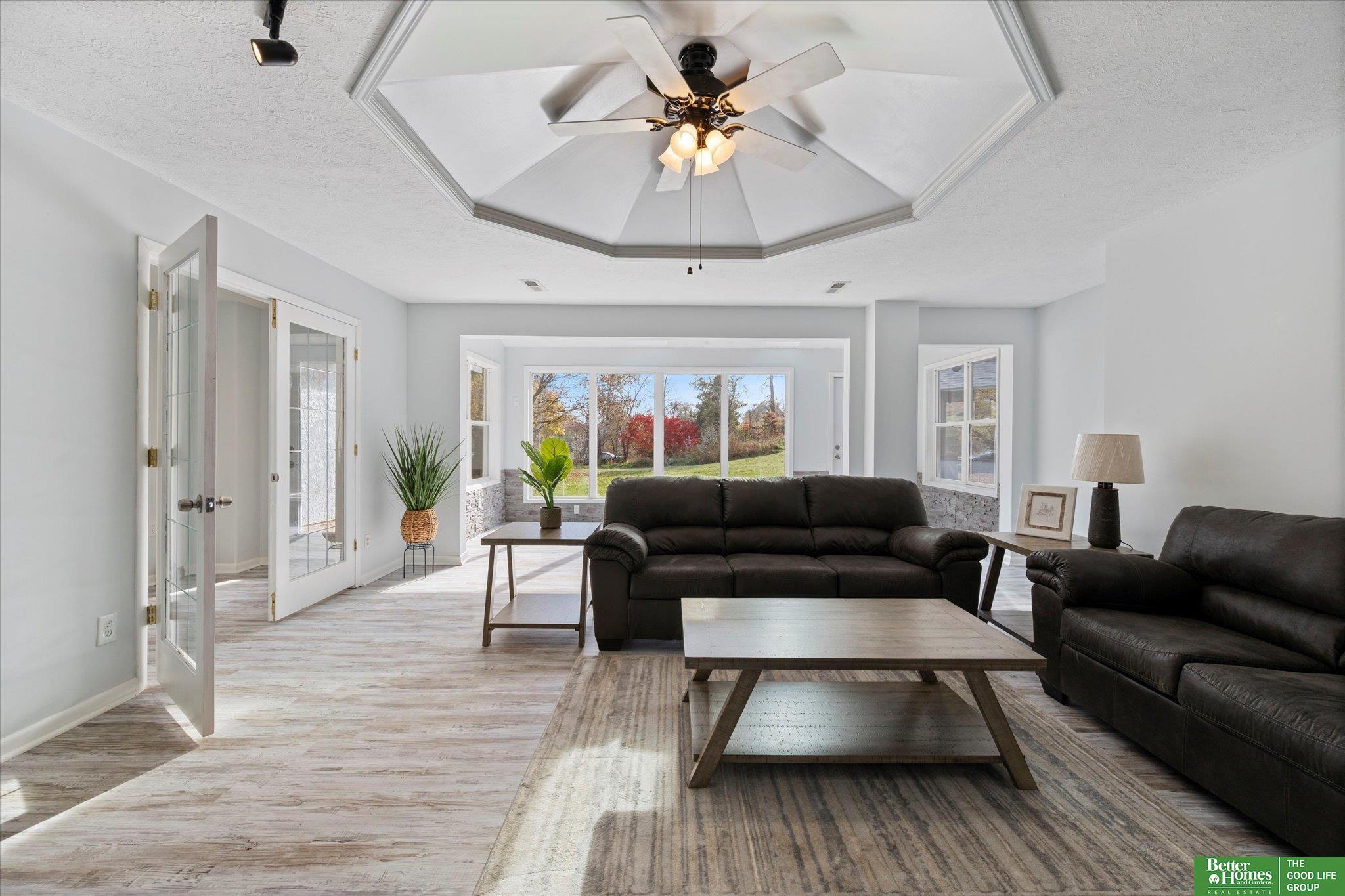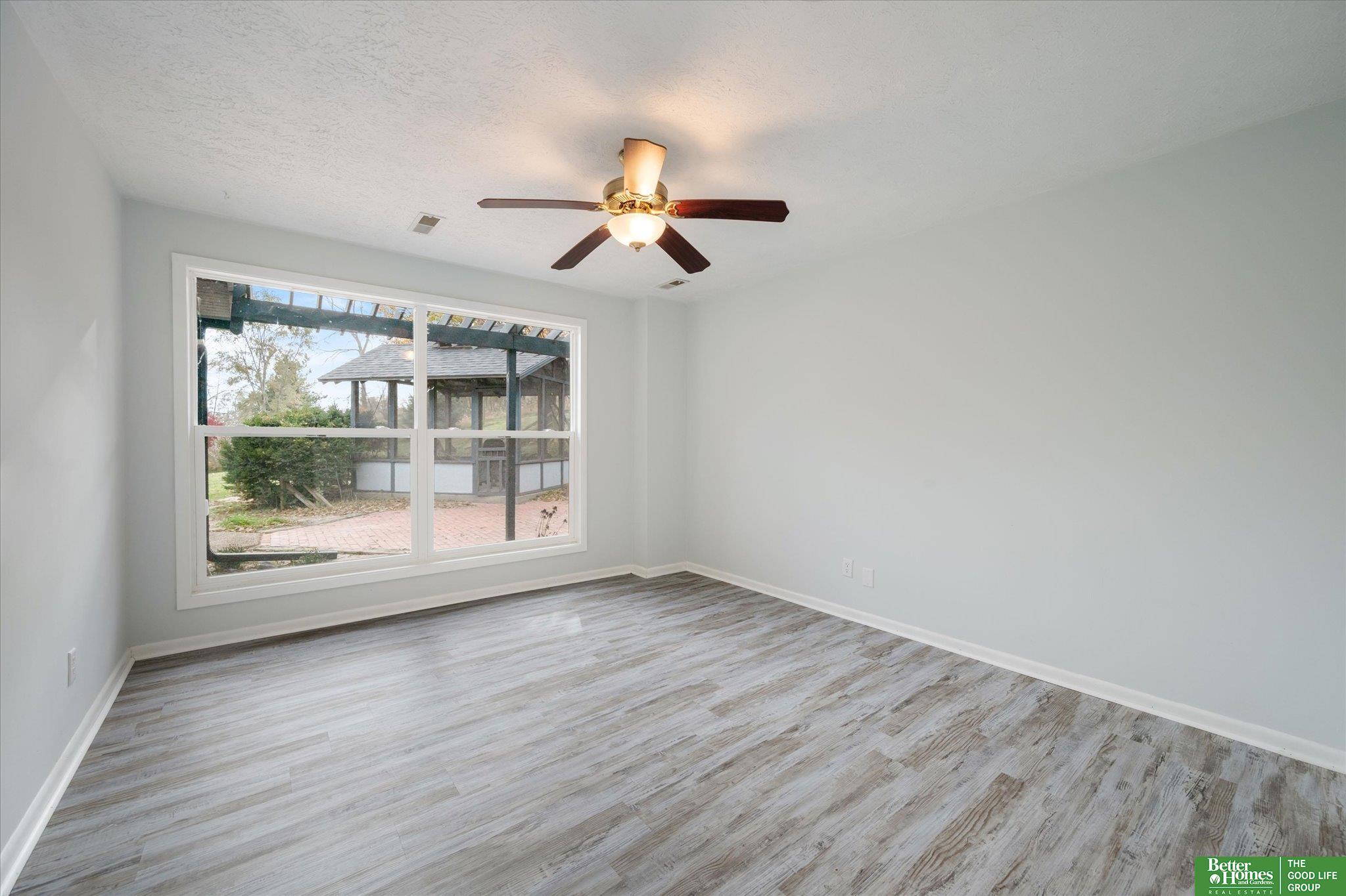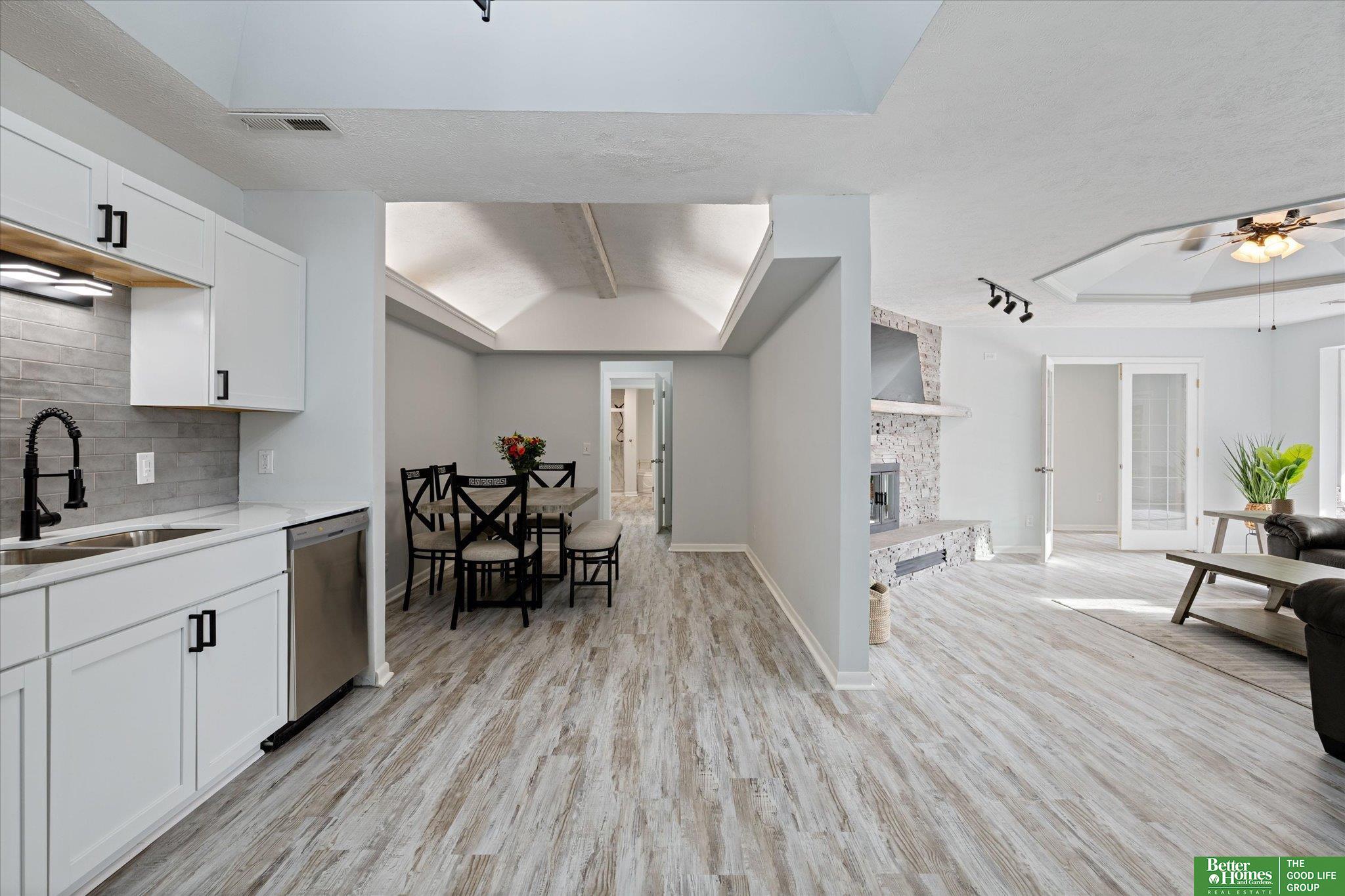 Enjoy peaceful acreage living just minutes from Omaha in this beautifully updated ranch home on a picturesque 1-acre lot. Offering 2,500+ sq ft, this home features a fully updated kitchen with new cabinetry, quartz countertops, stainless steel appliances, and adjoining dining area. Bright, open living room with stunning stone fireplace and an inviting sunroom perfect for year-round enjoyment. Two primary suites, each with private ensuite baths and walk-in closets, plus two additional spacious bedrooms and two additional bathrooms. Convenient laundry room with extra storage. Fresh paint and new flooring throughout. Outdoor amenities include a private gazebo, fire pit area, and natural landscaping creating a peaceful retreat. Oversized 2-car garage, additional storage room, and large shed provide ample space for vehicles, tools, and hobbies. Rare opportunity for updated acreage living close to city conveniences. AMA.