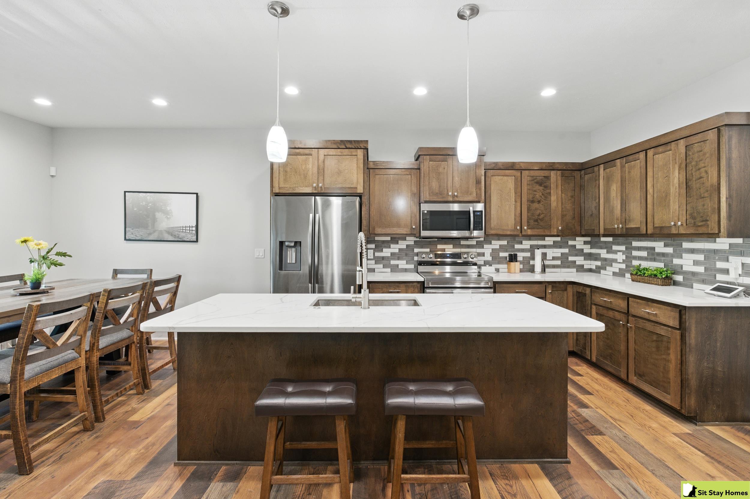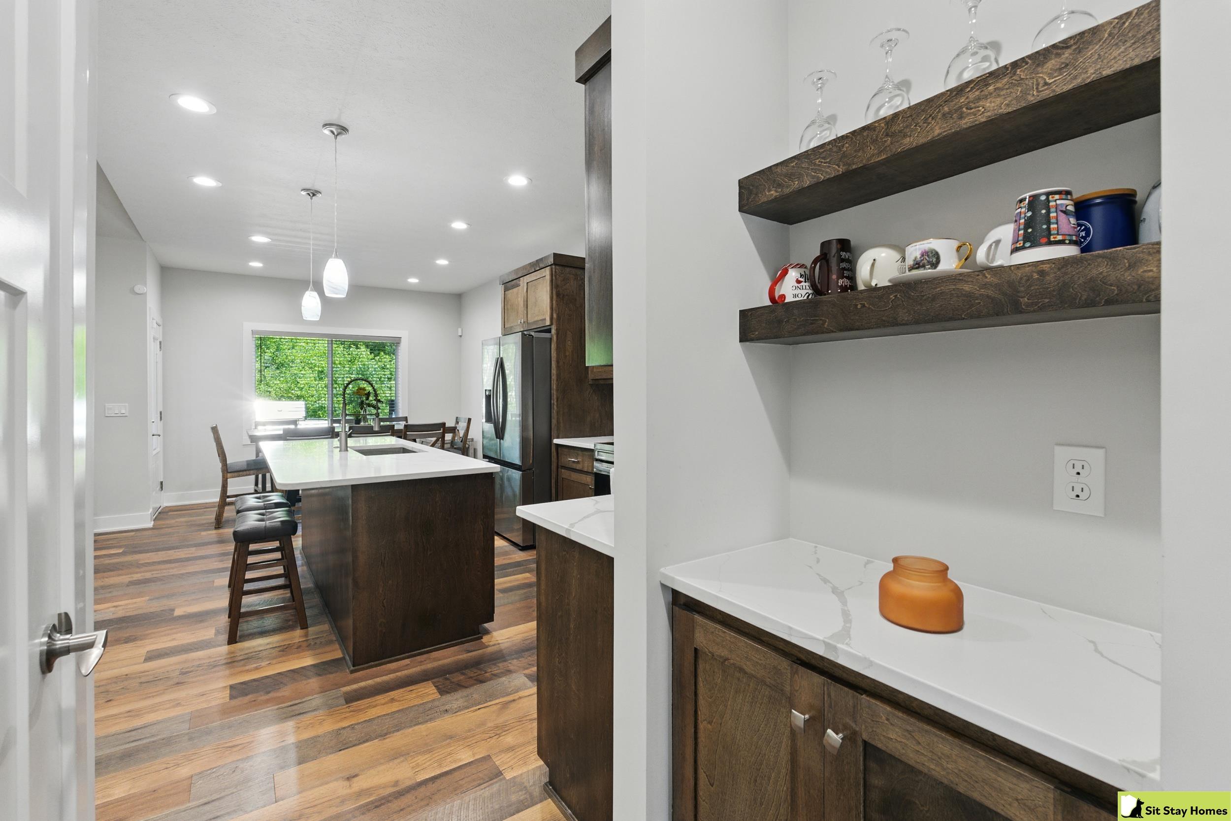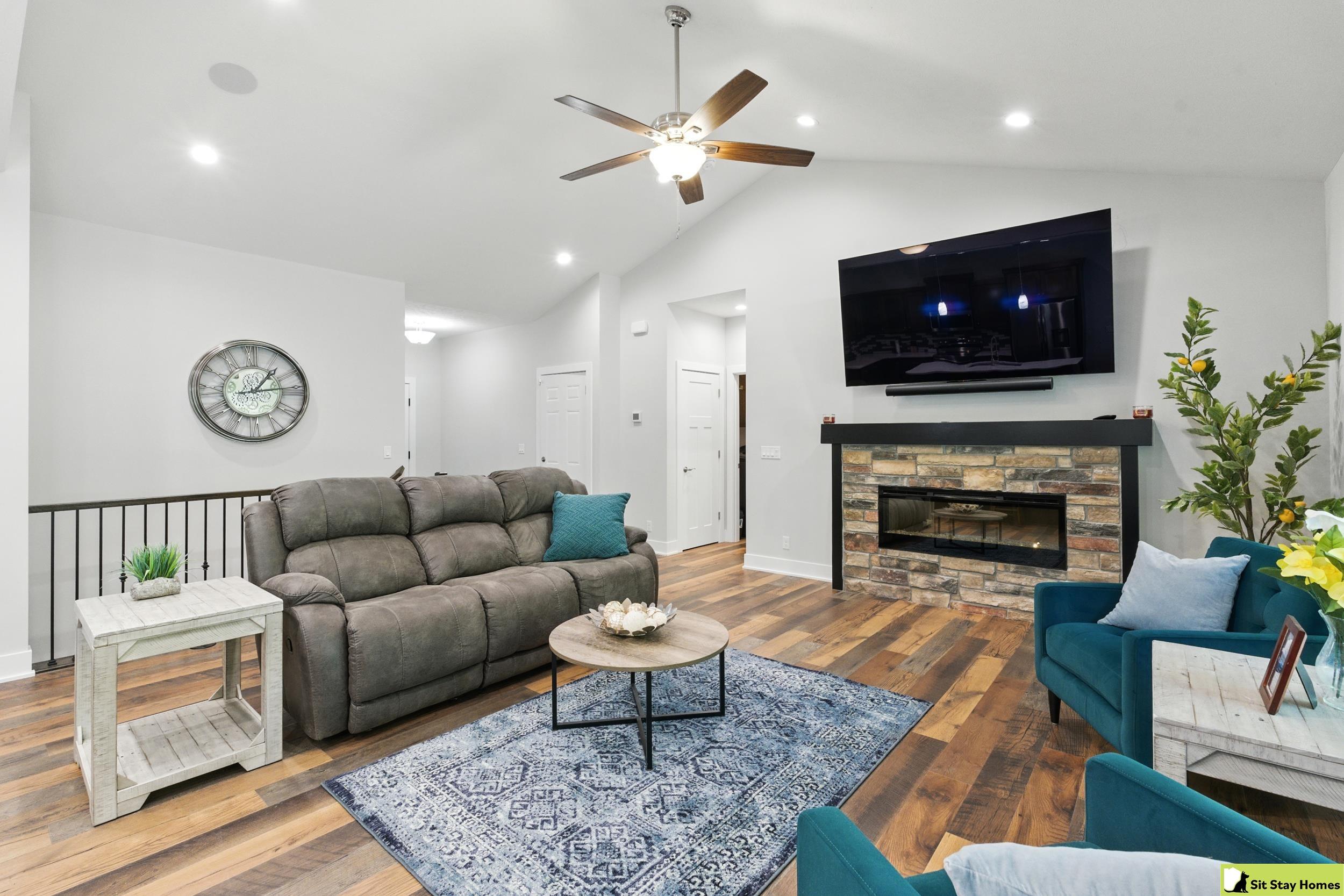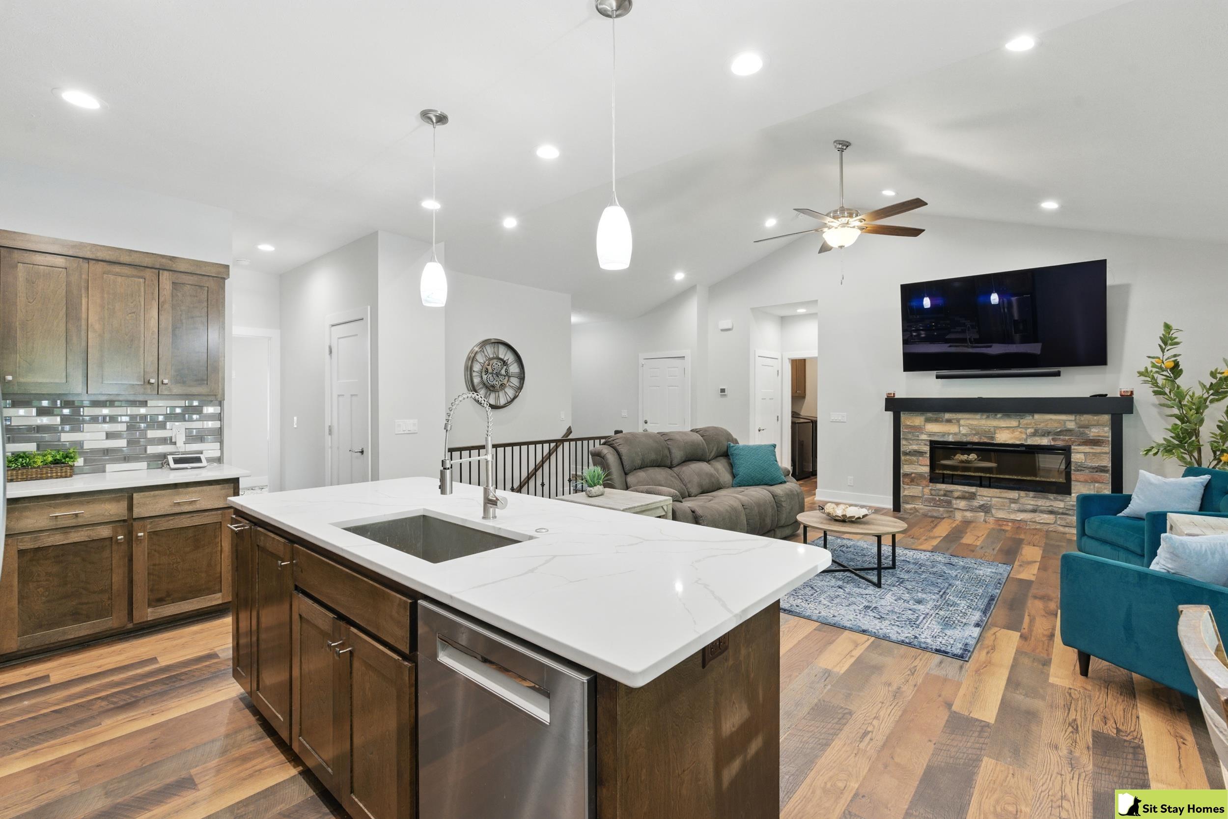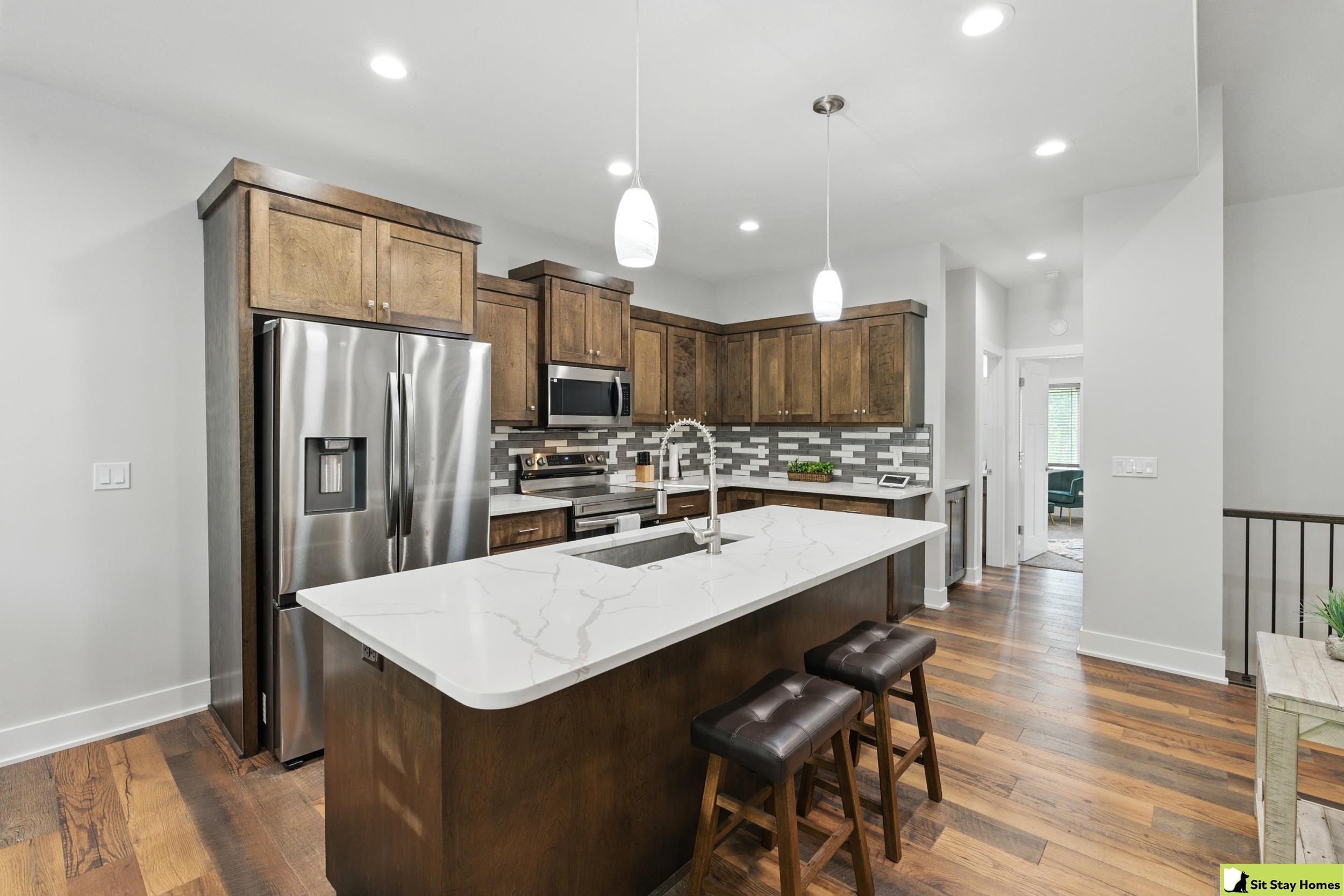 Incredible custom home almost new home backs wooded area! Amazing extra large trex deck, wired for outdoor TV & speakers. This home has no behind, front, or across the street neighbors. The view is all trees. Inside, you’ll love the two spacious main-floor suites—perfect for guests or multigenerational living. The lower level 3rd bedroom is also very large & has a walk in shower. Finishes throughout include quartz counter tops, high end luxury vinyl plank flooring & tile, custom railings, recessed lighting, & large windows with wooded views. The main floor living/kitchen area has built in Sonos speakers & a fun coffee area w/shelving. The walk-out basement adds even more space with a rec room, another living area and plumbing ready for a future wet bar. Outside there's durable LP SmartSide siding, 50-year shingles, & the appliances are still under warranty. Check out the LOW taxes and convenient location. All measurements are approximate.