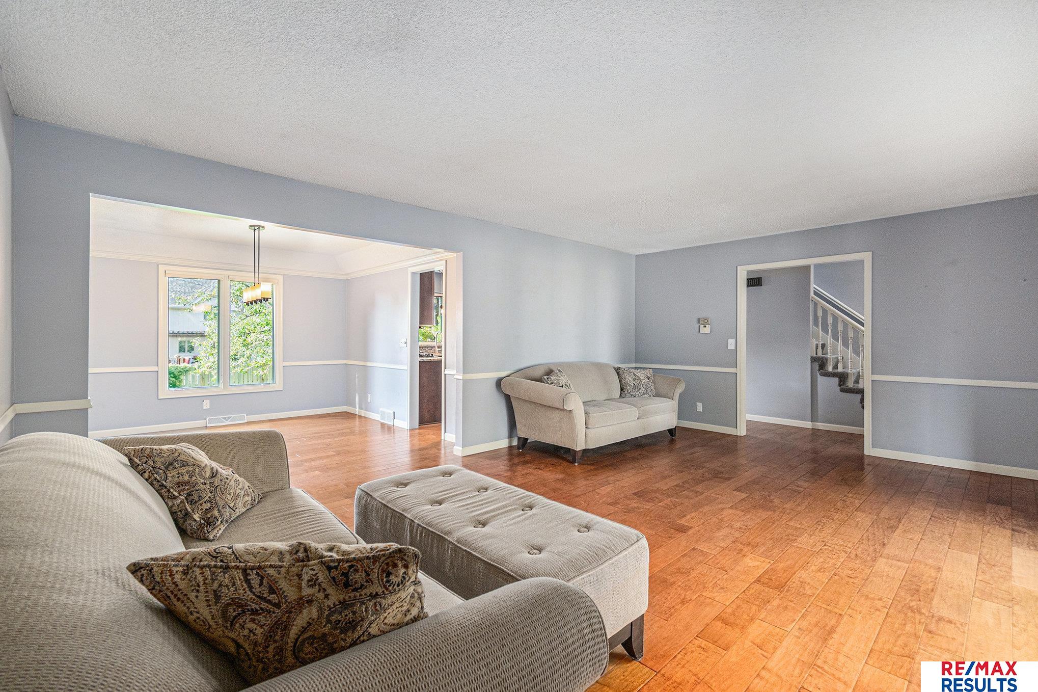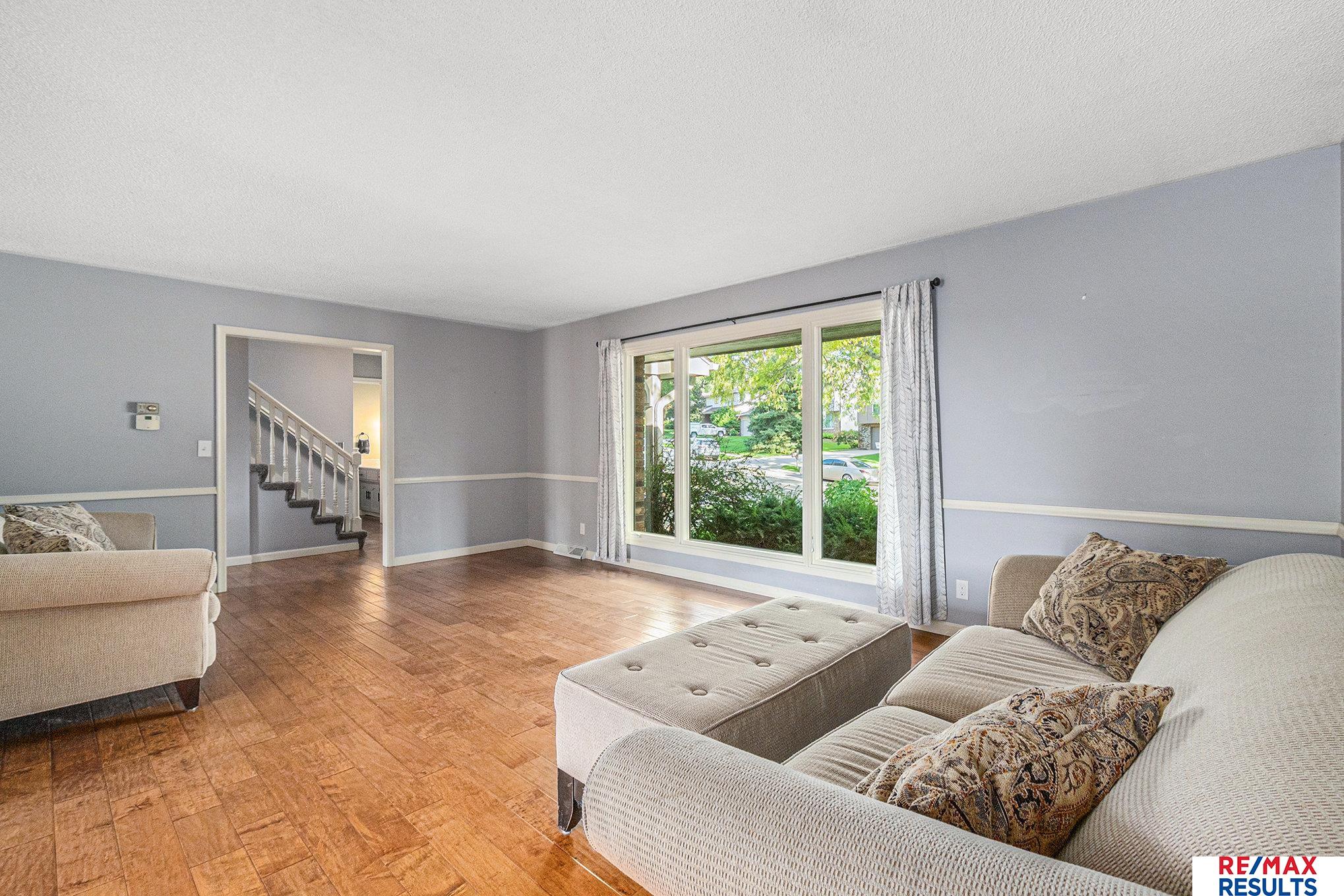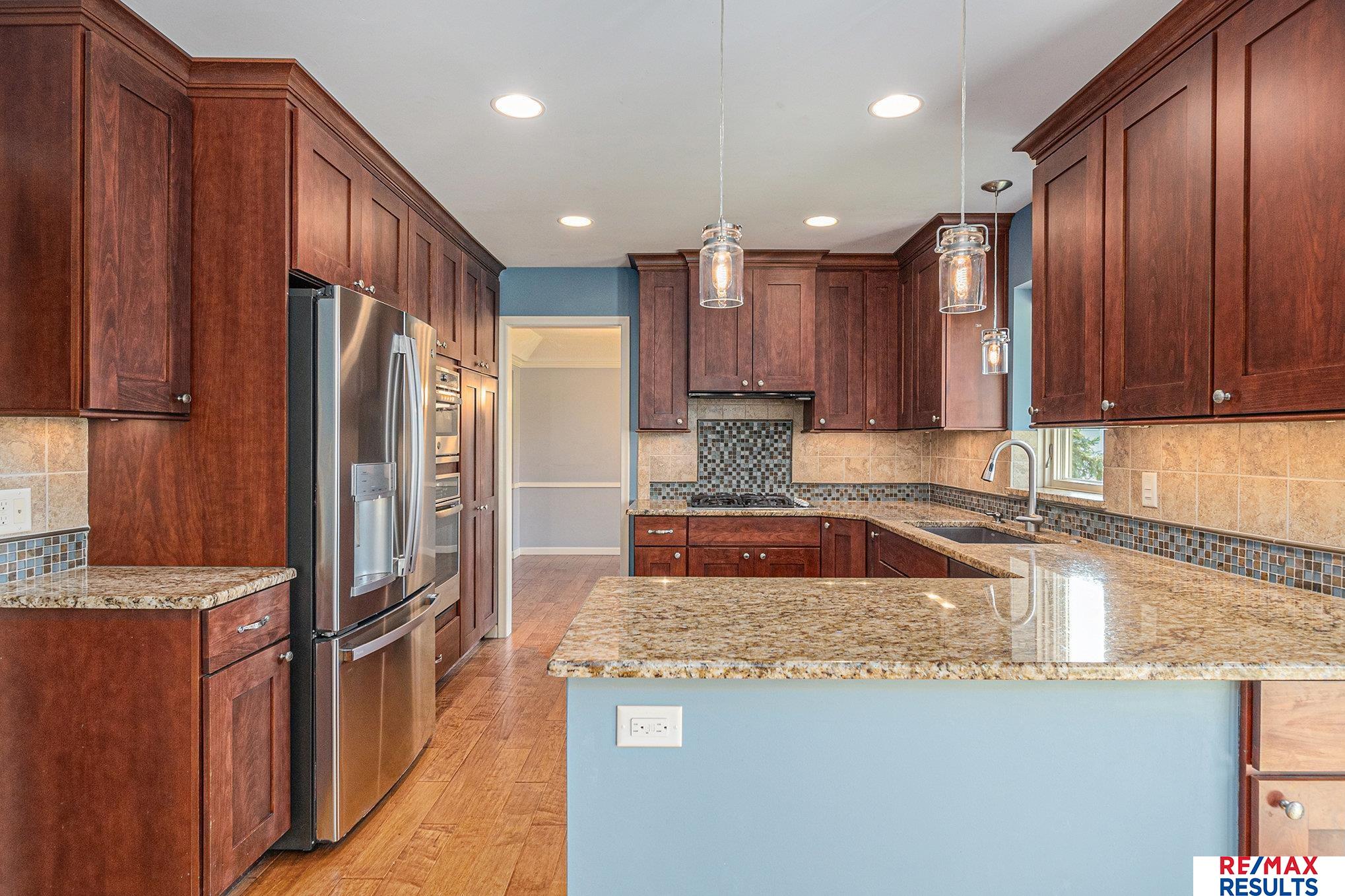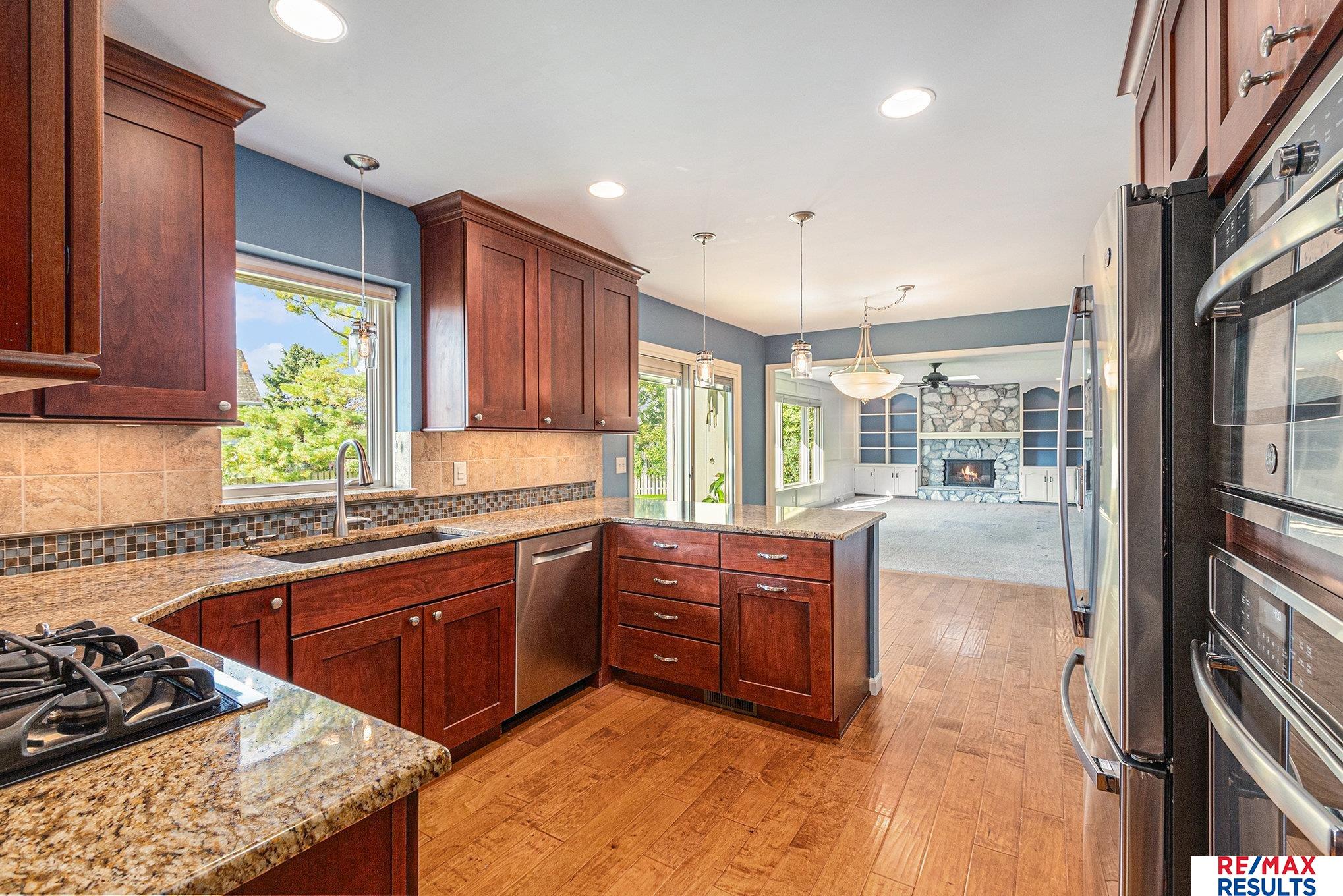 WOW — this pre-inspected, southeast-facing gem is a true retreat in the heart of the Millard North school district! The park-like yard is framed by mature trees, lush landscaping, and a privacy fence, all kept vibrant with a sprinkler system. Inside, the gorgeous kitchen steals the show with updated cabinetry, granite counters, stylish backsplash, high-end stainless appliances, and beautiful wood floors. You’ll love the elegant lighting throughout and the great room’s detailed painted woodwork, built-ins, and stunning floor-to-ceiling stone fireplace. The primary suite offers a spa-like tiled shower and a massive walk-in closet, while the lower level is perfect for entertaining with a spacious rec room, half bath, and incredible storage. All major appliances — including washer and dryer — are included. Just three blocks from the neighborhood Park, tennis courts, and the Papio Trail, this home has the perfect mix of comfort, beauty, and location!