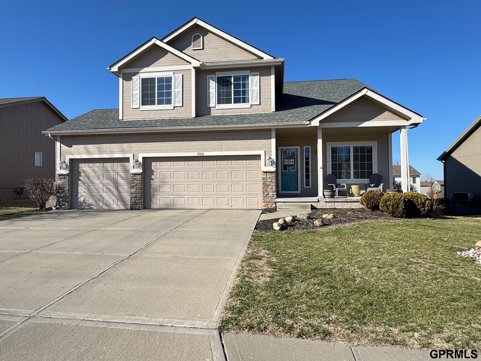 Wonderful 2 story home offering 4 bedrooms, 3 1/2 bathrooms, and 3-car garage located in Stone Ridge. Ideal for growing or multi-generational households. Main level features eat-in kitchen complete with quartz countertops, a center island, and ample cabinetry. Hickory hardwood flooring throughout the main level, staircase, and 2nd floor hallway. Upstairs, 4 generously sized bedrooms, including a spacious primary suite with a walk-in closet and dual-sink vanity. Finished lower level ideal for a studio apt, guest suite, or entertainment space. Featuring kitchen, a large bathroom with an oversized tiled shower and river-rock flooring, and a non-conforming bedroom. Italian herringbone-pattern porcelain throughout lower level. Custom garage workshop with abundant storage. Neighborhood amenities include walking distance to Elk Creek Crossing Park, Stone Ridge Splash Park and Standing Bear Elementary. Other: NEW ROOF installed 2025, sprinkler system, fenced yard, & raised vegetable garden.
