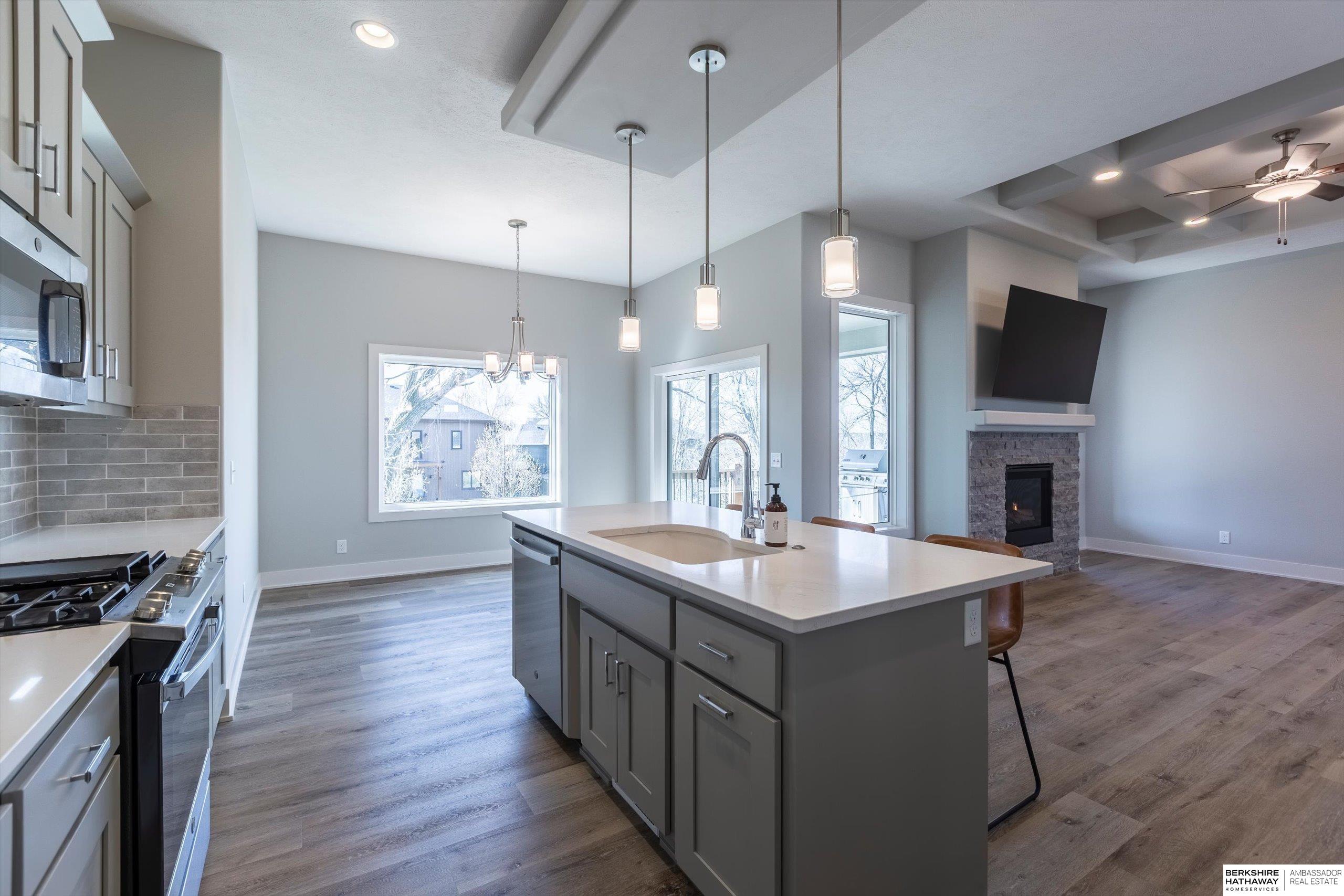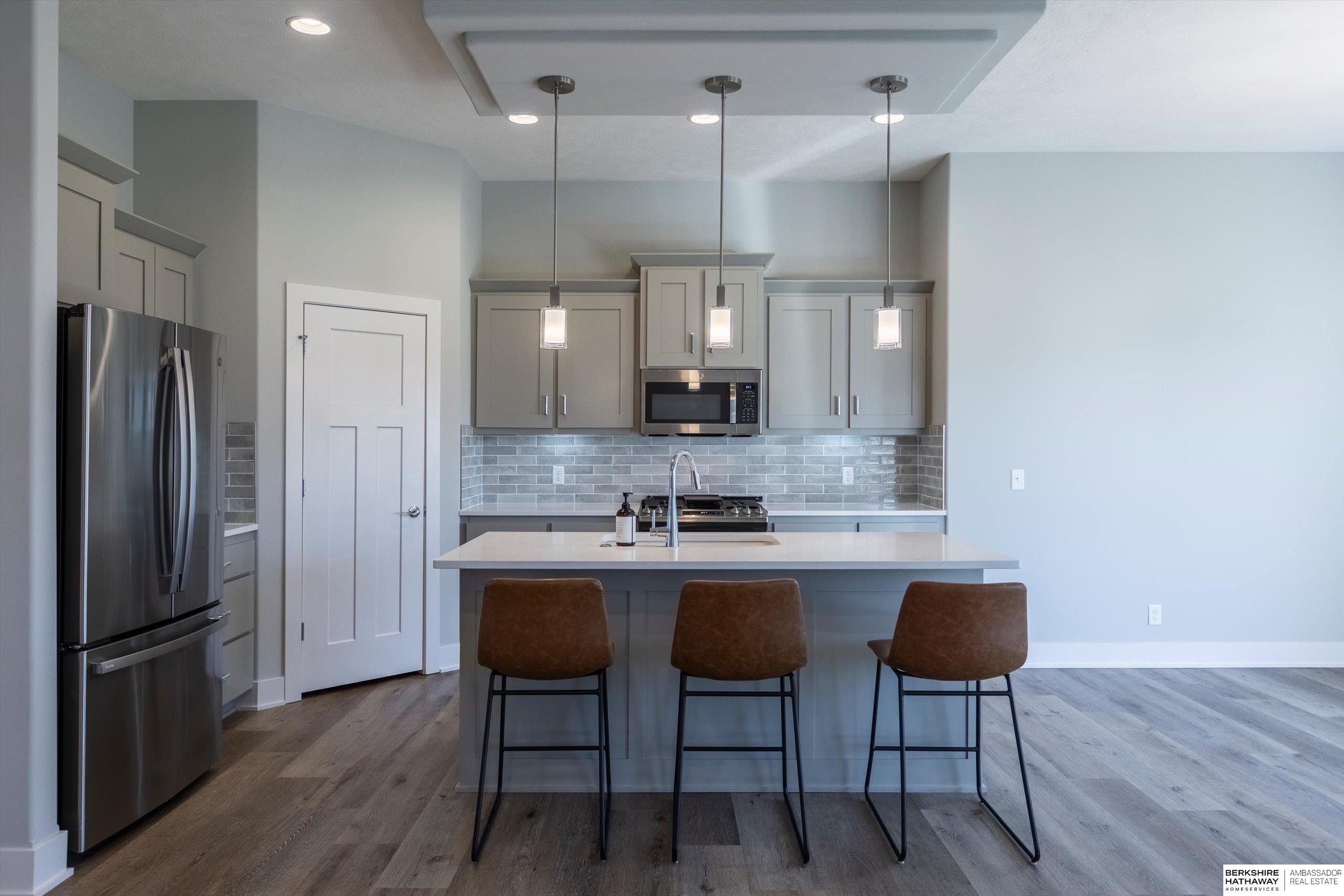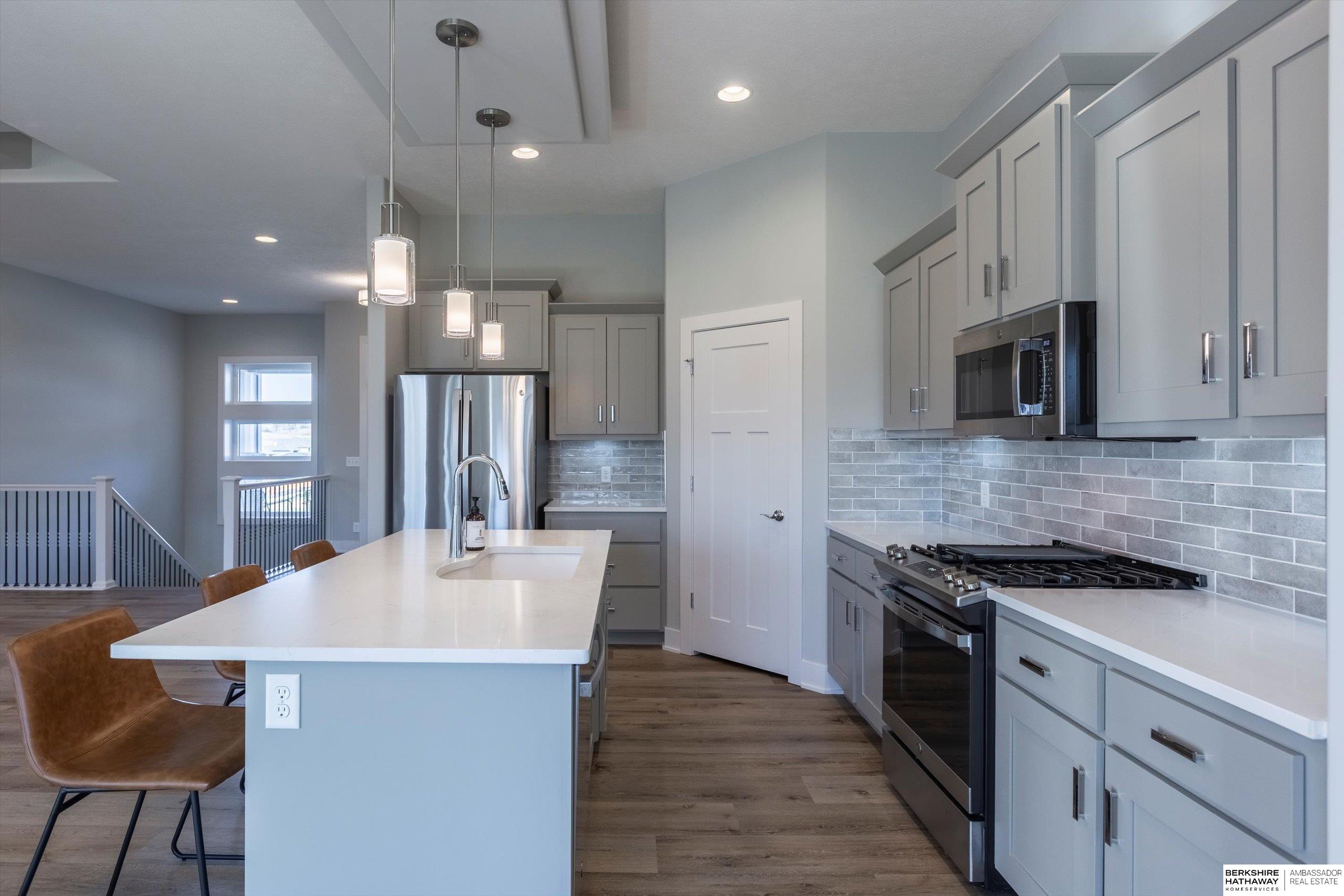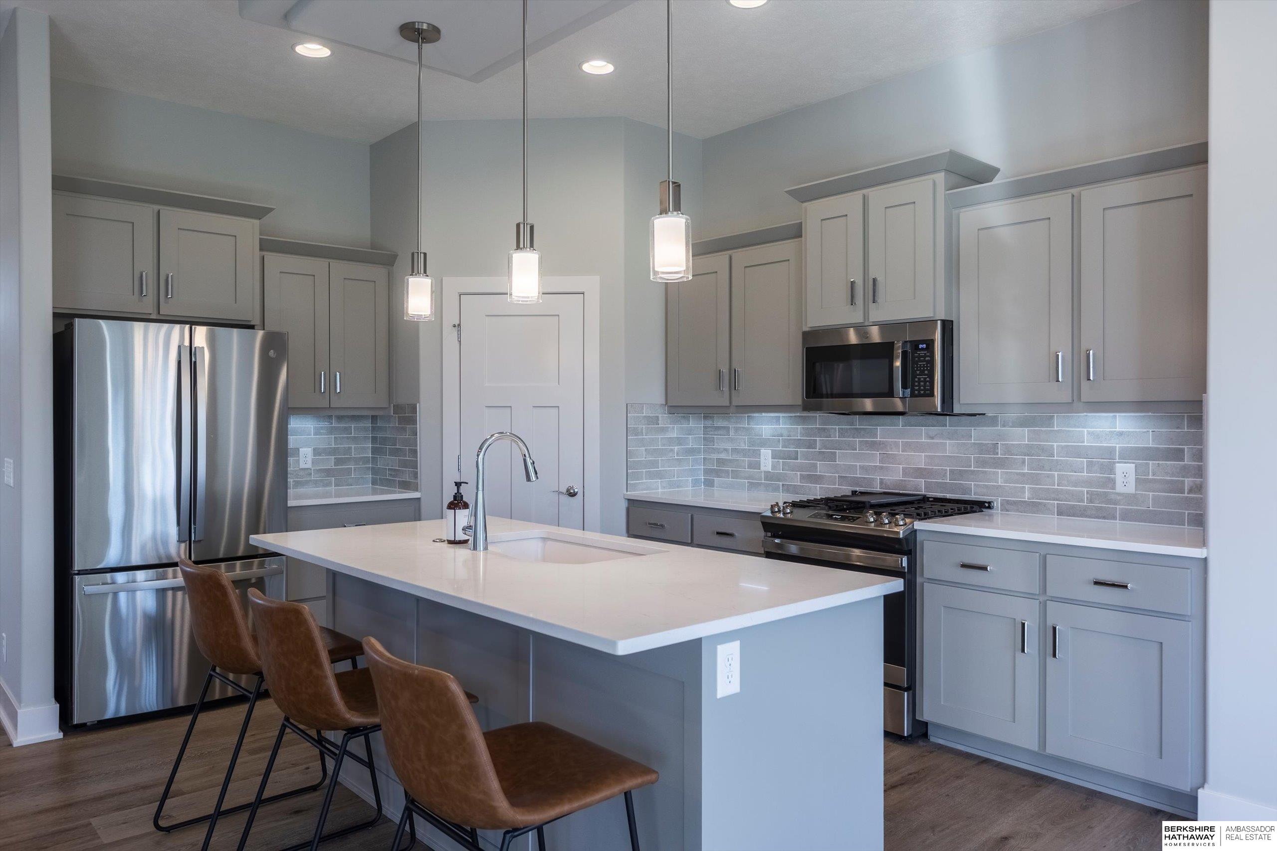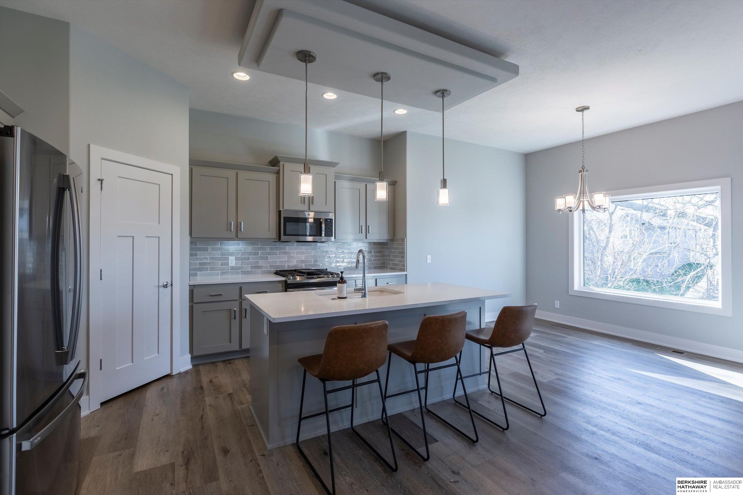 Step into modern comfort in this stunning, like new construction ranch home in Bennington Park West! Boasting 3 spacious bedrooms, 3 bathrooms, and over 2,600 total finished sq ft, this home offers both functionality and elevated design. The open-concept main level is highlighted by luxury vinyl plank flooring, 9+ ceilings, a gas fireplace, and an entertainer's kitchen complete with pantry, quartz counters, and a large island. On the main level, you'll find a serene primary suite with double sinks, walk-in closet, and a laundry room for optimal functionality. The finished lower level adds extra living space perfect for a rec room or guest area. Enjoy your evening peacefully on the covered deck backing to trees. With a heated 3-car attached garage, smart layout furnished with appliances, and convenient location near schools and parks, this home is a must-see. Schedule your showing today! Agent is related to the seller.