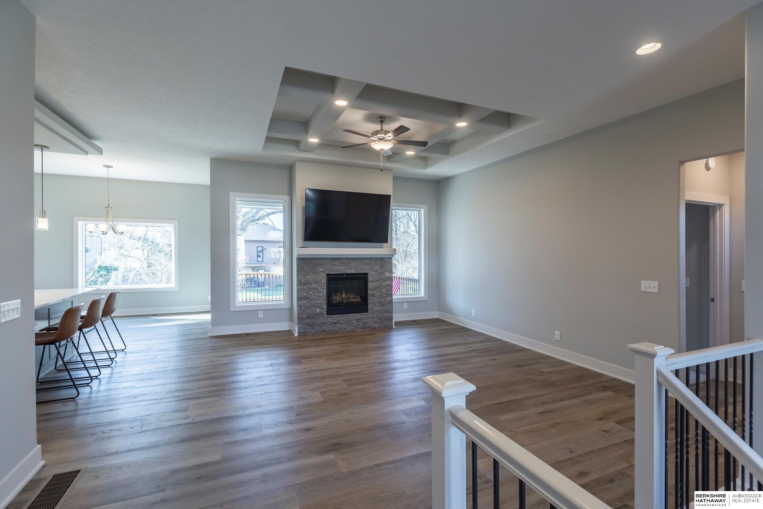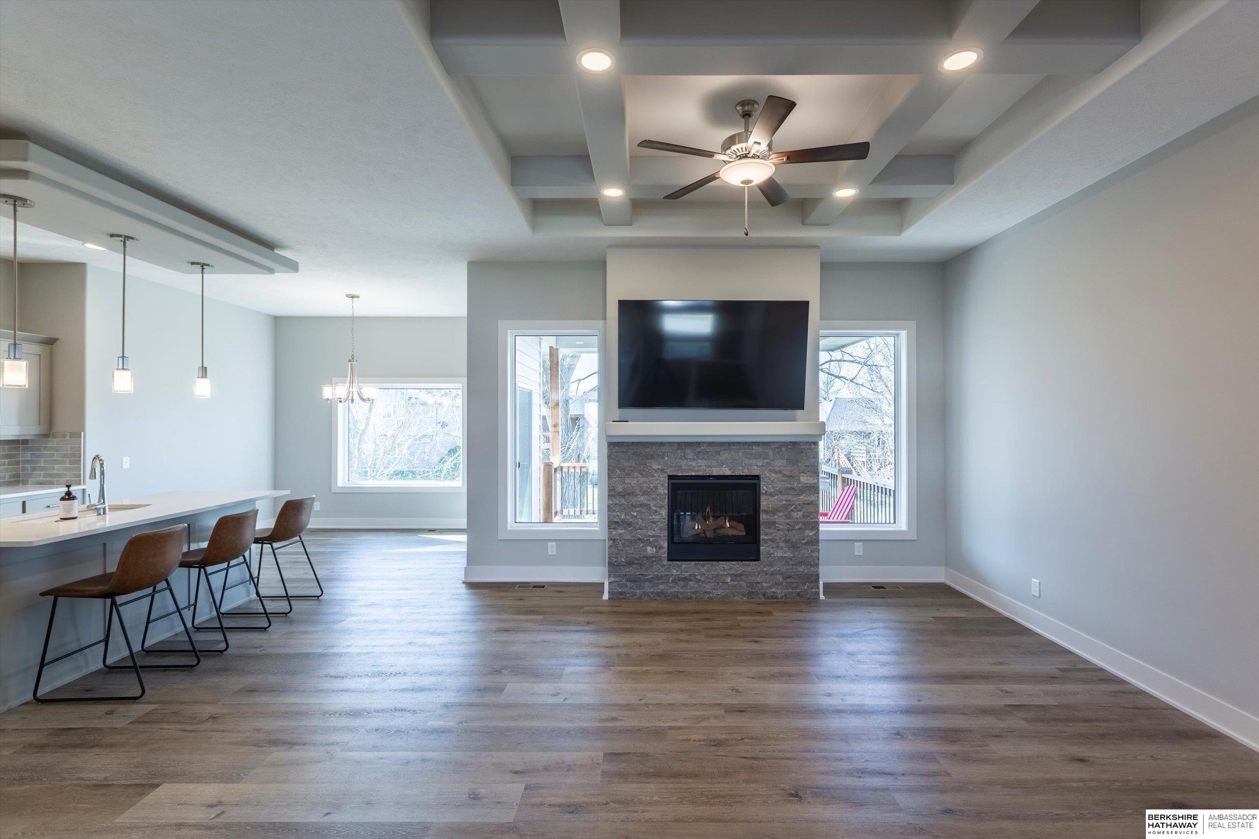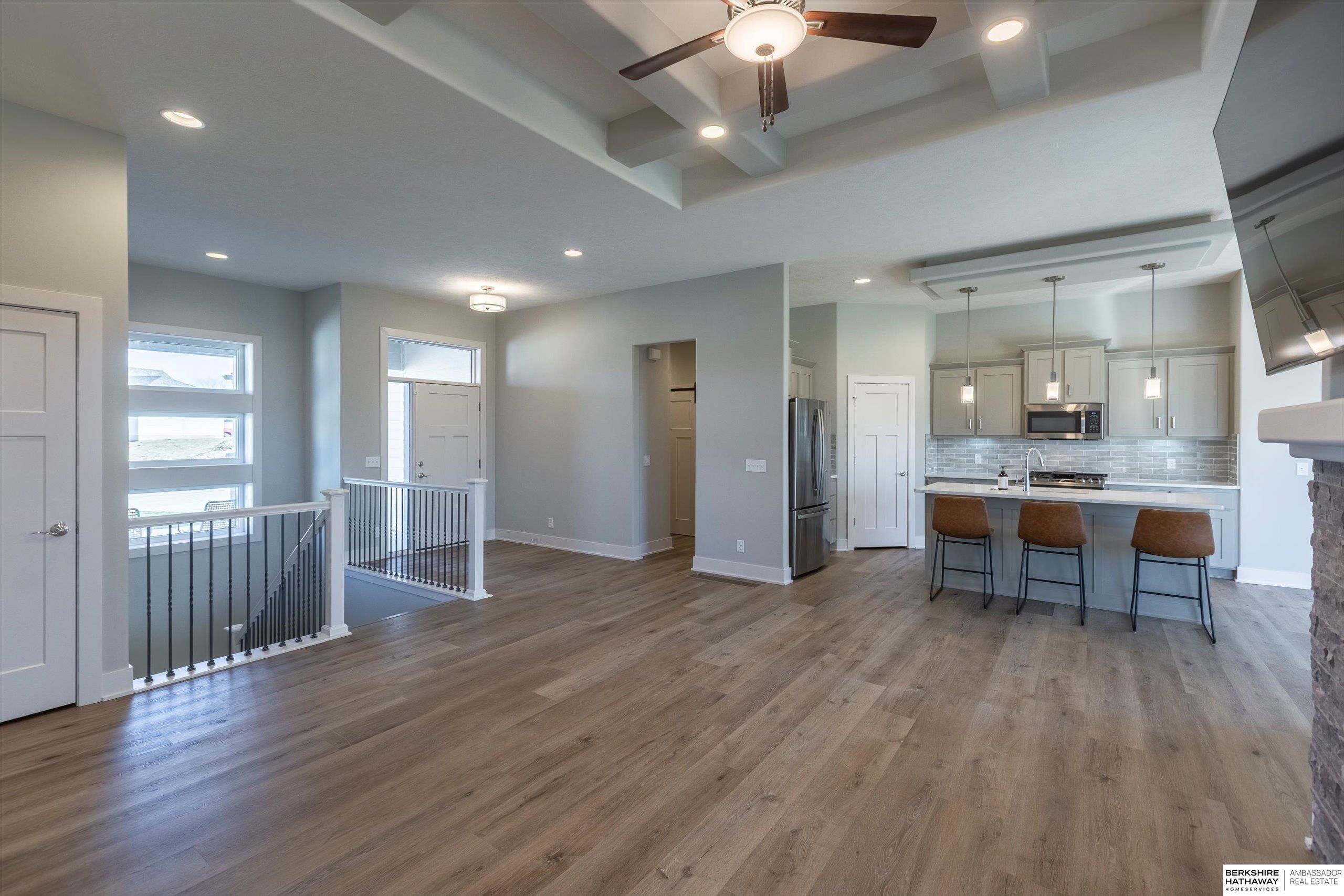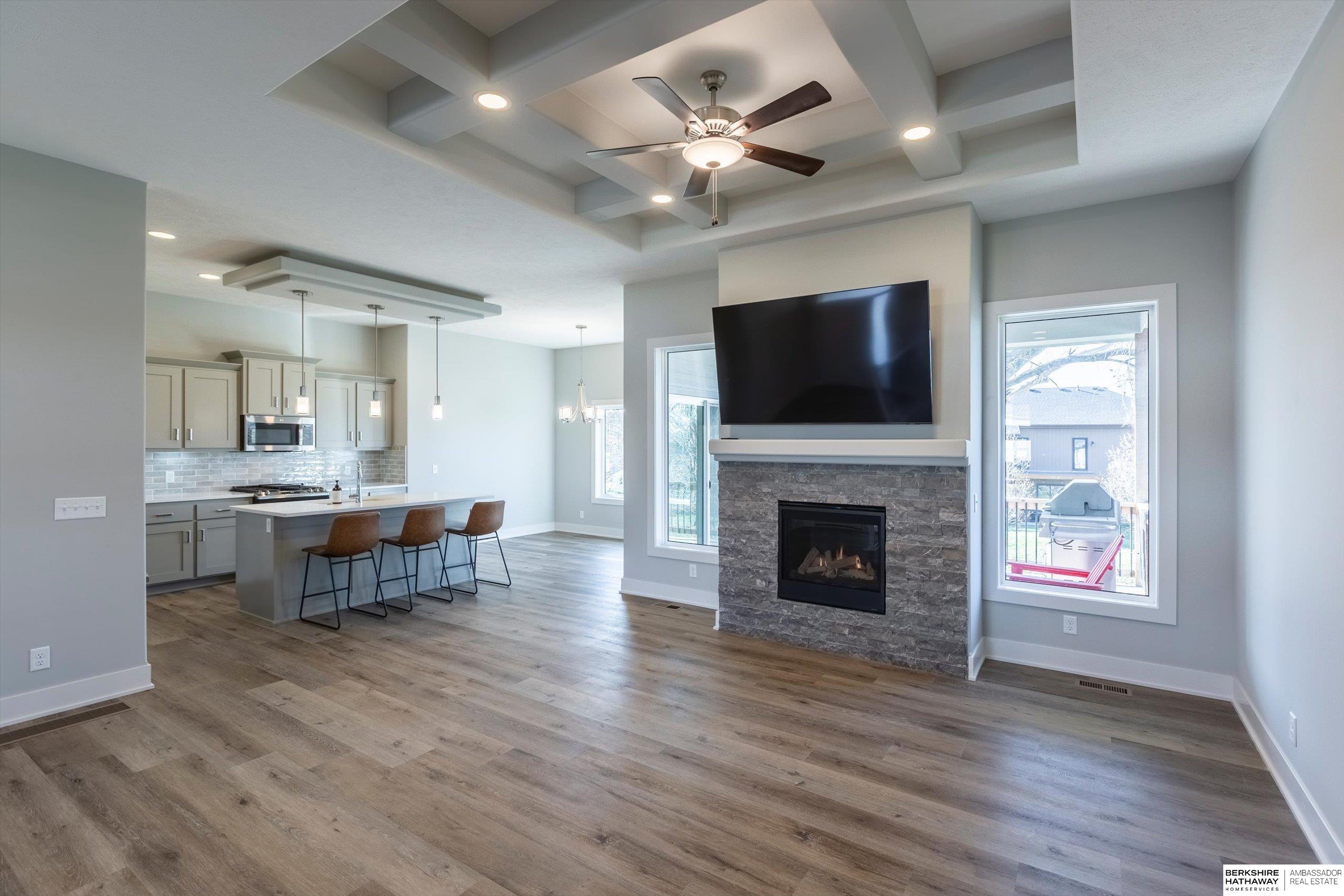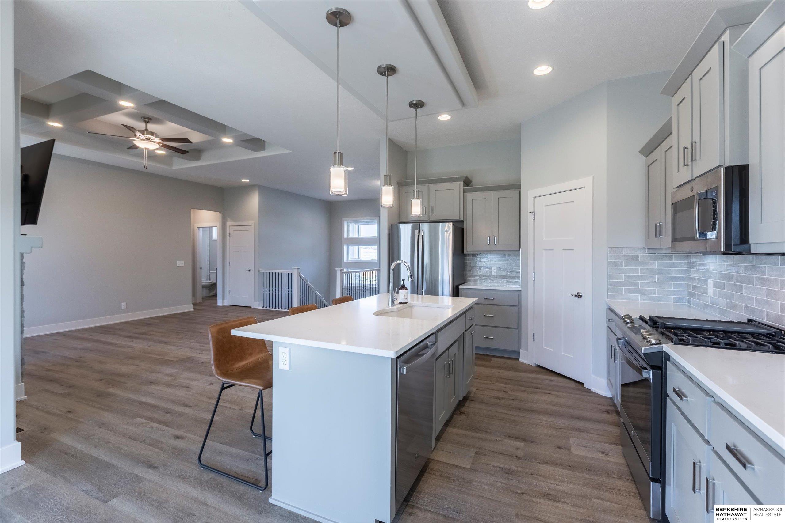 Step into modern comfort in this stunning, like new construction ranch home in Bennington Park West! Boasting 3 spacious bedrooms, 3 bathrooms, and over 2,600 total finished sq ft, this home offers both functionality and elevated design. The open-concept main level is highlighted by luxury vinyl plank flooring, 9+ ceilings, a gas fireplace, and an entertainer's kitchen complete with pantry, quartz counters, and a large island. On the main level, you'll find a serene primary suite with double sinks, walk-in closet, and a laundry room for optimal functionality. The finished lower level adds extra living space perfect for a rec room or guest area. Enjoy your evening peacefully on the covered deck backing to trees. With a heated 3-car attached garage, smart layout furnished with appliances, and convenient location near schools and parks, this home is a must-see. Schedule your showing today! Agent is related to the seller.