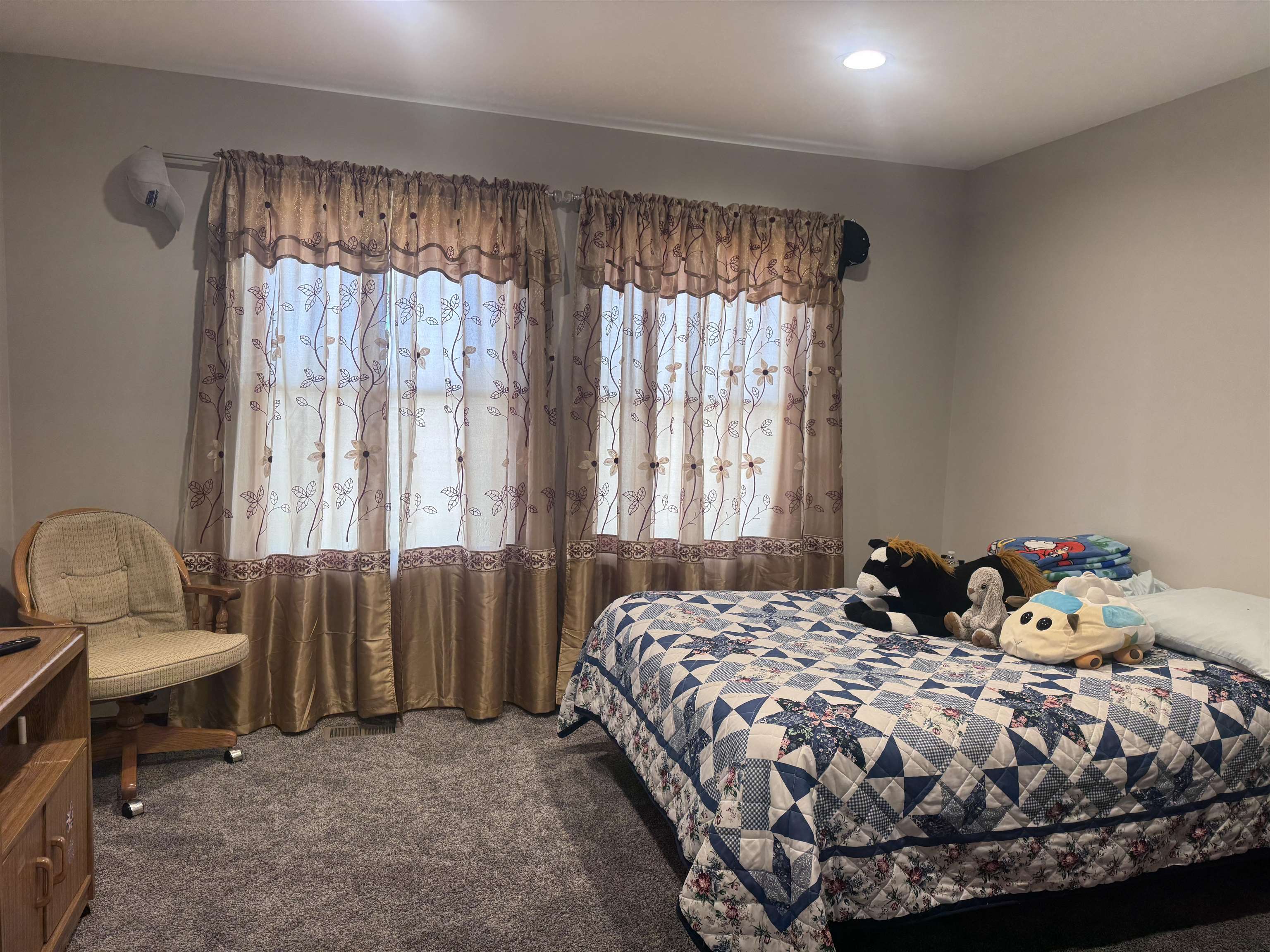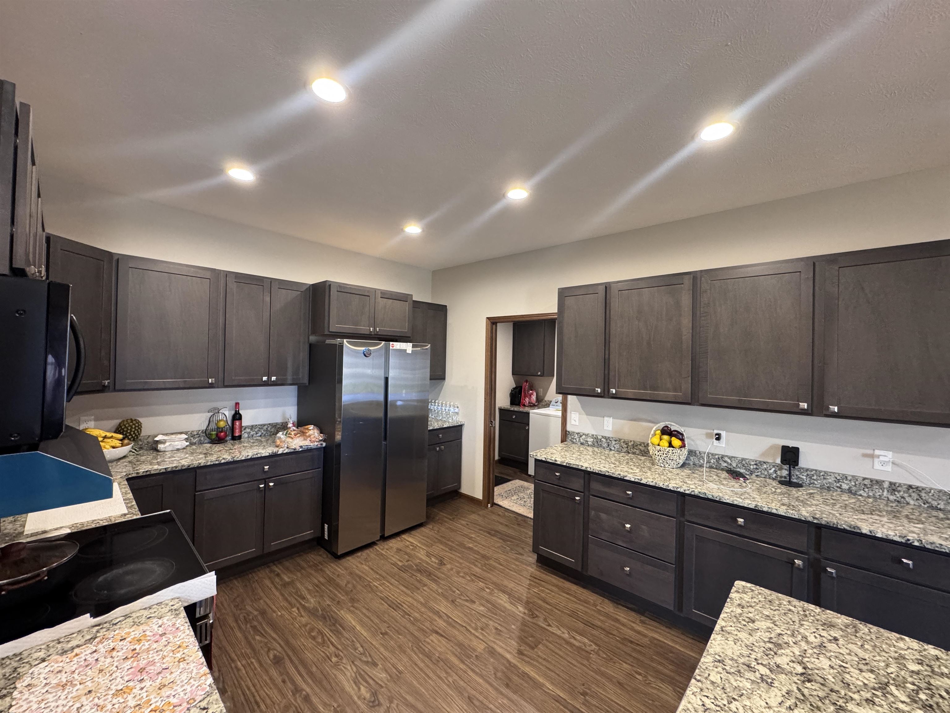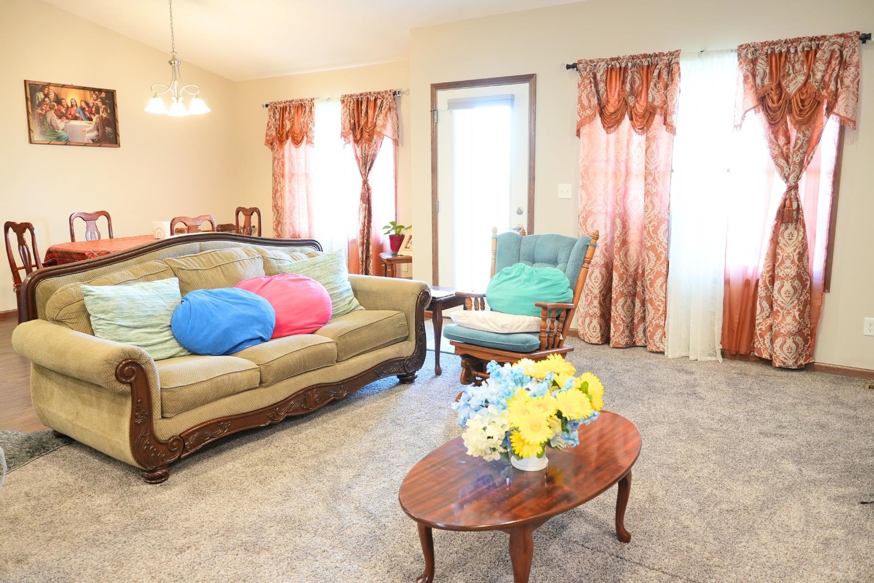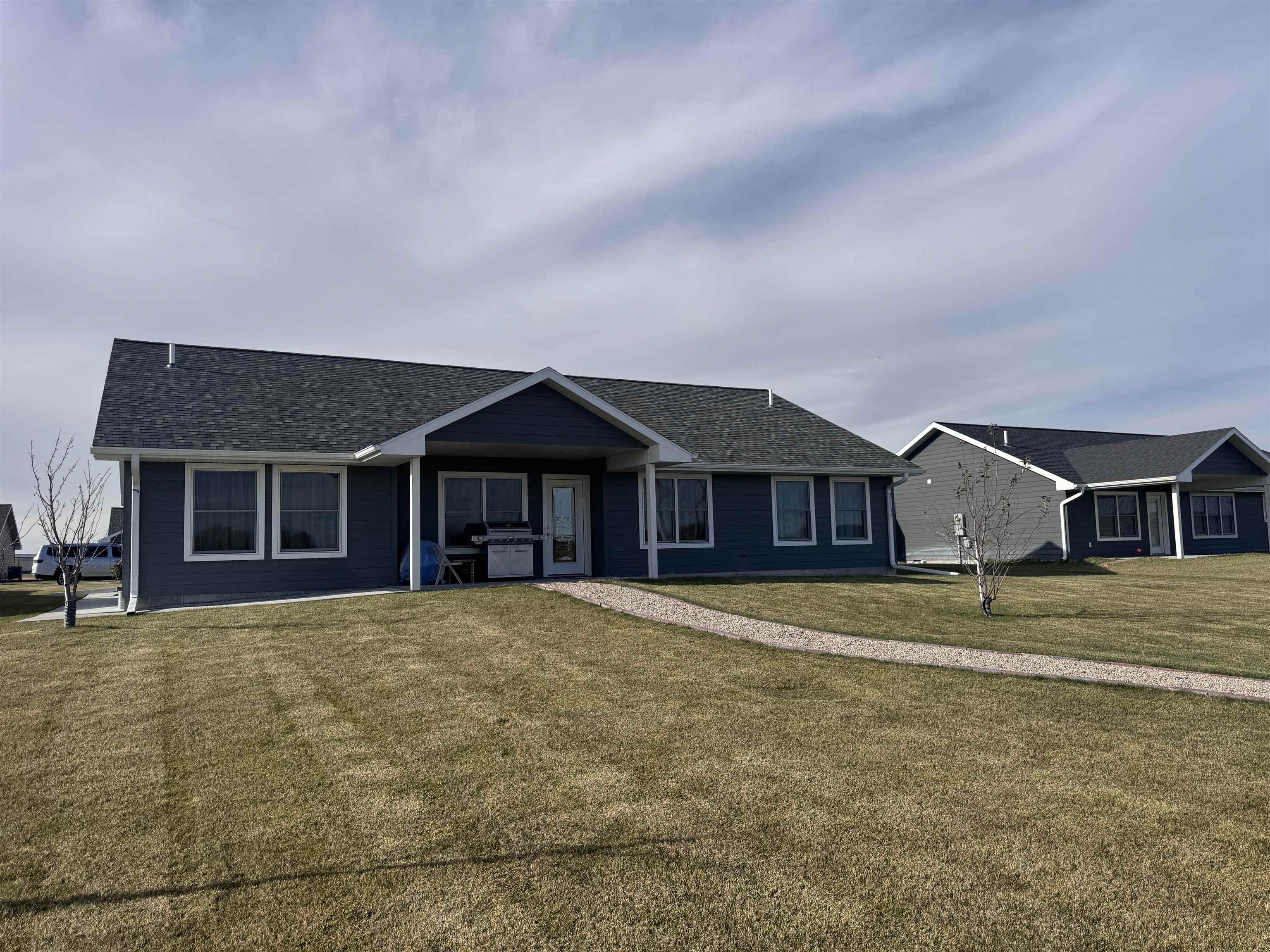 This well-designed 3-bedroom, 2-bathroom home offers an open layout with vaulted ceilings, PELLA windows, and a bright, welcoming atmosphere. The primary suite includes a walk-in closet and double-sink vanity, while the kitchen features granite countertops, stainless steel appliances that stay, and modern finishes throughout. Enjoy year-round comfort with 2x6 exterior walls, a high-efficiency heat pump/central air, and quality flooring throughout. Recessed LED lighting adds a clean, contemporary touch to every room. Outside, you'll love the established landscaping, perimeter sidewalks, and a walkway to the back flowerbeds—perfectly paired with a covered patio and automatic sprinkler system. The oversized 2-car garage provides extra space for storage or hobbies. Schedule your tour today to see everything this home has to offer!