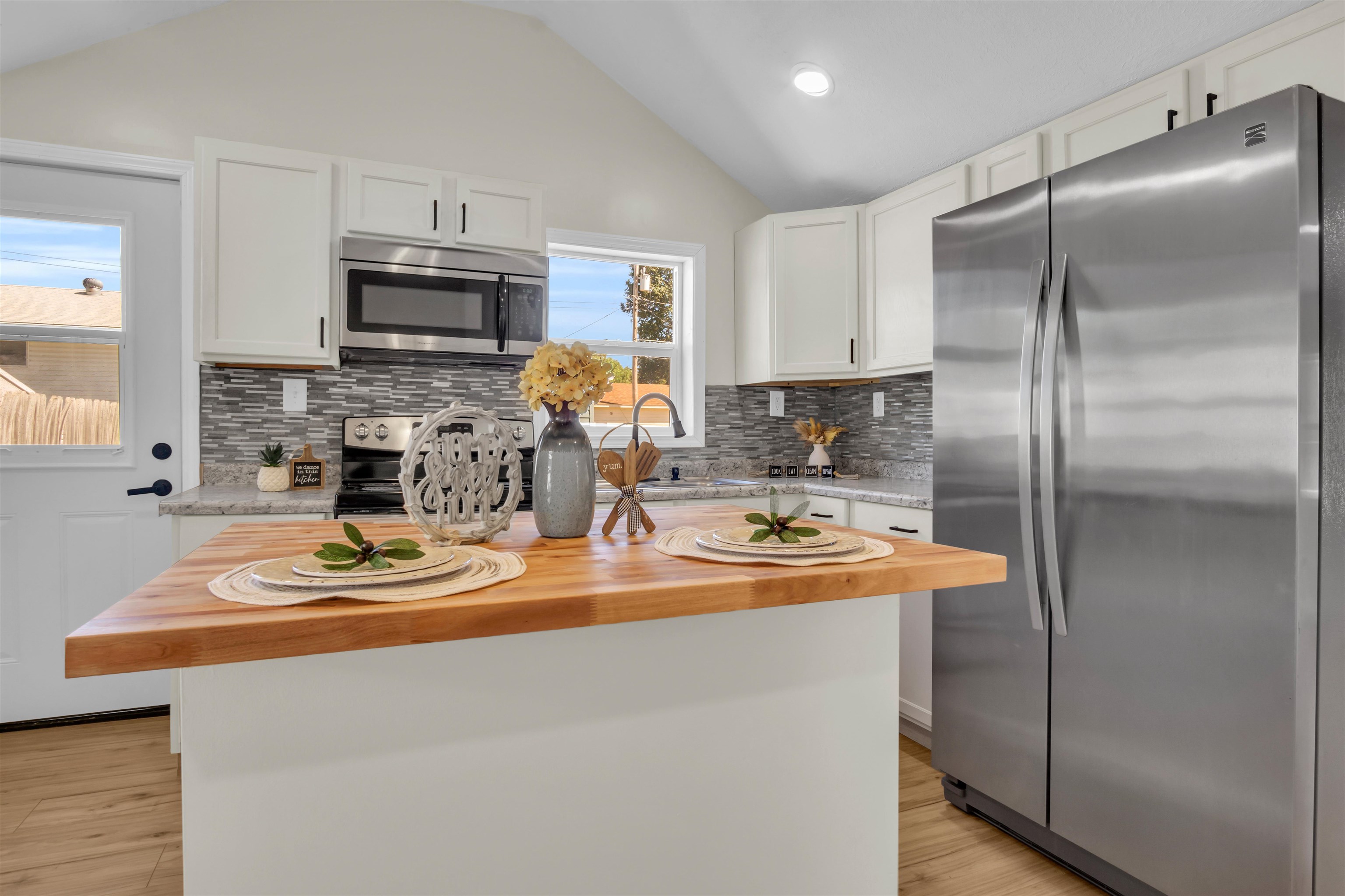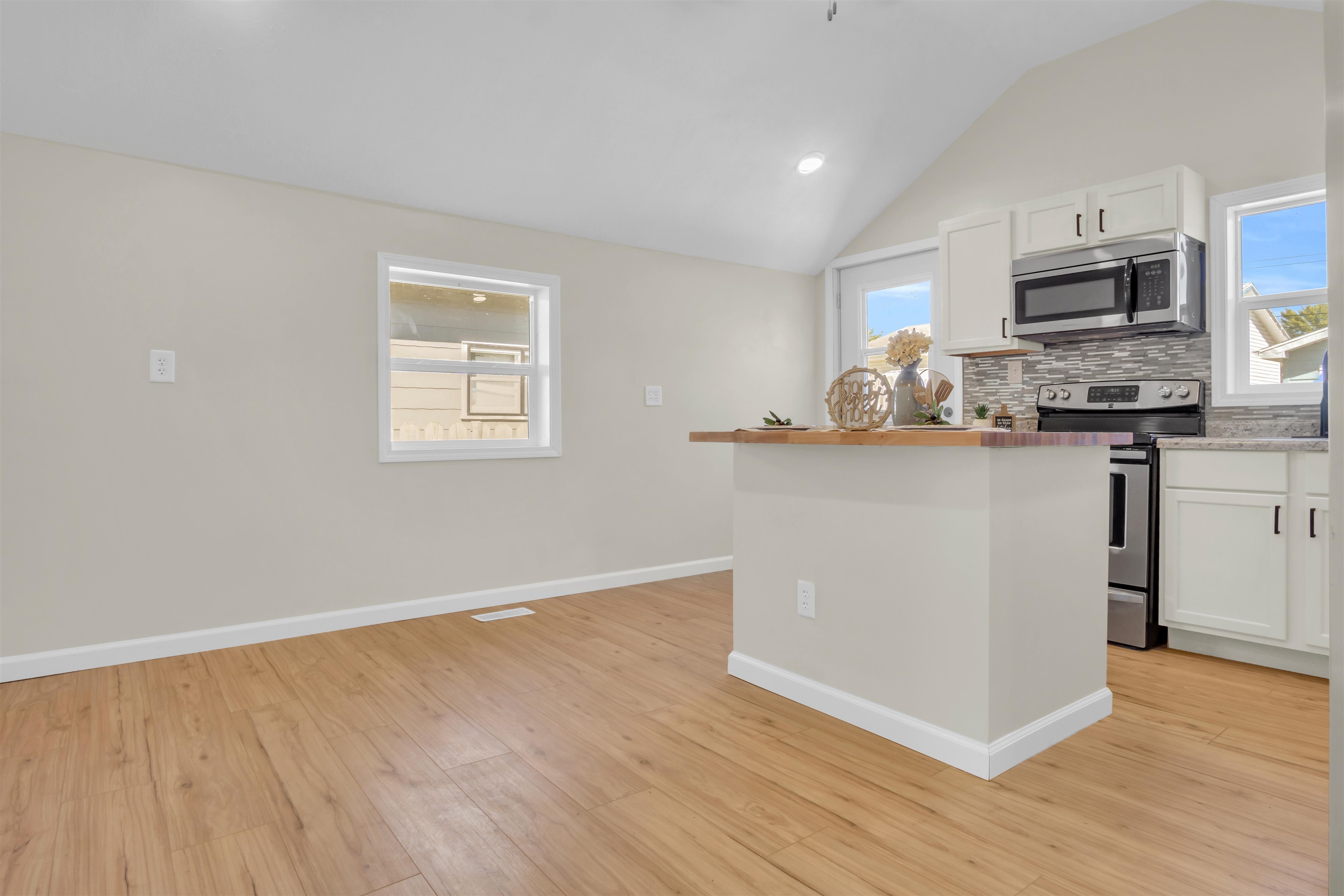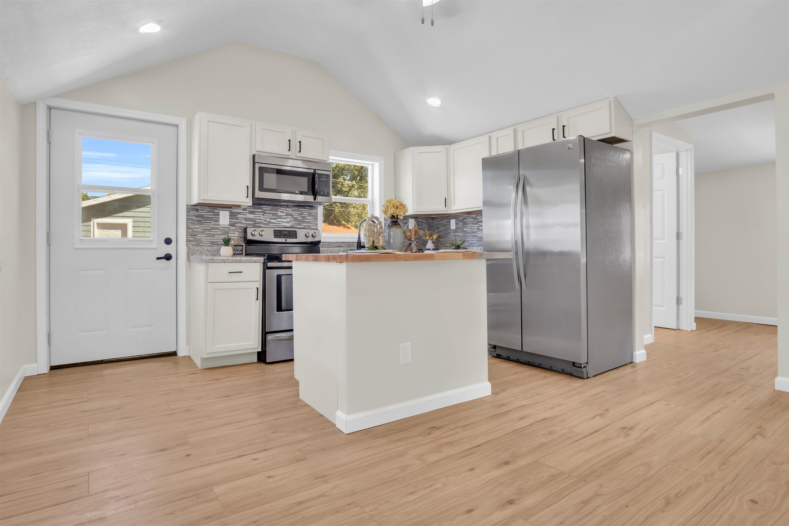 You will be captivated by the front porch and door color of this beautifully renovated home, which has been meticulously updated to ensure it is move-in ready for prospective buyers. This home boasts two bedrooms and two bathrooms, along with a brand new detached two-car garage. A spacious laundry and pantry room complements a stunning kitchen featuring ample counter space. The interior is adorned with all-new luxury vinyl plank (LVP) flooring, modern light fixtures, and updated plumbing. The exterior has also undergone significant enhancements, including new siding, gutters, downspouts, select windows, and a newly paved sidewalk, among other improvements. Schedule a tour of this exquisite property..