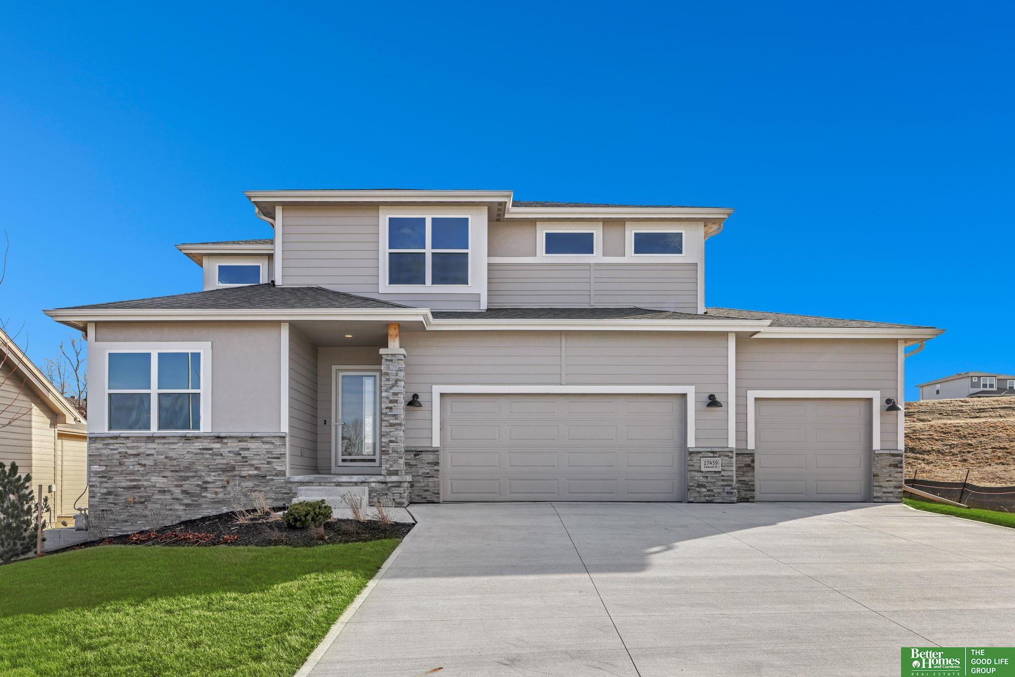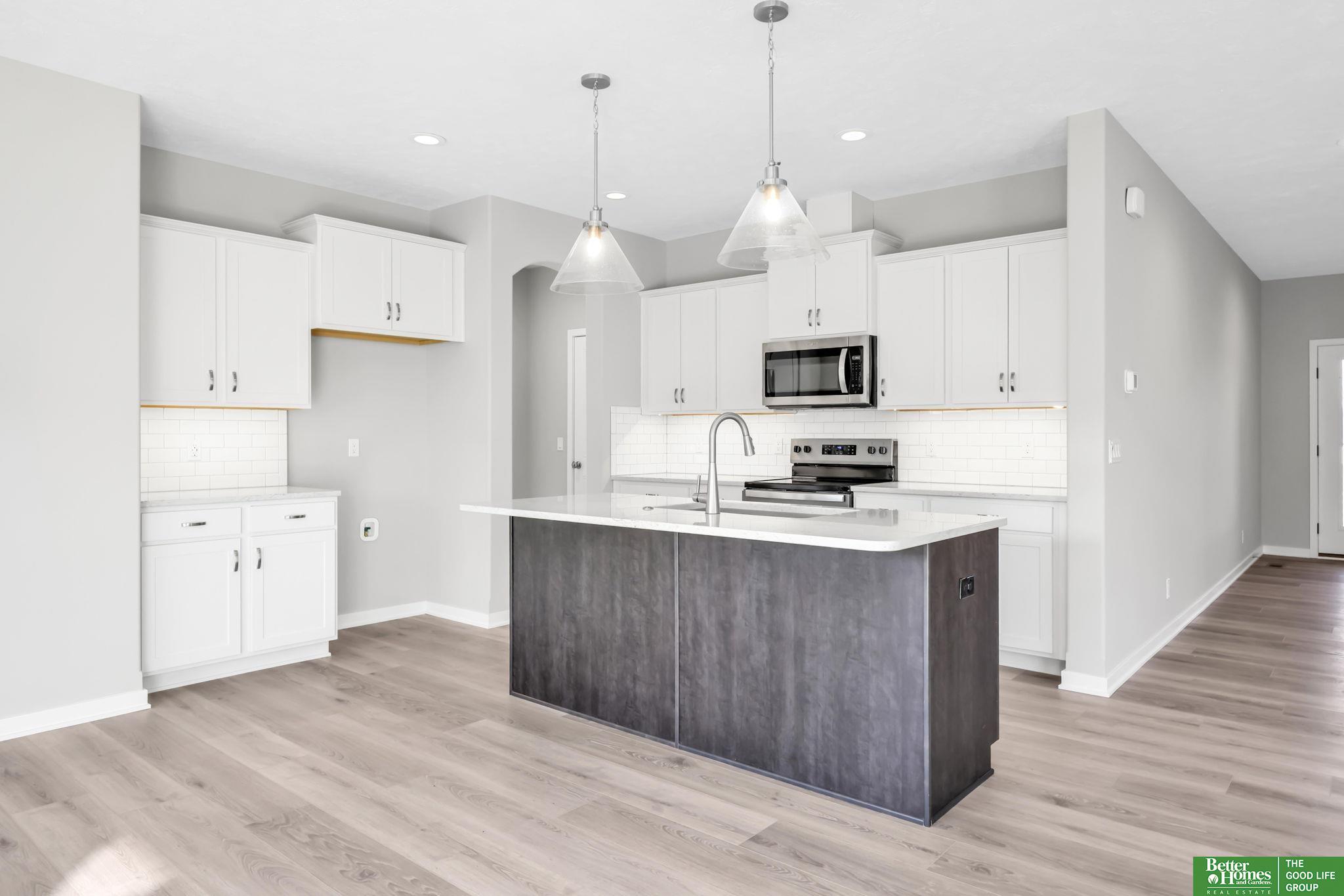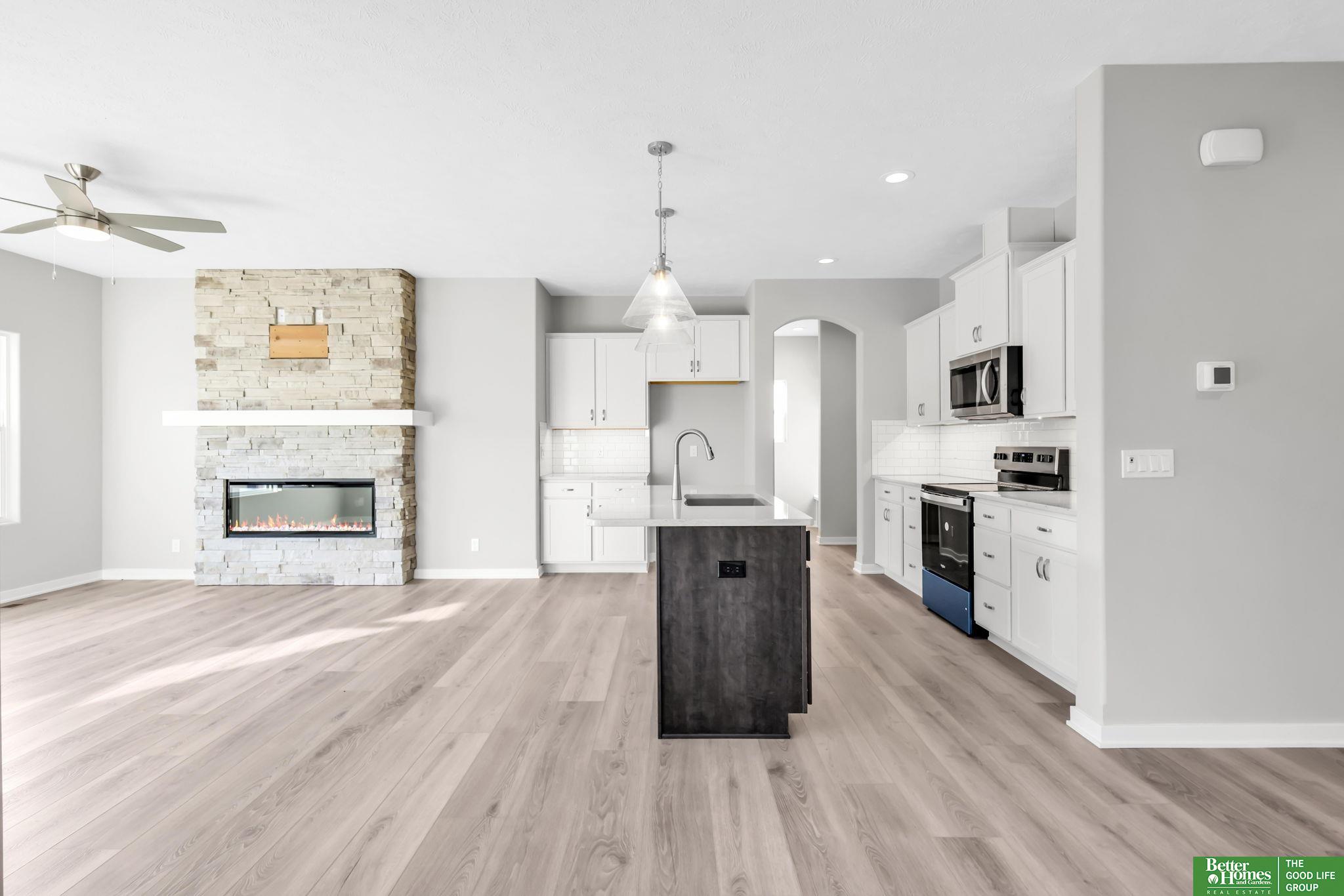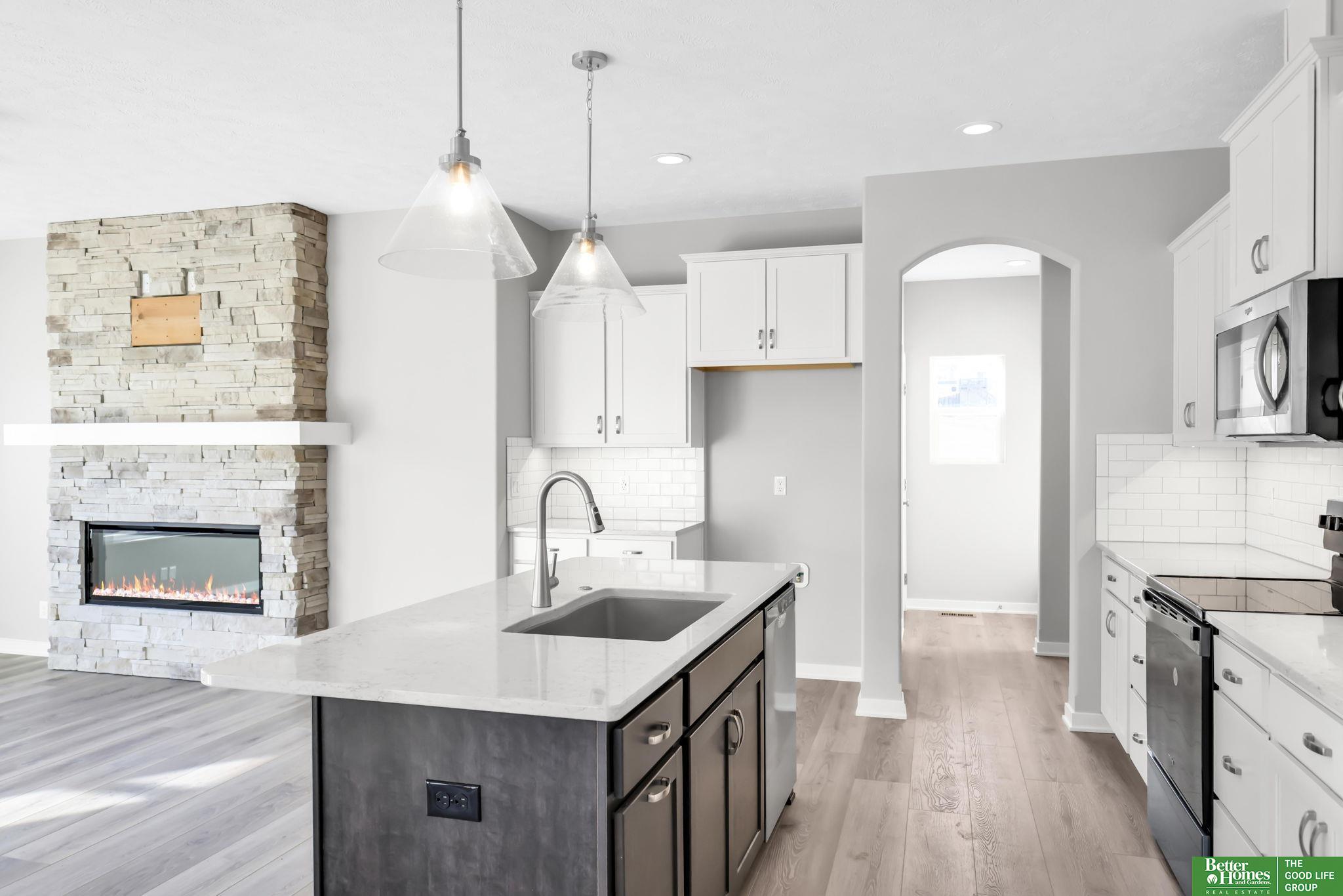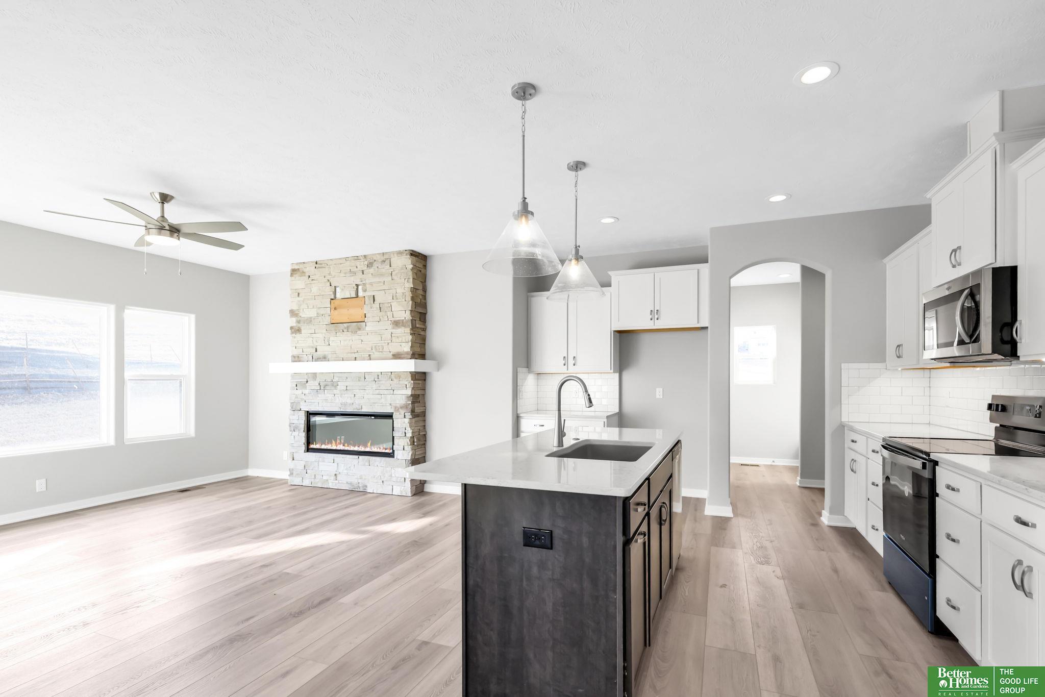 Pearl Modern Prairie by Richland Homes in the Elkhorn School District with the landscaping package already installed and move in ready. This 3 bedroom, 3 bathroom, 3 car garage home offers clean design and a functional layout built for everyday living. The kitchen features quartz countertops, stainless steel appliances, a large center island with seating, under cabinet lighting, and a microwave vented to the exterior. The stone to ceiling electric fireplace anchors the main living space, while premium LVP flooring, ceiling fans, a granite composite sink, upgraded faucets, and a Honeywell smart thermostat add comfort and quality throughout. Outside, you will find a full sprinkler system, a gas line on the patio for grilling, a kitchen gas rough in, and a built in holiday lighting package. The completed landscaping saves you time and upfront expense. Located in the sought after Elkhorn School District, this home delivers modern finishes, smart upgrades, and true move in convenience.
