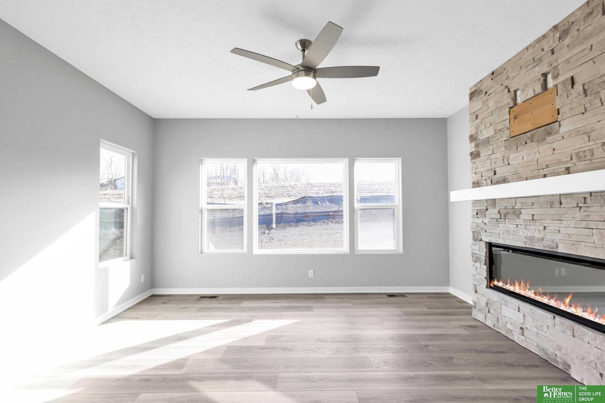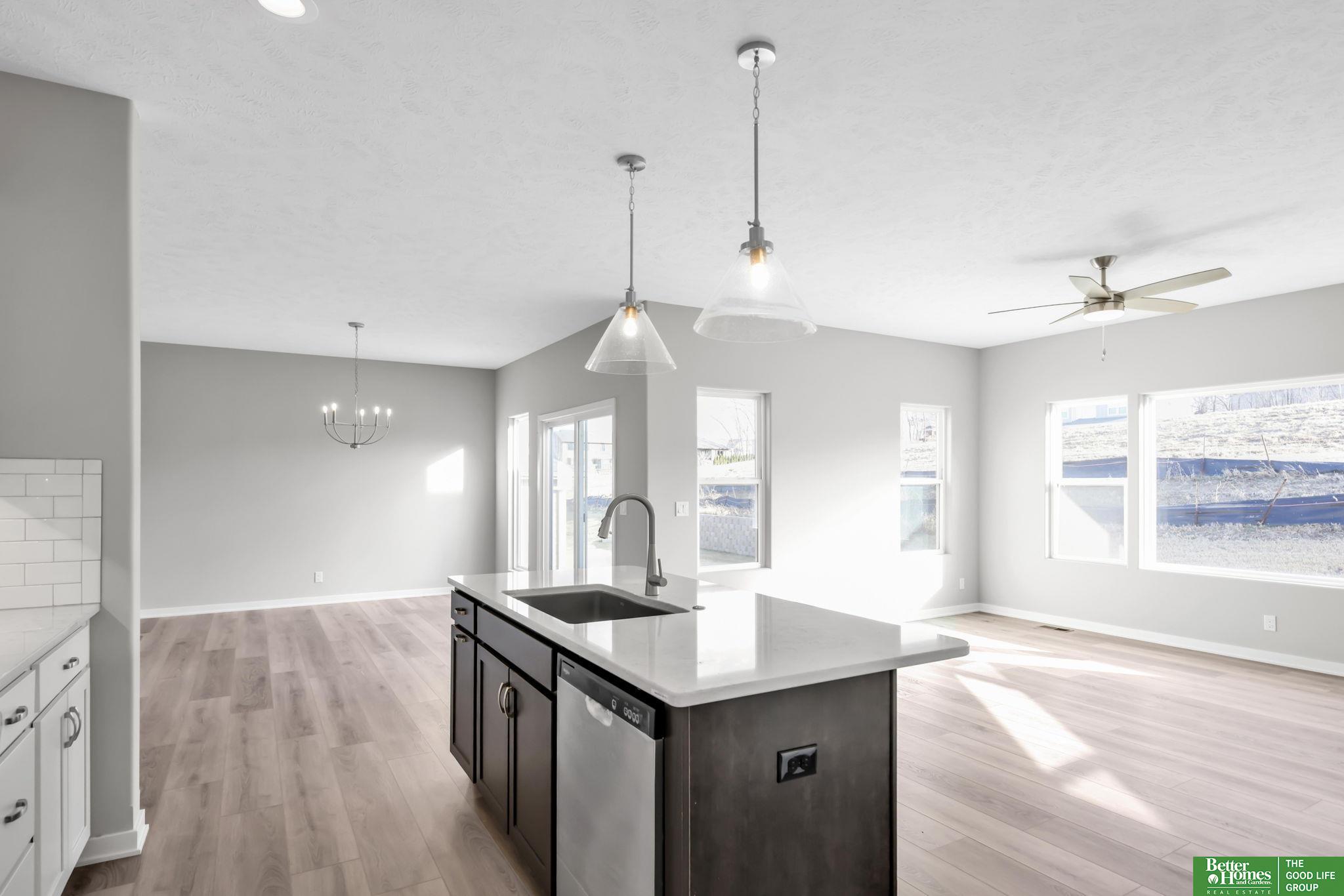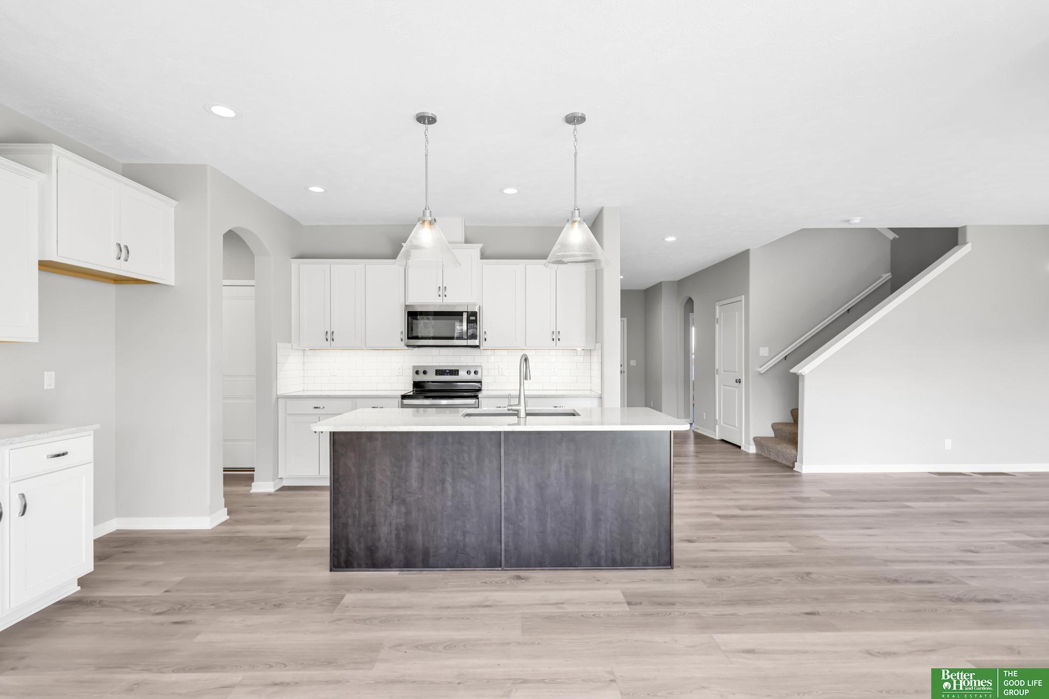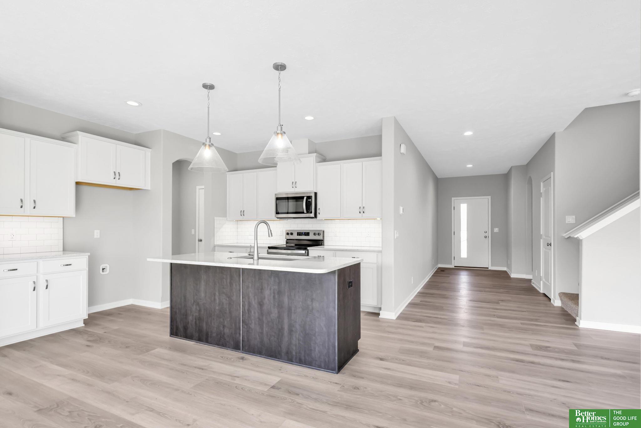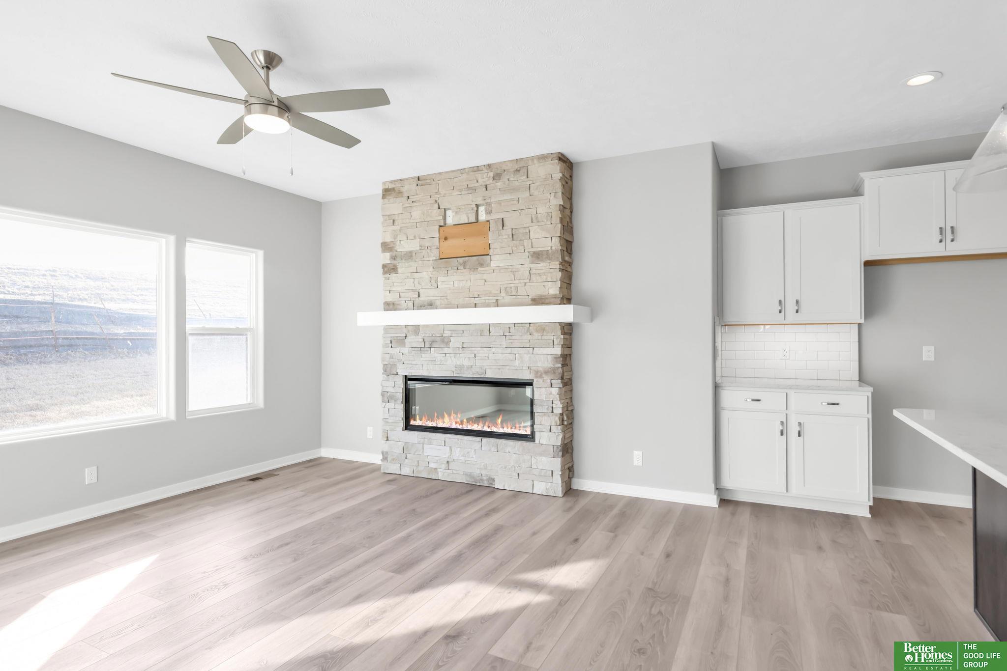 Pearl Modern Prairie by Richland Homes in the Elkhorn School District with the landscaping package already installed and move in ready. This 3 bedroom, 3 bathroom, 3 car garage home offers clean design and a functional layout built for everyday living. The kitchen features quartz countertops, stainless steel appliances, a large center island with seating, under cabinet lighting, and a microwave vented to the exterior. The stone to ceiling electric fireplace anchors the main living space, while premium LVP flooring, ceiling fans, a granite composite sink, upgraded faucets, and a Honeywell smart thermostat add comfort and quality throughout. Outside, you will find a full sprinkler system, a gas line on the patio for grilling, a kitchen gas rough in, and a built in holiday lighting package. The completed landscaping saves you time and upfront expense. Located in the sought after Elkhorn School District, this home delivers modern finishes, smart upgrades, and true move in convenience.