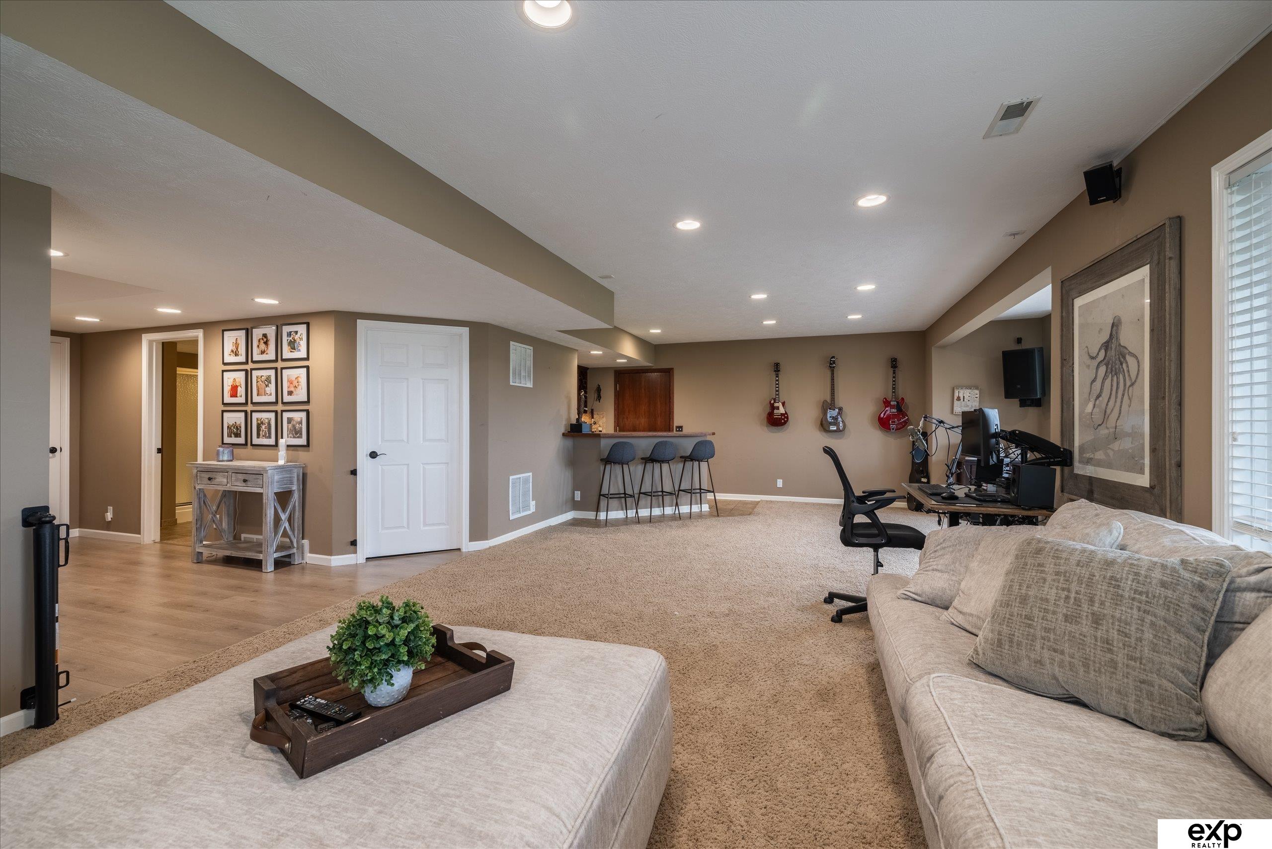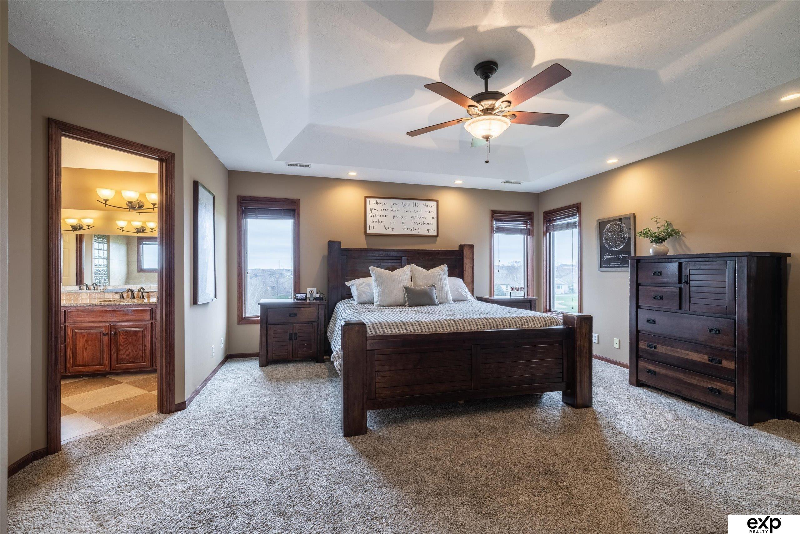 Gorgeous 2-story in Tiburon backing to Hole 6 of the golf course! This 4 bed, 4 bath, 4-car garage walkout sits on a premium lot with stunning panoramic views. Spacious kitchen features quartz counters, center island, pantry, SS appliances & bay window dining area. Open layout with formal dining & cozy family room with double-sided gas fireplace. Brand new carpet on main & 2nd floors plus fresh interior paint. Large primary suite with walk-in closet, double sinks, quartz counters, whirlpool tub & tiled shower. Finished walkout basement includes wet bar, 3/4 bath & golf cart garage. Composite deck, EV charger ready, generator plug, dual HVAC (2016), roof (2013), exterior paint (2022), water softener/RO system & 6-zone sprinklers. Located in Gretna schools with tons of storage! AMA.