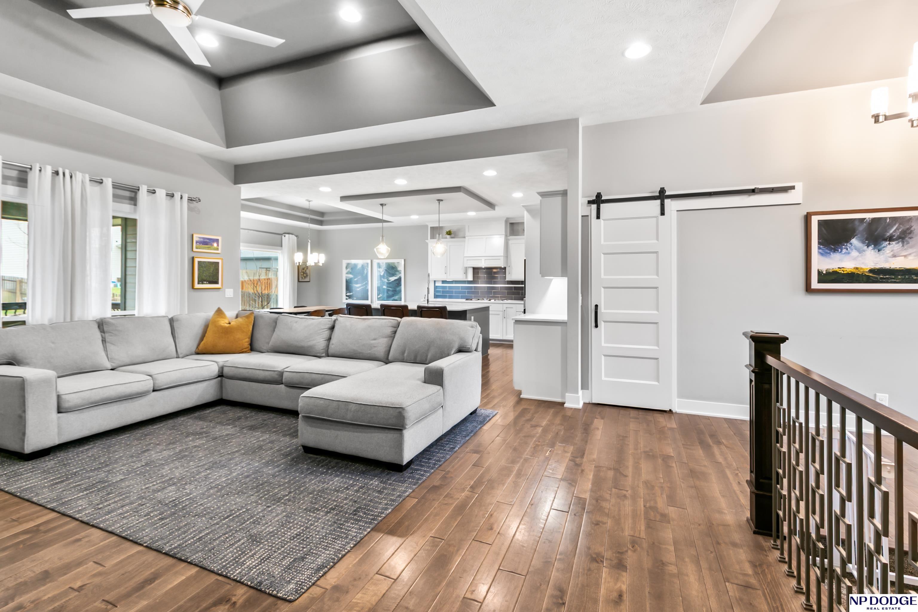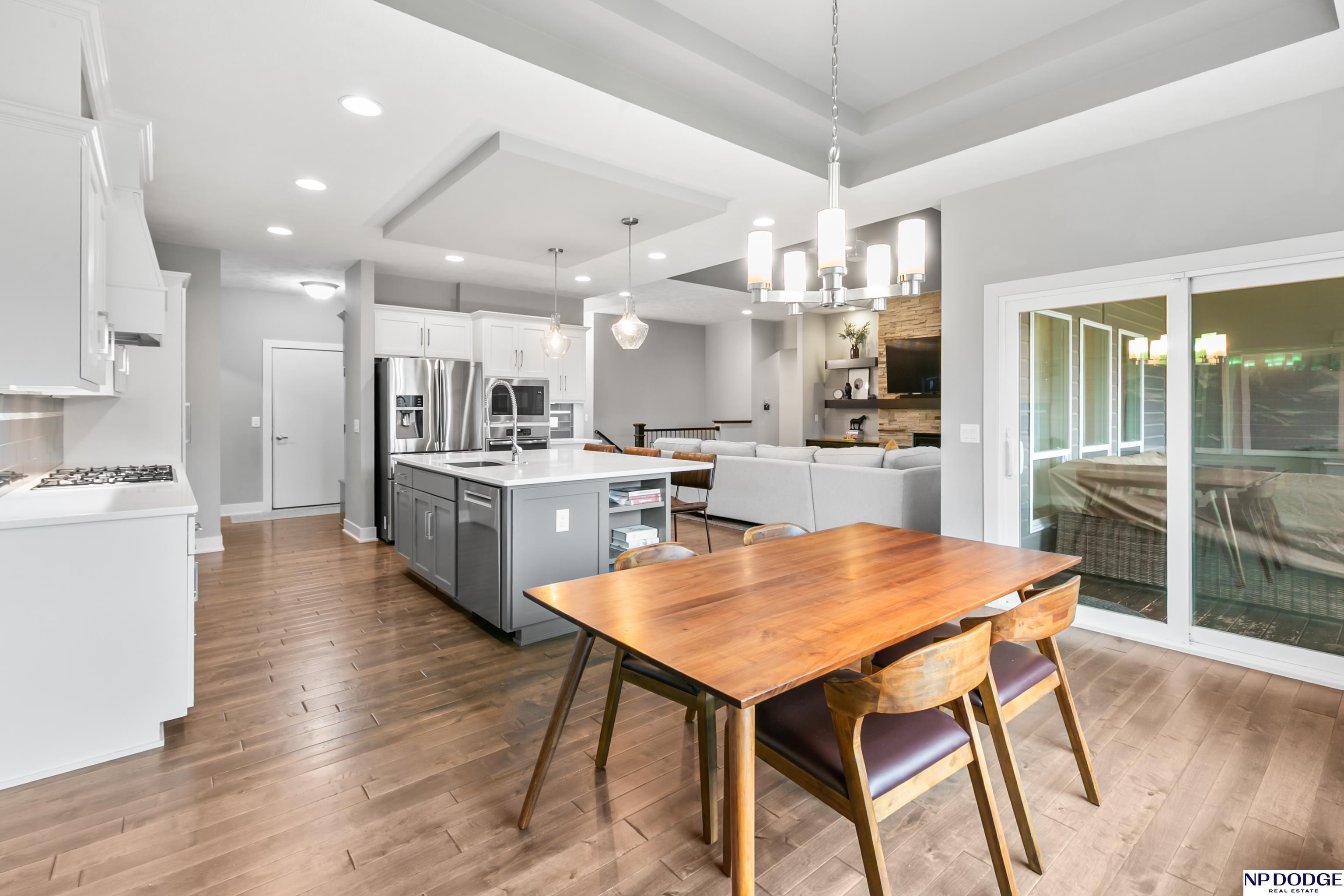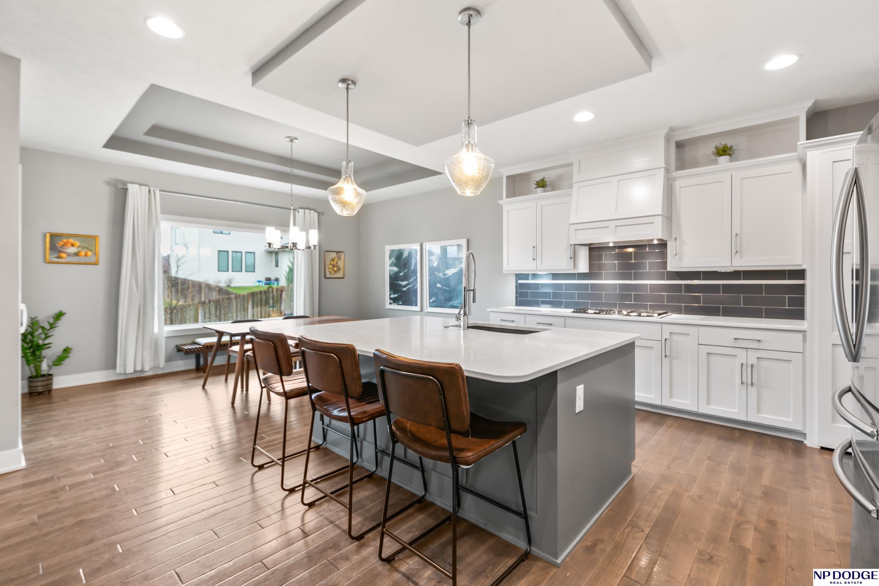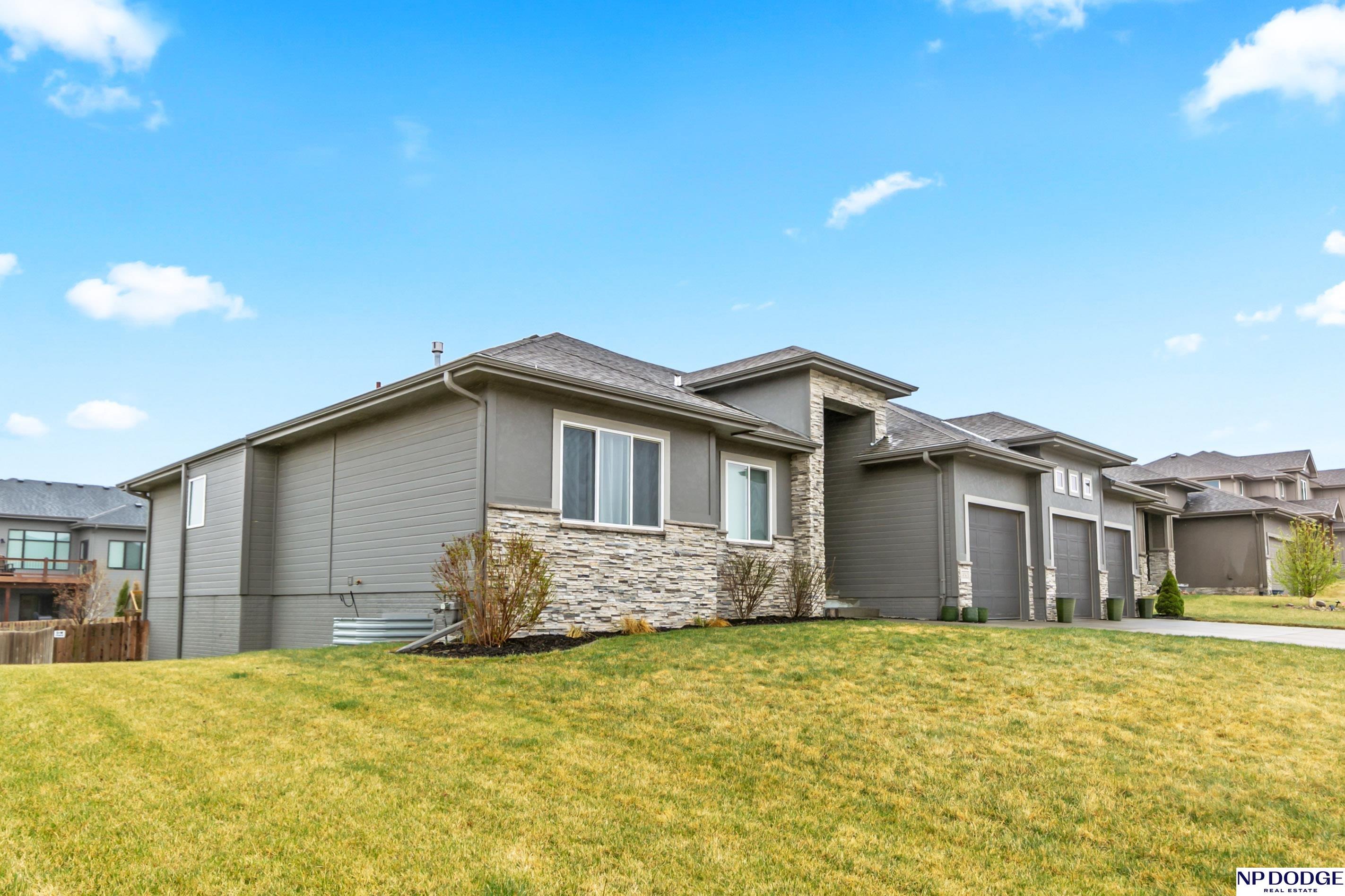Open house on Sunday 4/19 from 12-2 P.M. Stunning custom ranch, perfectly nestled on a private cul-de-sac. Featuring five bedrooms, three baths, and an impressive four car tandem garage. The garage is almost 1,200 feet of space with high ceilings and extra storage. Beautiful maple wood floors and soaring 12-foot ceilings create an open airy feel throughout the kitchen and family room-perfect for everyday living & entertaining. Kitchen with quartz countertops large island, gas cooktop SS appliances, & hidden walk in pantry. Living room with gas fireplace and custom built in book shelves. Walk-out basement with large wet bar expands your living space, leading to a covered patio below a covered deck above ideal for relaxing or hosting gatherings. The fully fenced backyard provides privacy and room to play. Located close to Blondo Ridge Park, with playground and four pickle ball courts. Move in ready. Elkhorn Schools, and storage galore.