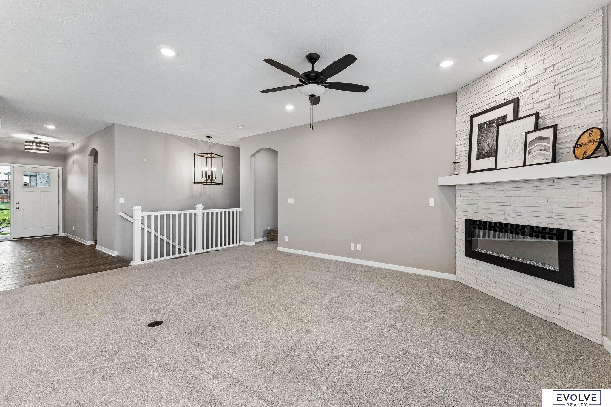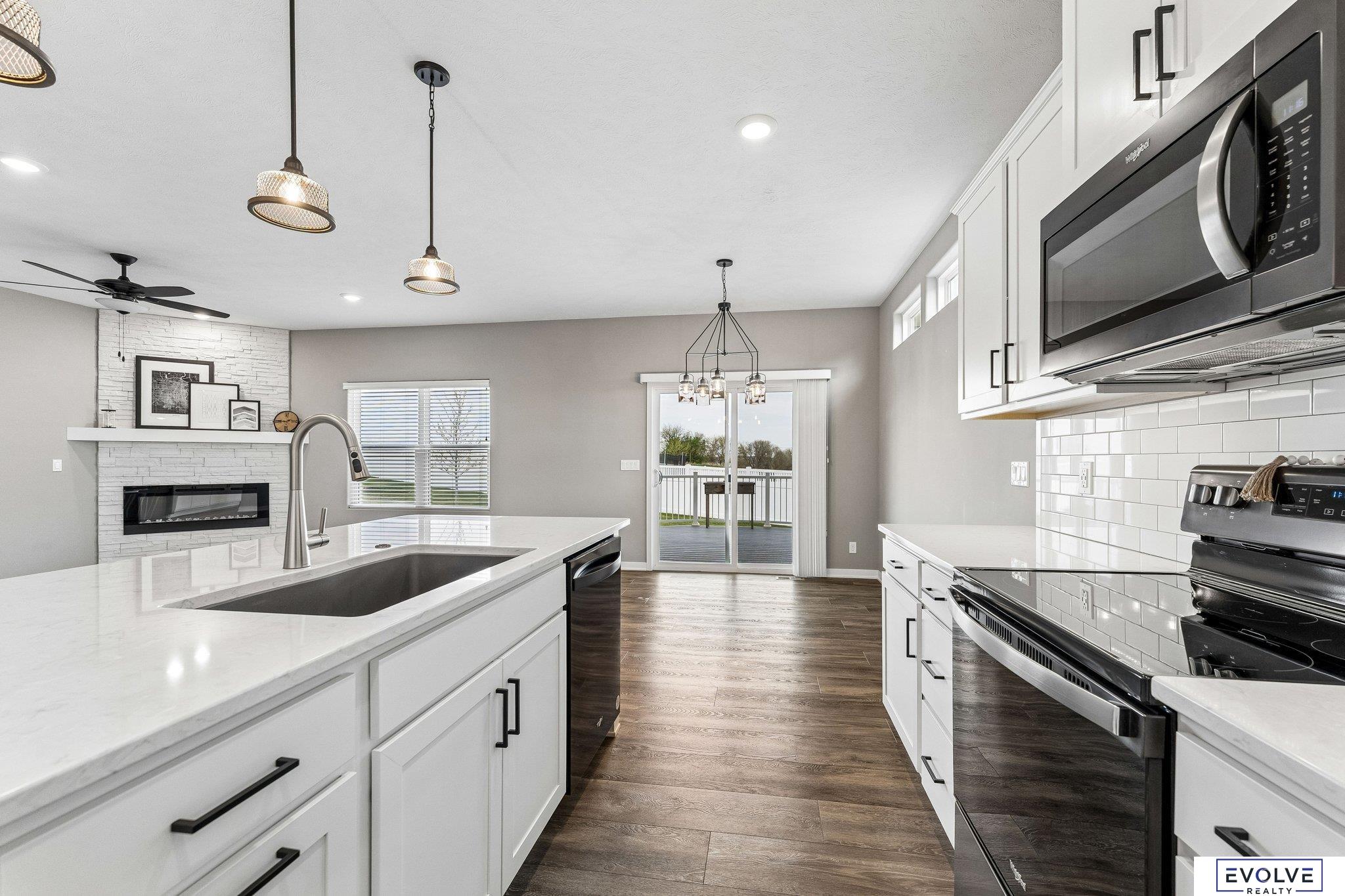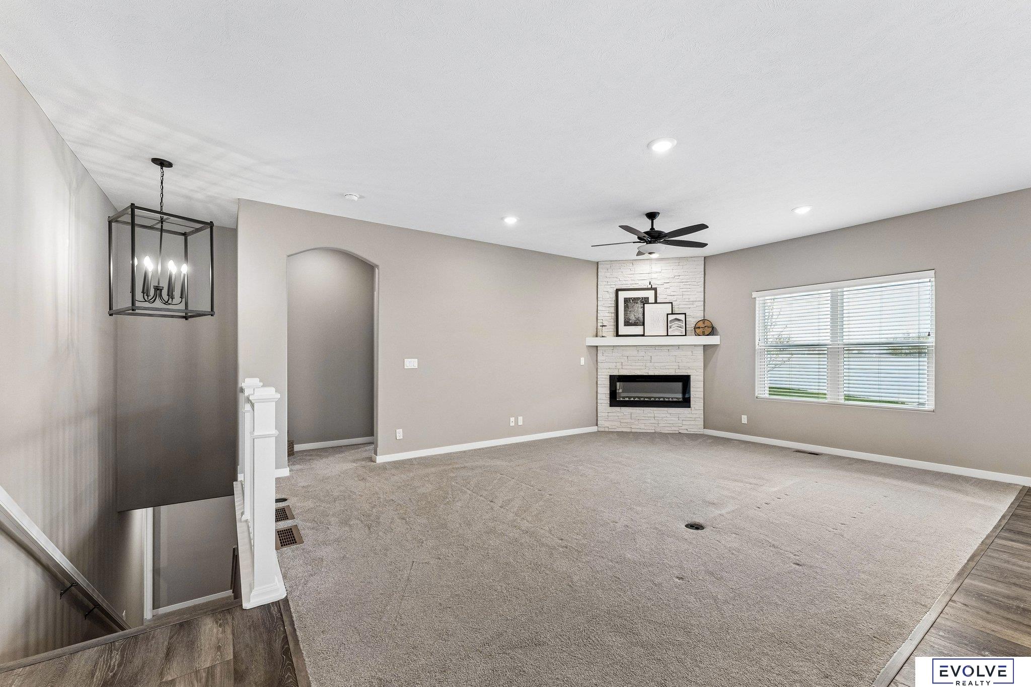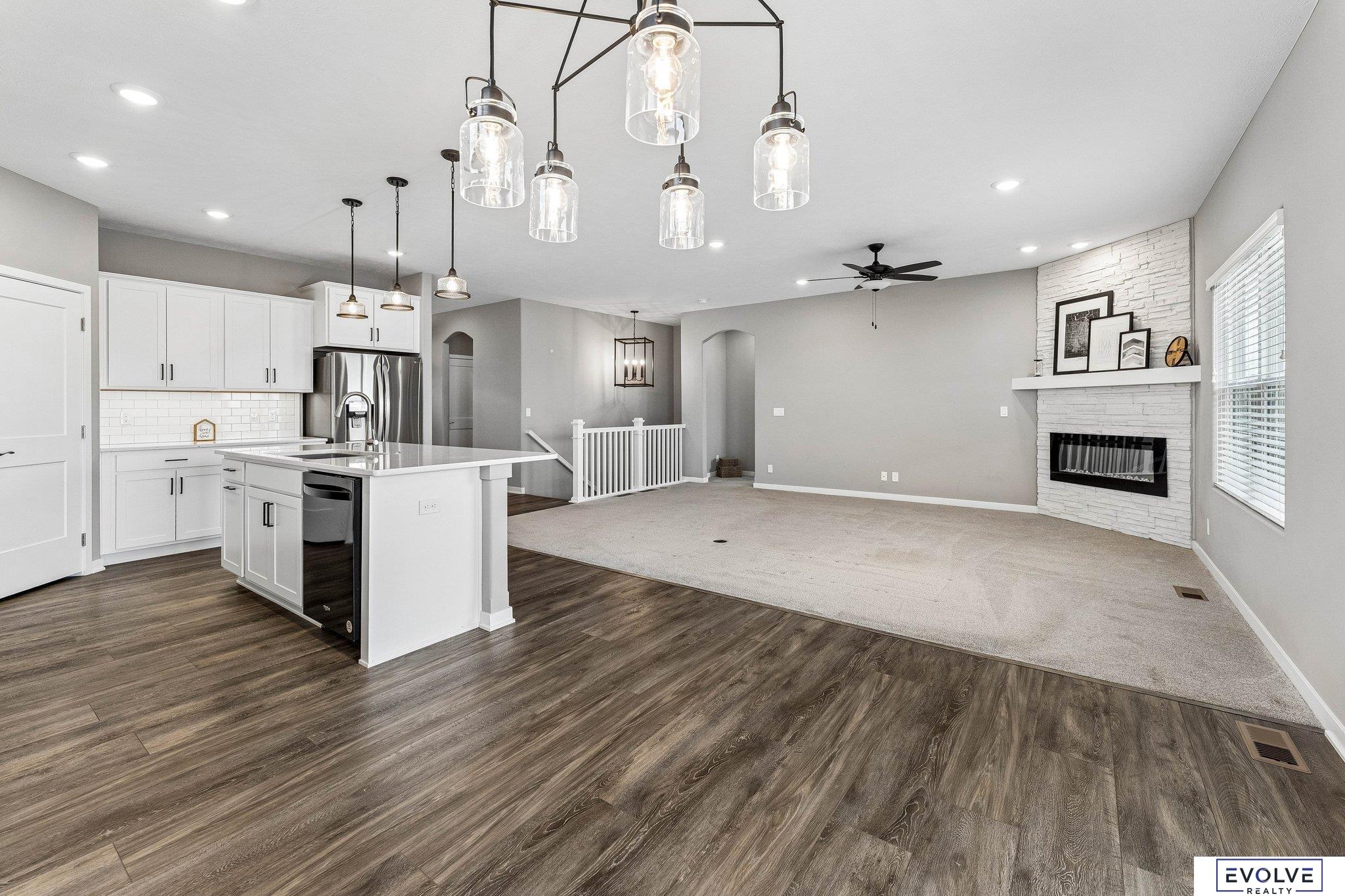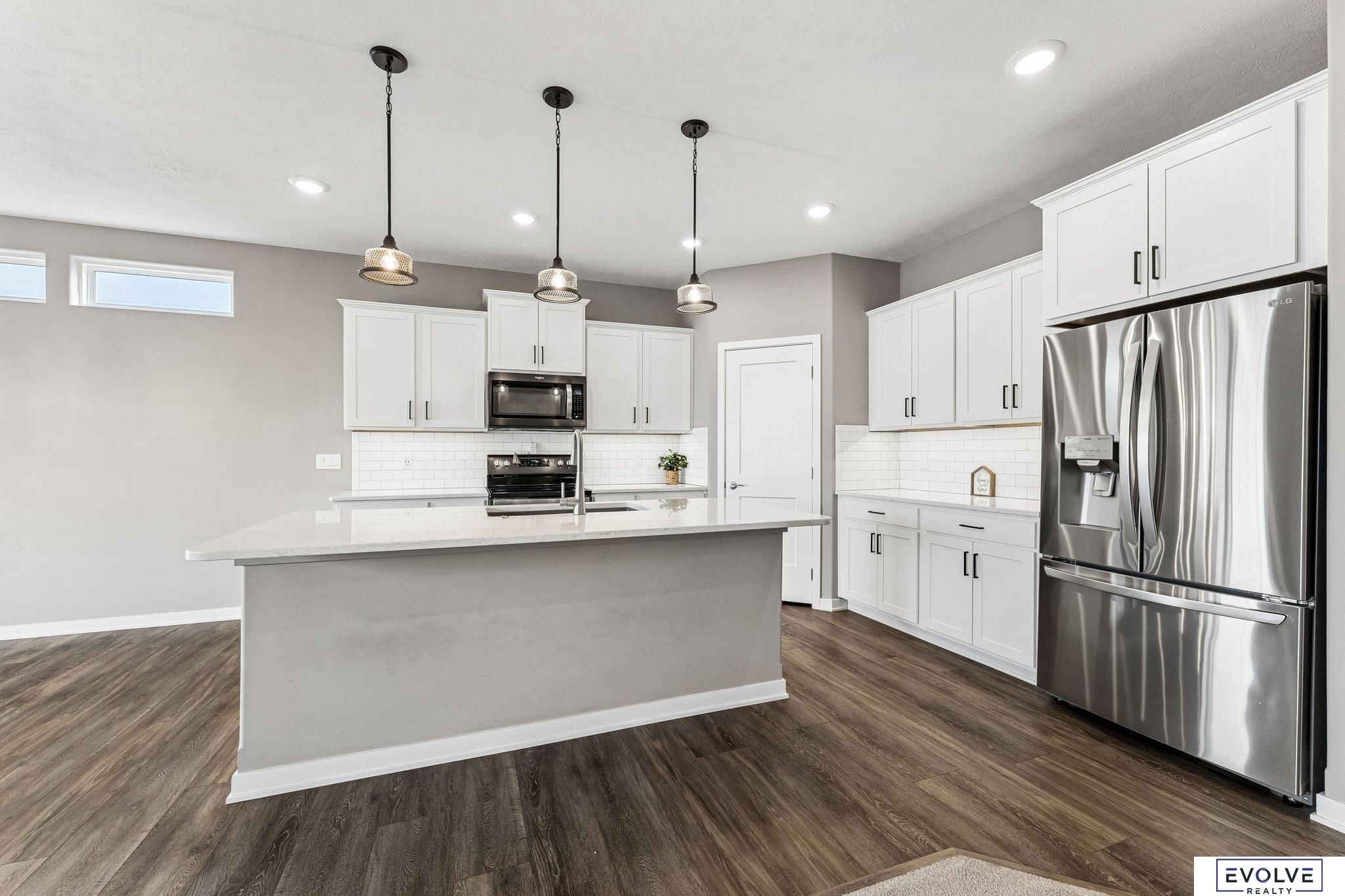 This 2022 Richland Harmony Farmhouse ranch villa delivers clean design, smart upgrades, and low maintenance living. You get an open layout with 9ft ceilings, arched openings, and strong natural light. The kitchen stands out with quartz counters, upgraded Cambria surfaces, soft close cabinetry, a walk-in pantry, and a granite sink. The main level features luxury vinyl plank flooring, a gas fireplace w/stone to the ceiling, updated lighting, ceiling fans, a smart thermostat, and wooden blinds. The finished lower level gives you flexibility with a large rec room, bar rough in, two additional bedrooms both with walk-in closets, a three-quarter bath, and a large storage room separate from utility room. Outside, a covered deck with engineered wood separates this home from others, giving you a true extension of your living space for relaxing or entertaining. You also get Hardie Board siding and a sprinkler system Quarterly HOA covers snow removal, lawn care, and trash.