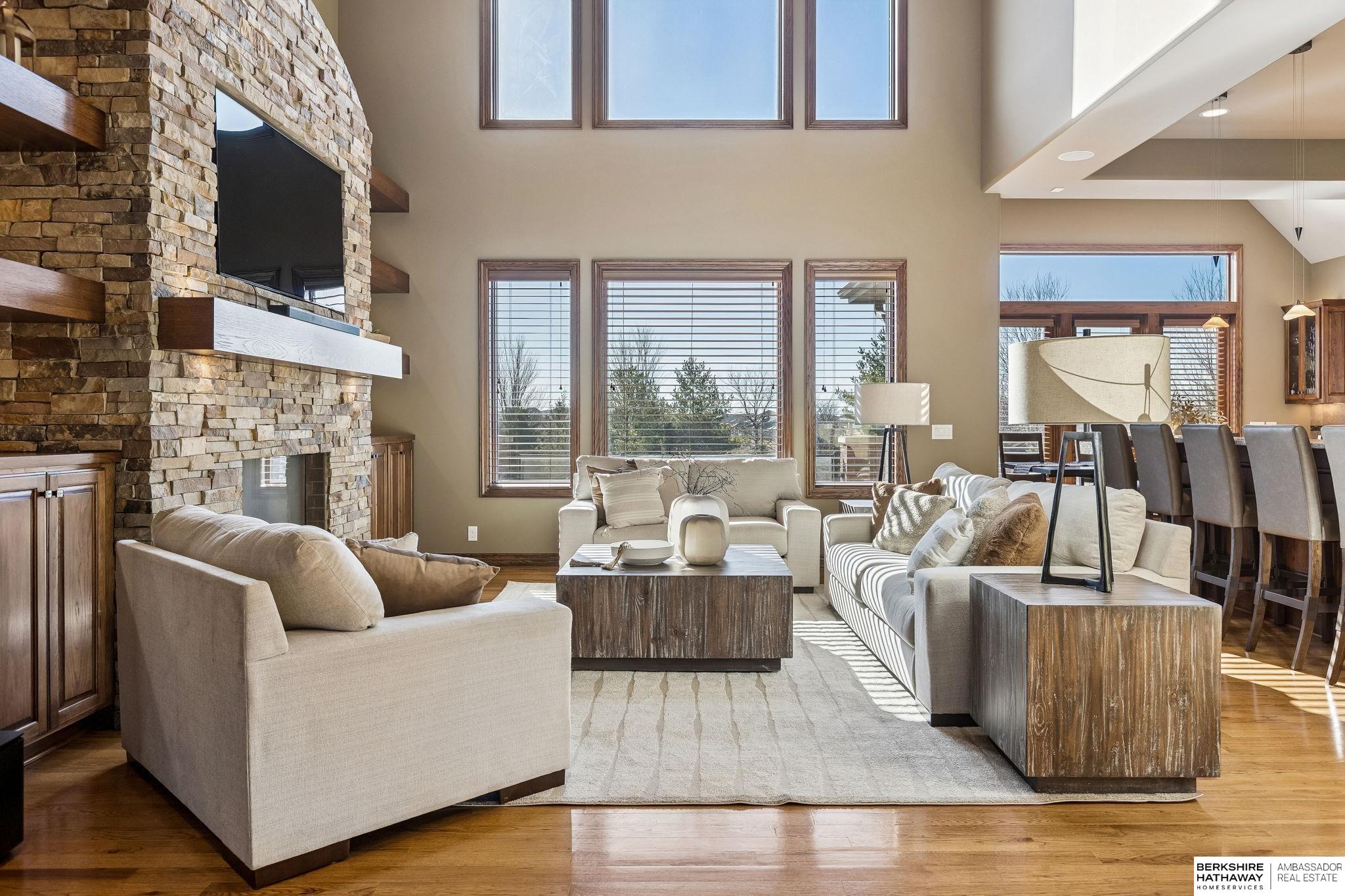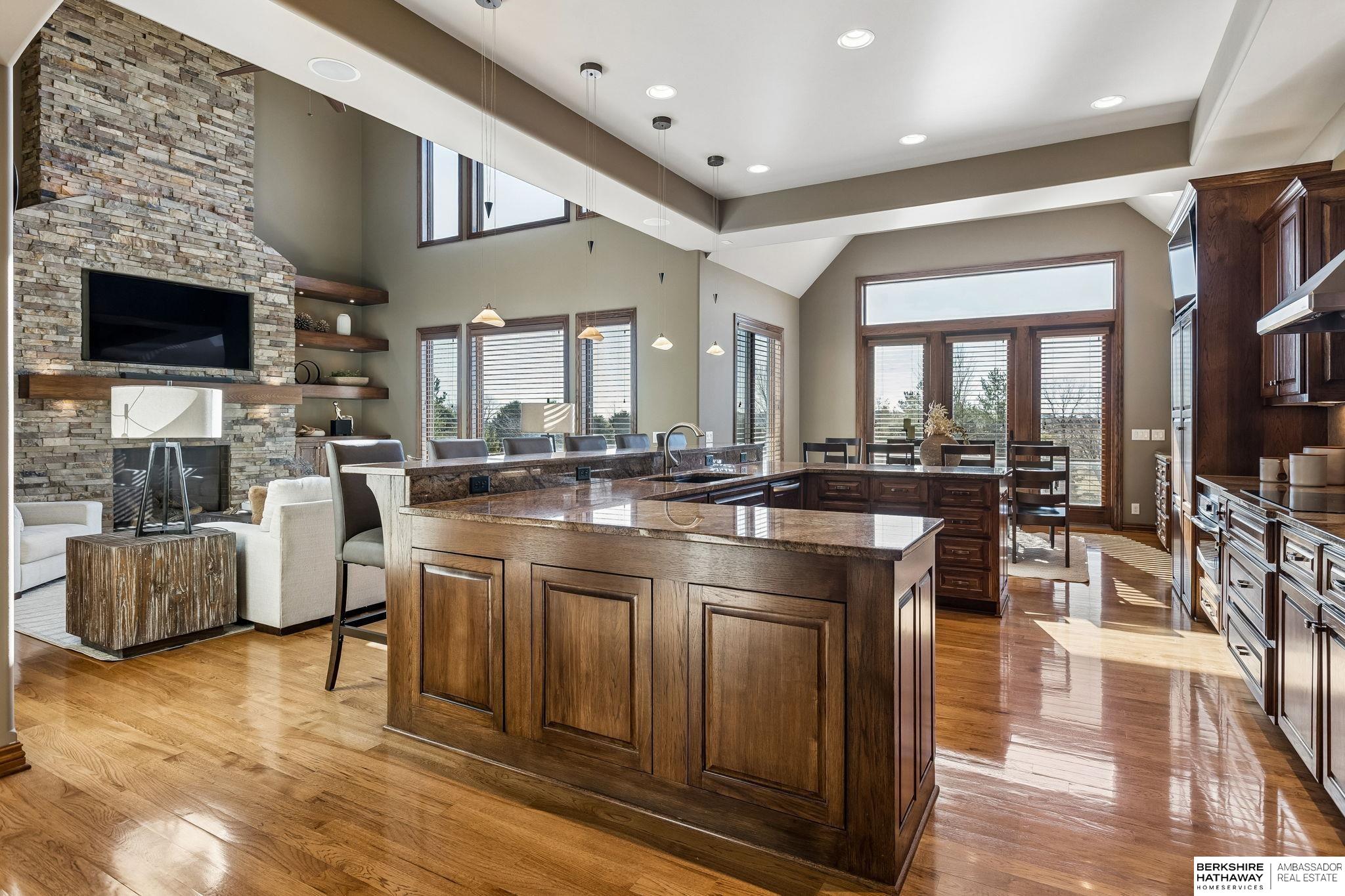 Exceptional 1.5-story estate on 1.6 private acres offering 7,288 sq ft & an oversized 4-car heated garage. Dramatic two-story great room with natural stone fireplace & wall of windows overlooking resort-style grounds. Hickory hardwood floors, tray & soaring ceilings showcase quality craftsmanship. Gourmet kitchen with massive U-shaped Island, hidden walk-in pantry, double ovens, custom cabinetry, granite surfaces & premium appliances. Main-level primary suite with fireplace, sitting area, deck access, spa bath with multi-head shower & custom walk-in closet. The walkout lower level features an 18-ft granite bar, 3rd fireplace, versatile office & guest quarters. $500K+ backyard renovation includes 26x42 heated pool, fire bowls, composite deck, sunken fire pit, spa & 450+ mature trees with stunning landscaping & hardscape. See assoc. docs for additional features.