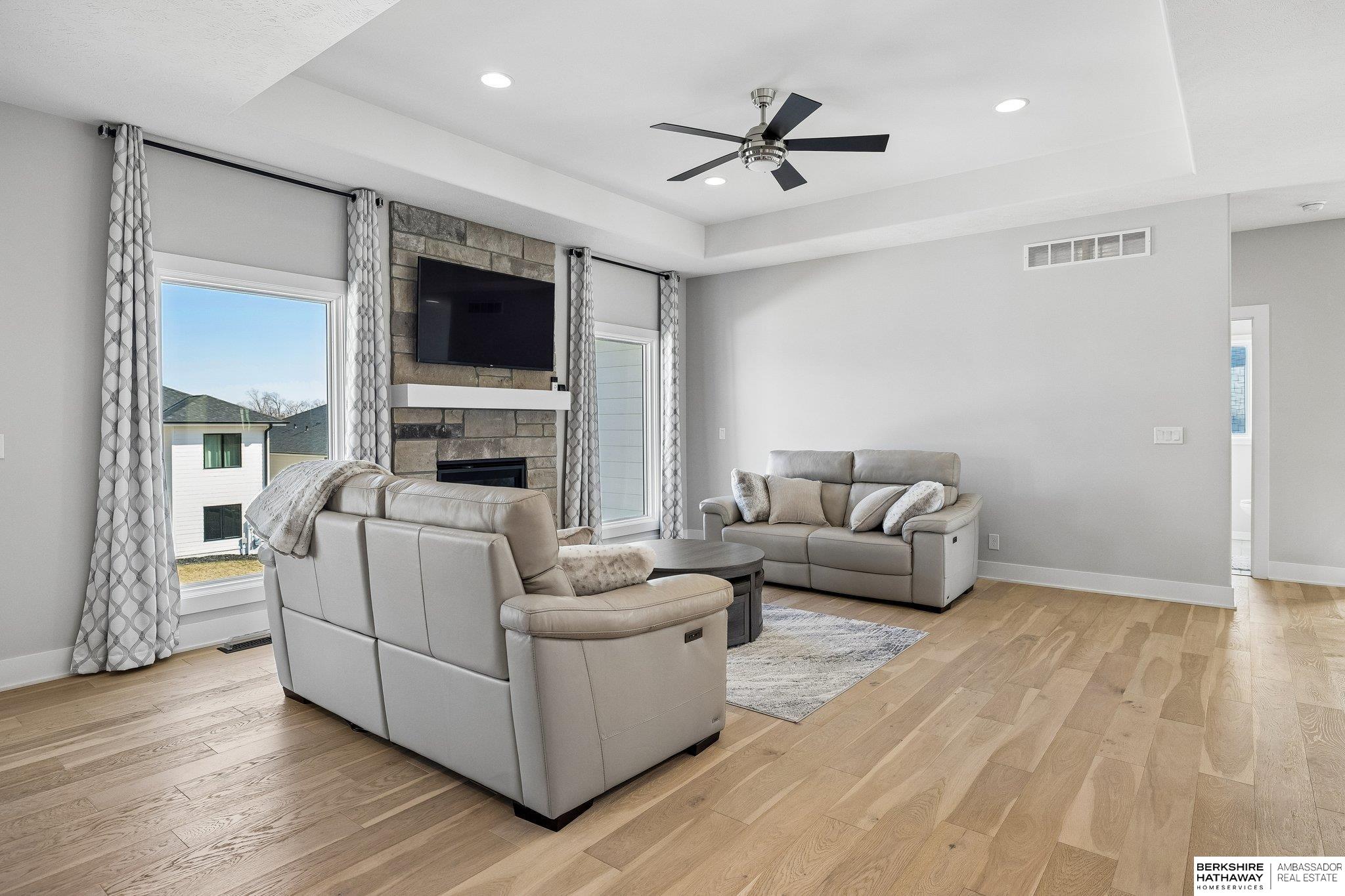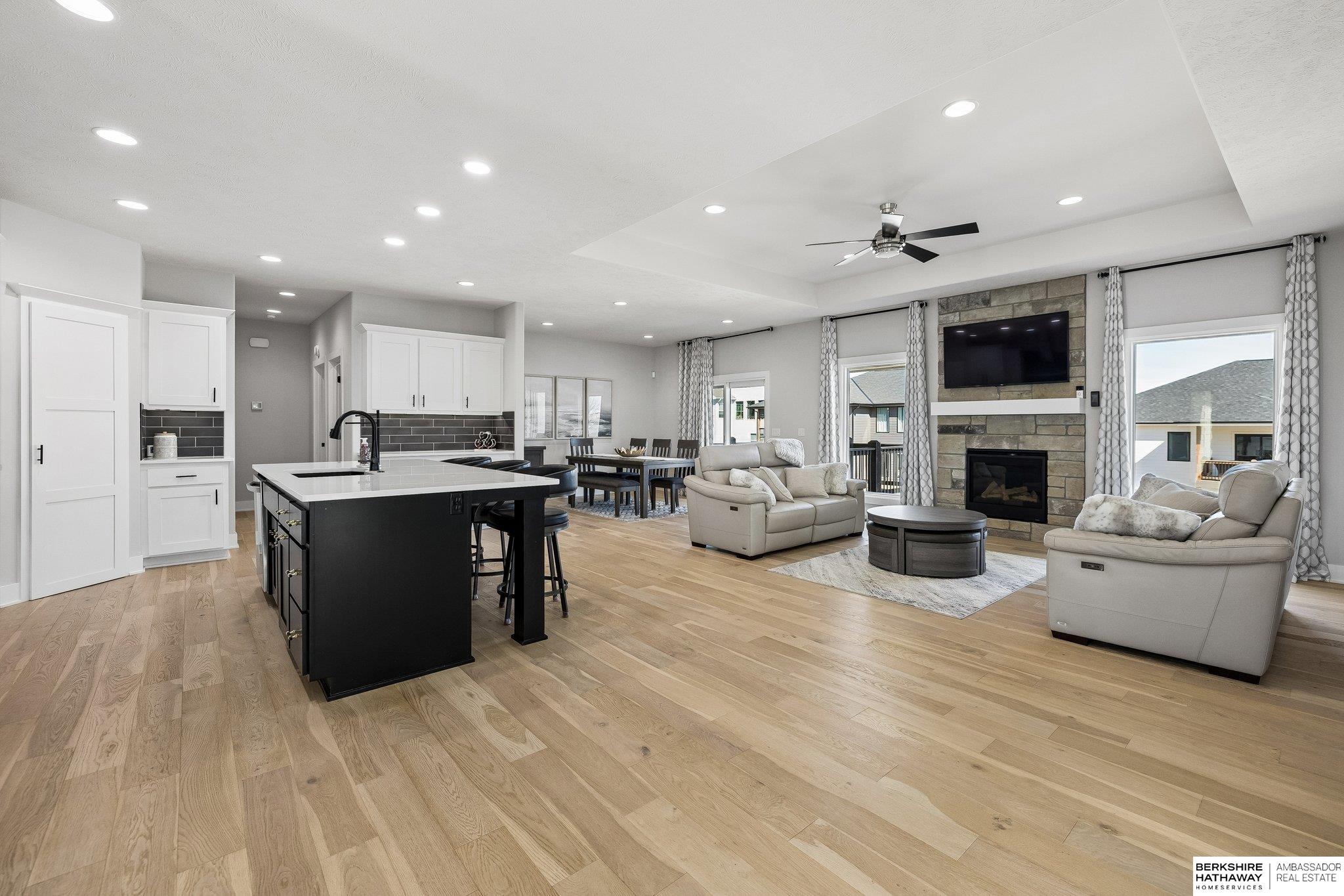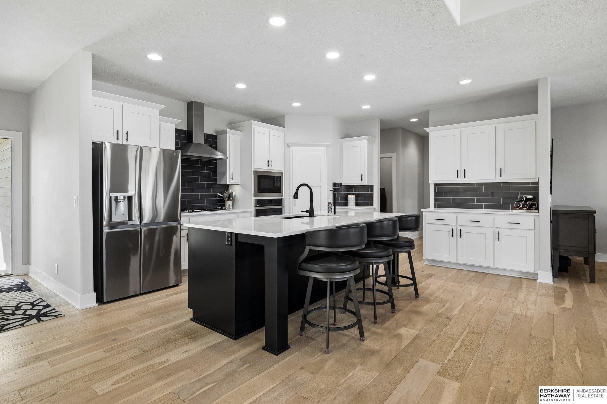 4-CAR GORGEOUS Custom Walkout Ranch in pristine condition w/enhancements you won’t find in new construction. 5 bedrooms, 3 baths, & 3,462 finished sq. ft. (only HVAC/storage rm is unfinished), it offers an exceptional amount of storage & space. Enjoy an open floor plan, Tons of natural light, w/quartz countertops, a floor-to-ceiling stone fireplace, & engineered hardwood floors throughout both the main & lower levels. Tile flooring in bathrooms and the carpet on the stairs. 3 of the 5 bedrooms come with huge walk-in closets. Washer, dryer refrigerator included. Separate laundry and mud room with cabinet storage on the main level. Spacious basement offers a large family room, microwave/convection oven, wet bar, upgraded custom backsplashes & quartz counters two bedrooms, & an oversized ¾ bath. Outdoor living is equally impressive w/a composite covered deck & a spacious patio overlooking the walkout lot. Added touches like privacy vinyl fence, insulated garage, elevated window coverings