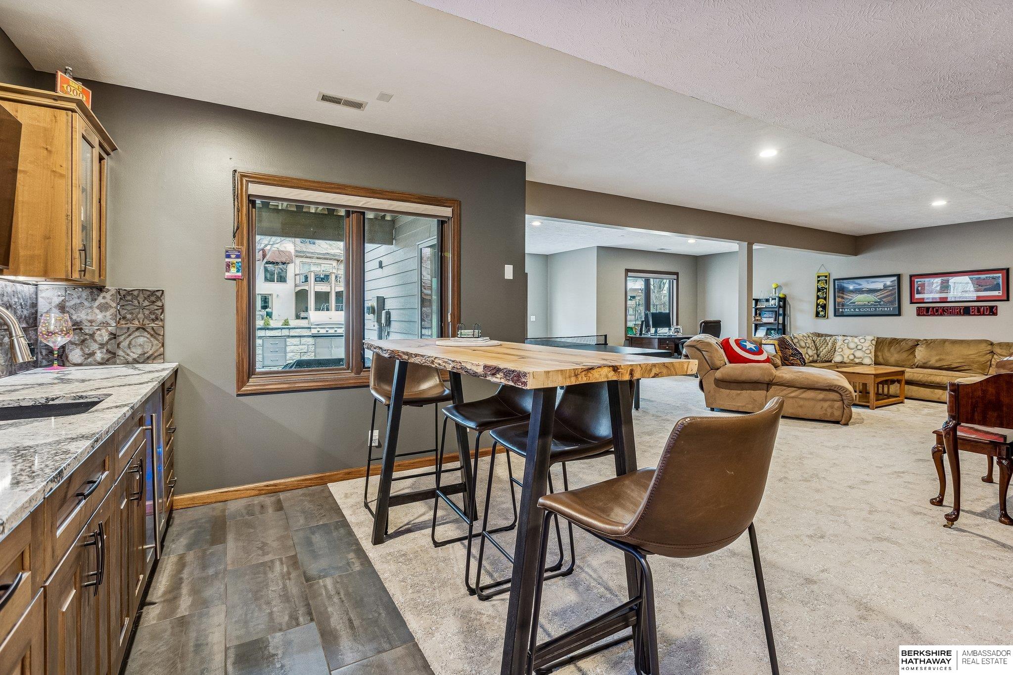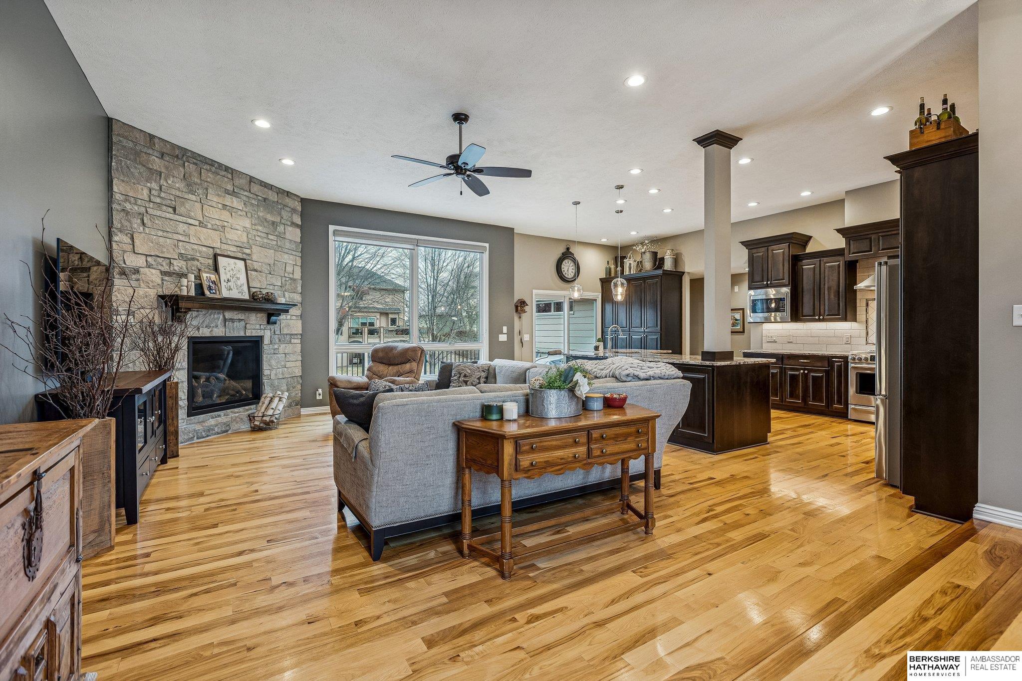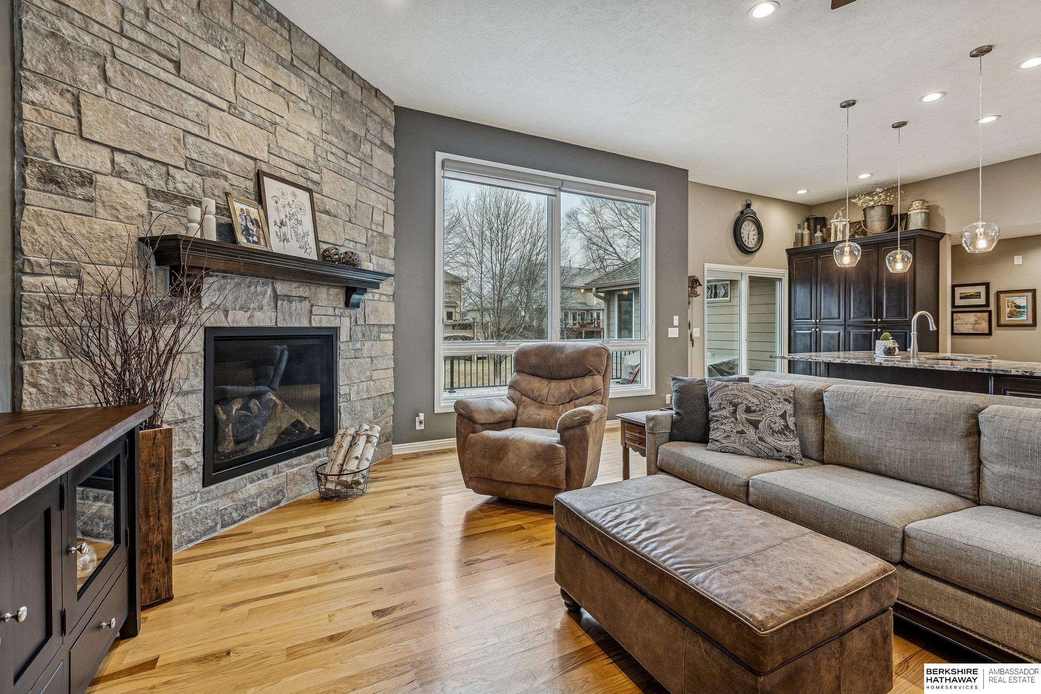 Meticulously maintained 3,700-square-foot finished walkout ranch offering the perfect blend of comfort and modern upgrades. The open-concept main floor features soaring ceilings and rich hardwood flooring throughout the primary living areas. The gourmet kitchen is a chef's dream, anchored by a massive granite island, custom dark cabinetry, stainless steel appliances, and a tiled backsplash. The sun-drenched living room is centered around a floor-to-ceiling stone fireplace, creating an inviting atmosphere for daily living. The primary suite provides a private retreat, highlighted by a luxuriously updated walk-in shower with designer tile work. The expansive finished walkout lower level is designed for entertaining, featuring a large recreation room and a custom wet bar with live-edge wood countertops and a beverage fridge. Lower Level also features an in-law suite with its own bathroom!