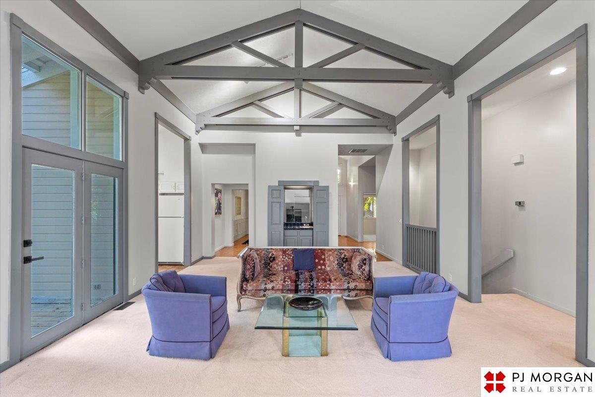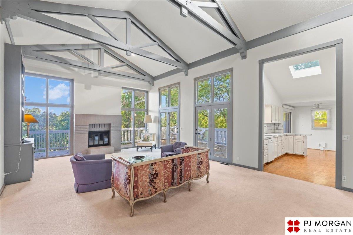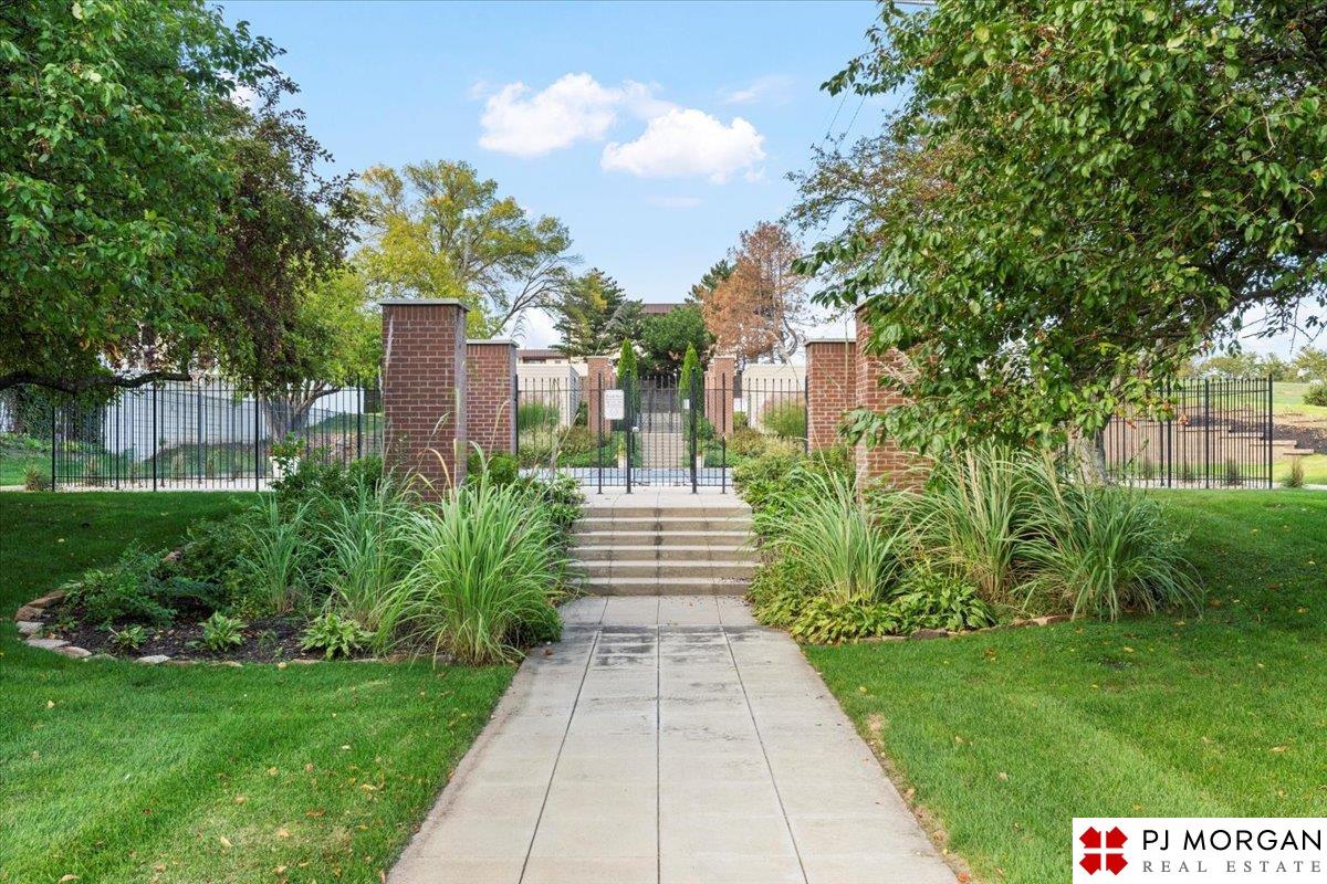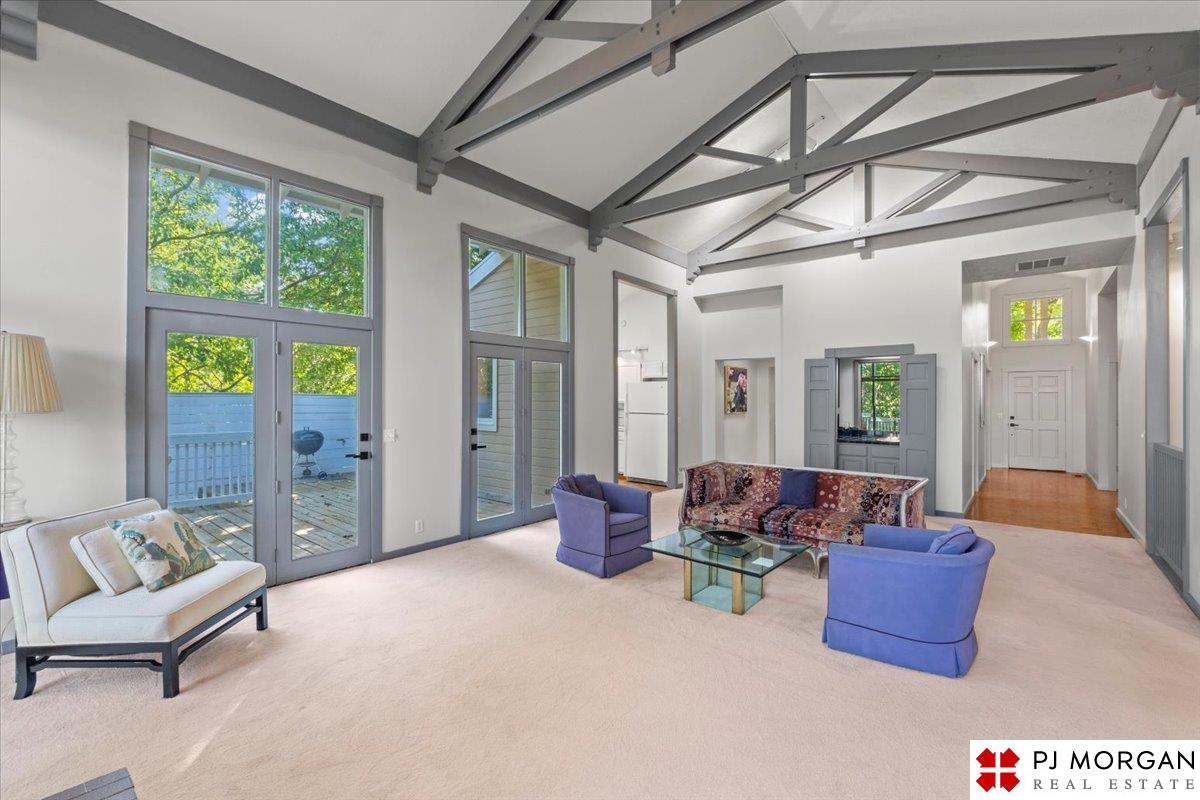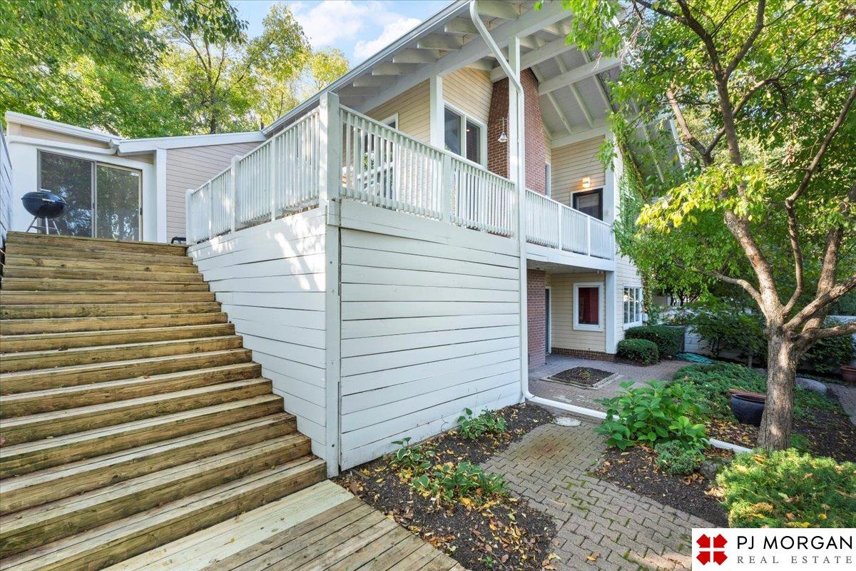 Looking for one-level living with a "wow" factor - and a pool? Welcome to this quiet, gated community in central Omaha. These craftsman-style townhomes (featured in Time Magazine as the "best design of 1985" by award-winning architects) focus on abundant natural light & charming outdoor spaces. Feel the sophistication & space w/ 17'+ ceilings, double doors to deck, cozy fireplace, & built-in bar. This rare corner unit offers 2 main-floor BR's, including a generous primary suite with dual closets primary bath. An elegant formal dining room flows seamlessly into the galley kitchen. The fully finished basement includes huge family room w/ walk-out patio doors, updated bath, 1 BD, & 1 non-conforming BD, plus storage. Outside, relax on your expansive, private deck shaded by mature trees, incredible views overlooking the pool & courtyard below. Enjoy maintenance-free living with low $180/m HOA covers lawn, snow, streets, & pool. Only 9 townhomes exist in this exclusive community, act fast!