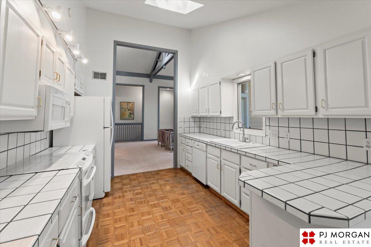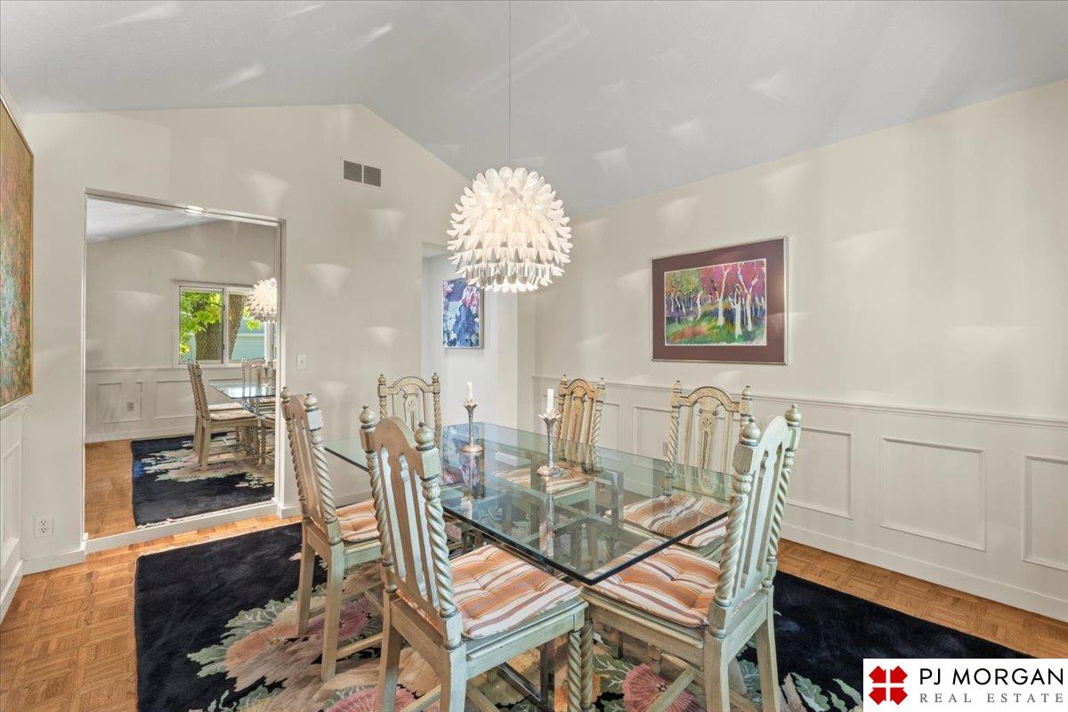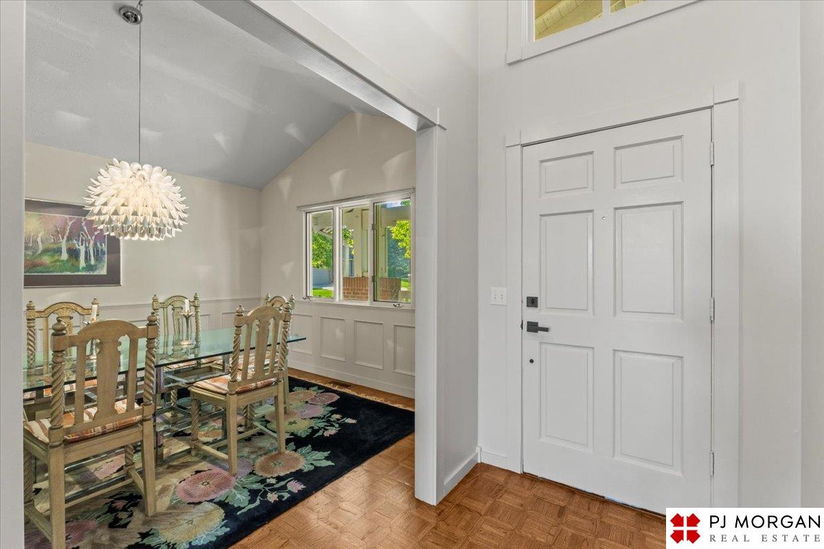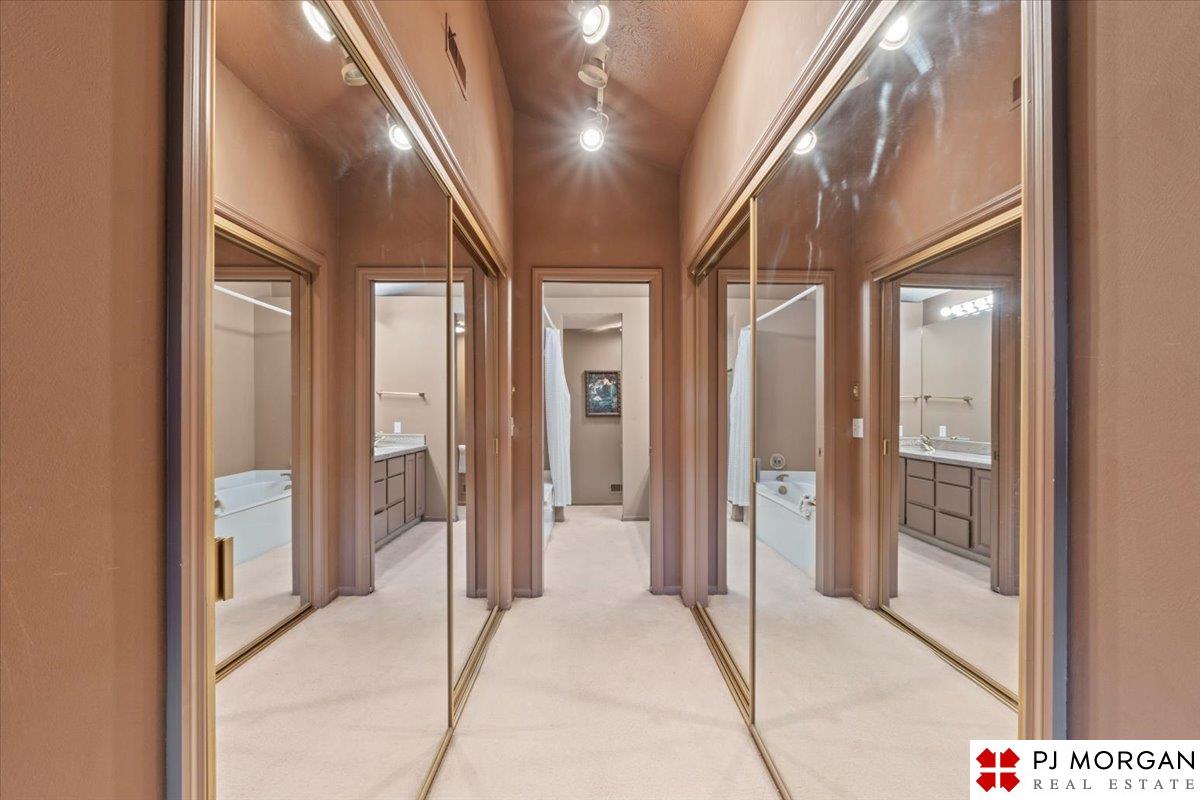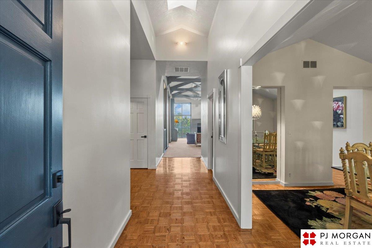 Looking for one-level living with a "wow" factor - and a pool? Welcome to this quiet, gated community in central Omaha. These craftsman-style townhomes (featured in Time Magazine as the "best design of 1985" by award-winning architects) focus on abundant natural light & charming outdoor spaces. Feel the sophistication & space w/ 17'+ ceilings, double doors to deck, cozy fireplace, & built-in bar. This rare corner unit offers 2 main-floor BR's, including a generous primary suite with dual closets primary bath. An elegant formal dining room flows seamlessly into the galley kitchen. The fully finished basement includes huge family room w/ walk-out patio doors, updated bath, 1 BD, & 1 non-conforming BD, plus storage. Outside, relax on your expansive, private deck shaded by mature trees, incredible views overlooking the pool & courtyard below. Enjoy maintenance-free living with low $180/m HOA covers lawn, snow, streets, & pool. Only 9 townhomes exist in this exclusive community, act fast!