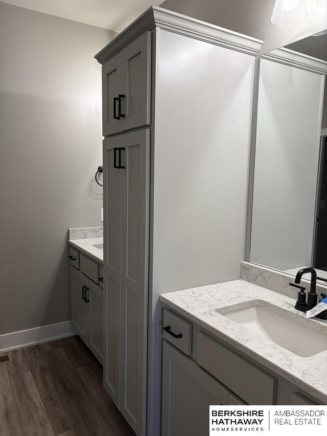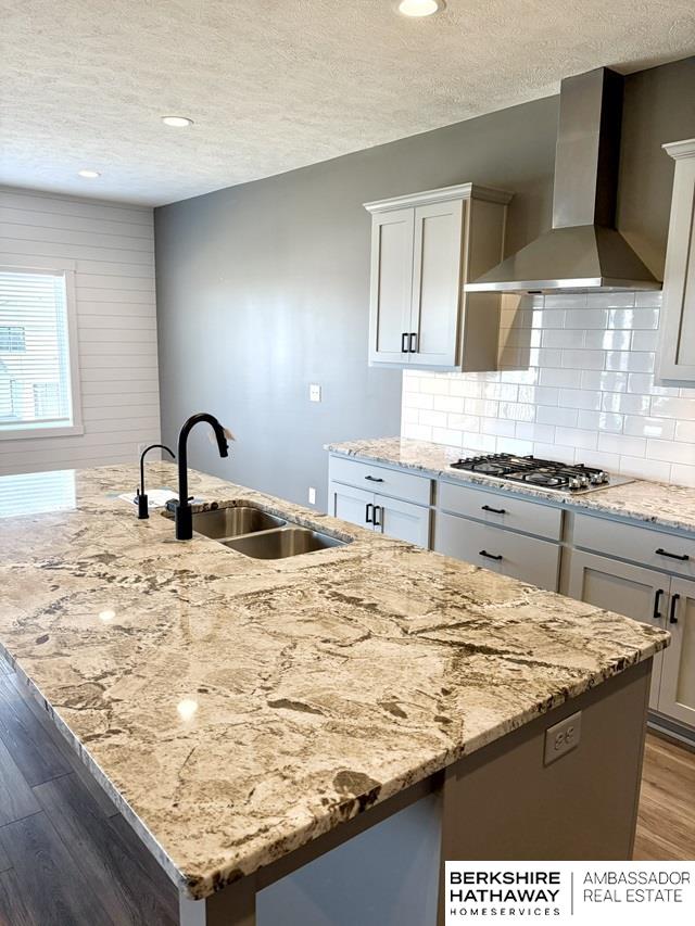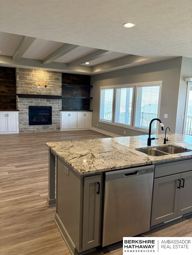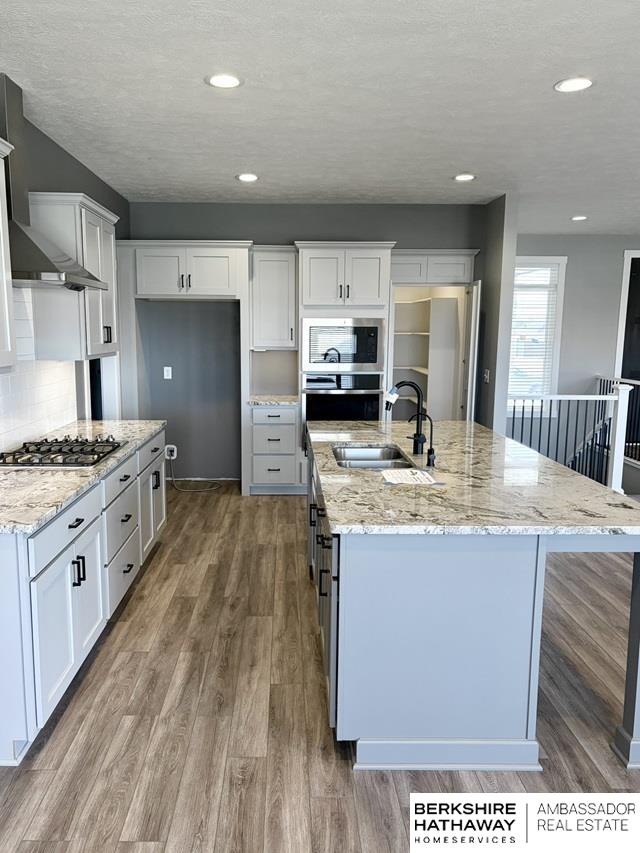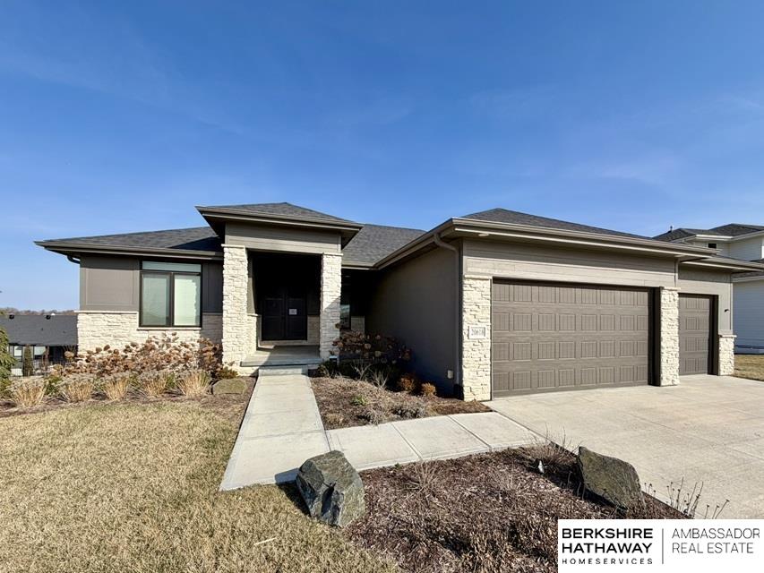 Beautiful south-facing walkout ranch in Gretna's Lakeview featuring neutral décor throughout. Exterior showcases James Hardie siding, stone accents, and a grand double-door entry. The open floor plan offers LVP flooring and large windows overlooking a spacious lot. The living room features a fireplace, built-ins, and a beamed ceiling. Modern kitchen includes shaker cabinets, granite island, pantry, and gas range. Main-floor primary suite offers a tiled shower, dual vanity, and large closet. Walkout finished basement includes additional bedrooms, one ideal for a workout room, a stylish bath, spacious rec room with wet bar, electric fireplace, and covered patio access. AMA, sq ft per county. Property sold AS-IS; seller is the Secretary of Veterans Affairs.