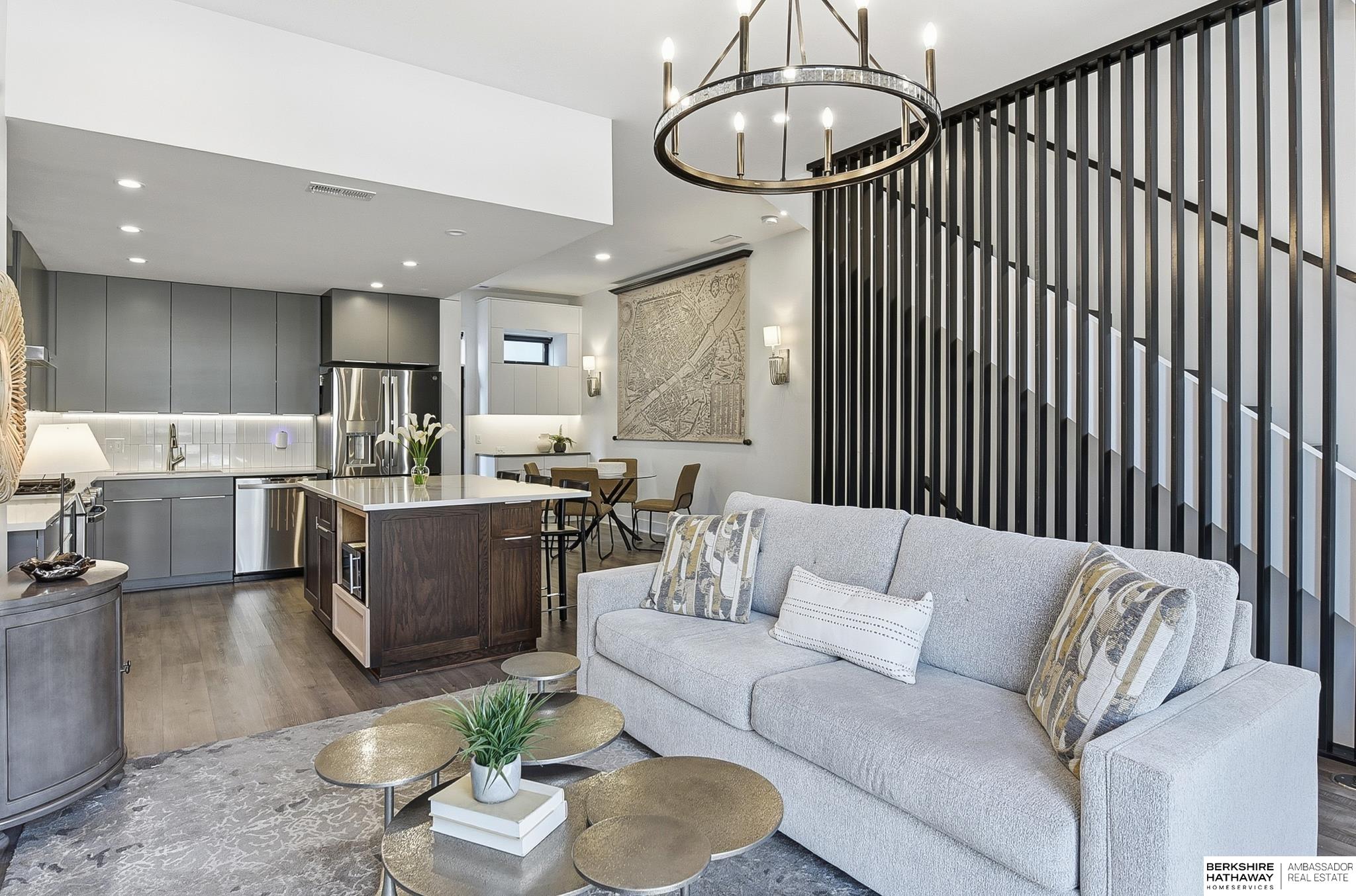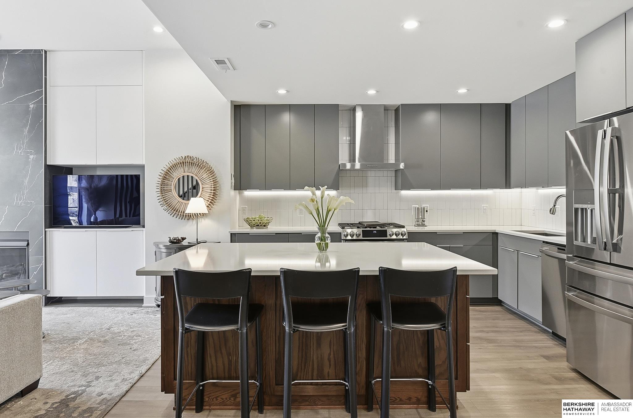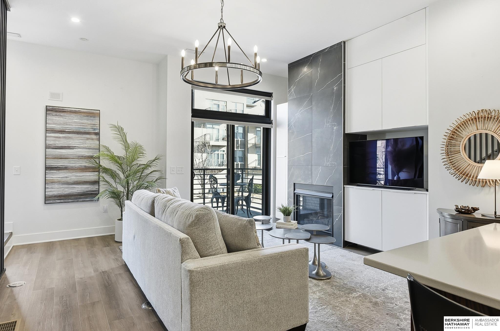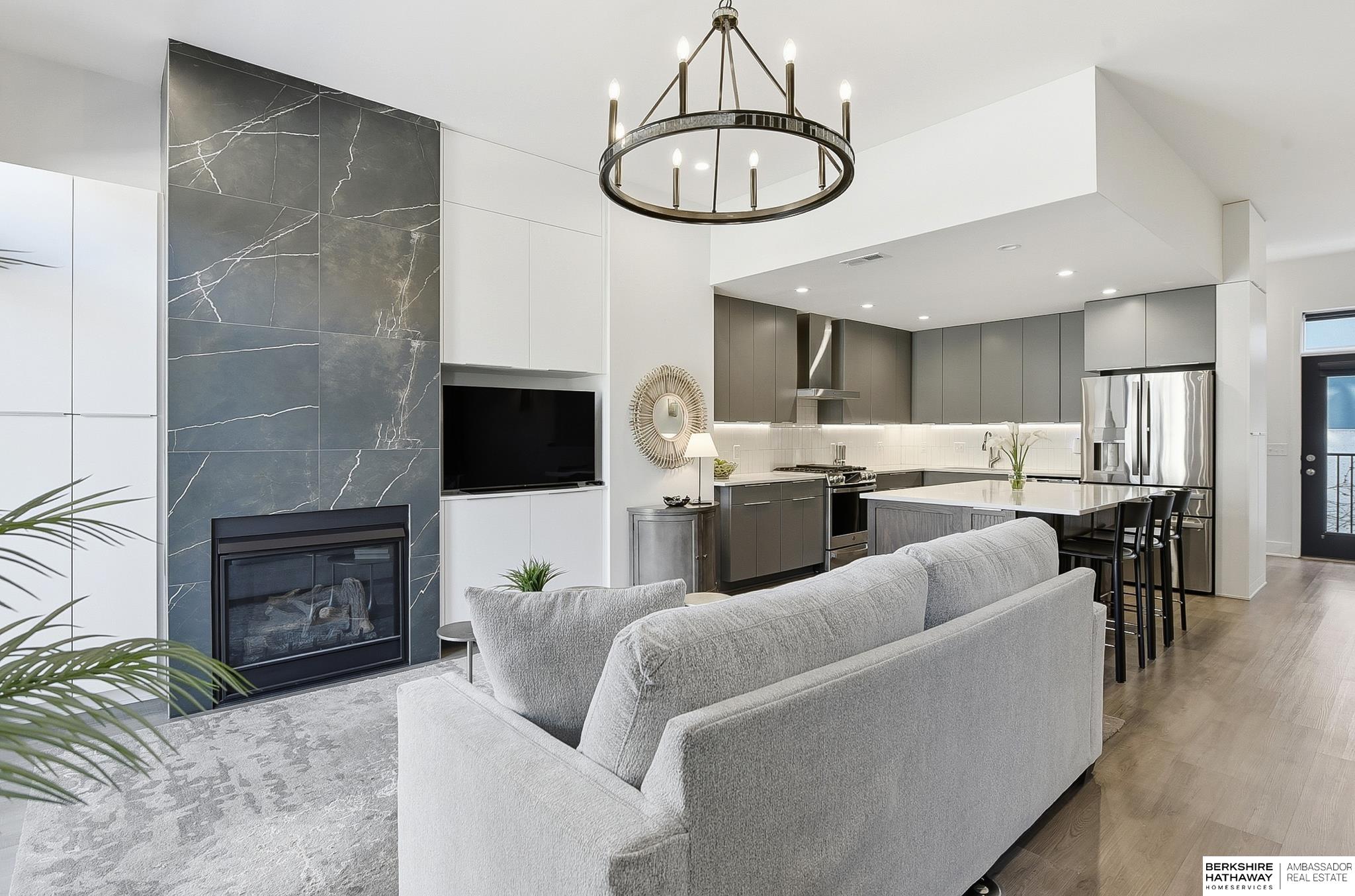Experience modern style and unbeatable convenience in this beautifully upgraded townhome located in the heart of vibrant Aksarben Village. Thoughtful upgrades include custom cabinetry and ample storage throughout every room, plus remote-control privacy blinds for added comfort. The open-concept living space showcases 10-foot ceilings and a striking floor-to-ceiling gas fireplace, creating a warm and inviting atmosphere. The gourmet kitchen offers premium appliances, a gas chef's range, and high-end finishes - perfect for entertaining or everyday living. This sleek row house also features an attached two-car garage with EV charger and an epoxy-coated garage floor. Enjoy unmatched walkability to fitness studios, shopping, dining, live music, walking trails, movie theater, Farmers Market and a dog park. With quick access to I-80, UNMC, Midtown, and downtown. This low-maintenance home is one of only seven total units in one of Omaha's most desirable entertainment districts.