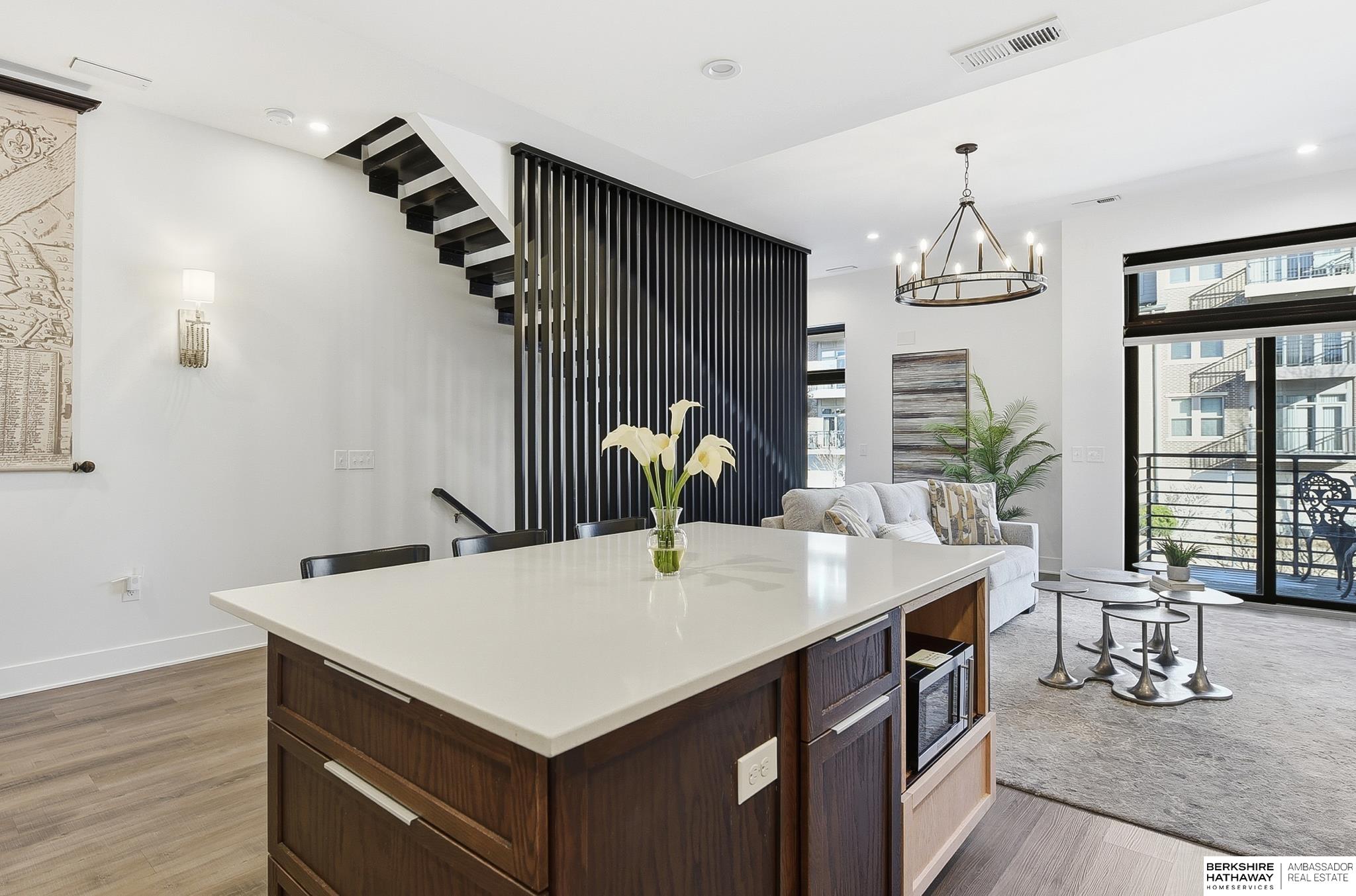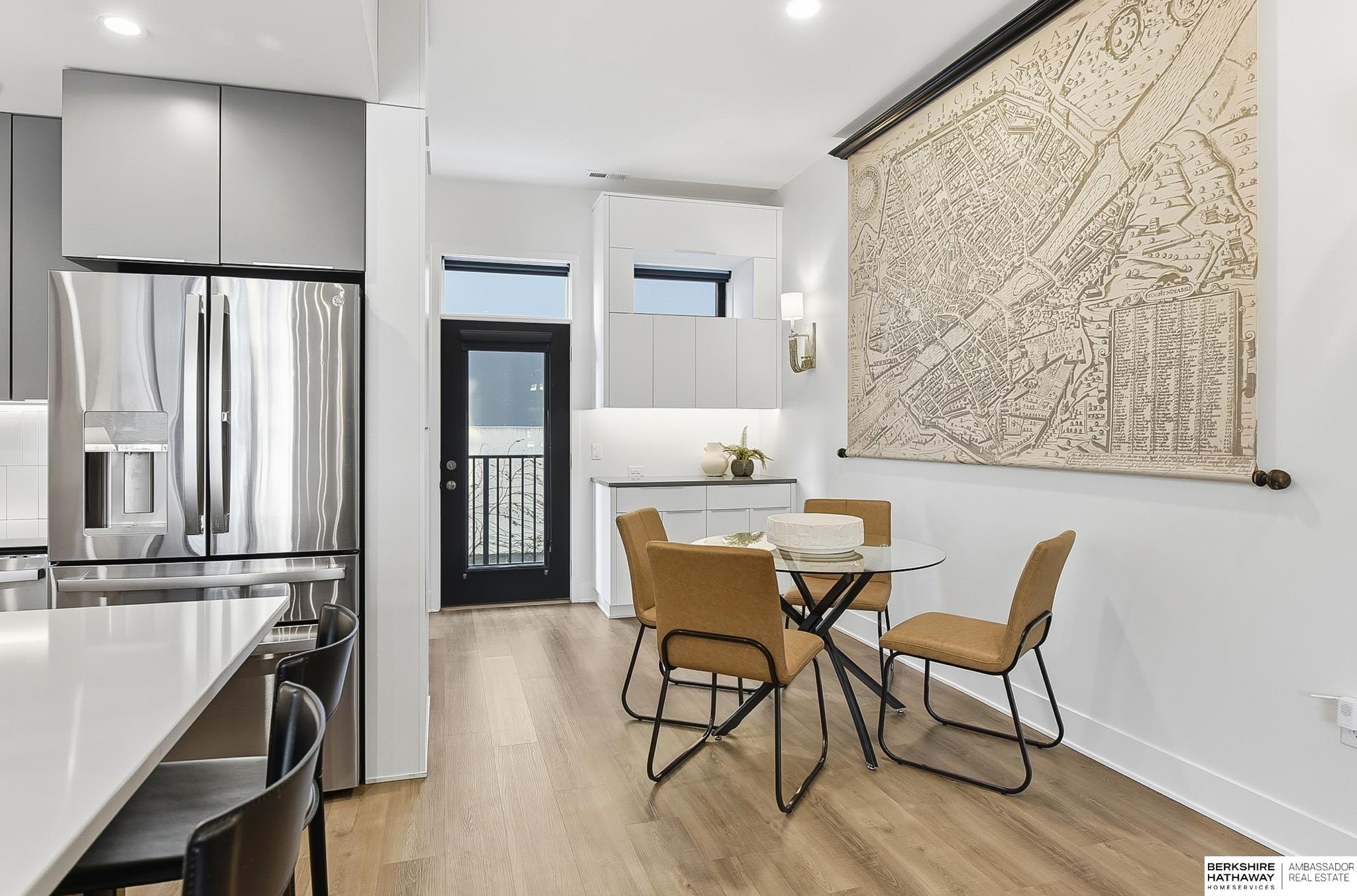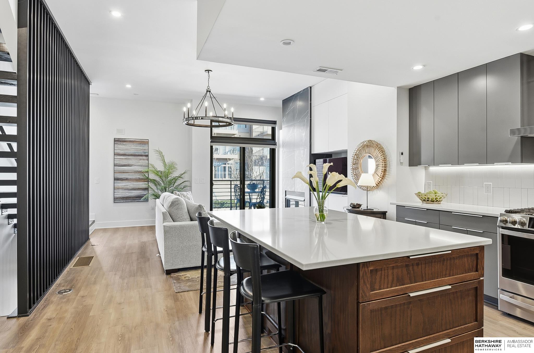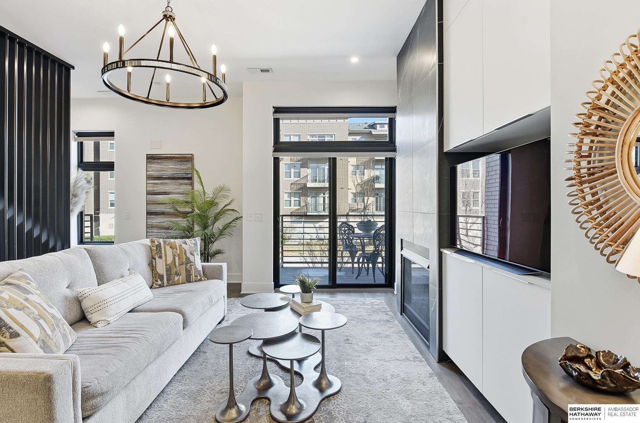 Experience modern style and unbeatable convenience in this beautifully upgraded townhome located in the heart of vibrant Aksarben Village. Thoughtful upgrades include custom cabinetry and ample storage throughout every room, plus remote-control privacy blinds for added comfort. The open-concept living space showcases 10-foot ceilings and a striking floor-to-ceiling gas fireplace, creating a warm and inviting atmosphere. The gourmet kitchen offers premium appliances, a gas chef's range, and high-end finishes - perfect for entertaining or everyday living. This sleek row house also features an attached two-car garage with EV charger and an epoxy-coated garage floor. Enjoy unmatched walkability to fitness studios, shopping, dining, live music, walking trails, movie theater, Farmers Market and a dog park. With quick access to I-80, UNMC, Midtown, and downtown. This low-maintenance home is one of only seven total units in one of Omaha's most desirable entertainment districts.