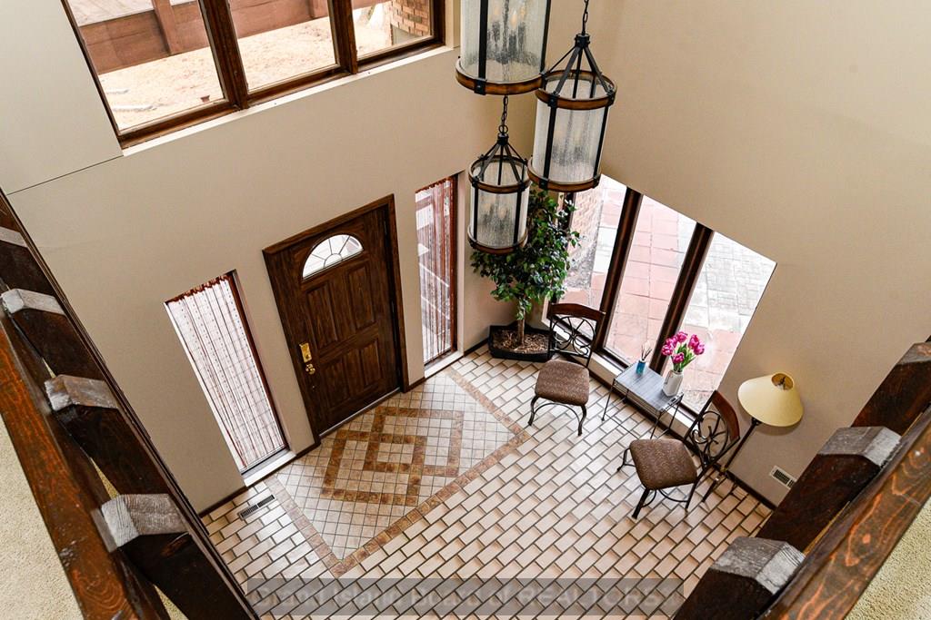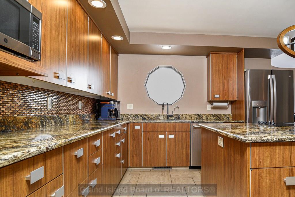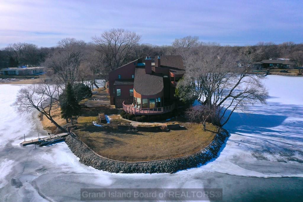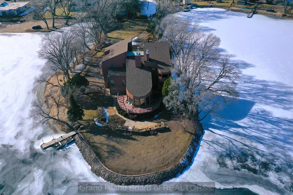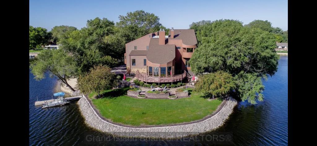 Iconic lakefront property situated on its own peninsula with breathtaking panoramic views. This exceptional home offers 4 bedrooms and 5 bathroom areas, including a primary suite with loft/library and a beautifully remodeled en suite bath. A unique front turret is fully usable and accessible from the interior on the upper level, providing a one-of-a-kind architectural feature. The family room showcases a fireplace pit grouping, disappearing bar (can be connected to Alexa/Google), and walls of windows overlooking the lake. A TV and fireplace nook overlooks the family room, creating a dramatic and inviting space. Enjoy a formal dining room, plus a massive kitchen with bar seating, booth seating, and a large walk-in pantry. Laundry and half bath are located off the kitchen. The spacious living room includes an attached workout room and additional half bath. Boat dock, lift, and pontoon are included. Furnishings are negotiable. Truly rare peninsula living with unmatched views.